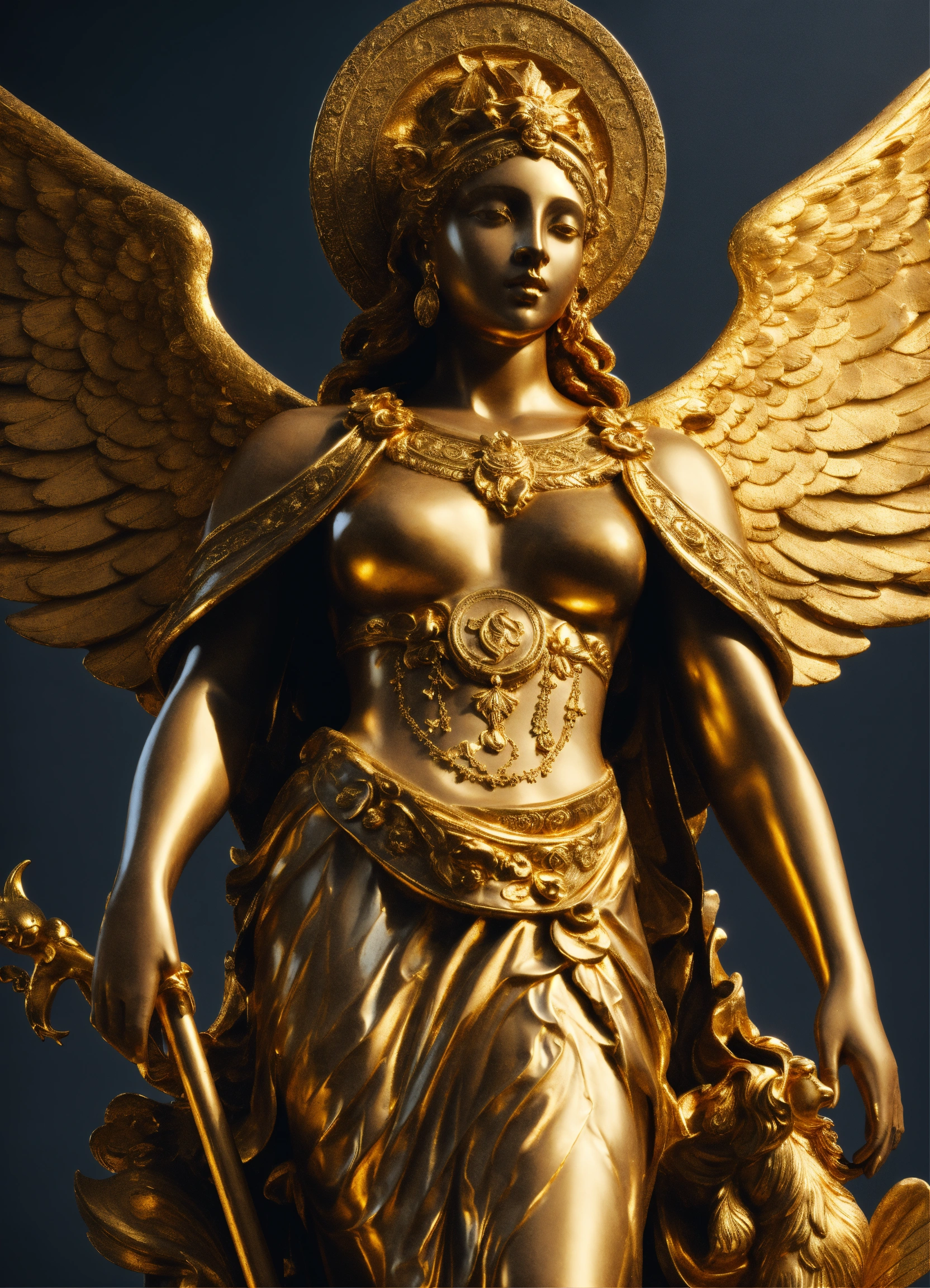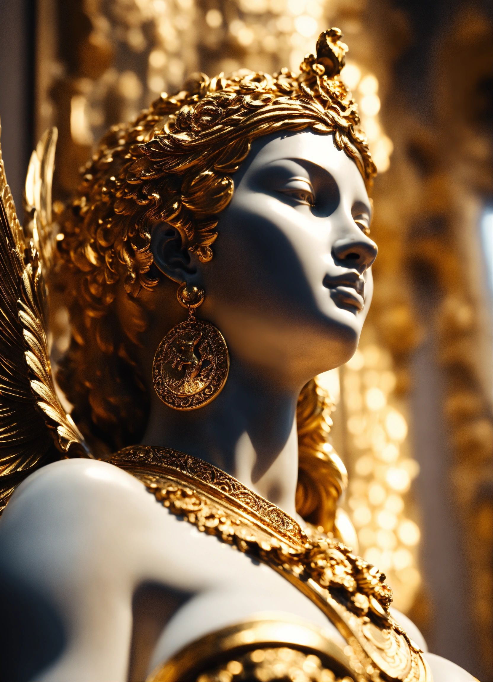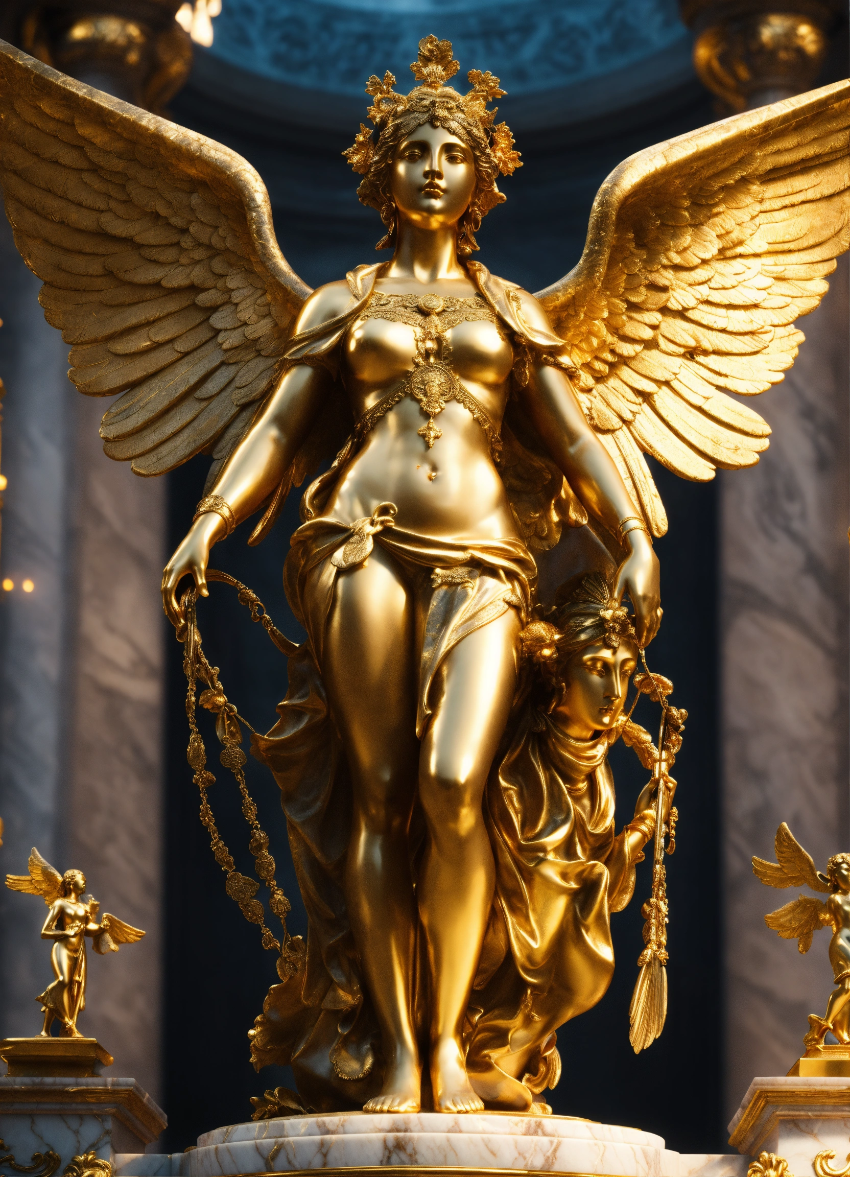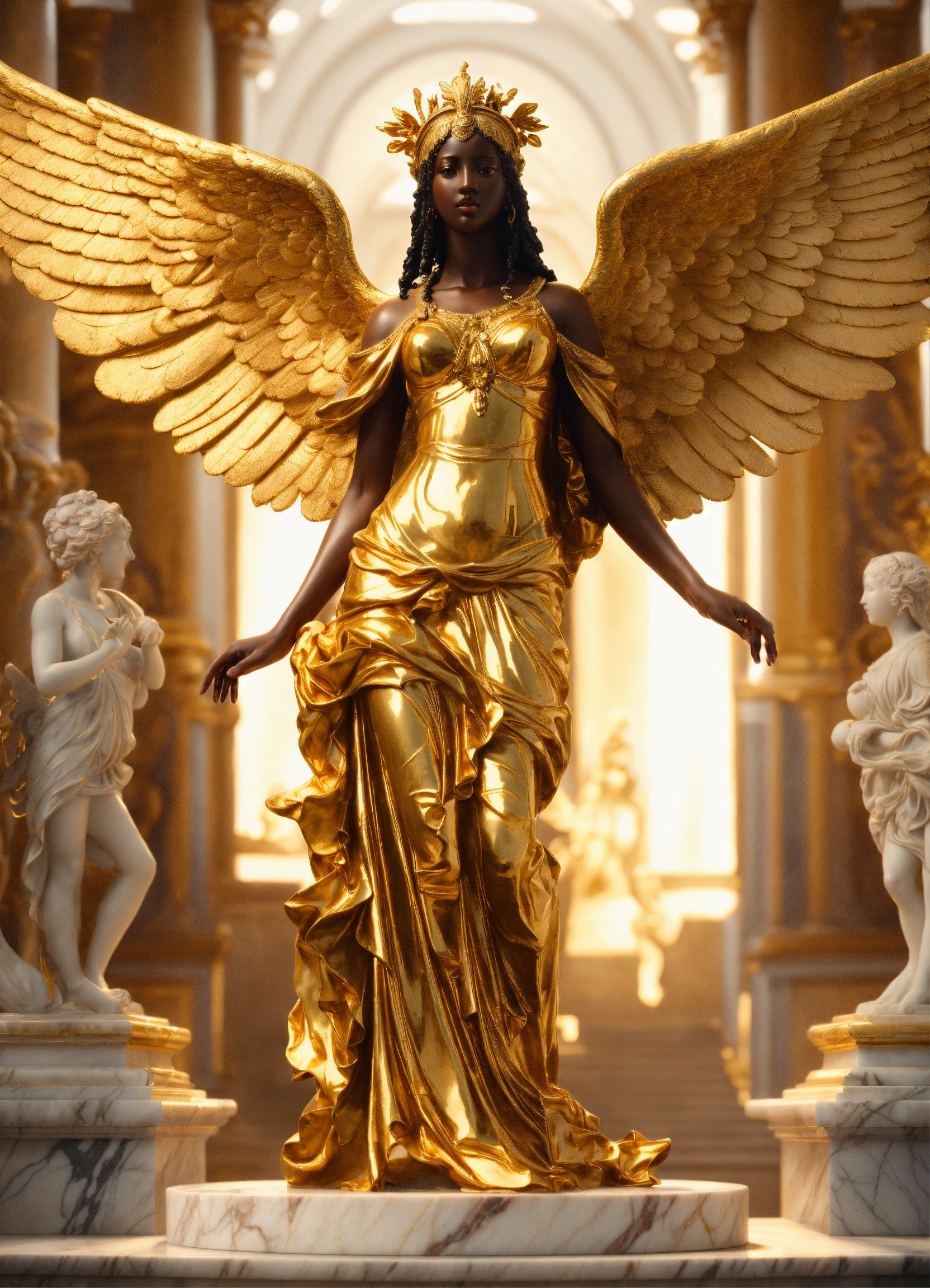 African marble and gold statue of a goddess with angels, renaissance art, hyperdetailed, 8k, hyperrealistic, close up, intricate details, masterpiece, unreal engine render, stunning lighting, beautiful shadows