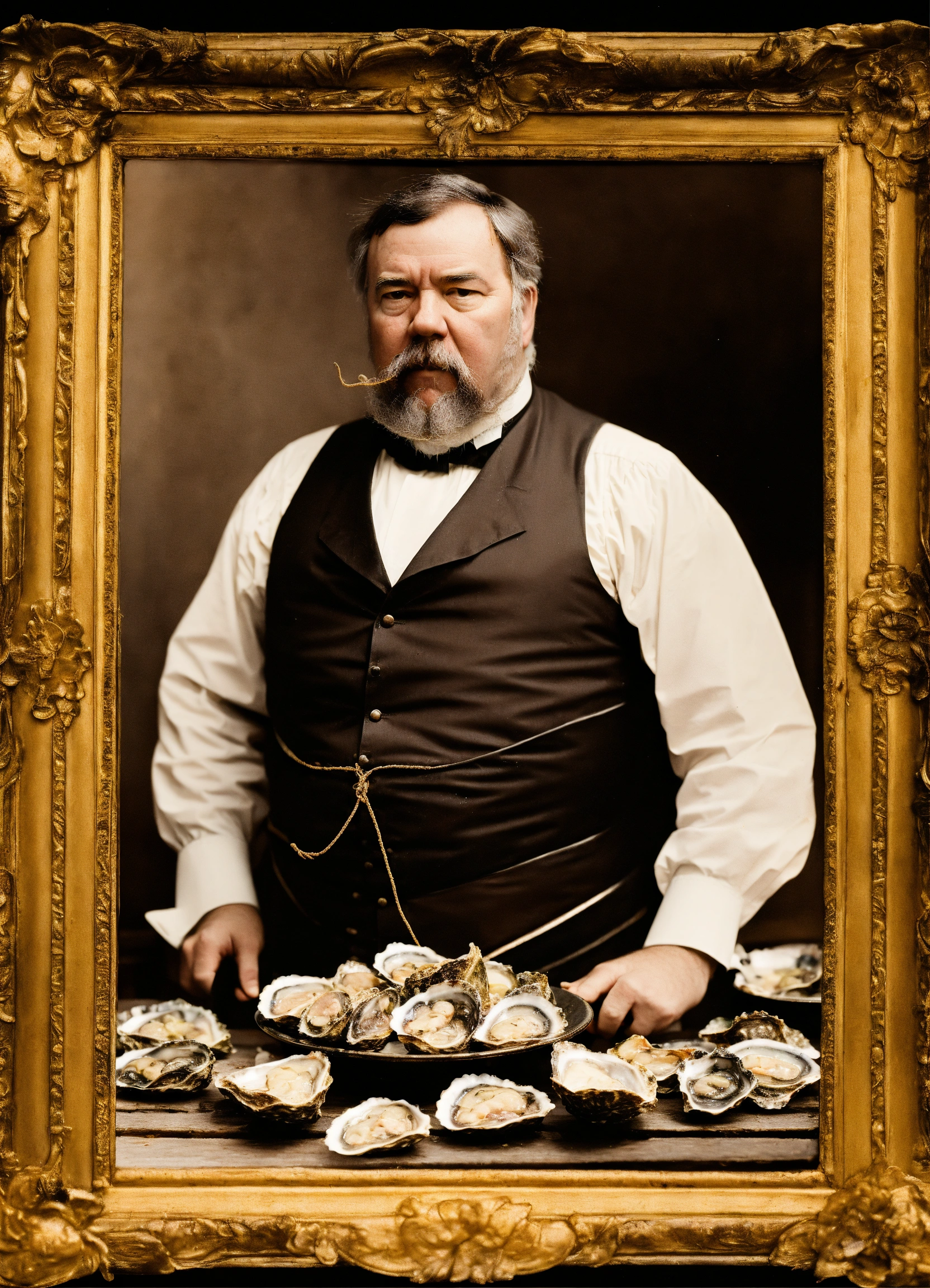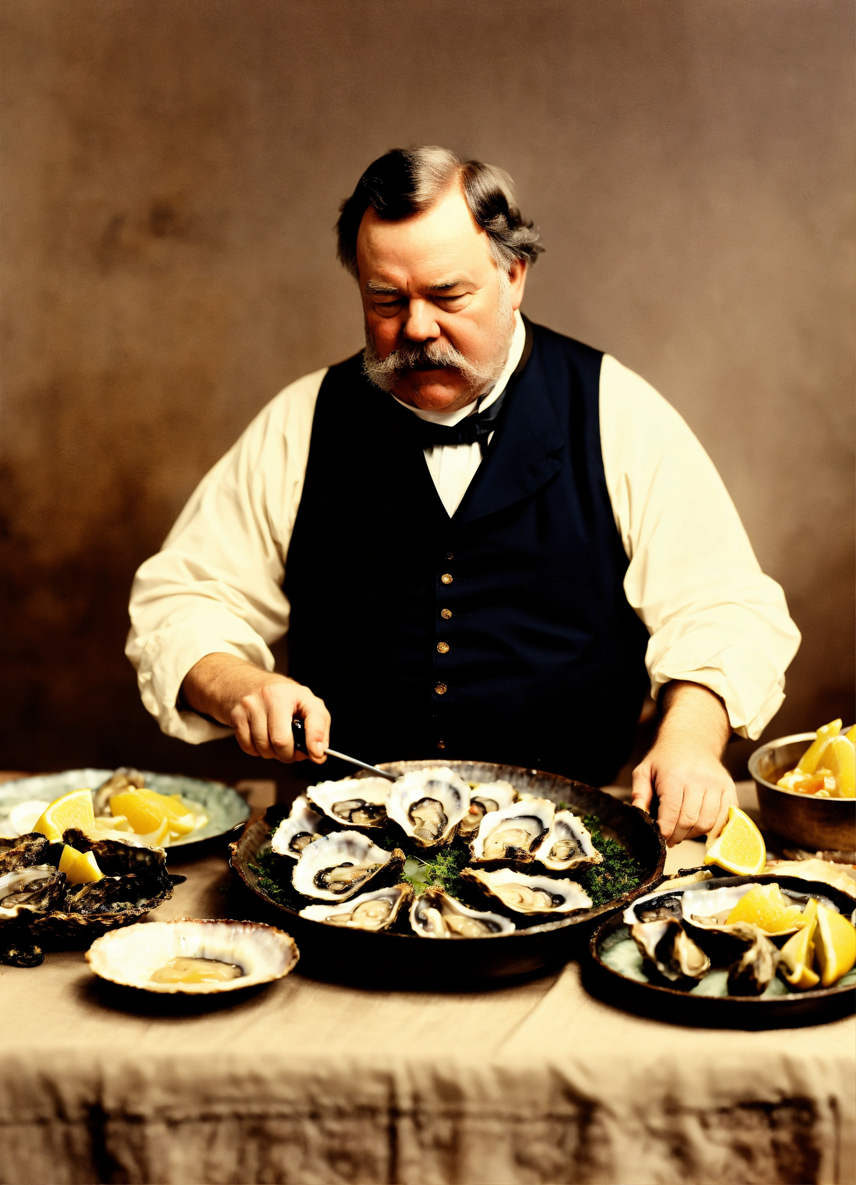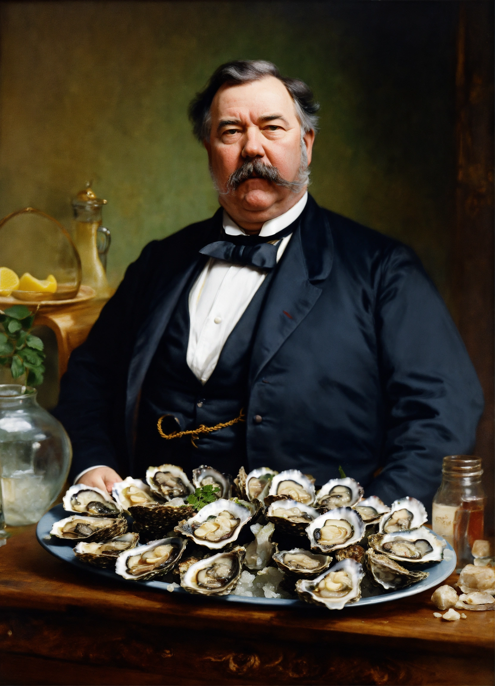 President chester a, arthur looking down in excitement as raw oysters as he is getting ready to eat them with a bib around his neck