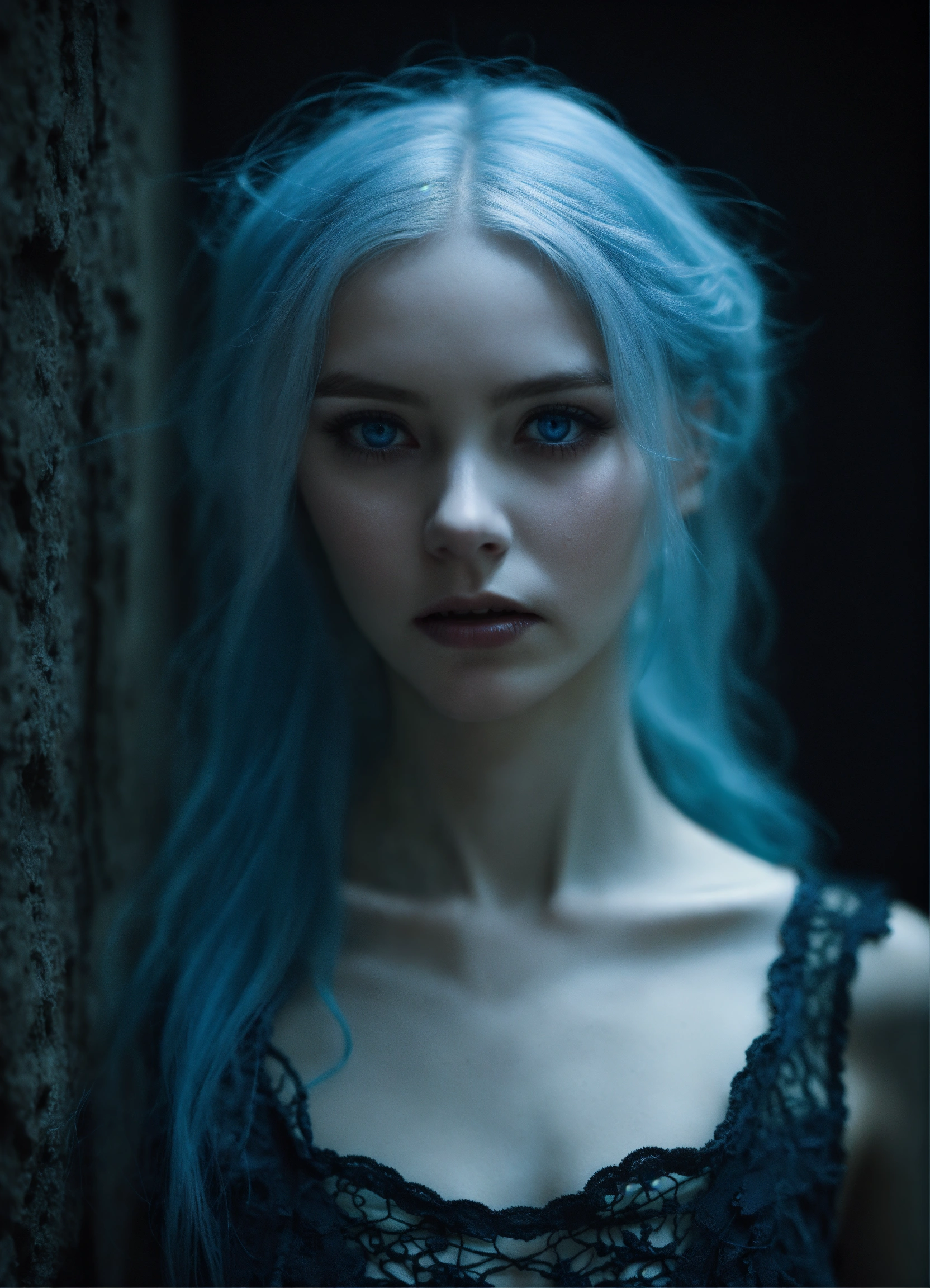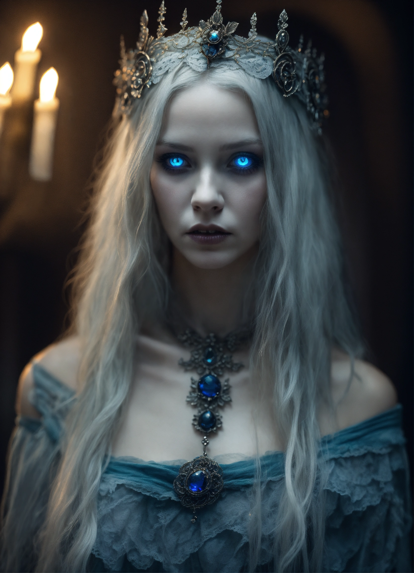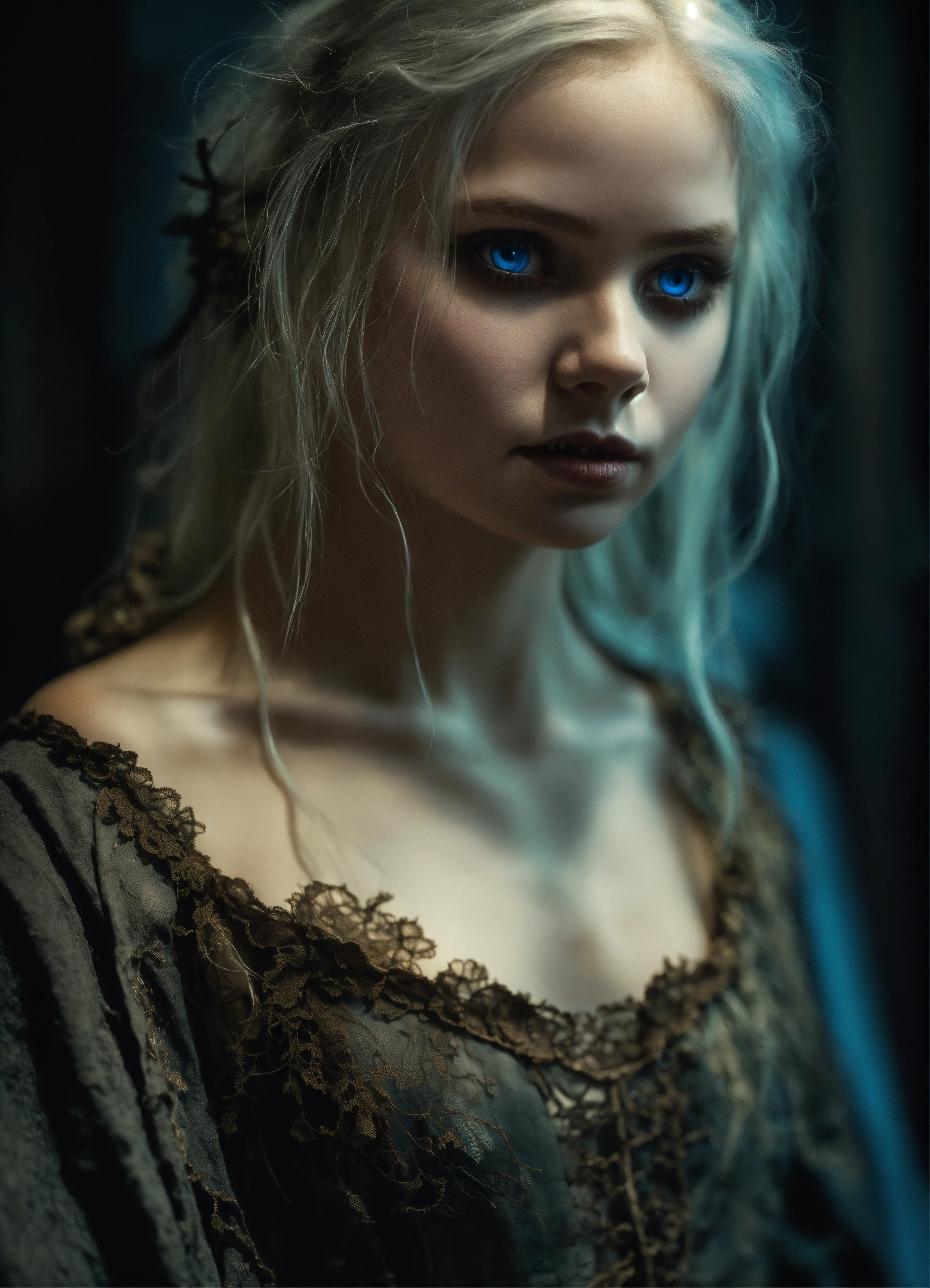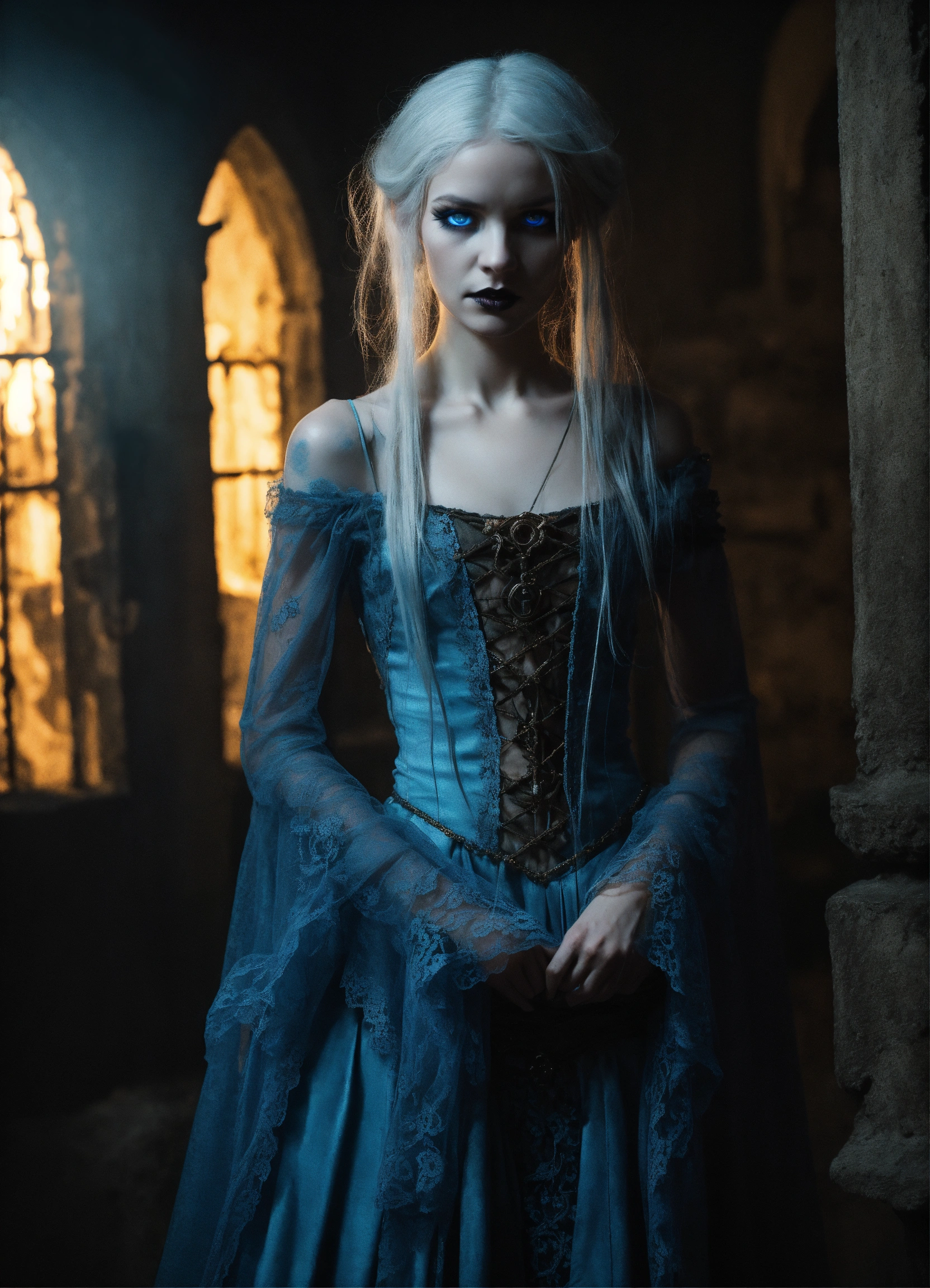 Body portrait, childish twelve year old female goth necromancer, very skinny and emaciated with loose worn long silverwhite hair and alabaster skin pale as a corpse and glowing blue eyes is overcome by darkness in a gloomy crypt, slim face, innocent looking, off-the-shoulder lace cropped corsett and skirt, lightly clad, childlike, juvenile, graceful, wispy, glowing blue eyes, ghostly, dead, evil, demonic, undead, darkness, grotesque, mysterious, dark, cold ambient lighting, focus on face, extremely detailed, fantasy, medieval setting