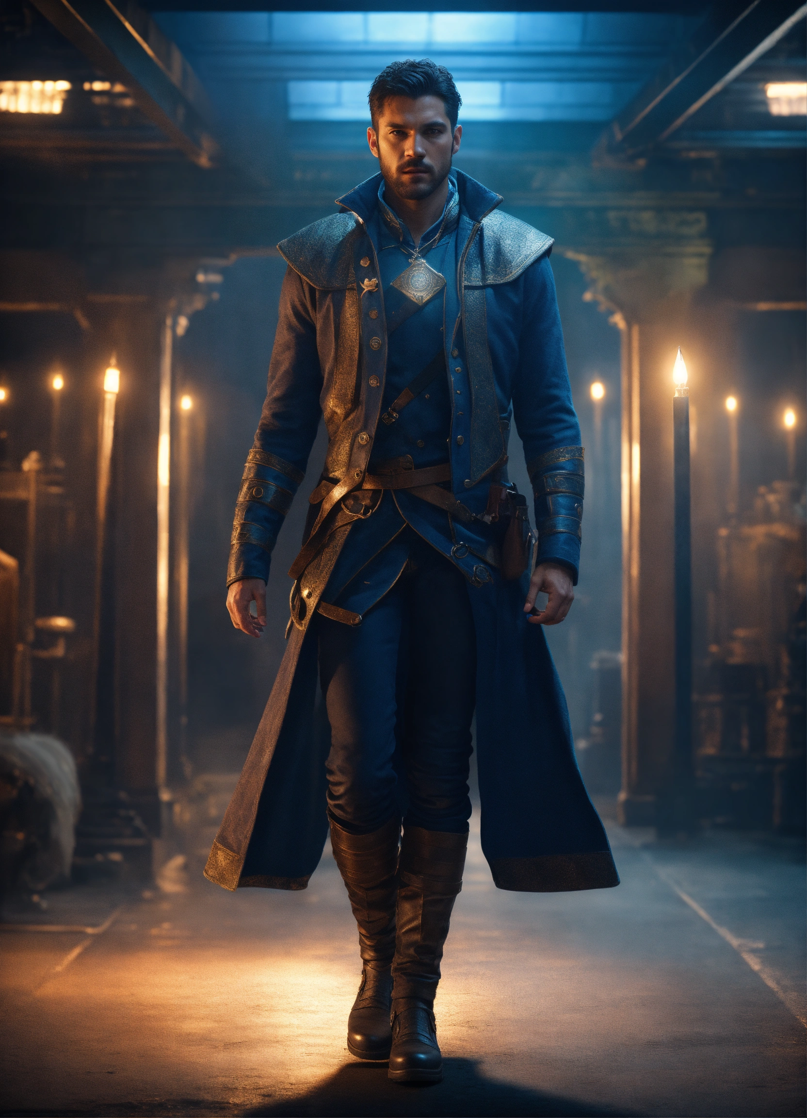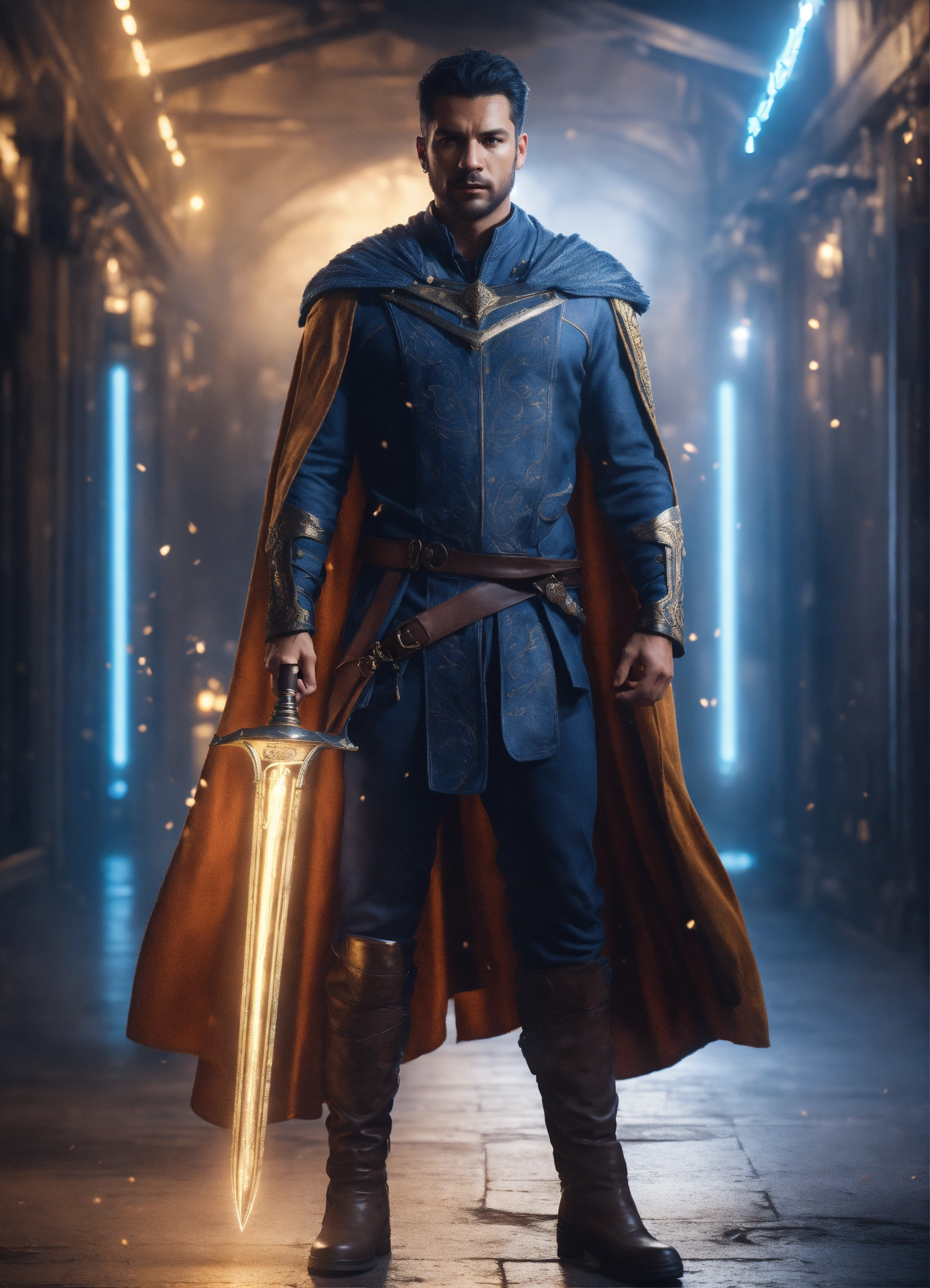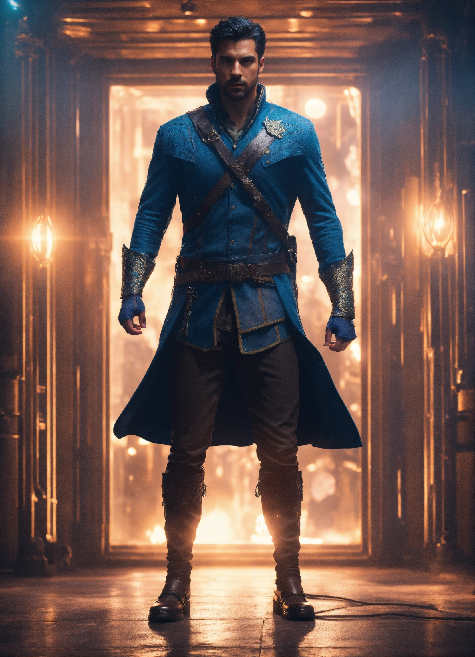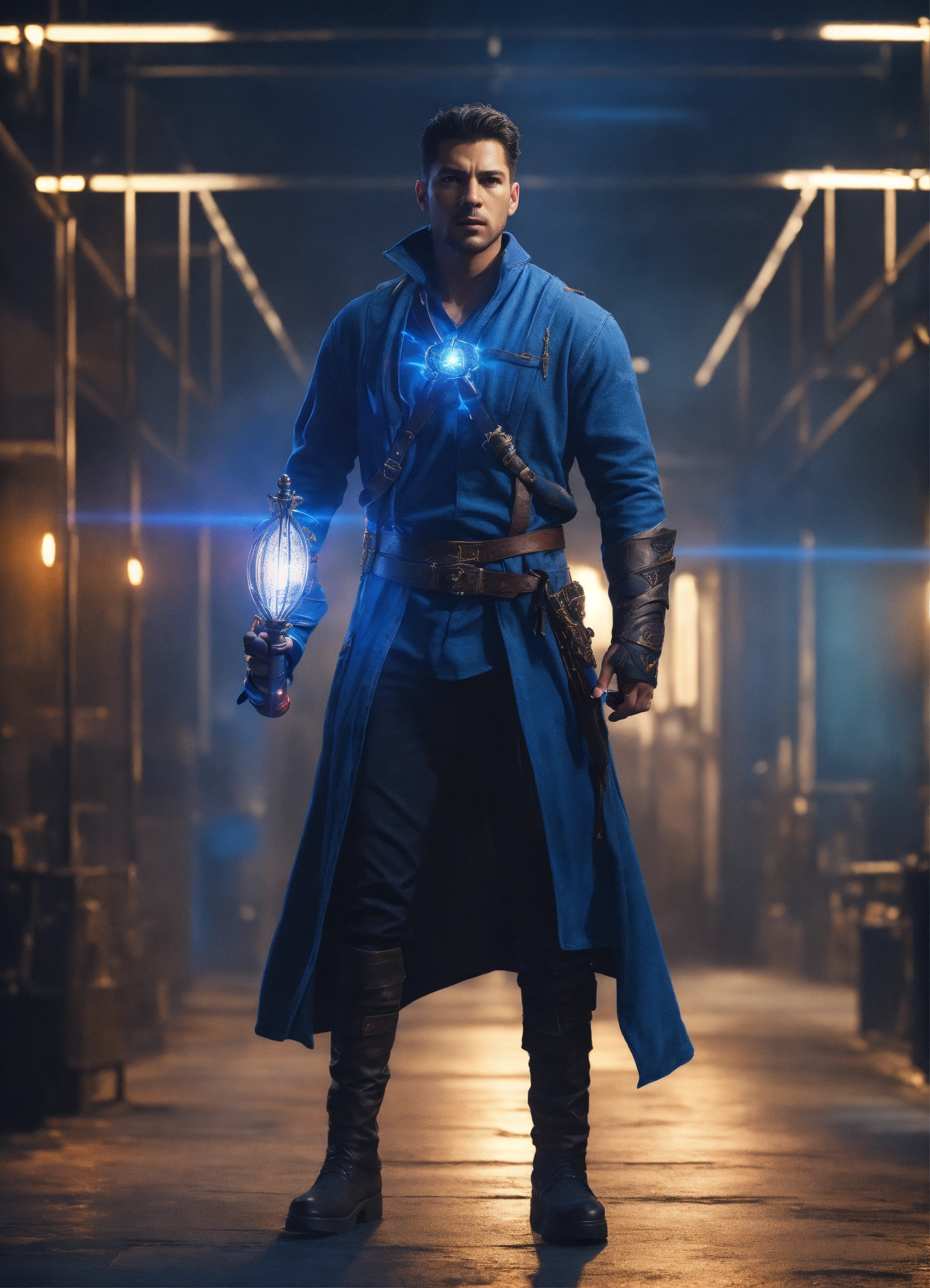 A realistic full body portrait of a hero, teleportation, indigo dagger, magic barriere, neutral background, moody, photorealistic, cinematic scene, super detailed, hyper realistic, bright lights, 8 k