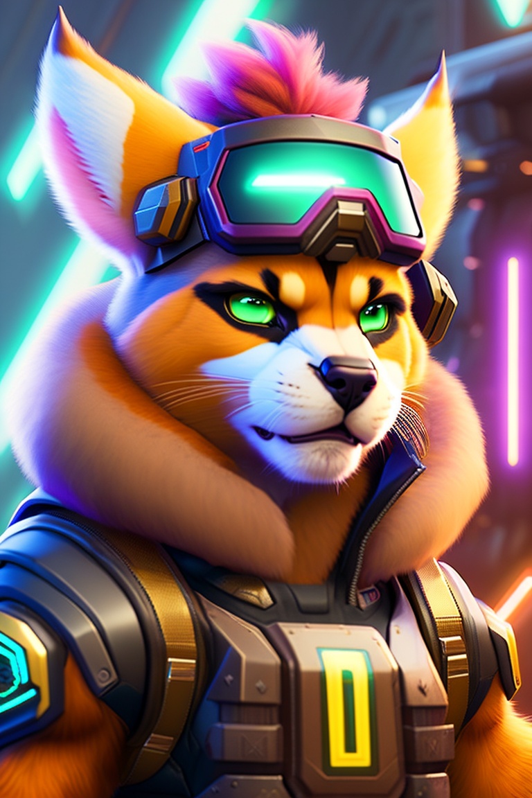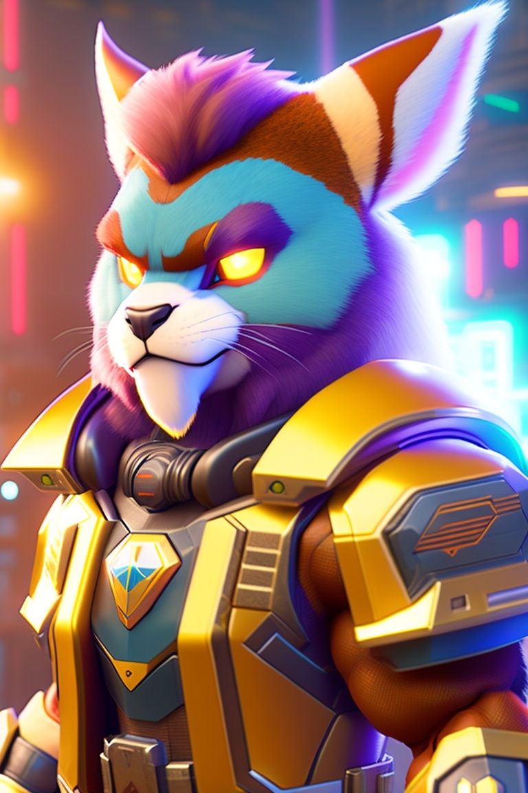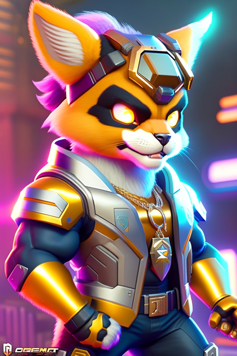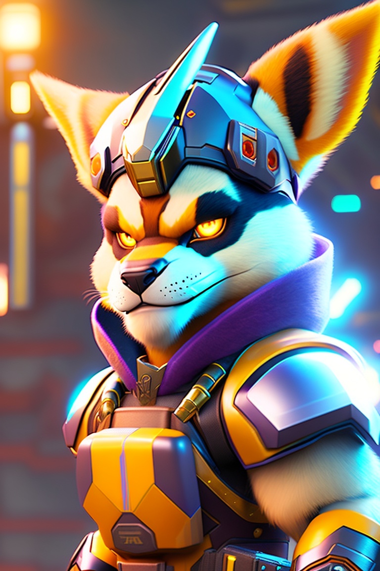 Ratchet from ratchet and clank in the style of cyberpunk 2077, lombax, insomniac games, portrait, furry, action, holding omni wrench, snarling, angry, male, pixar, golden hour lighting