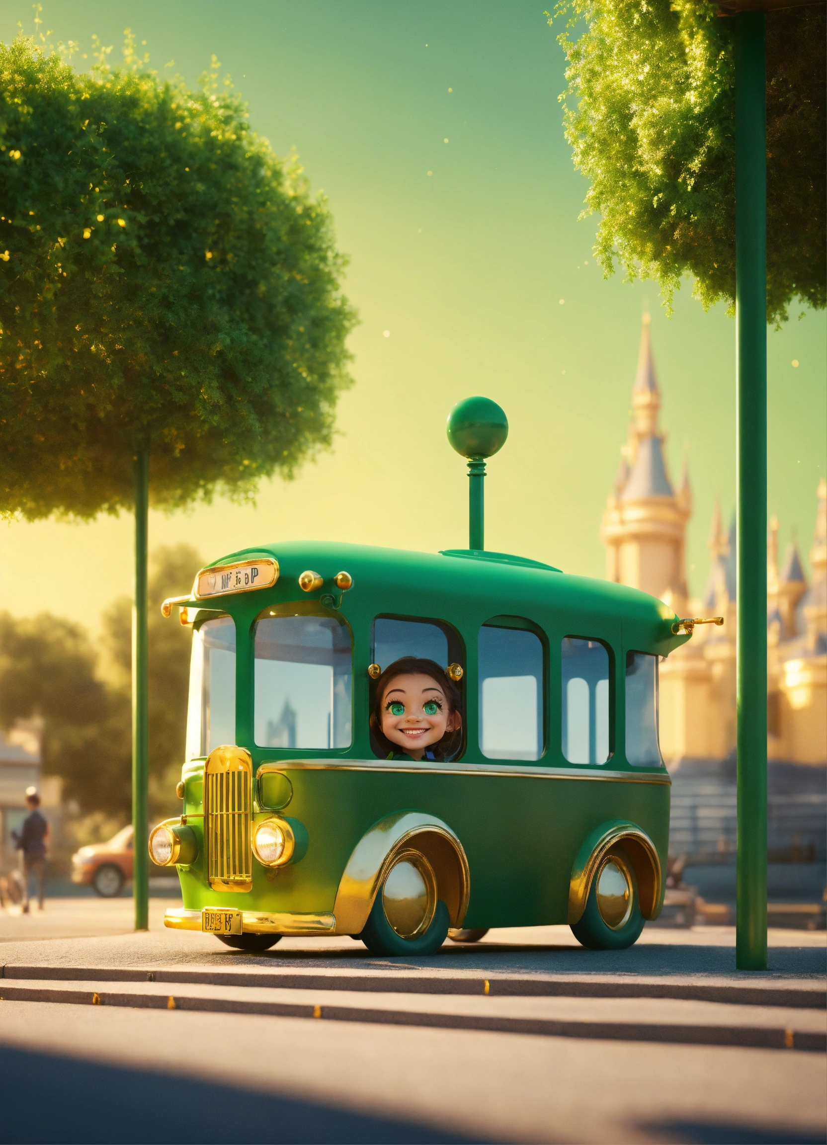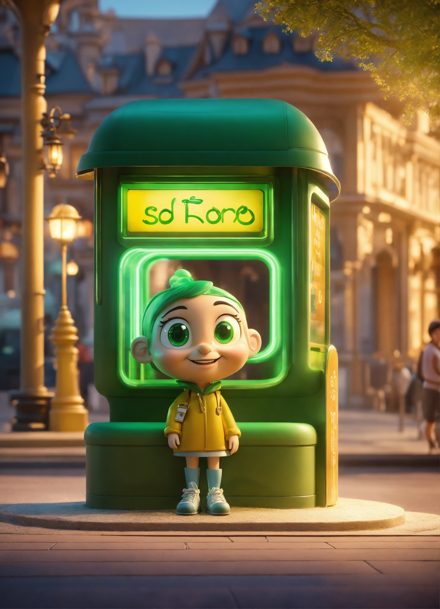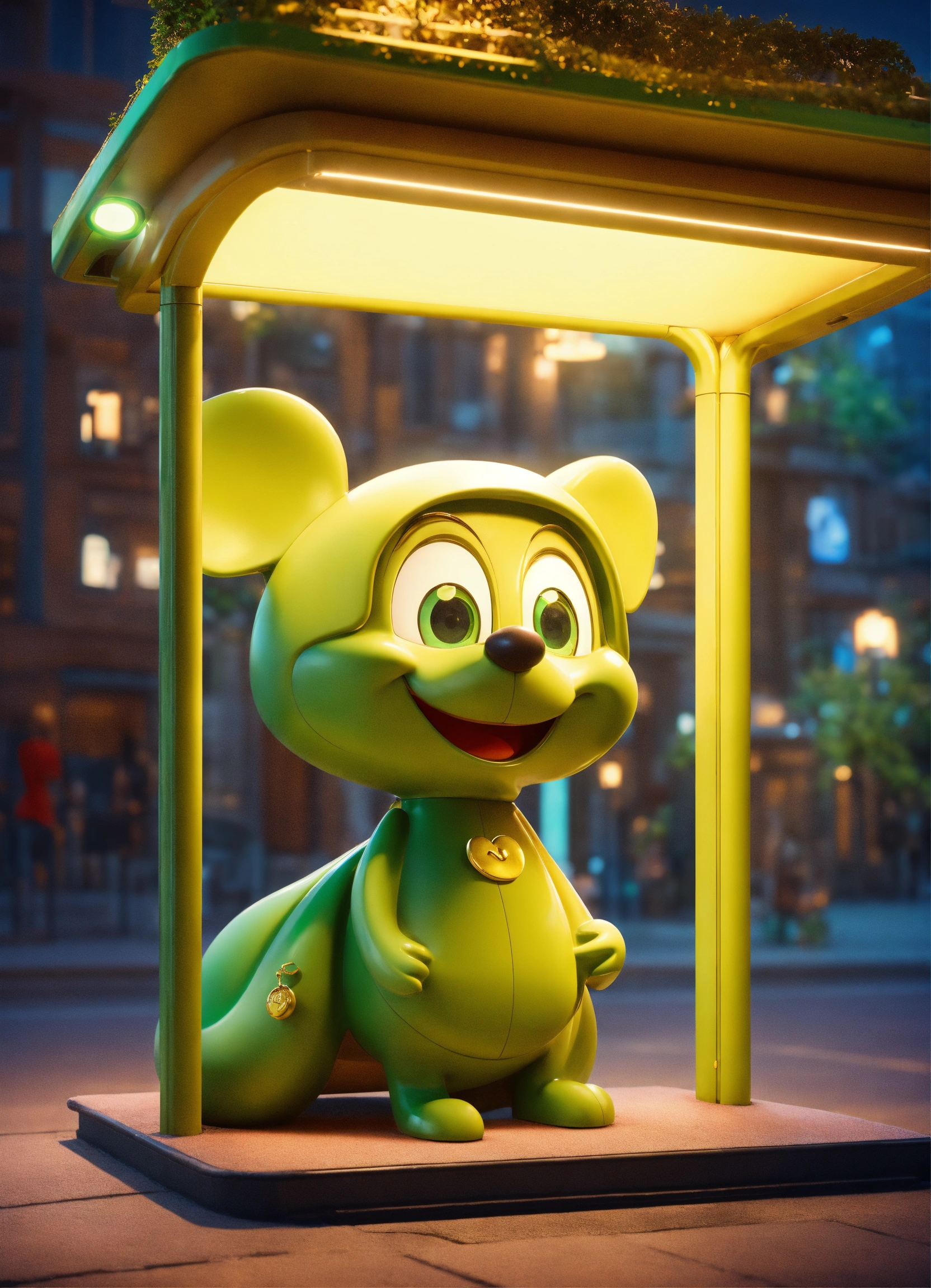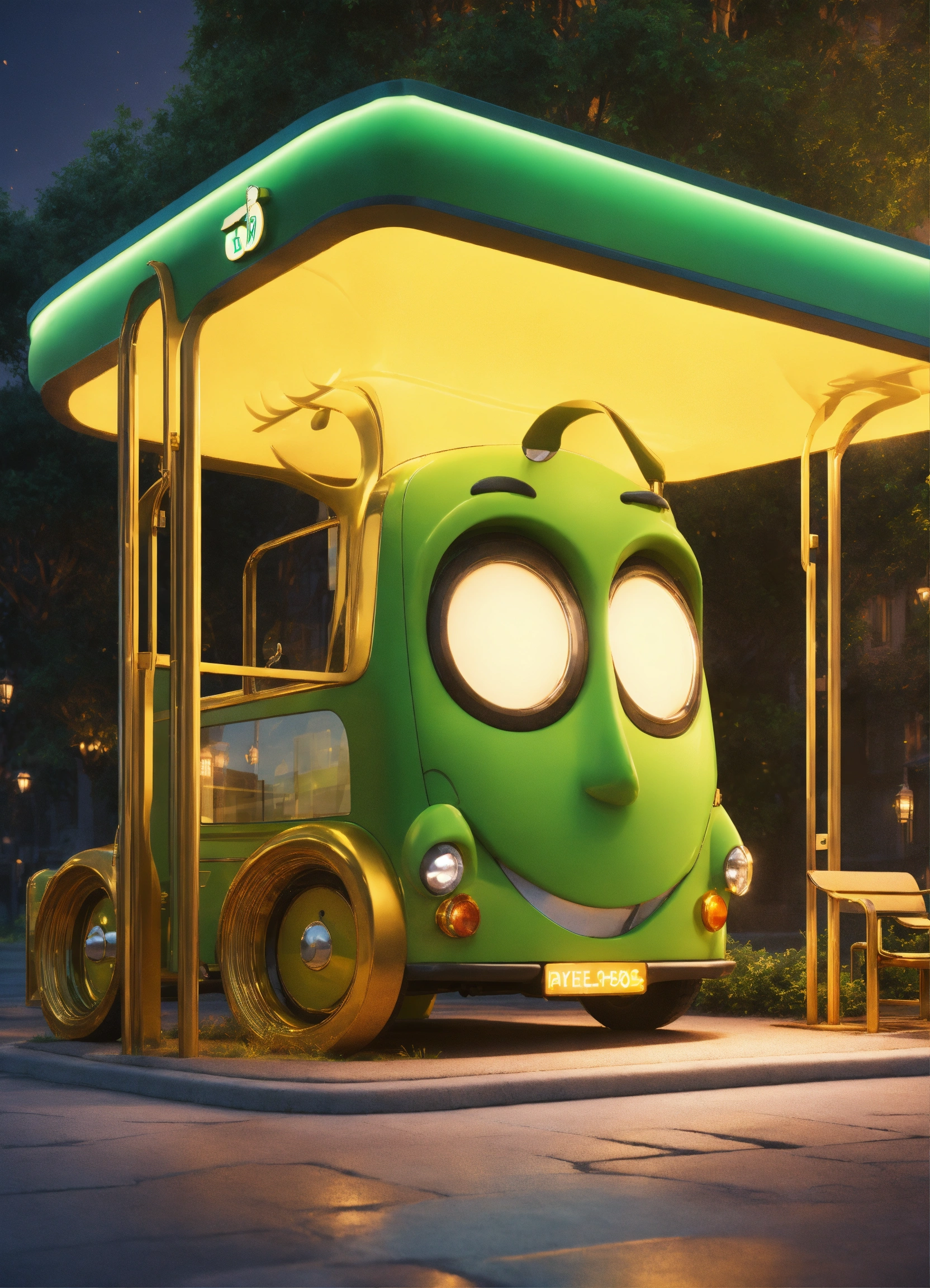 Character small architectural form in the form of a bus stop with big green eyes and cute smile, green colors, gold elements, disney style, 3d, highly detailed, cinematic lighting, warm light