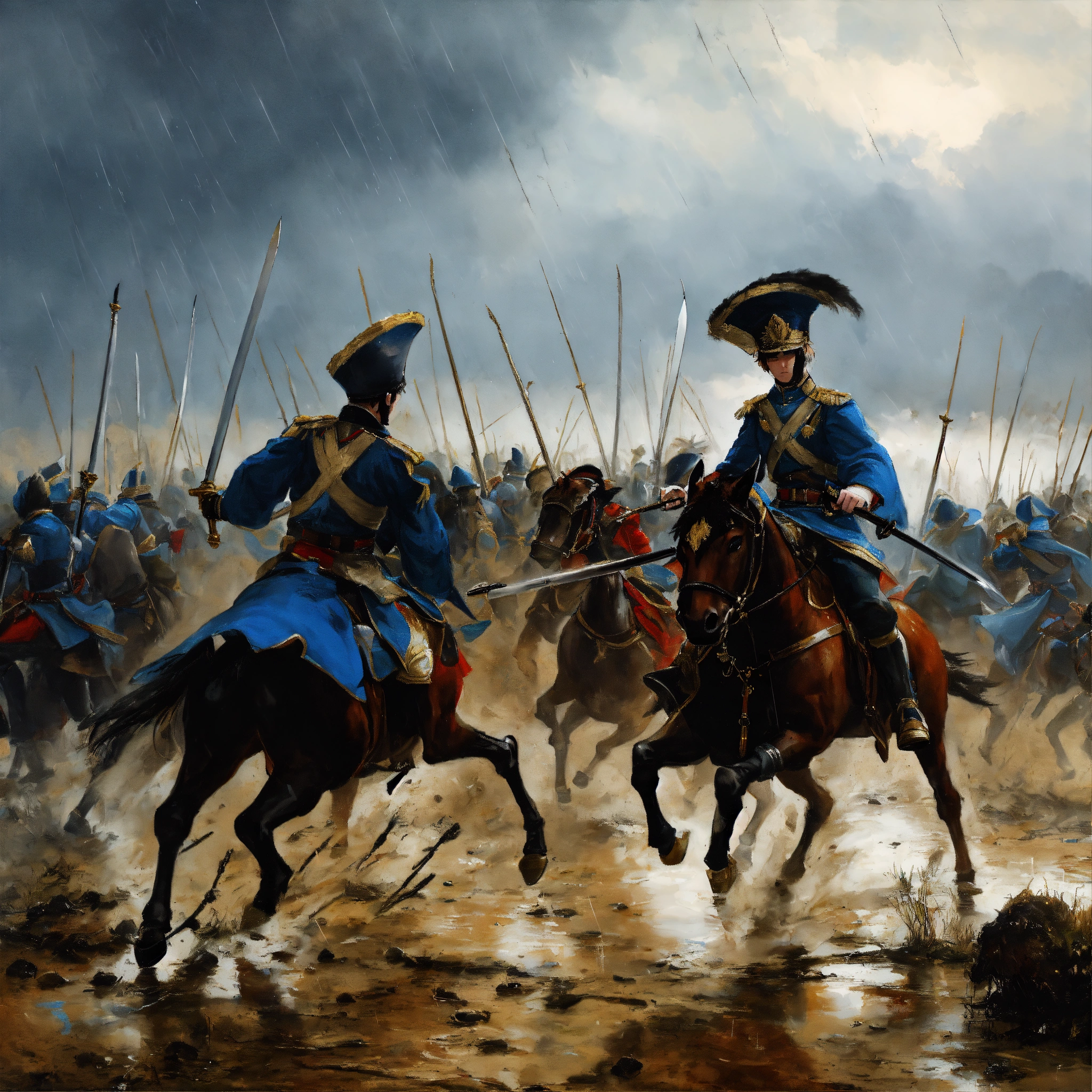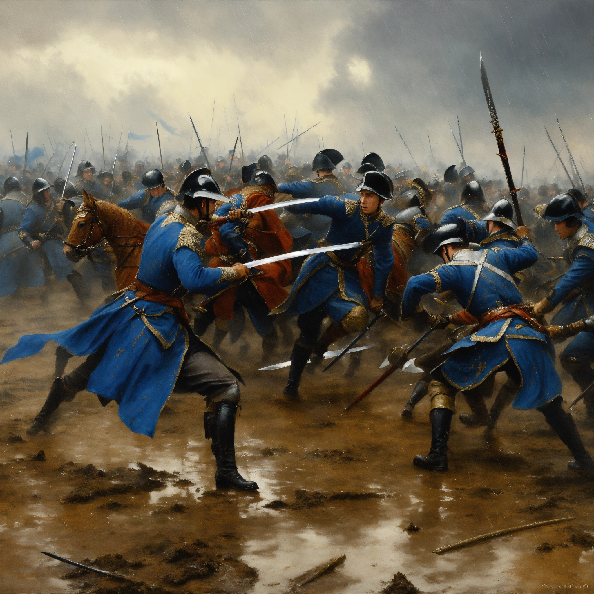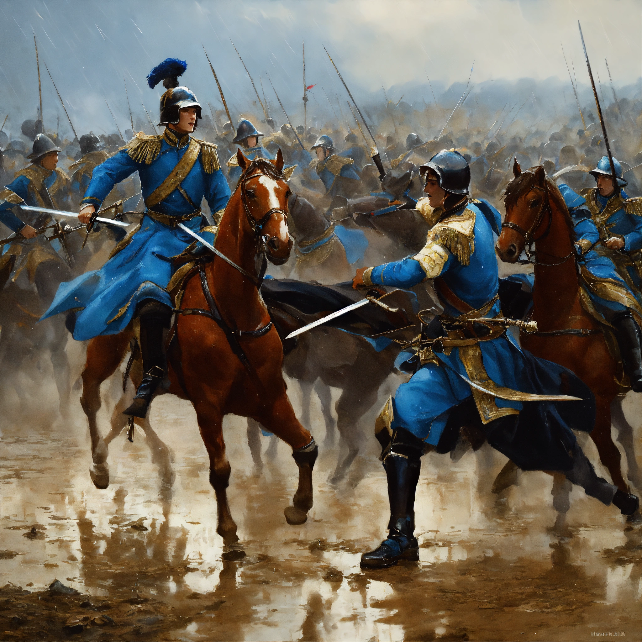 Muddy battlefield in the rain where young white nobles in blue and black uniform fight each other with swords painting