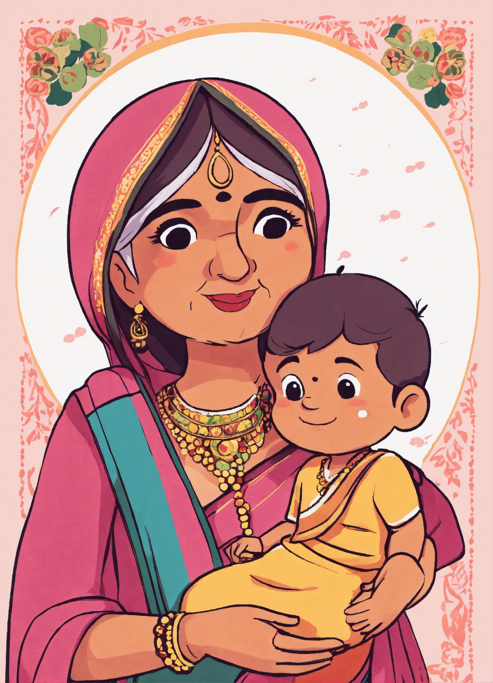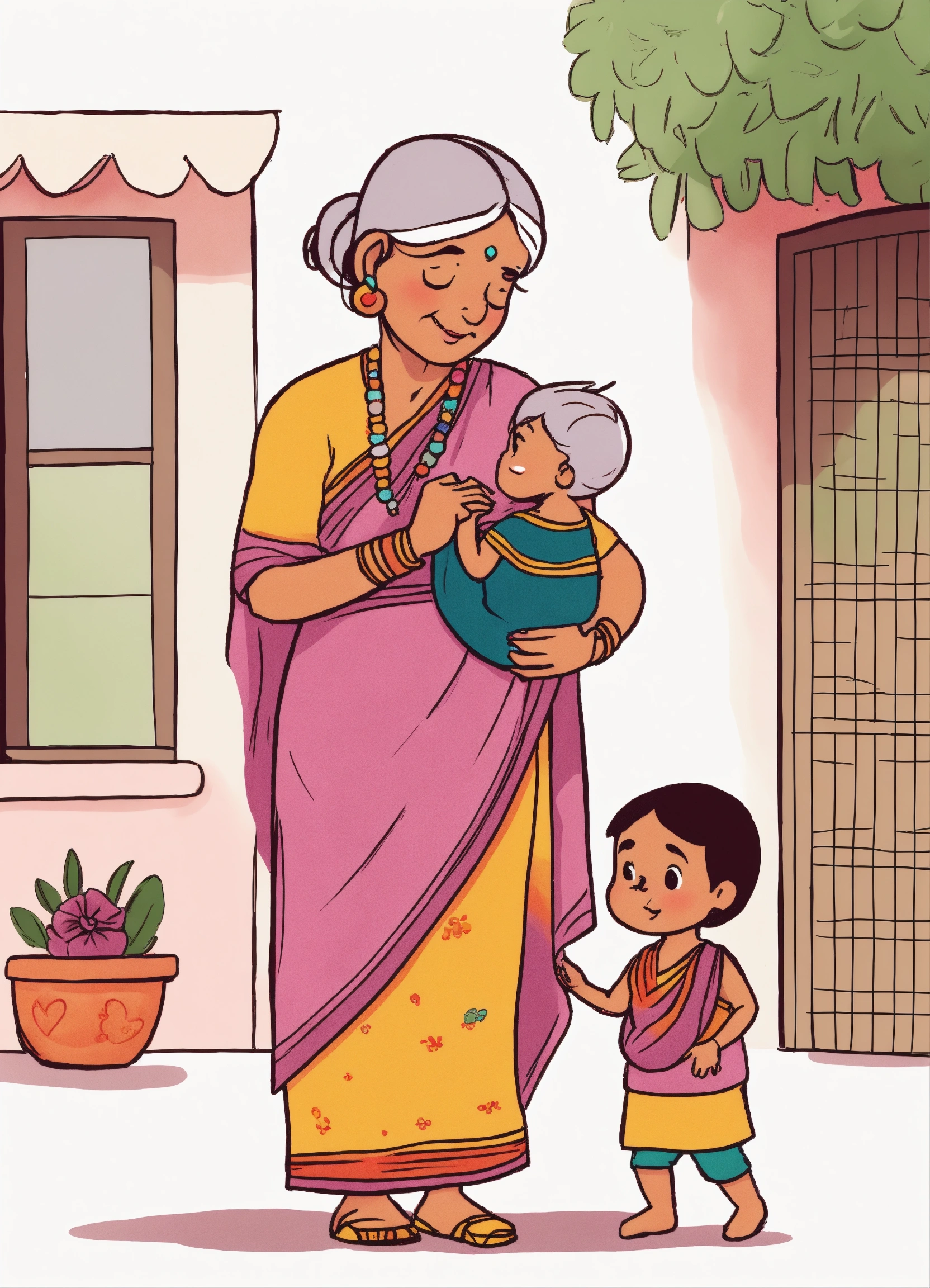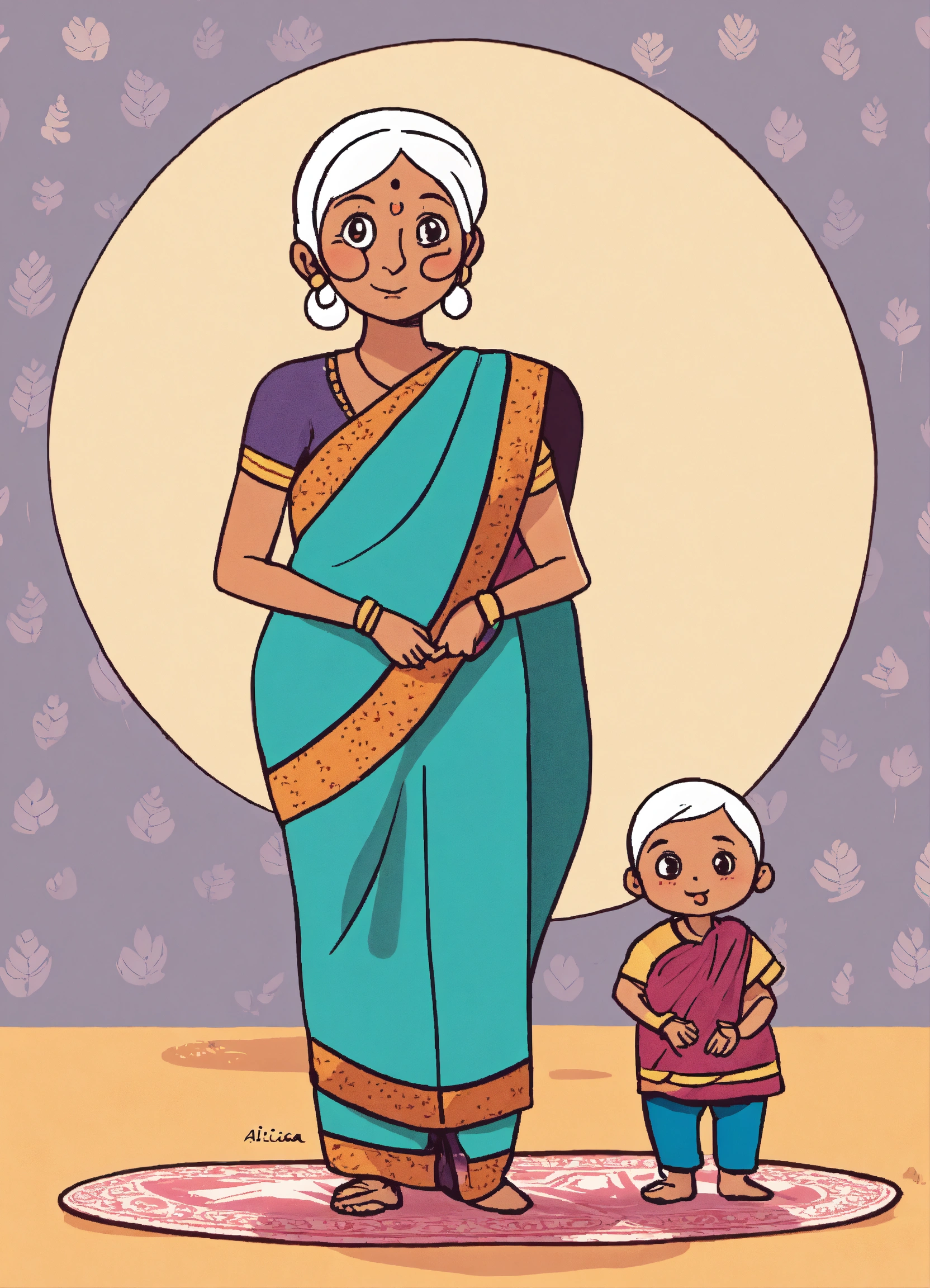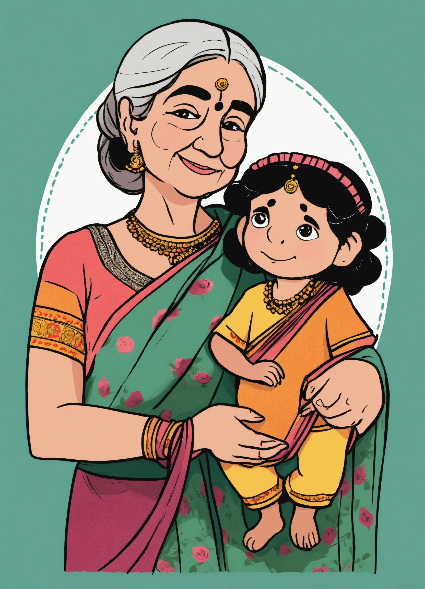 White background, cute round cartoon doodle of indian grandma in a sari, facing right and down towards small child, flat colors, comic book style, style of alicia souza