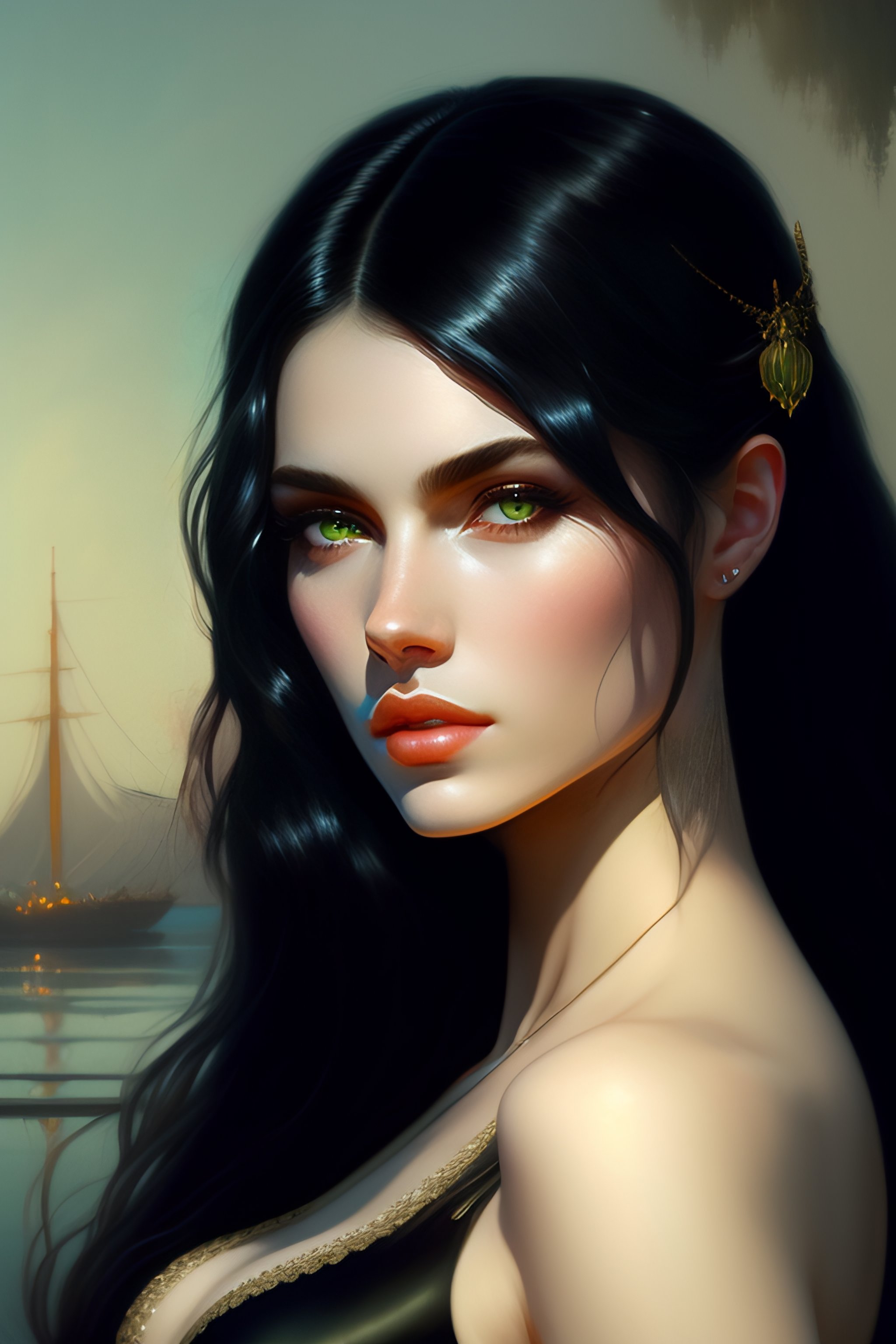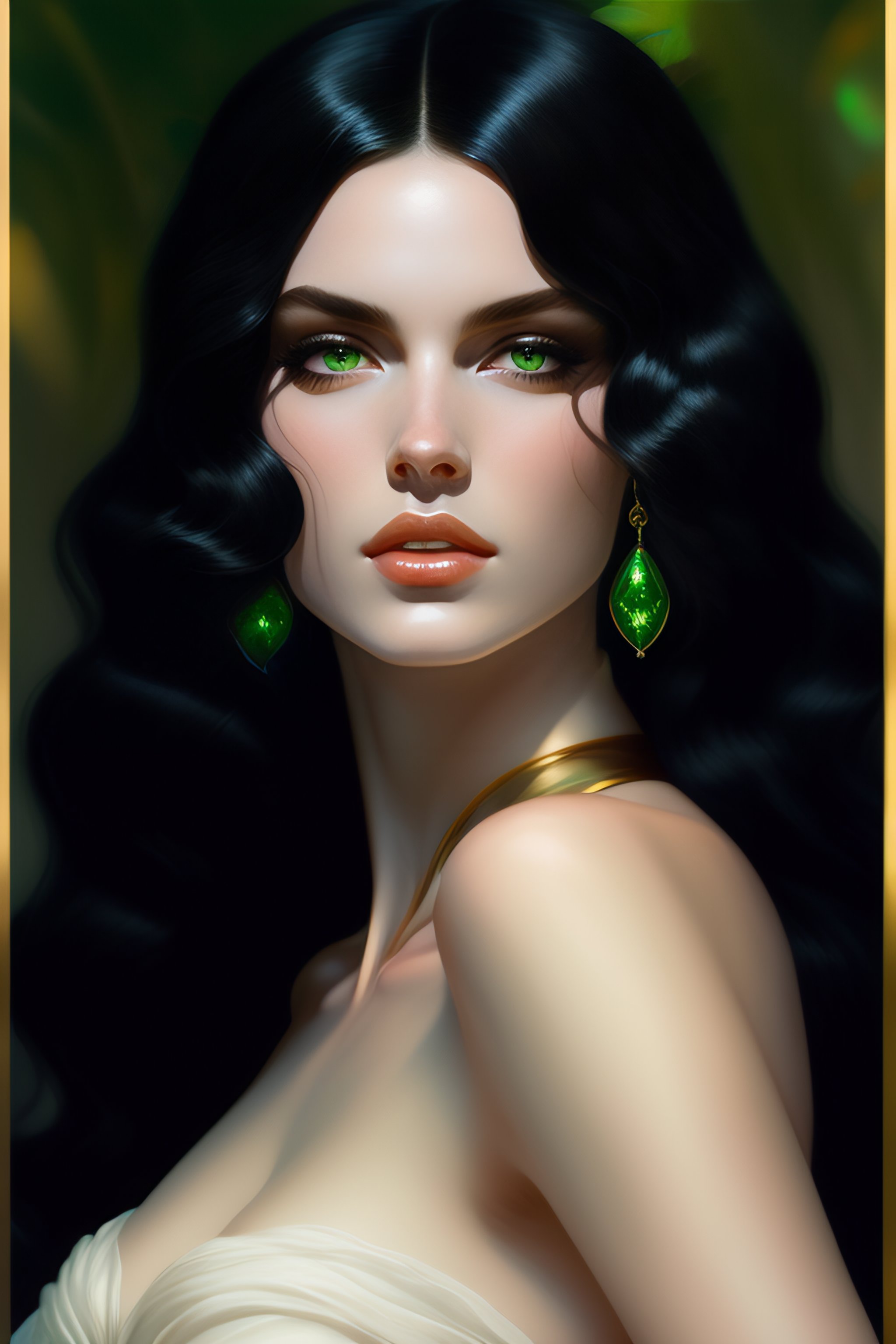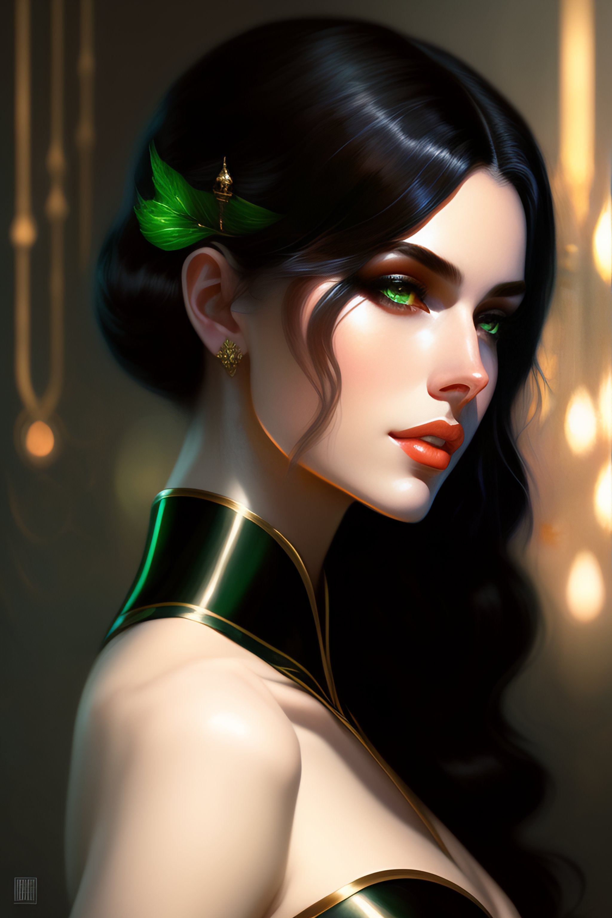 Black hair woman, pale skin, white skin, green eyes, black clothes, kissing a boy fantasy magic, dark pin-up style hair, dark light night, intricate, elegant, sharp focus, illustration, highly detailed, digital painting, concept art, matte, art by wlop and artgerm and greg rutkowski and alphonse mucha, masterpiece, black background