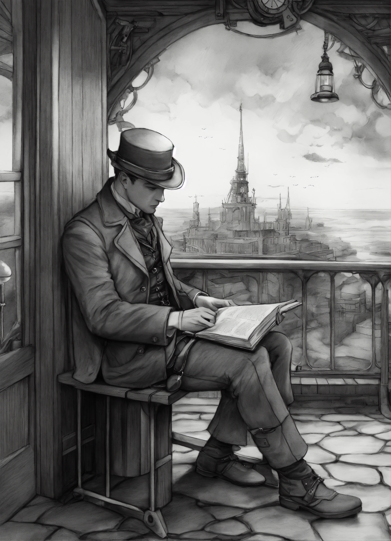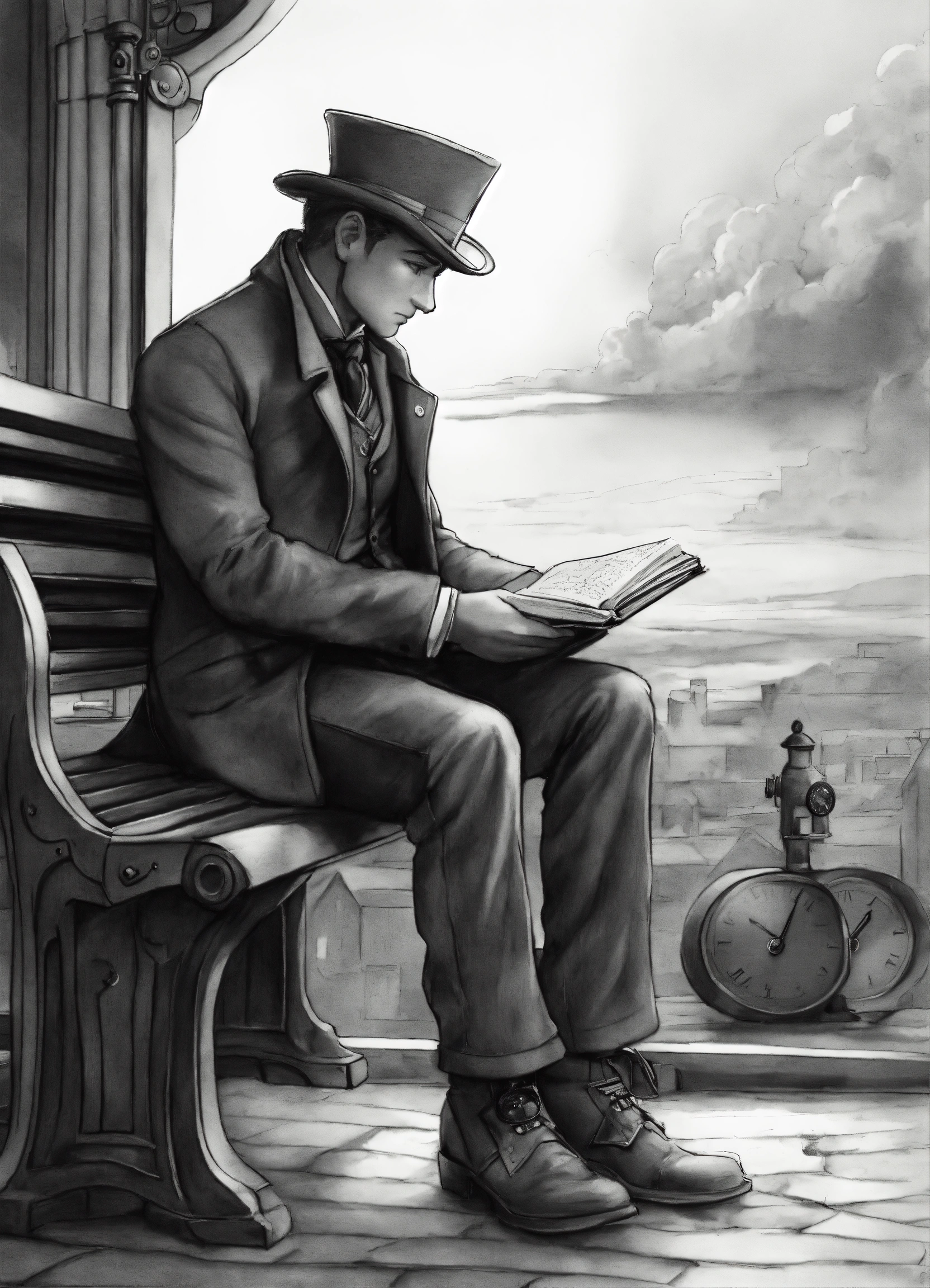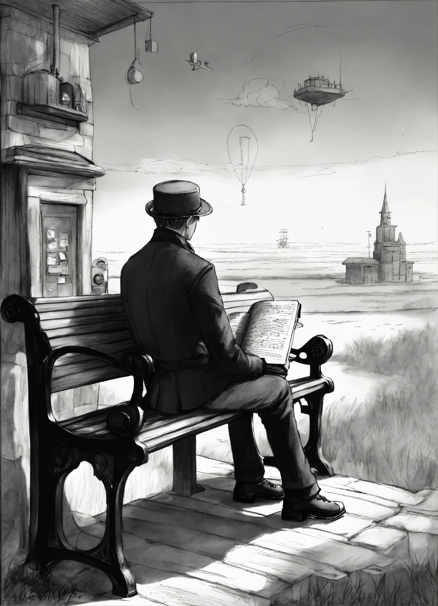 A pencil sketch of a scene depicting a 50 years sitting sadly on a bench looking at the horizon at dawn, with an open book on his lap, in steampunk style, greyscale