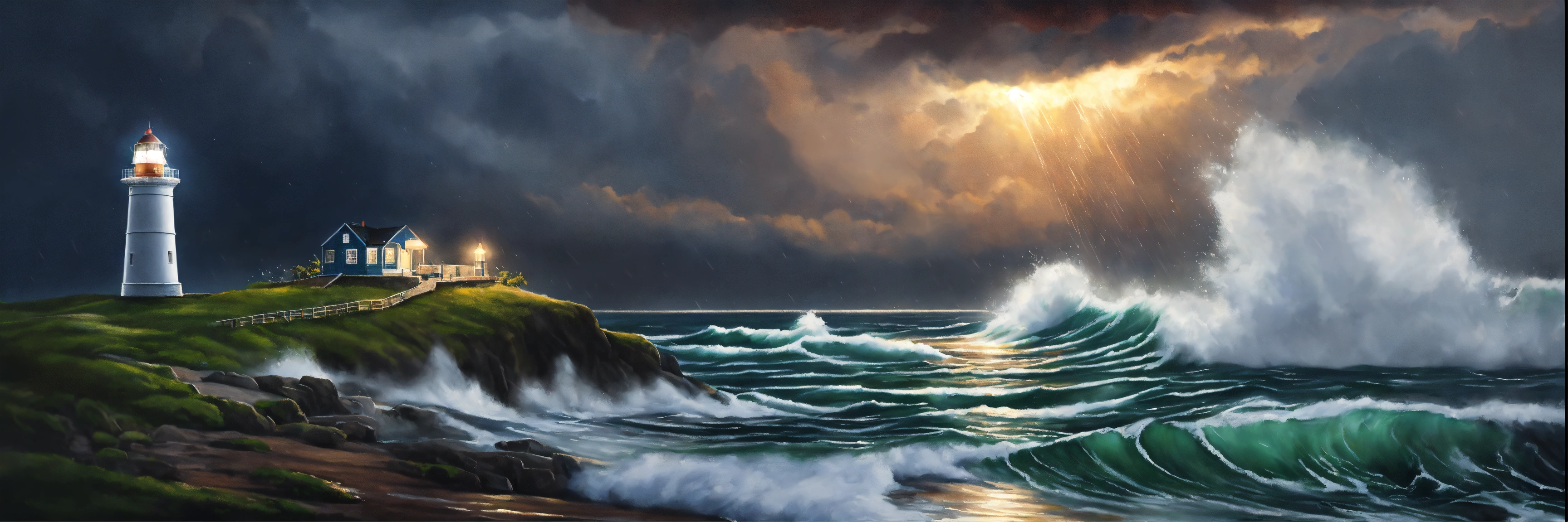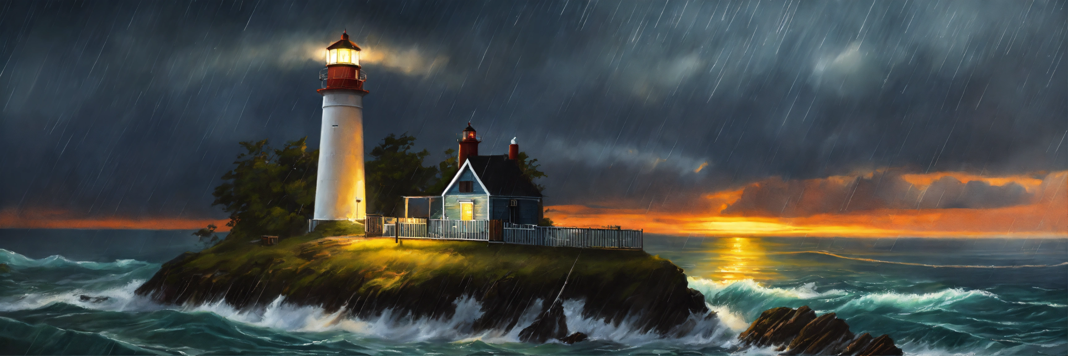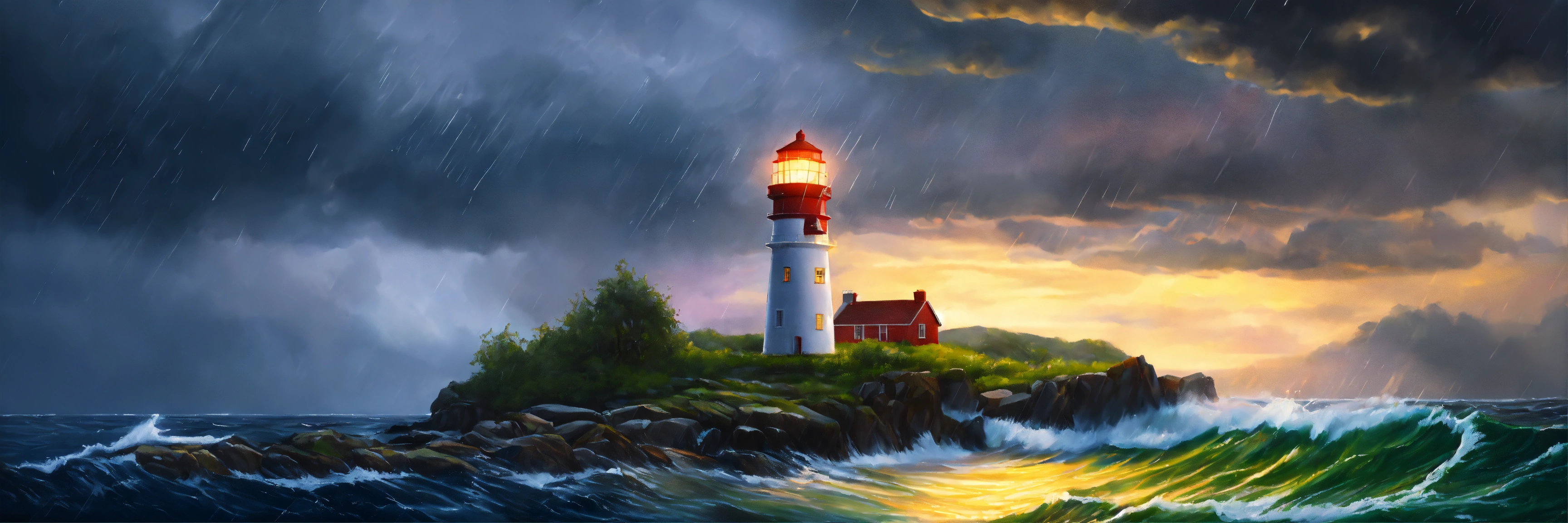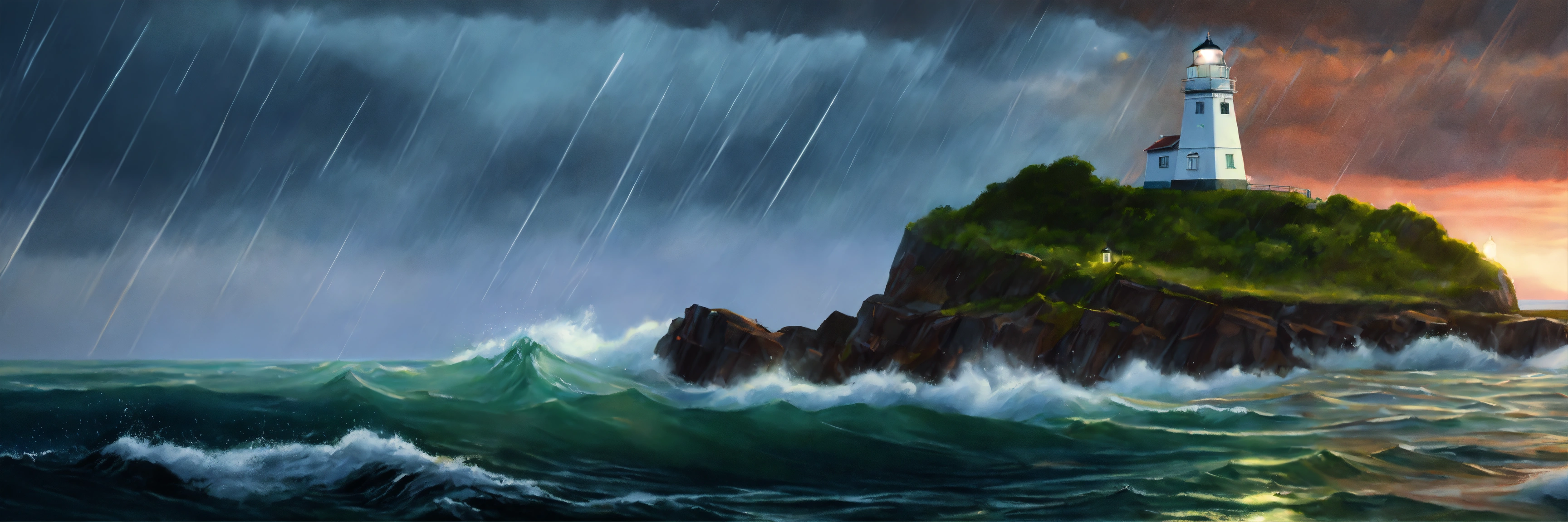 Create a highly detailed and photorealistic painting of a lighthouse standing tall on an island amidst heavy rain at night. the painting should feature harsh directional lighting, with the lighthouse light beam casting across the stormy sea. use acrylic paint to give the scene full of color and depth, and ensure that the final output is a high-resolution masterpiece.