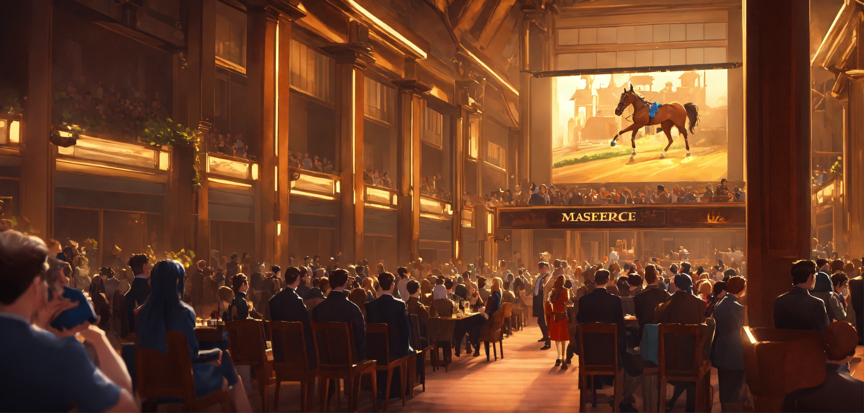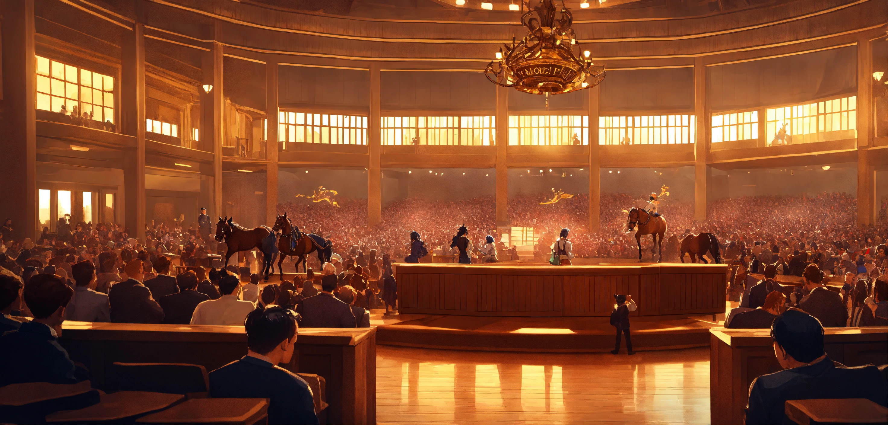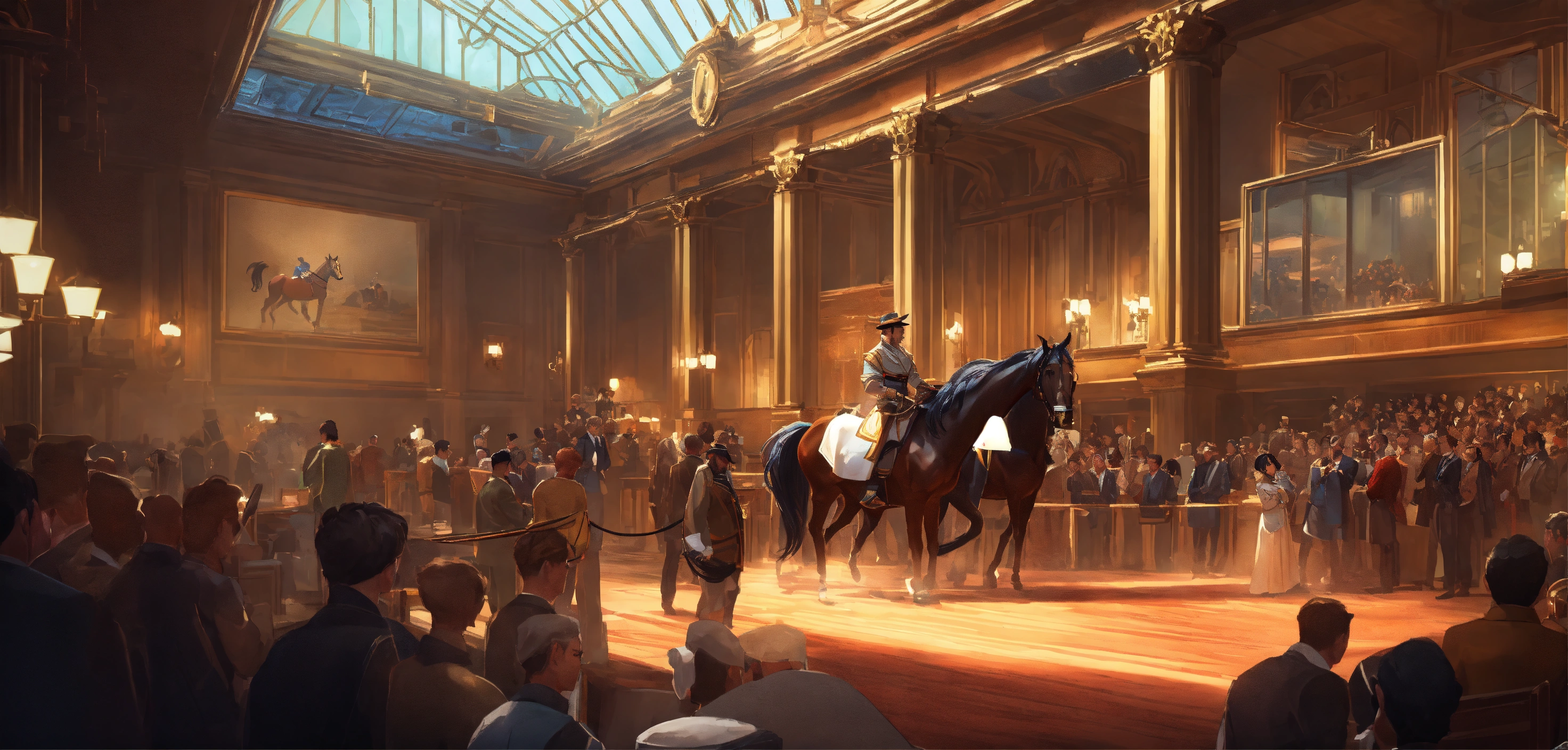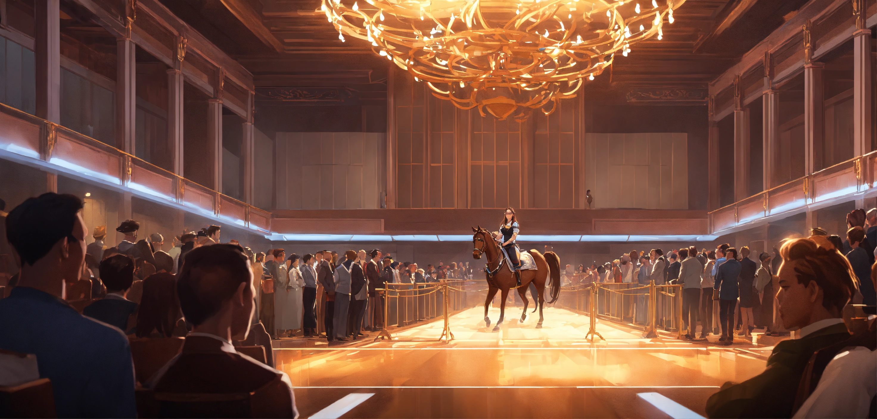 A highly detailed league of legend dynamic illustration of the horse auction in little modern event hall by joshua raphael, by artgerm, by huyy nguyen, by cj xander, by jennifer wuestling, by diep duong van, by huyy nguyen, by grafit studio, volumetric lighting, 3d render, 4k resolution, trending on artstation, masterpiece, close up frame, cinematic shot, sport competition, epic, keeneland sales, inside hall with stands, lot of armchairs with people, one horse in centre only, evening, hall without windows, a windowless hall with a horse on the stand