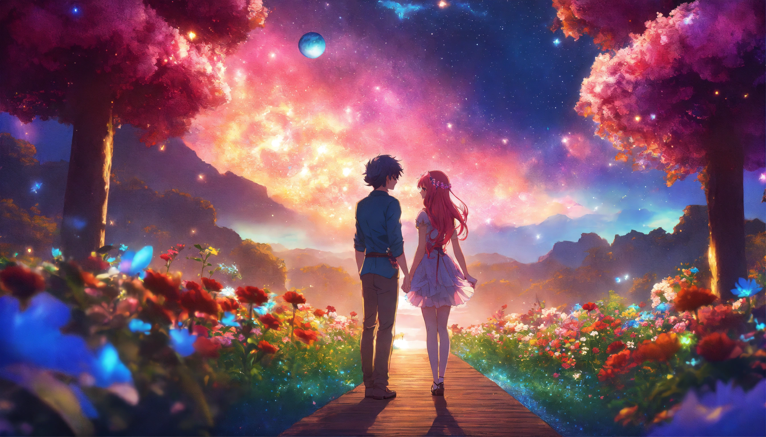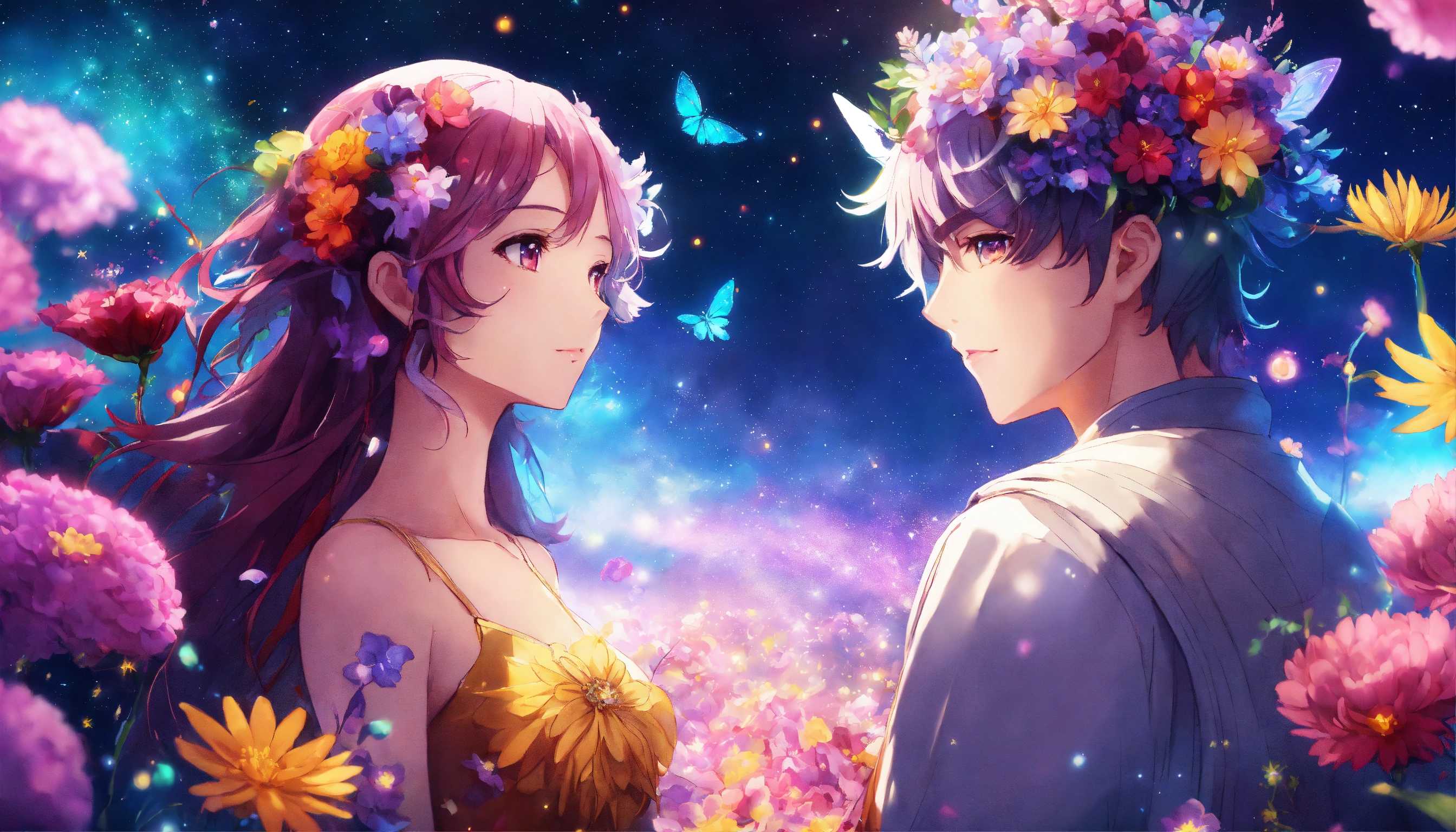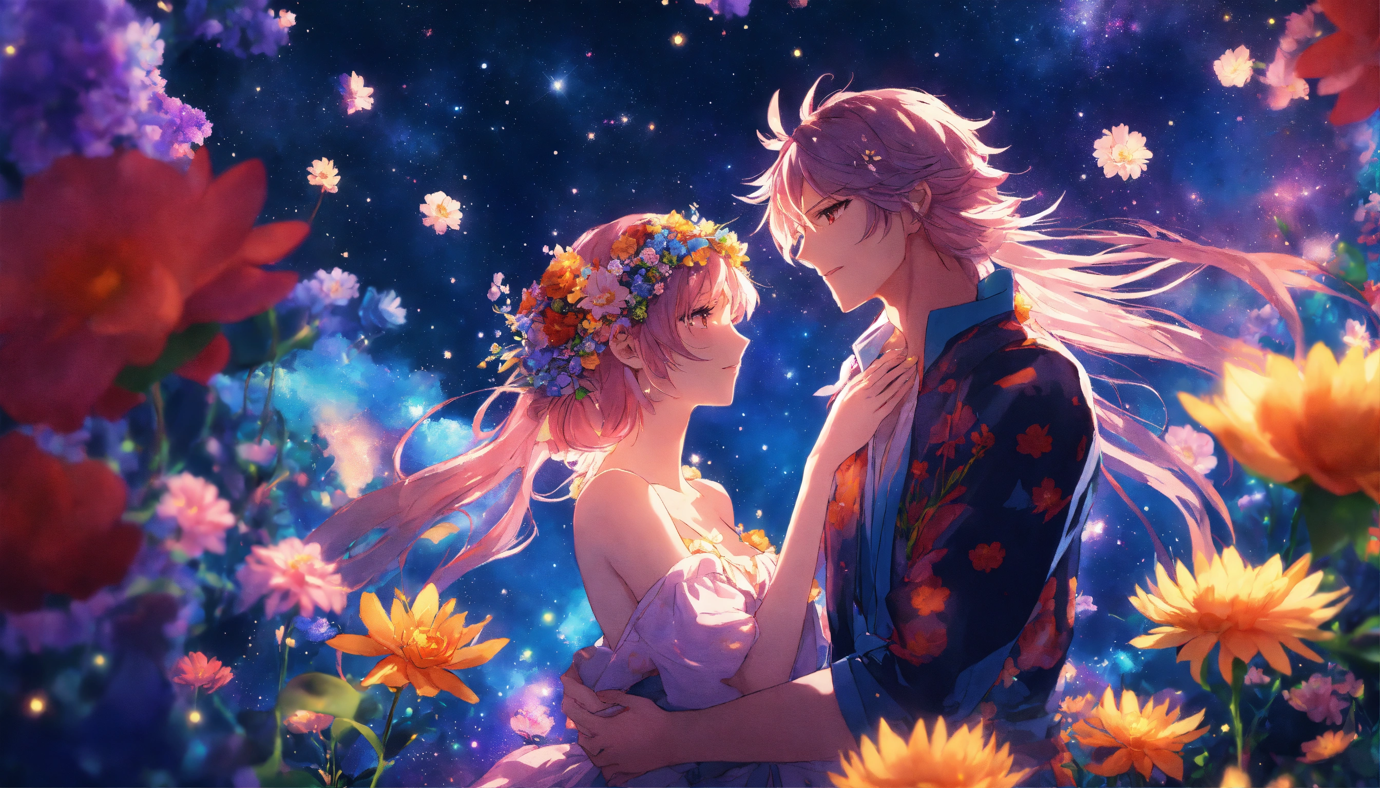 Anime of a beautiful fairy couple, with long flower hair, vibrant colors, flowers in space garden, stars, cosmic, flowers, cinematic lighting, 8k resolution, seamless, anime style