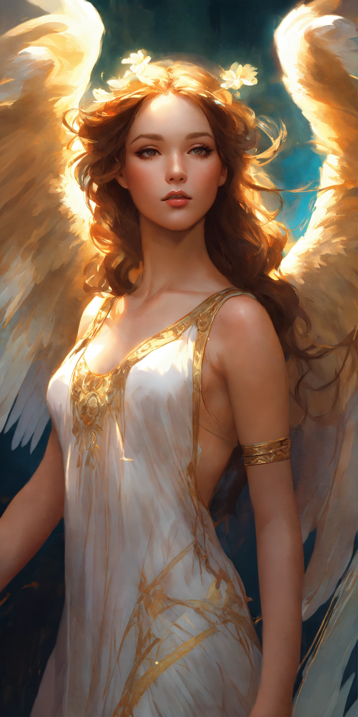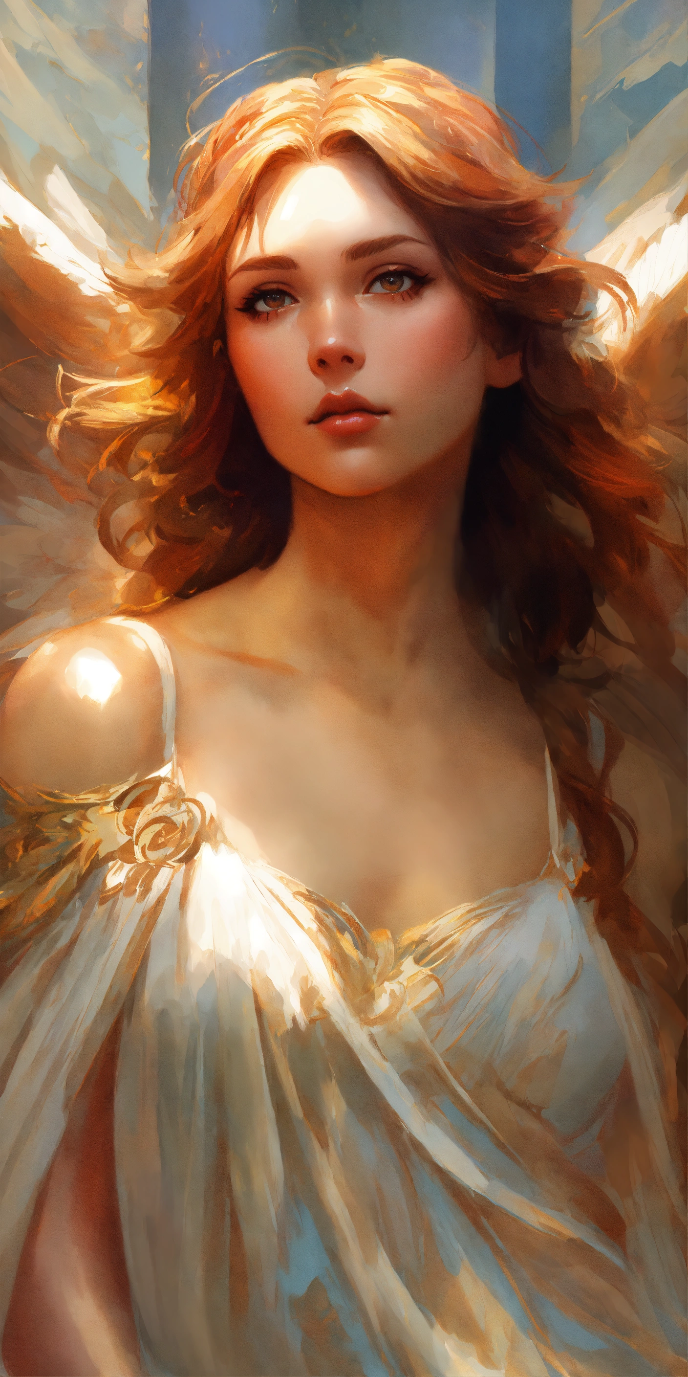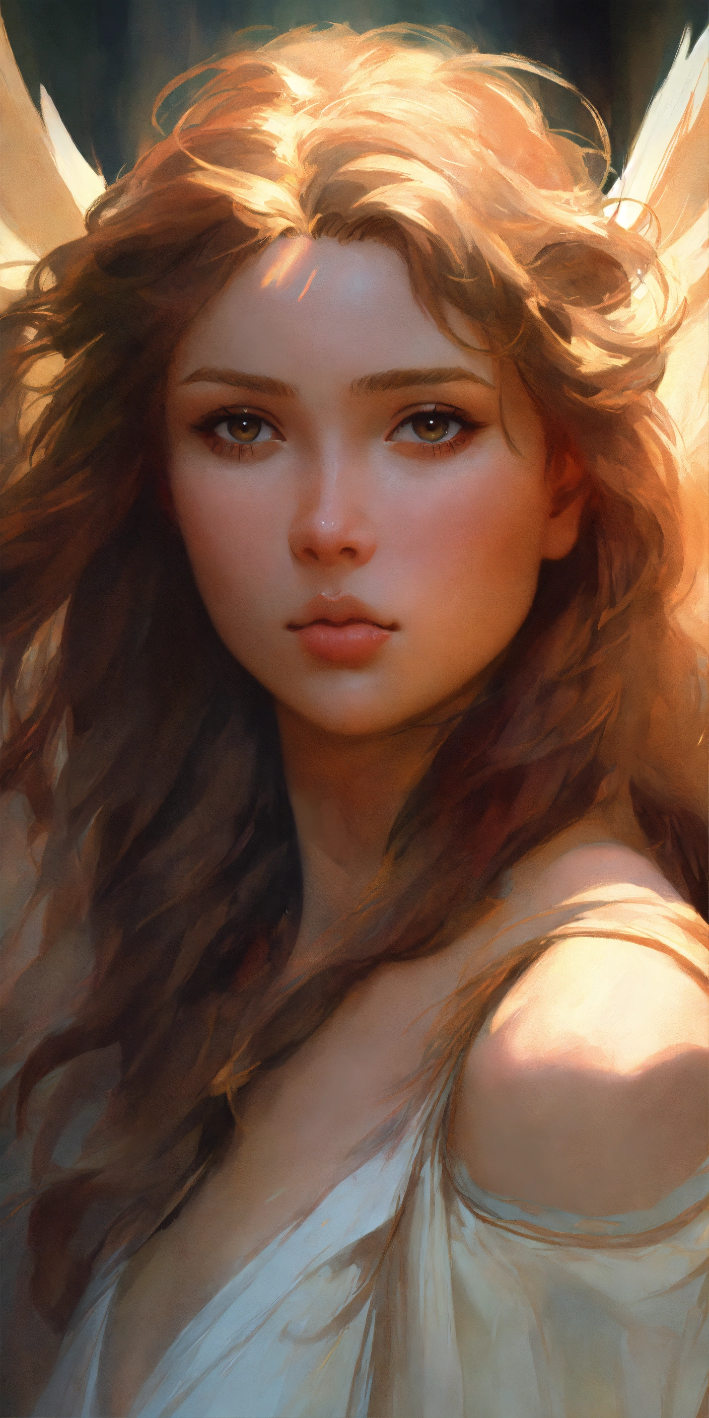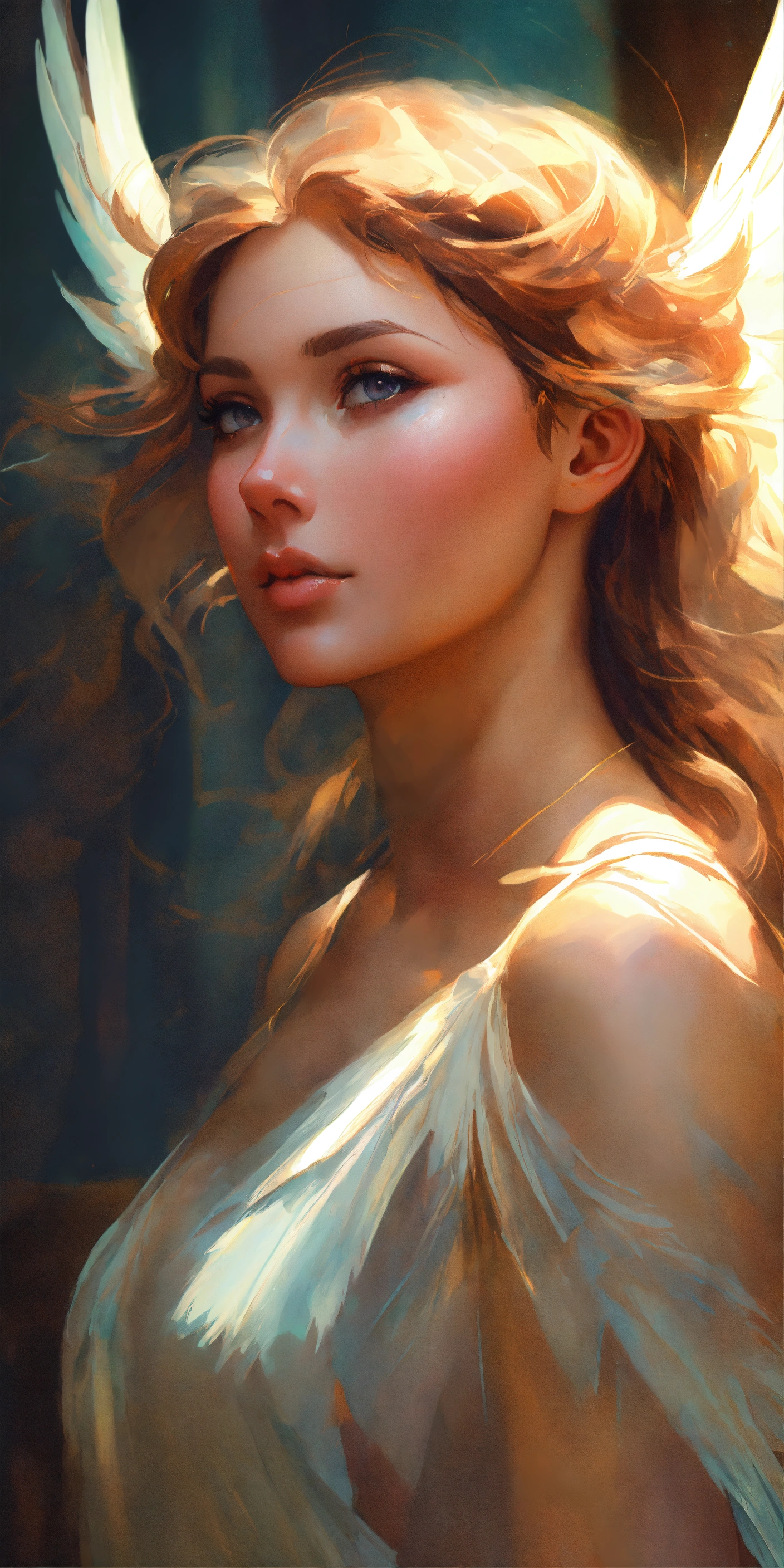 Angel, wings, impressionistic, headshot, digital painting, artstation, real, sharp focus, cinematic lighting, illustration, art by artgerm and greg rutkowski, alphonse mucha, cgsociety