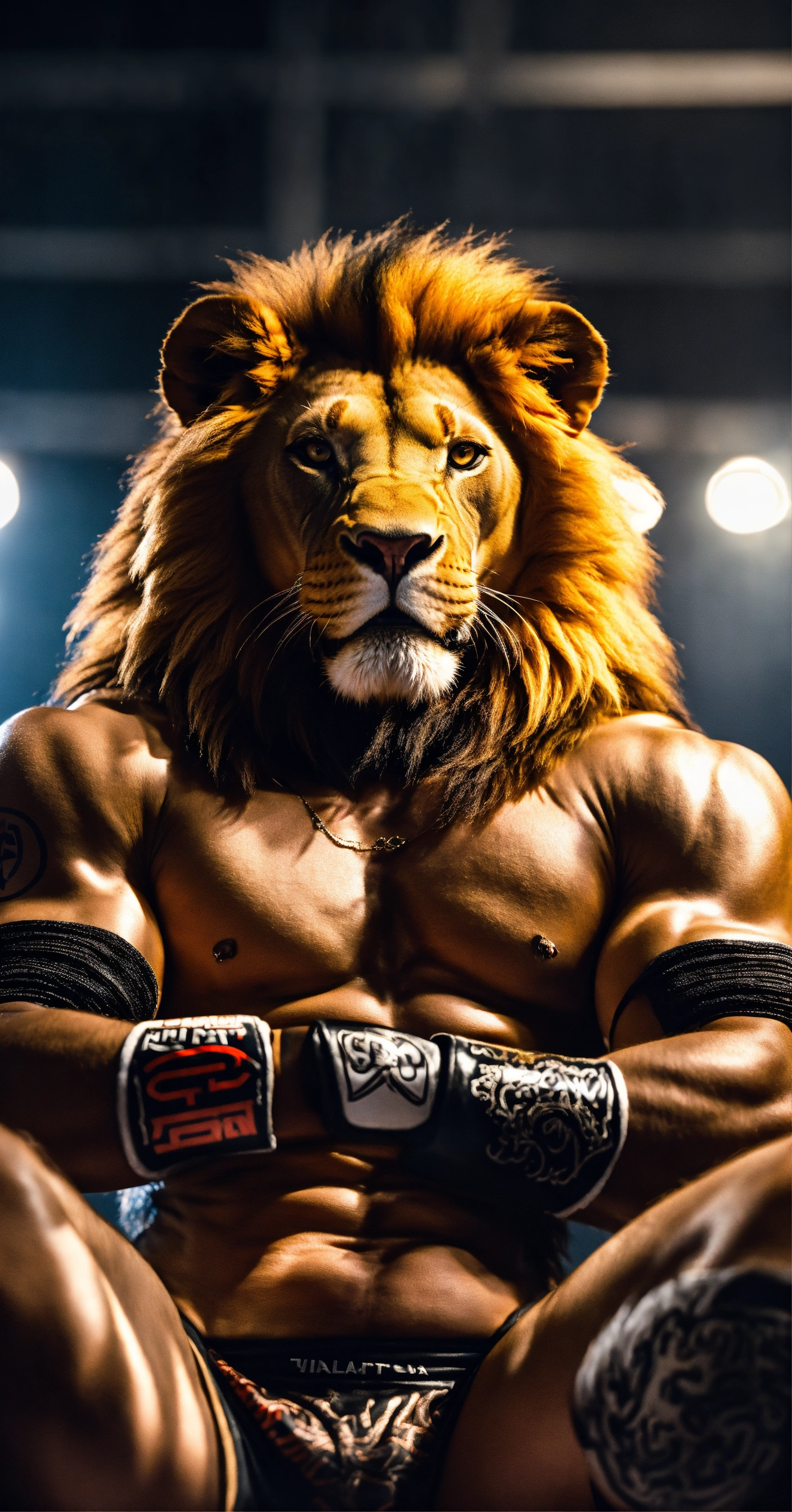 A lion posing as mma fighter like a man