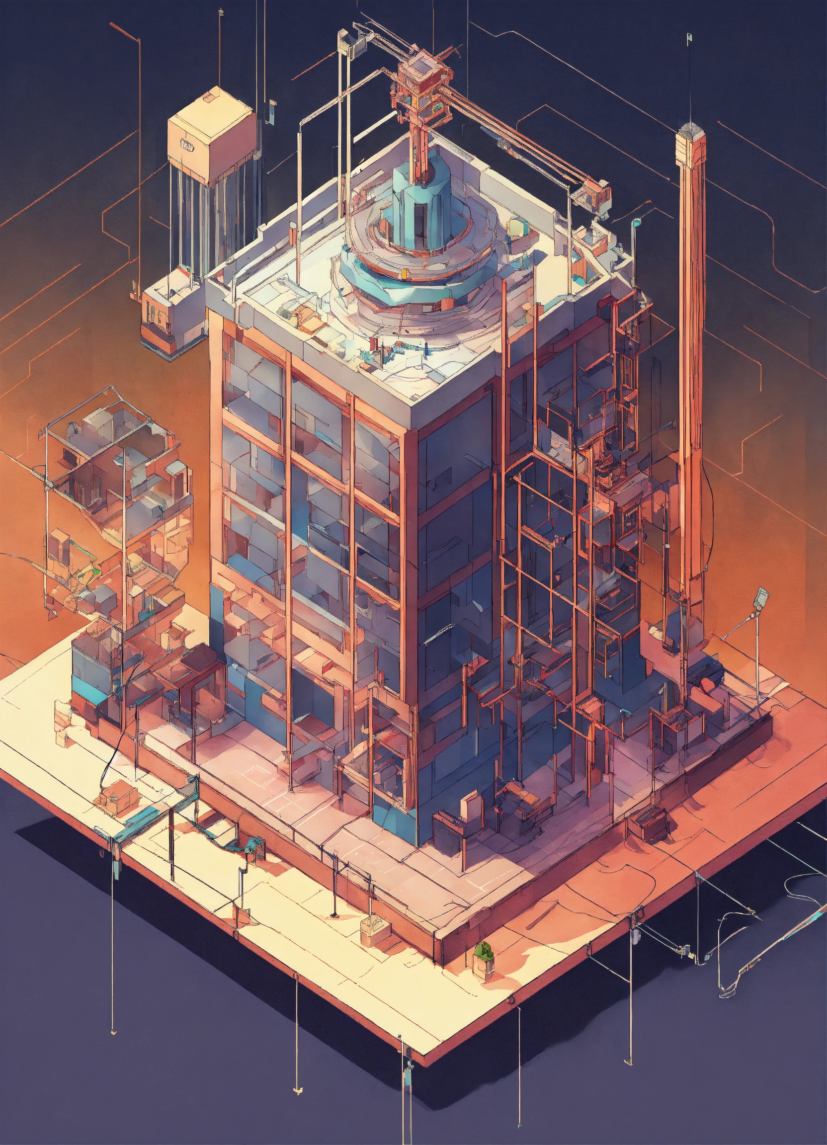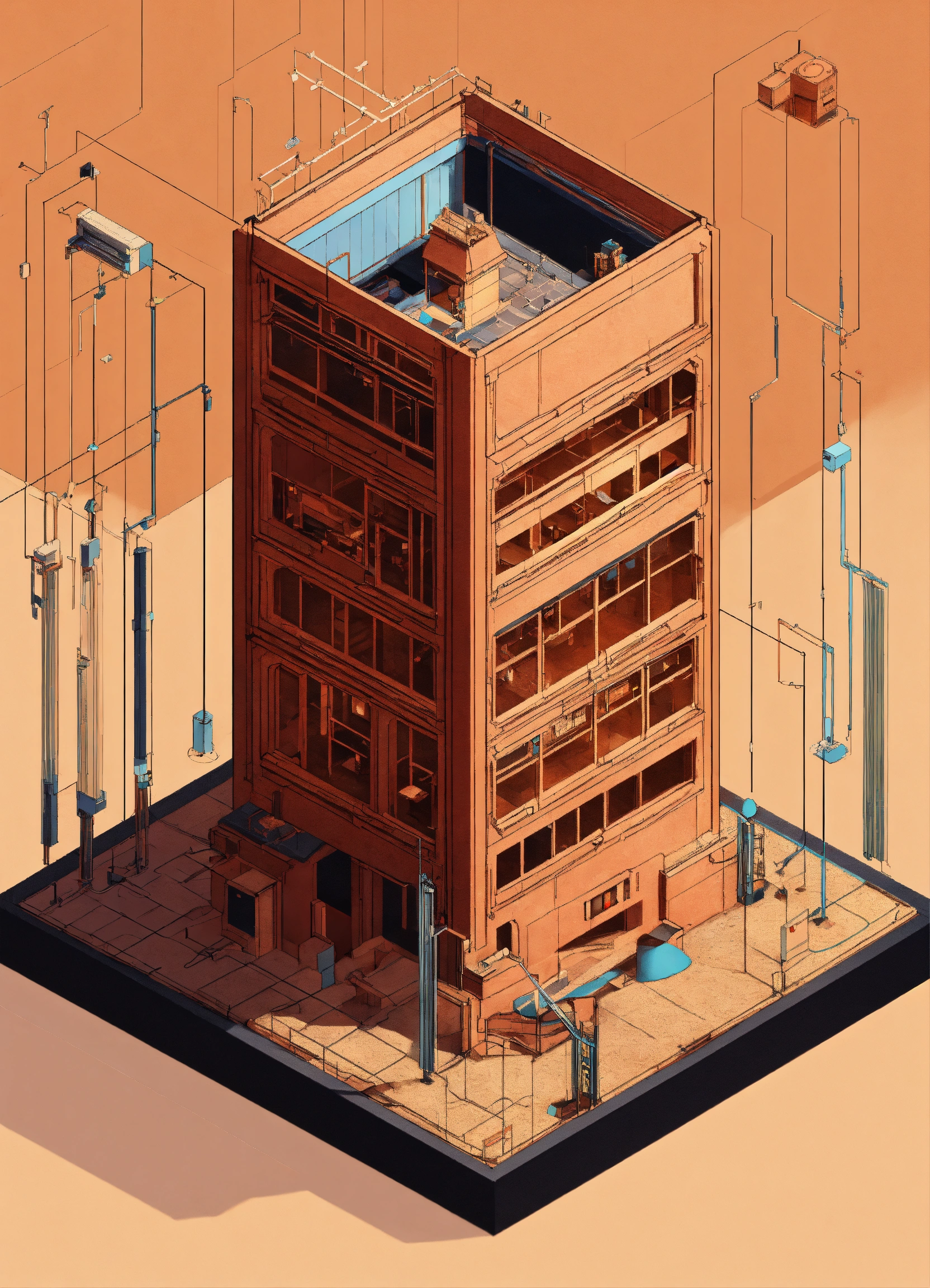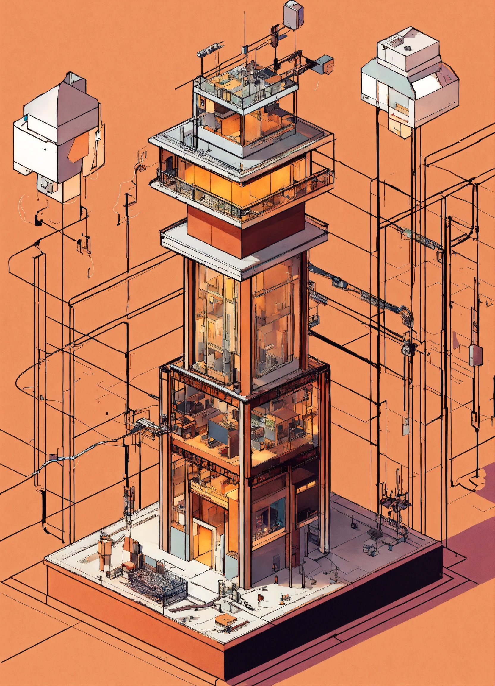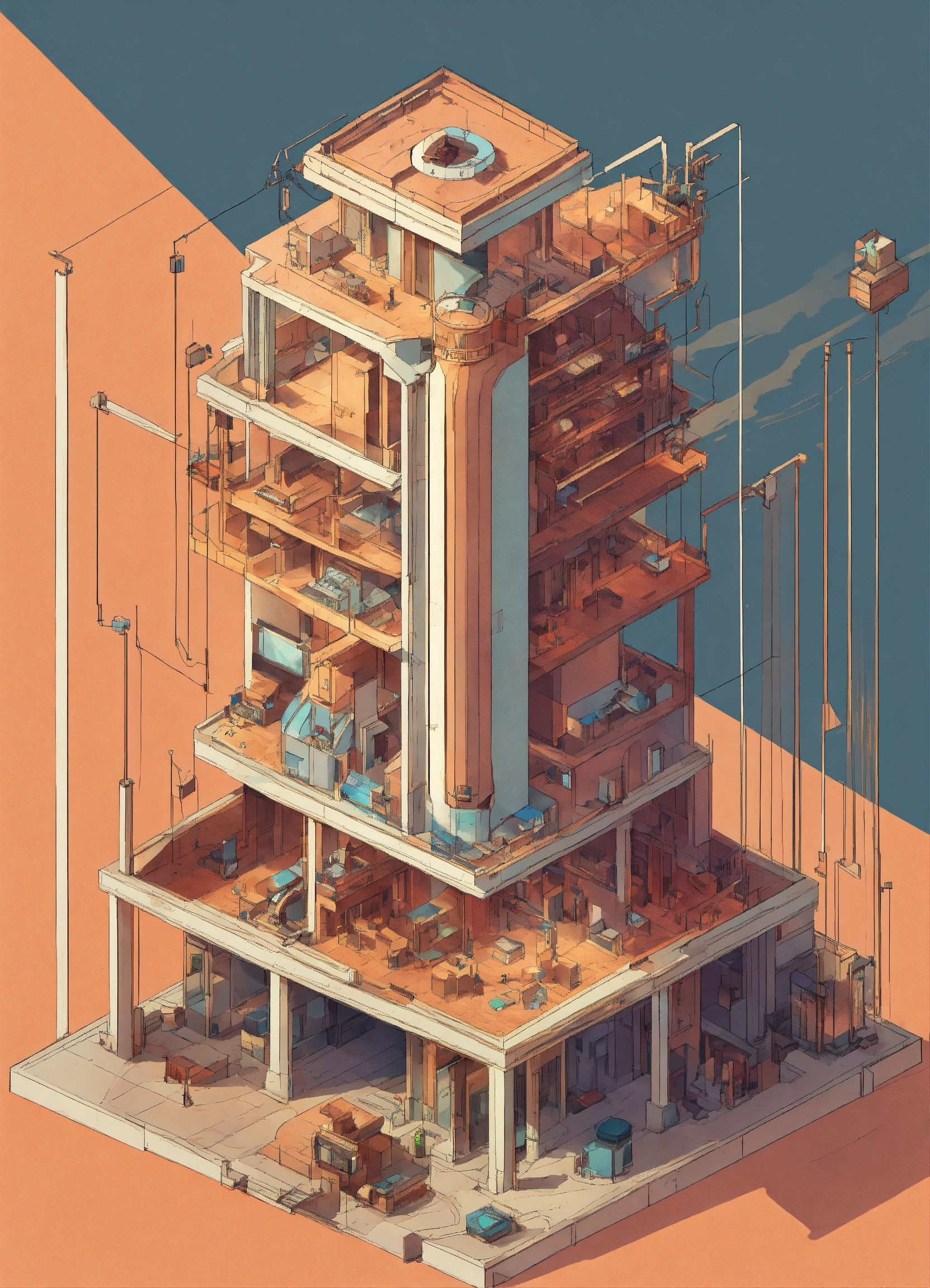 A building is controlled by a hand with wires. it is an axonometric drawing, mechanical style, and the building parts look like the game monument valley.