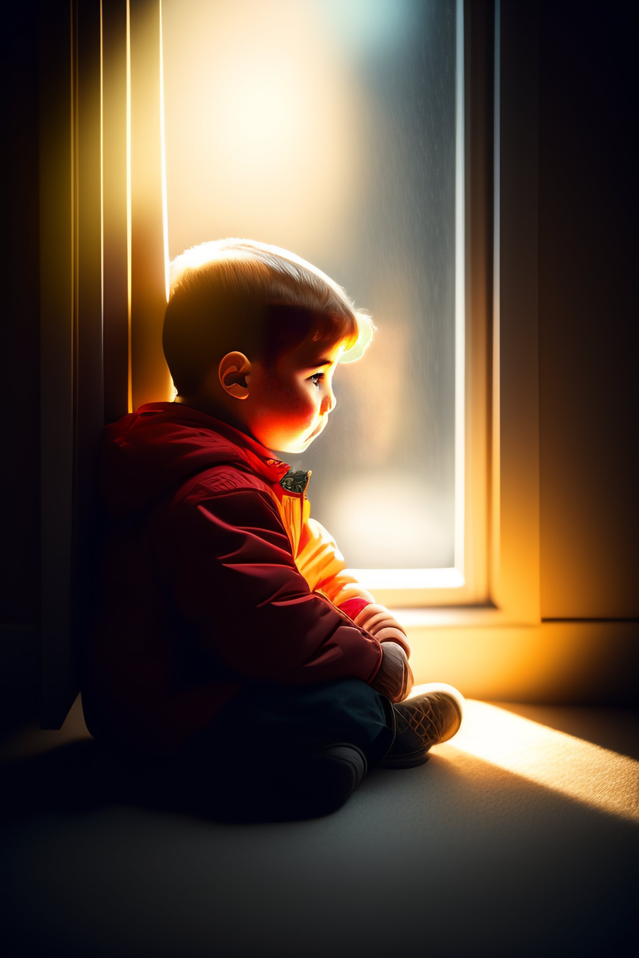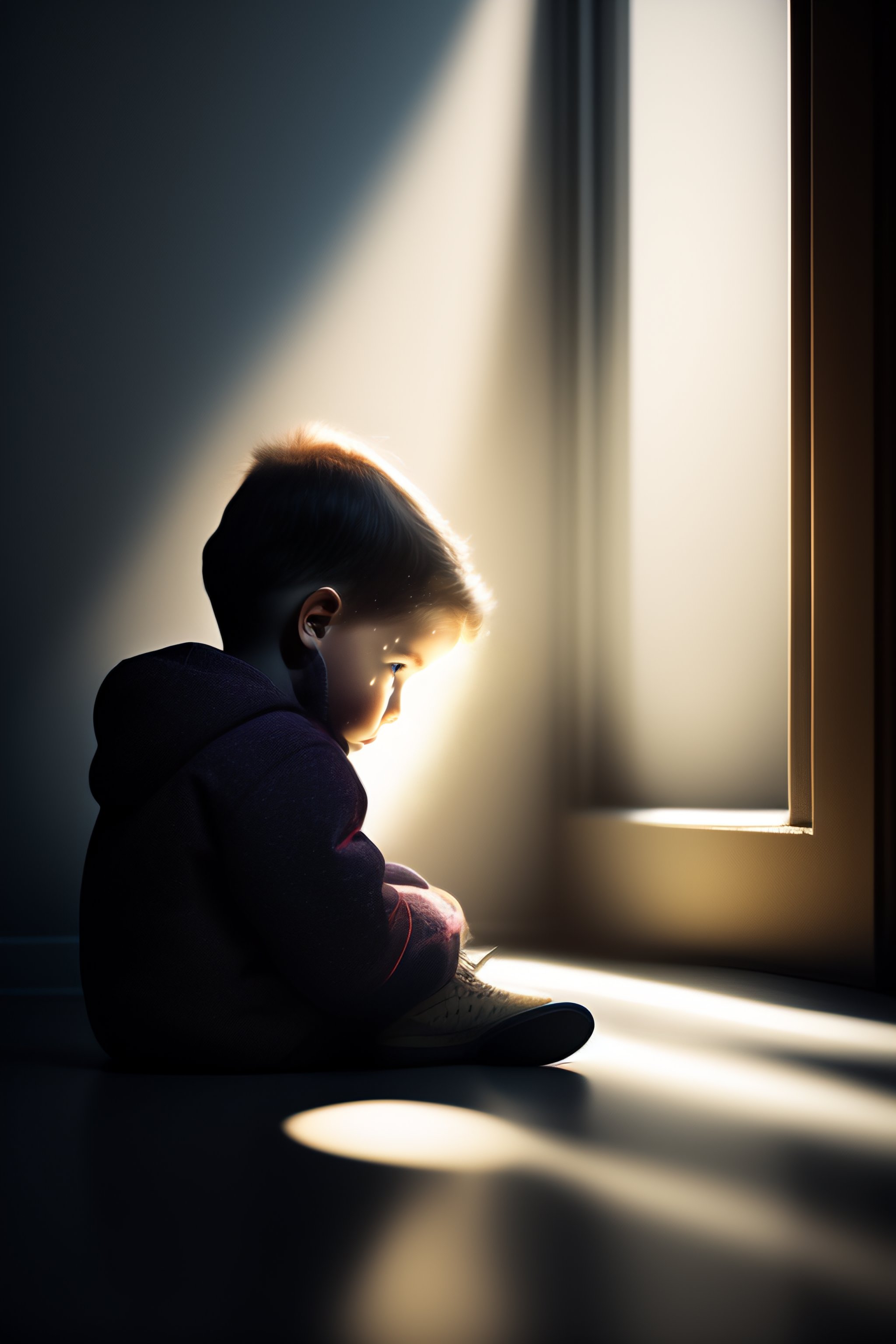 A child sitting on the floor of a dimly lit room, illuminated only by the light from a small window:: shabby, poor weather outside::5 shadows::3 --v 4 --stylize 1000 --chaos 50 --ar 16:9