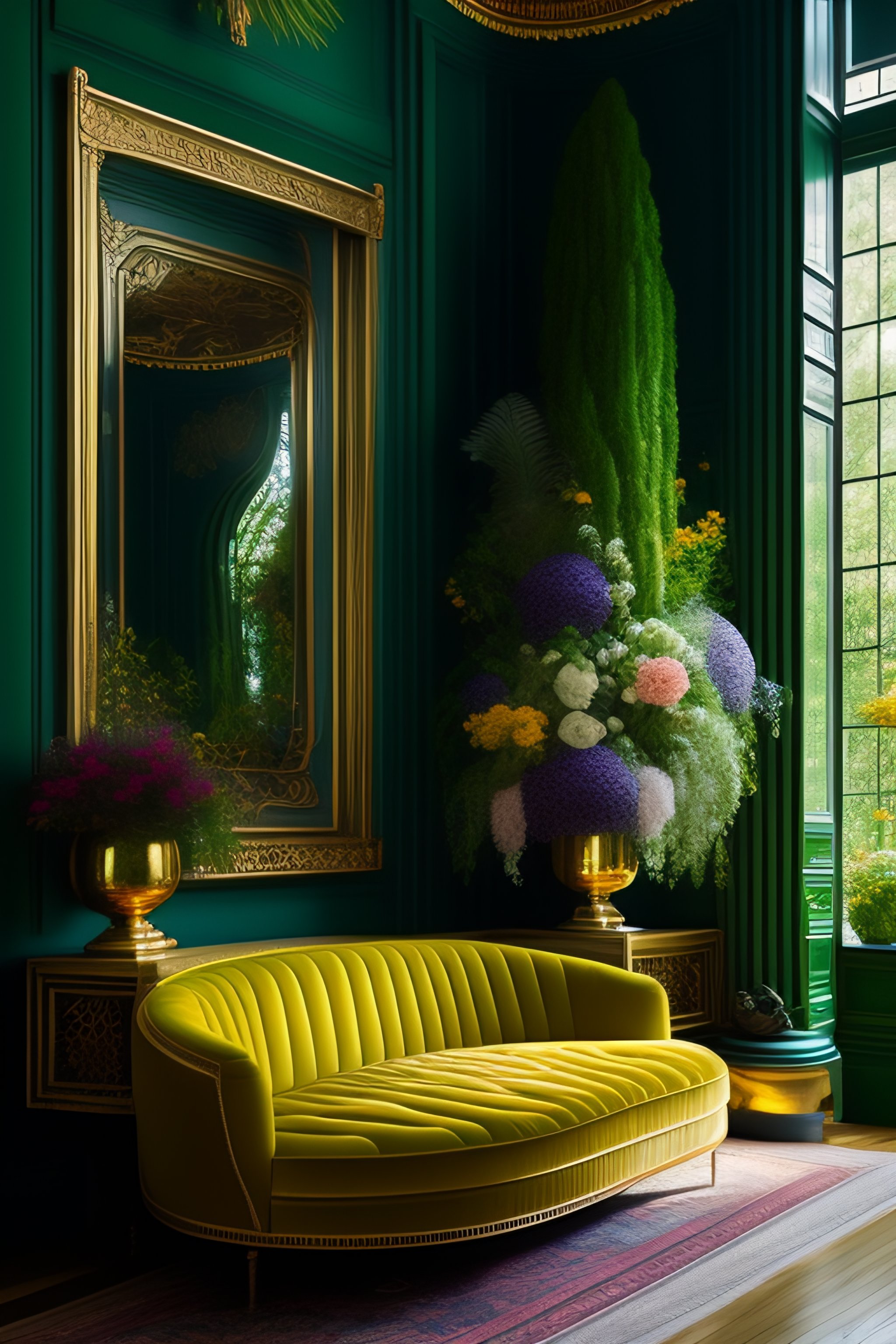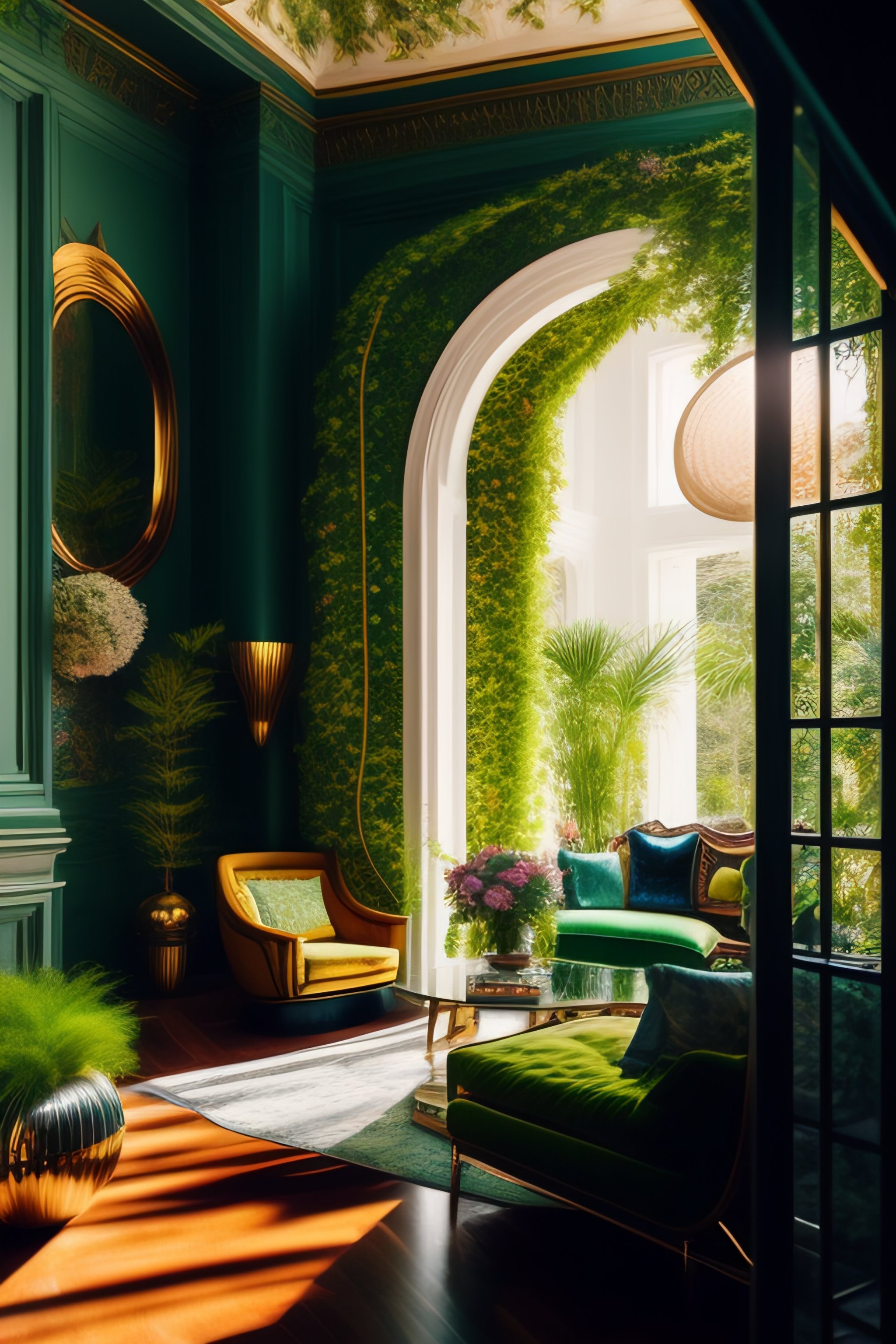 Architectural digest photo of a maximalist green solarpunk living room with lots of flowers and plants, golden light, hyperrealistic surrealism, award winning masterpiece with incredible details, epic stunning