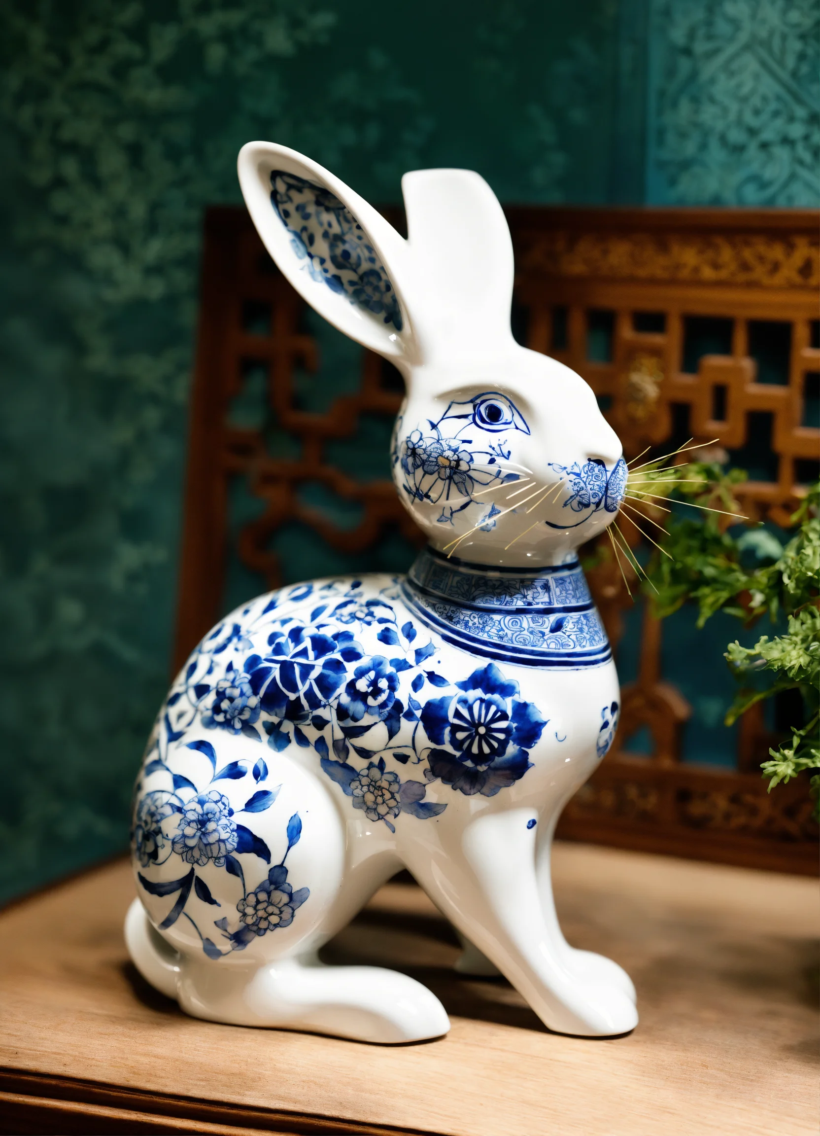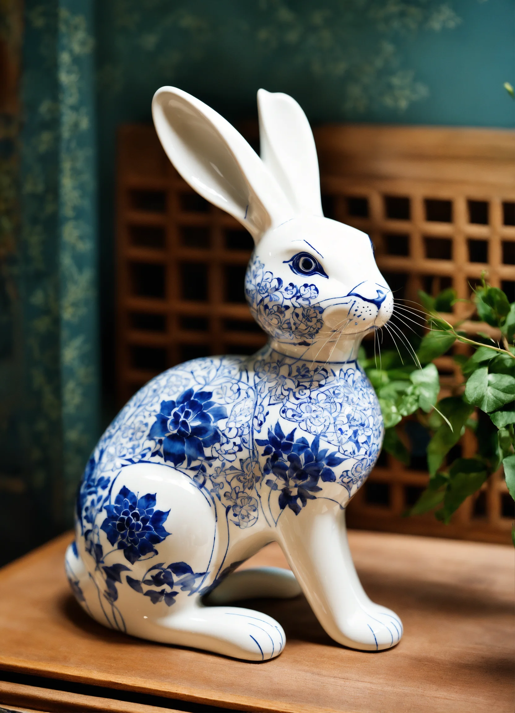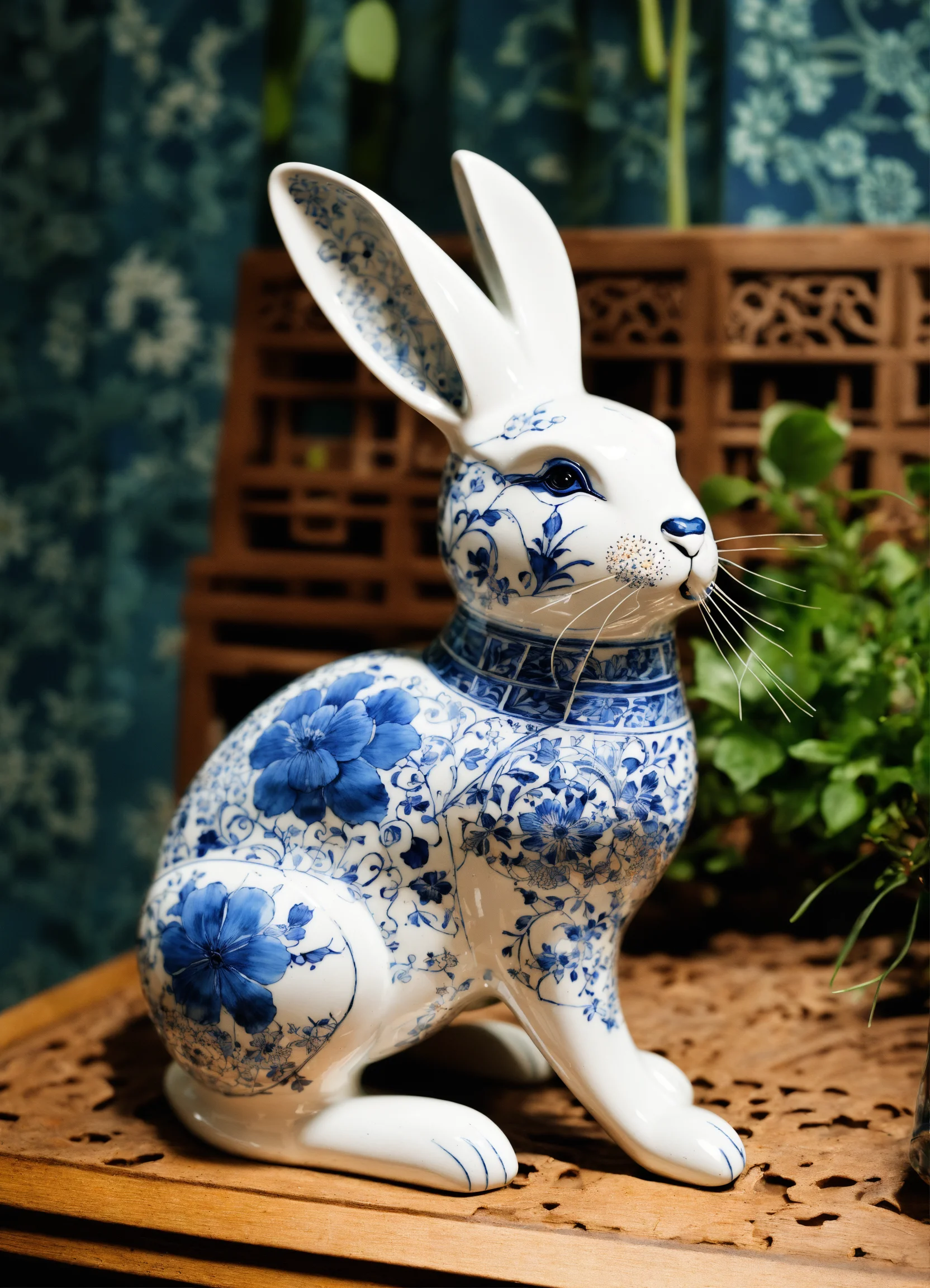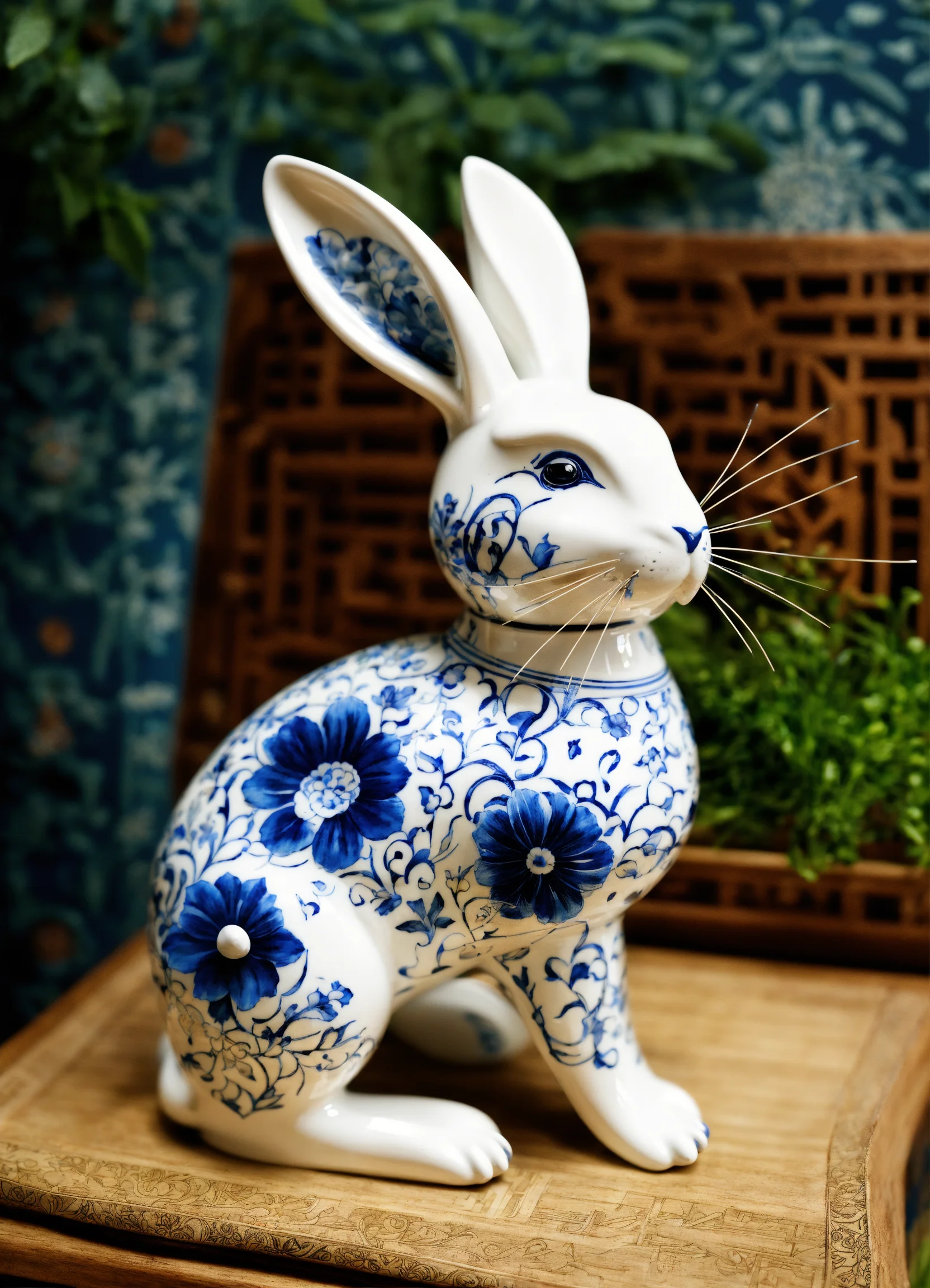 A chinese rabbit made of white ceramic with blue ink, stunning intricate designs, ((geometric and floral patterns, fine art))