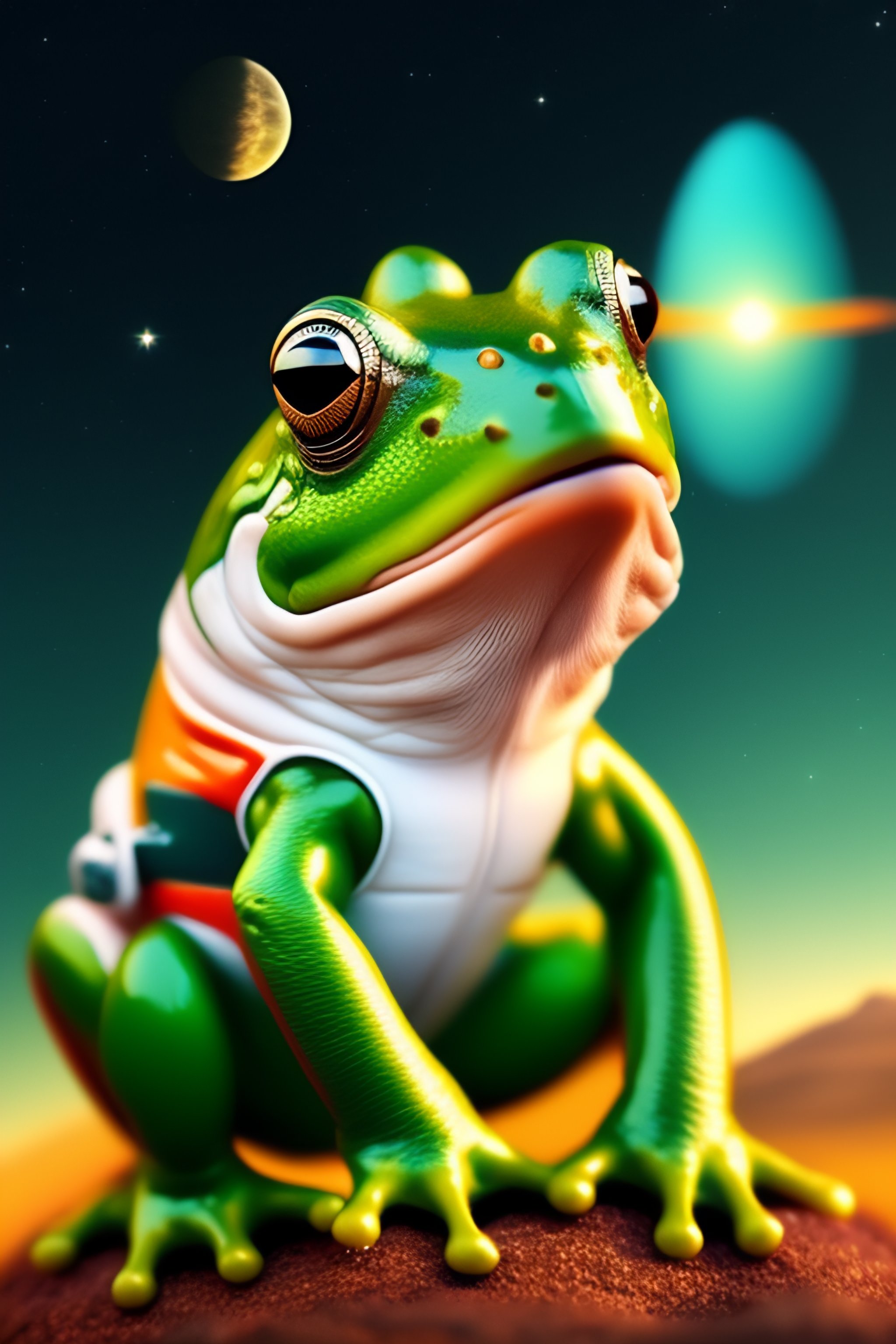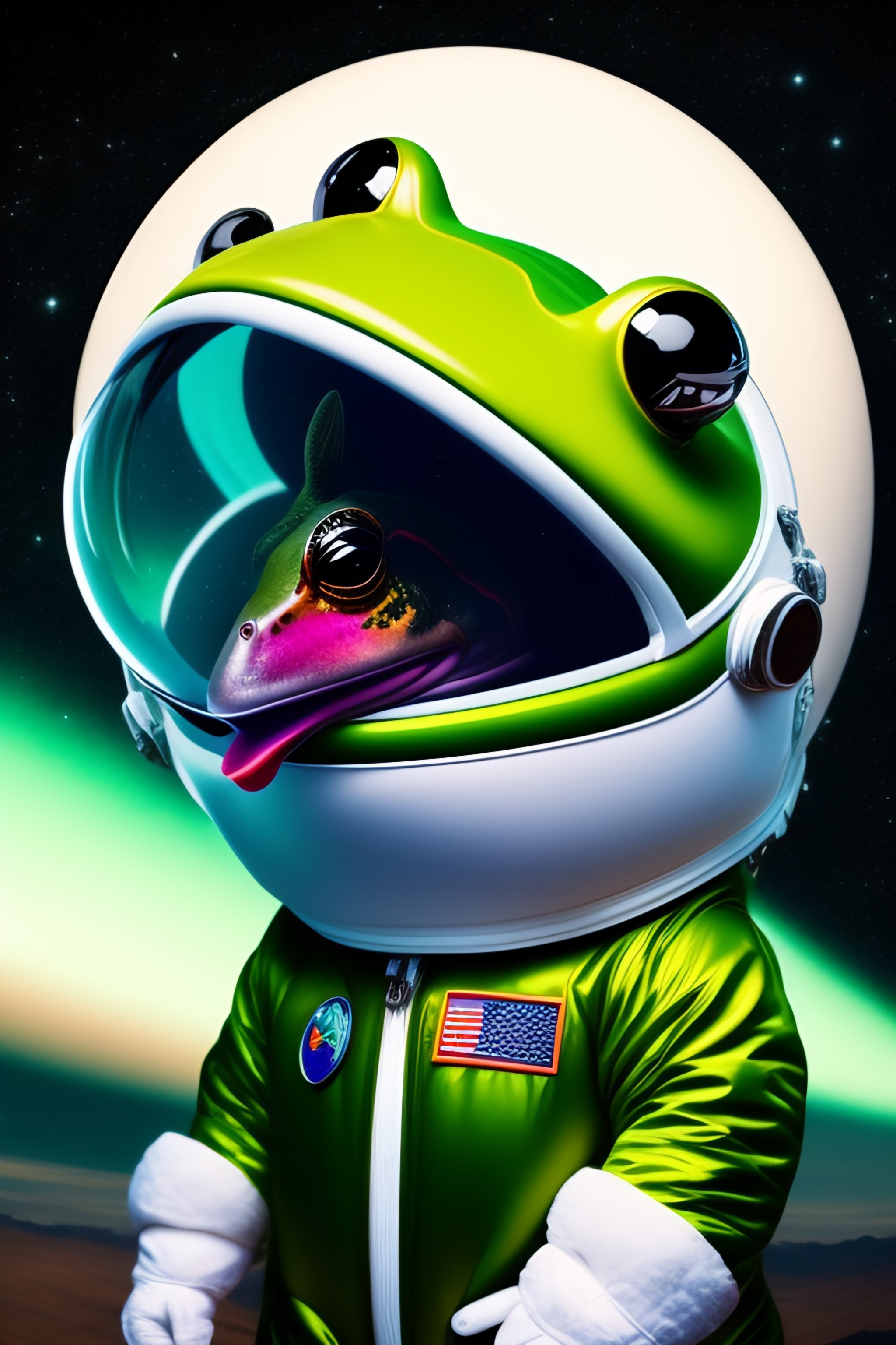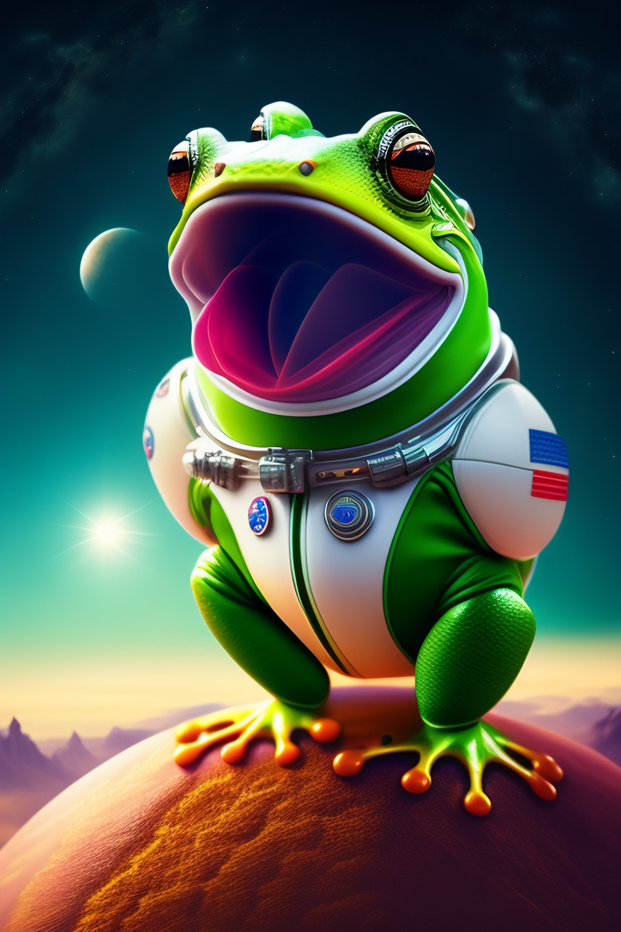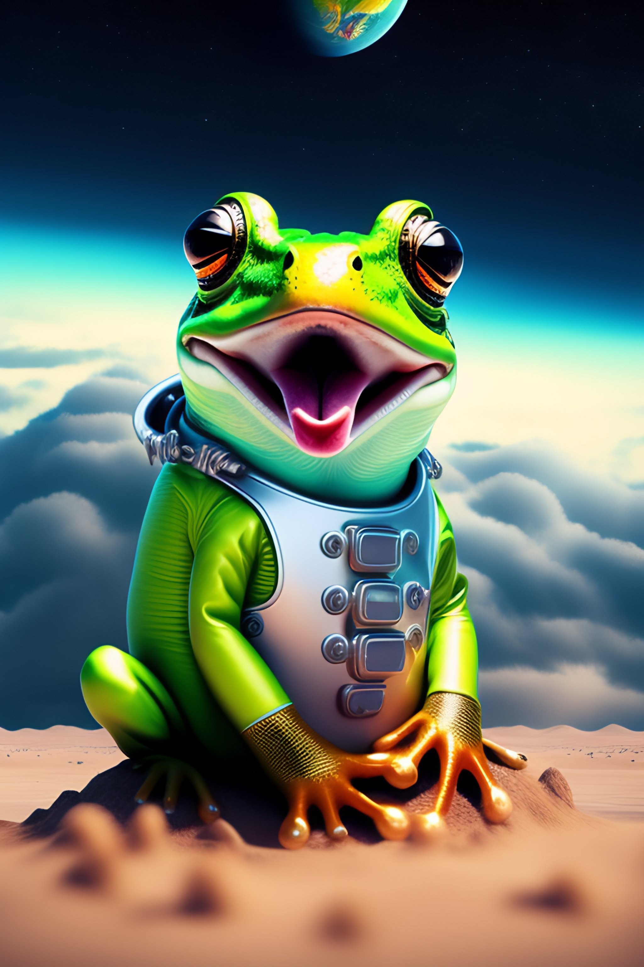Frog with tongue out, astronaut suit, with frog hands, earth planet in the background, rockets next to frog