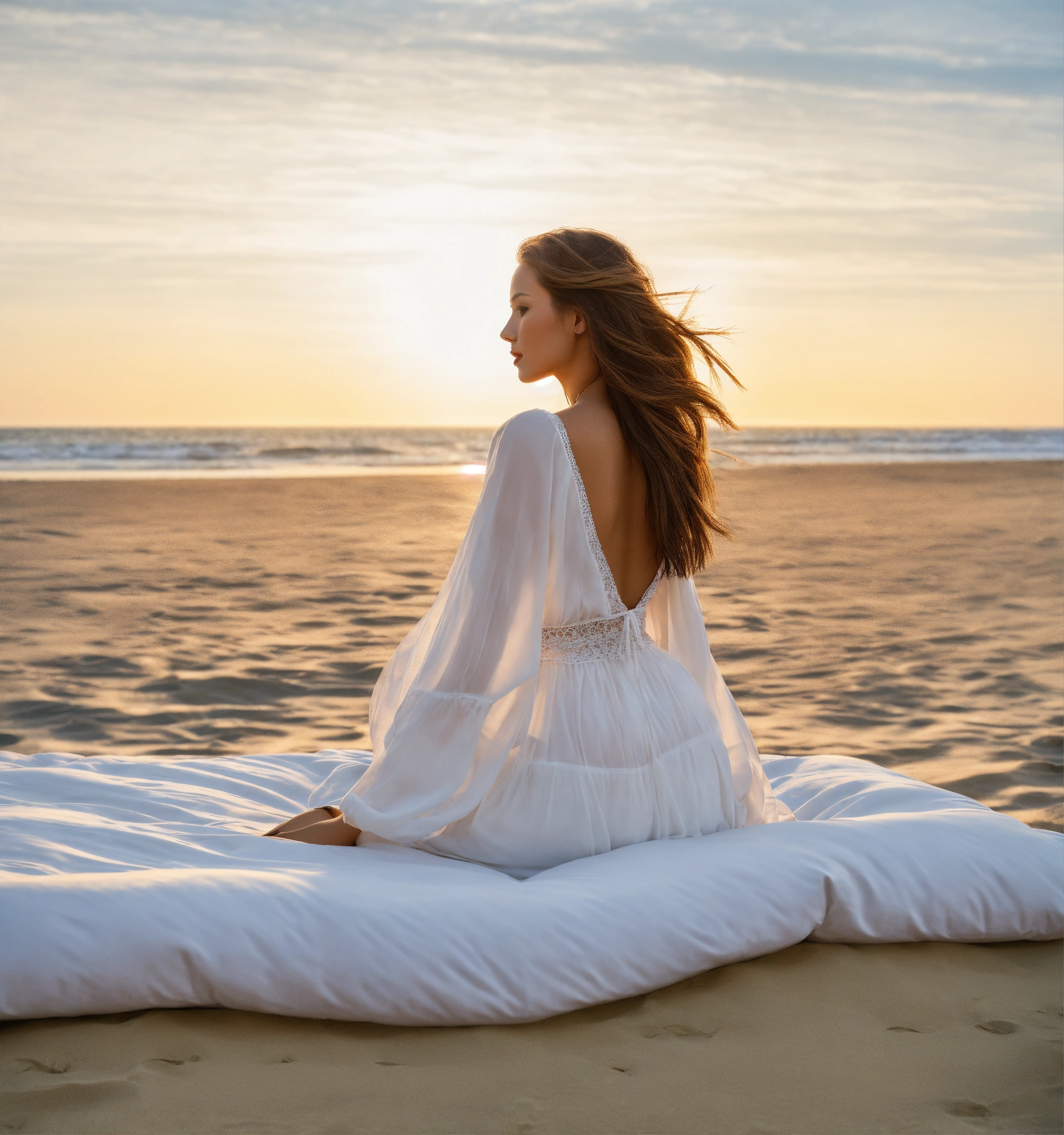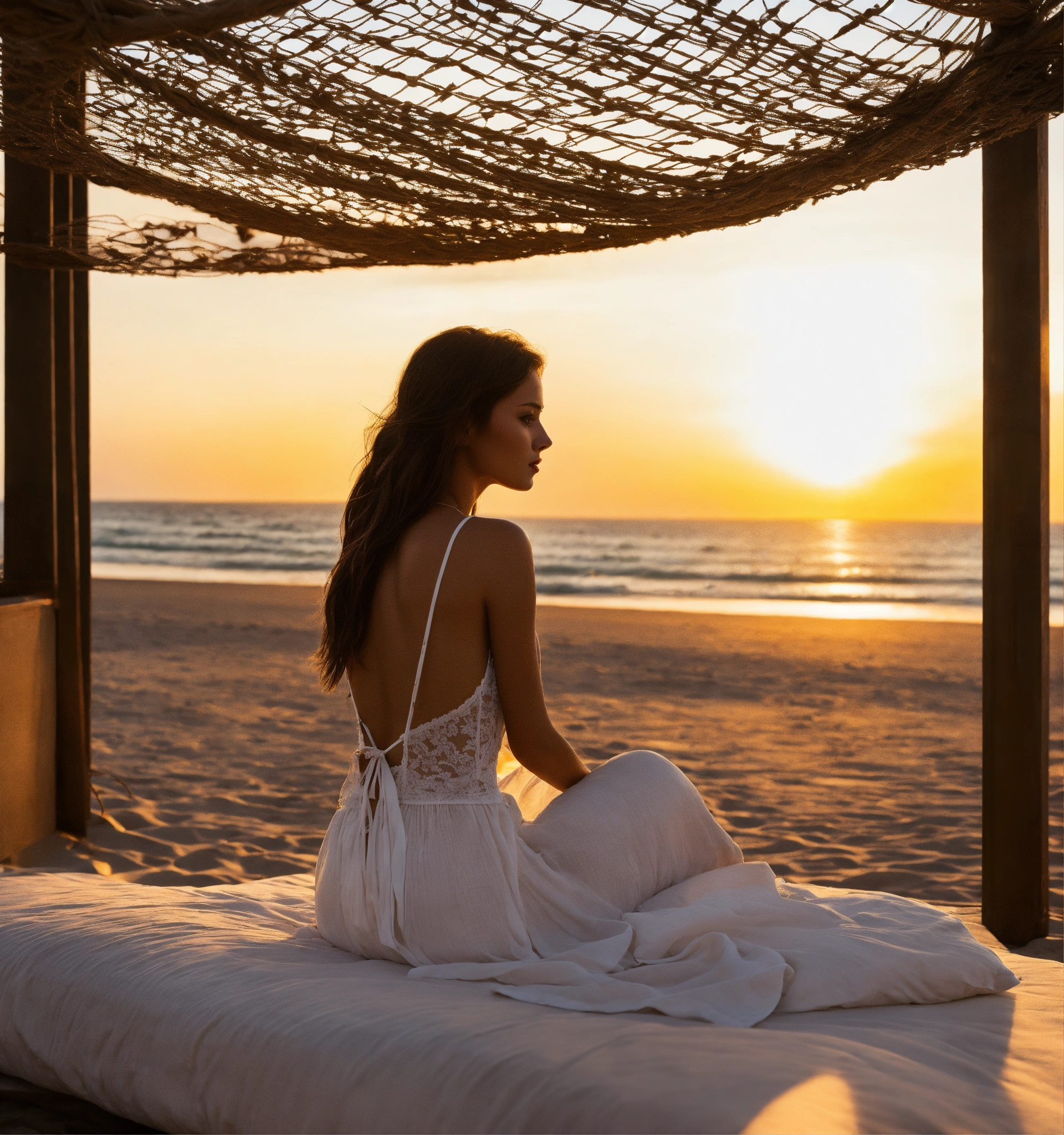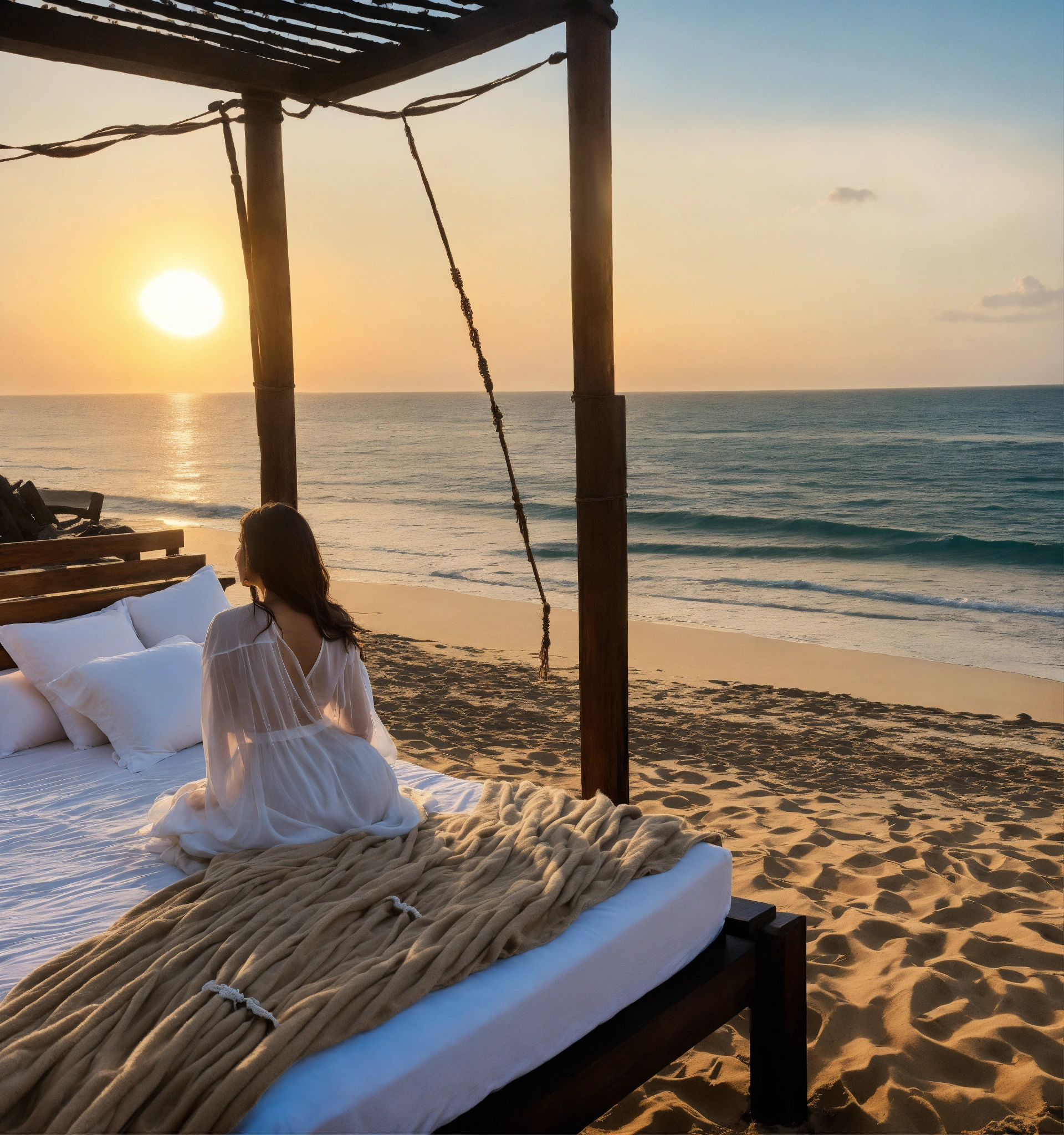 Natasha in white victoria secret is looking at the ocean while sitting on a low bed with weaved iron rod headboard with white silk sheets and 10 fluffy pillows that's on an empty beach, early morning
