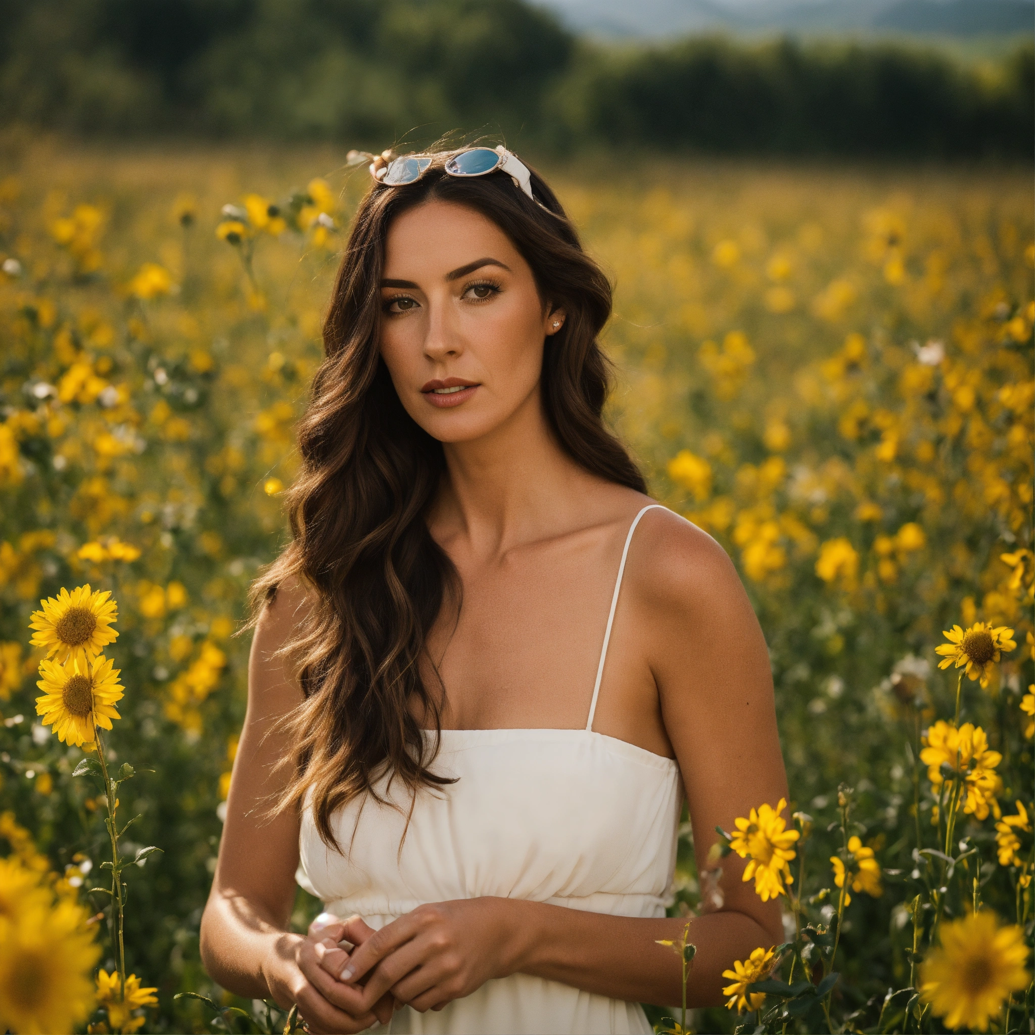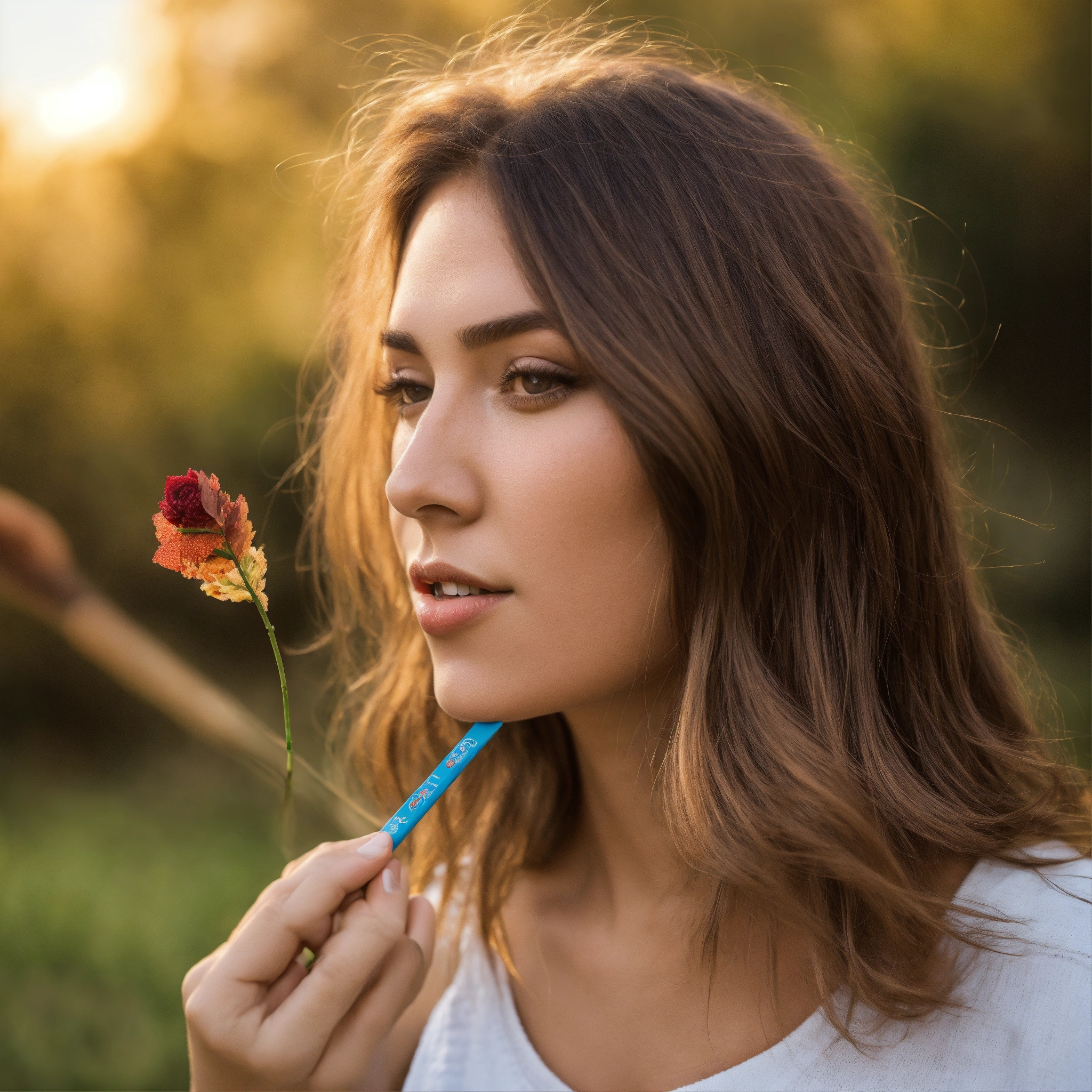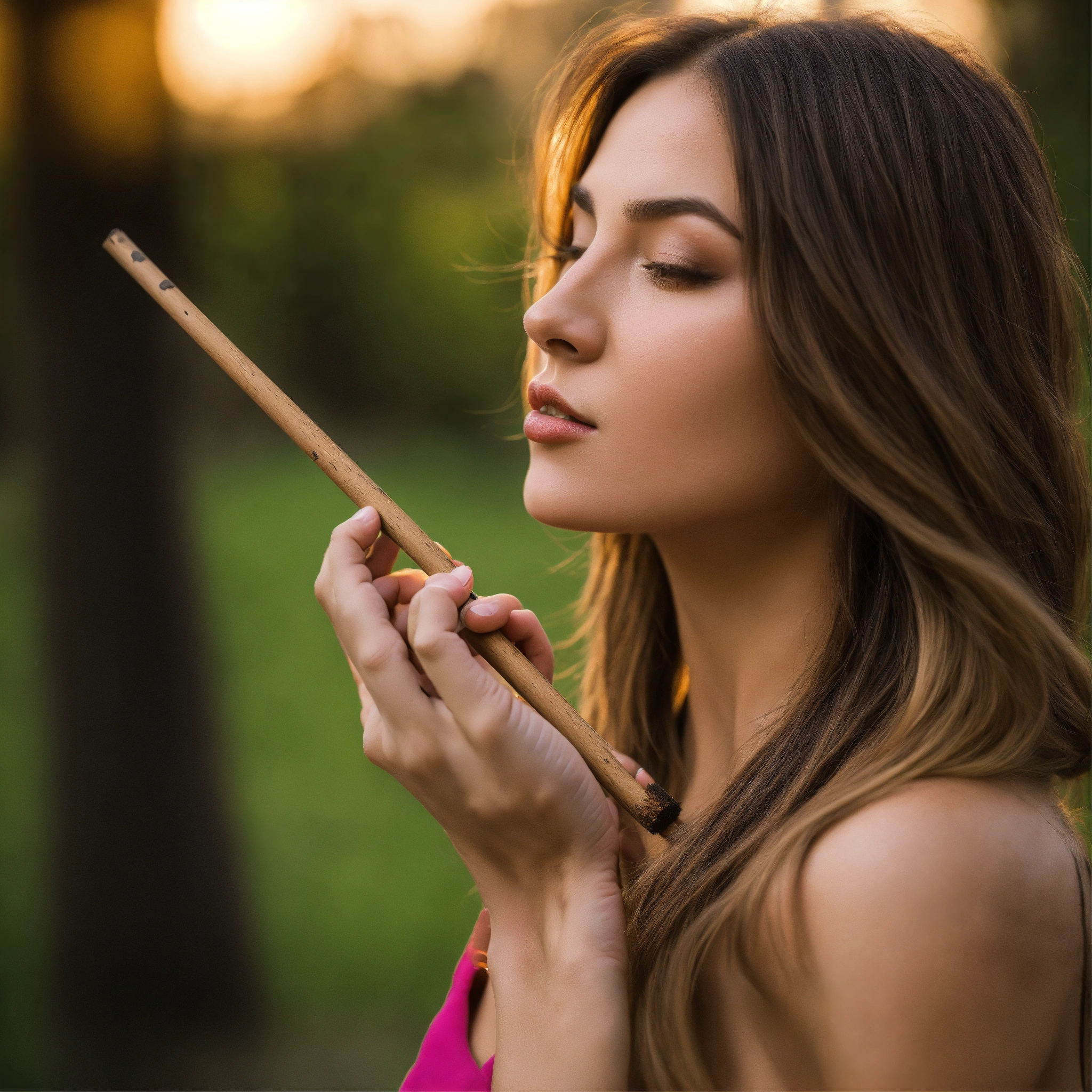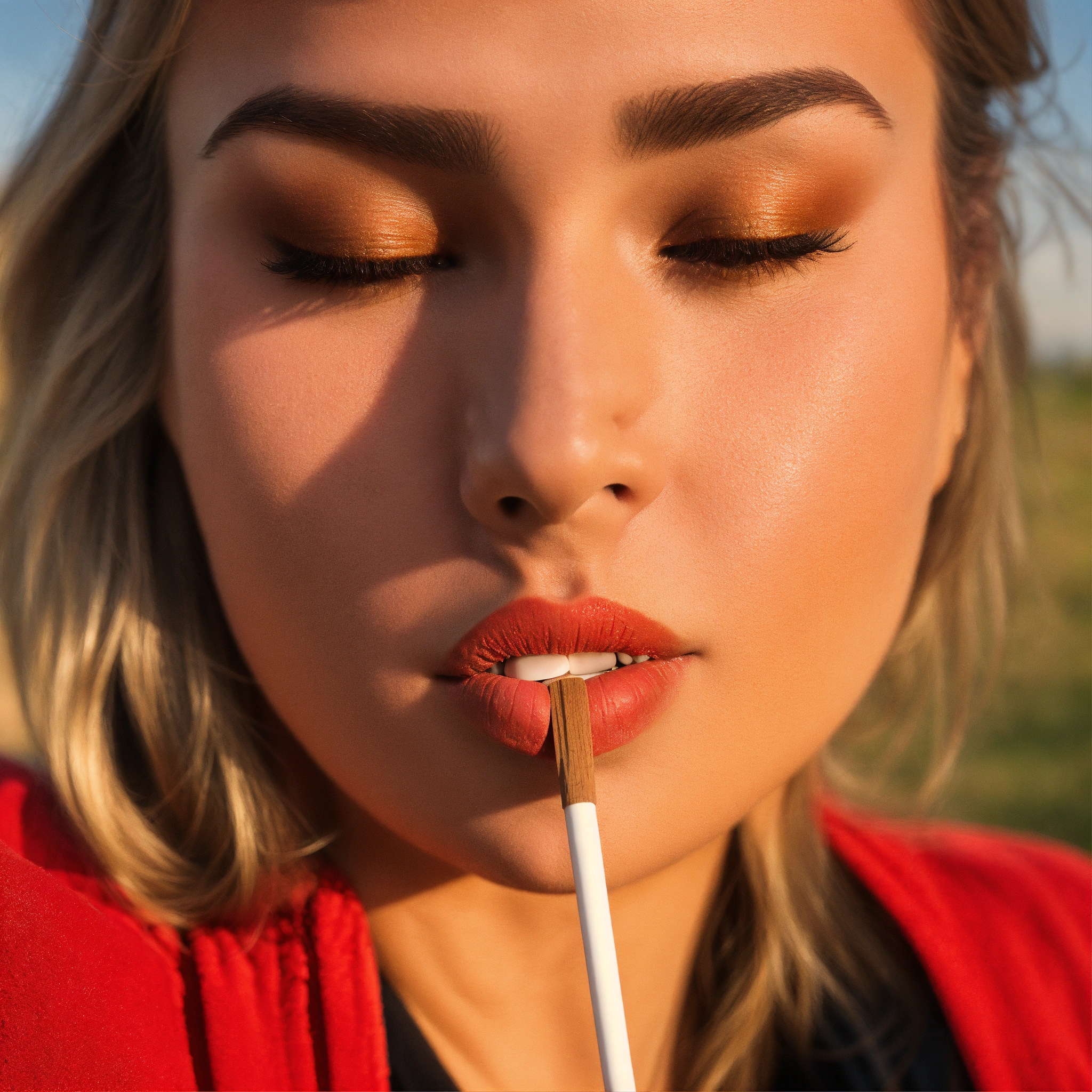 Donna che applica uno stick per labbra sulle labbra rosate in un prato