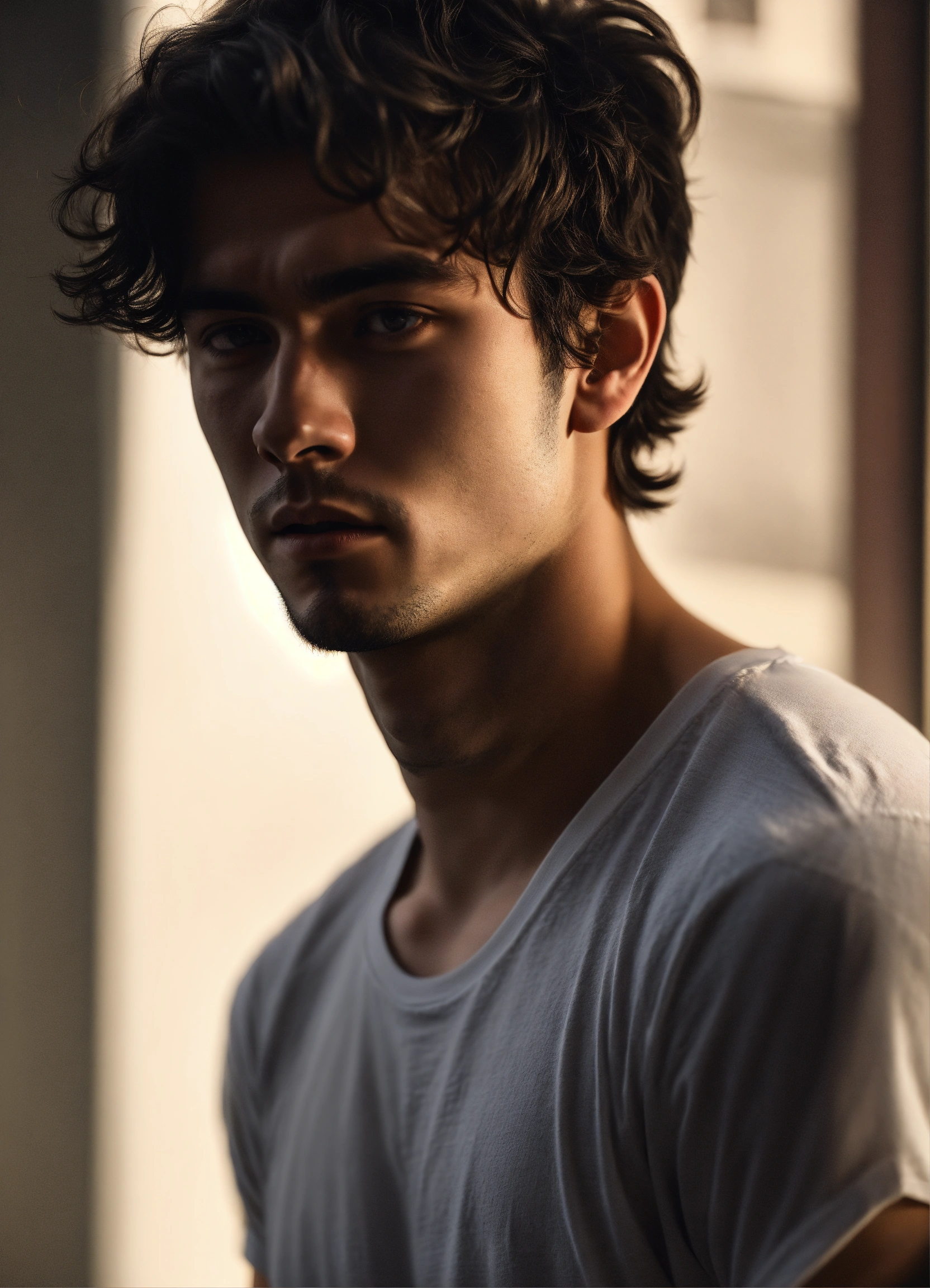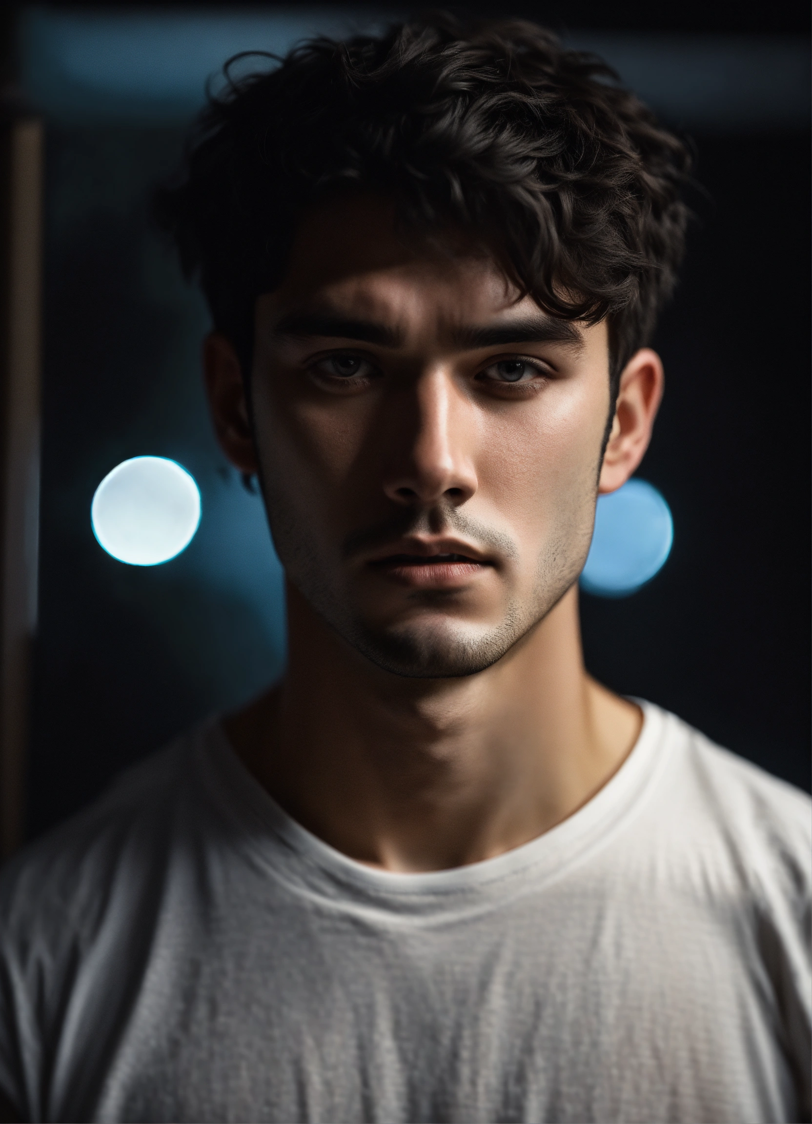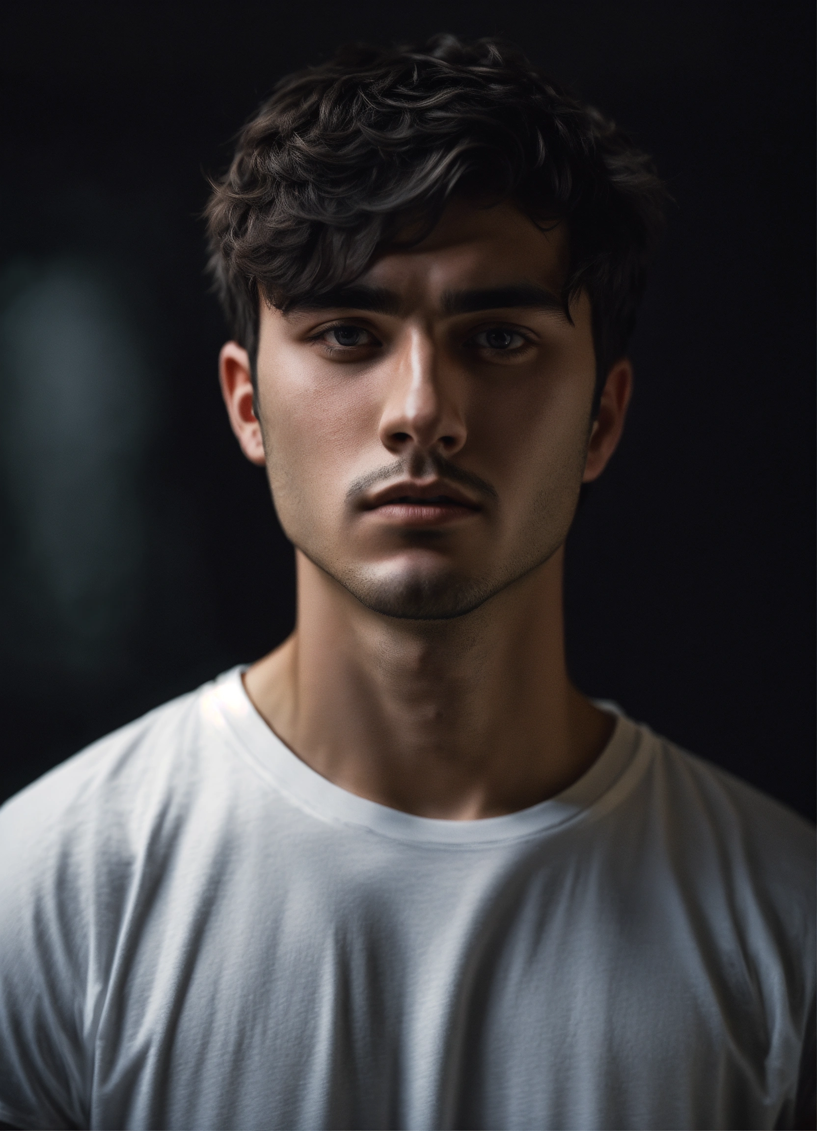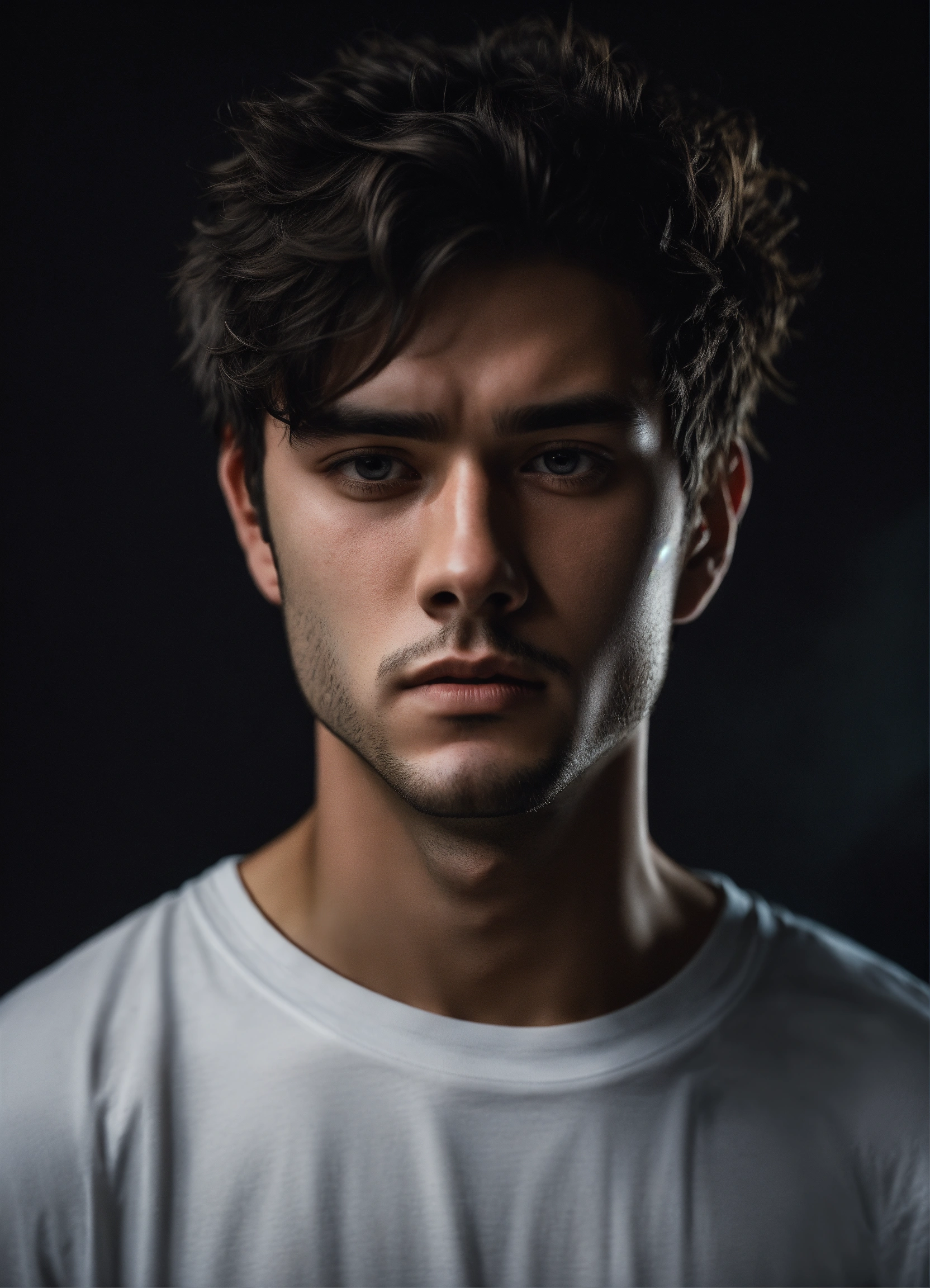 A realistic photograph of a 22-year-old man, with a calm expression, black messy short hair, dark black eyes, with no beard, strong body, wearing a white t-shirt, with a dark background, dramatic illumination, hyperdetailed, hyperrealistic, 8 k