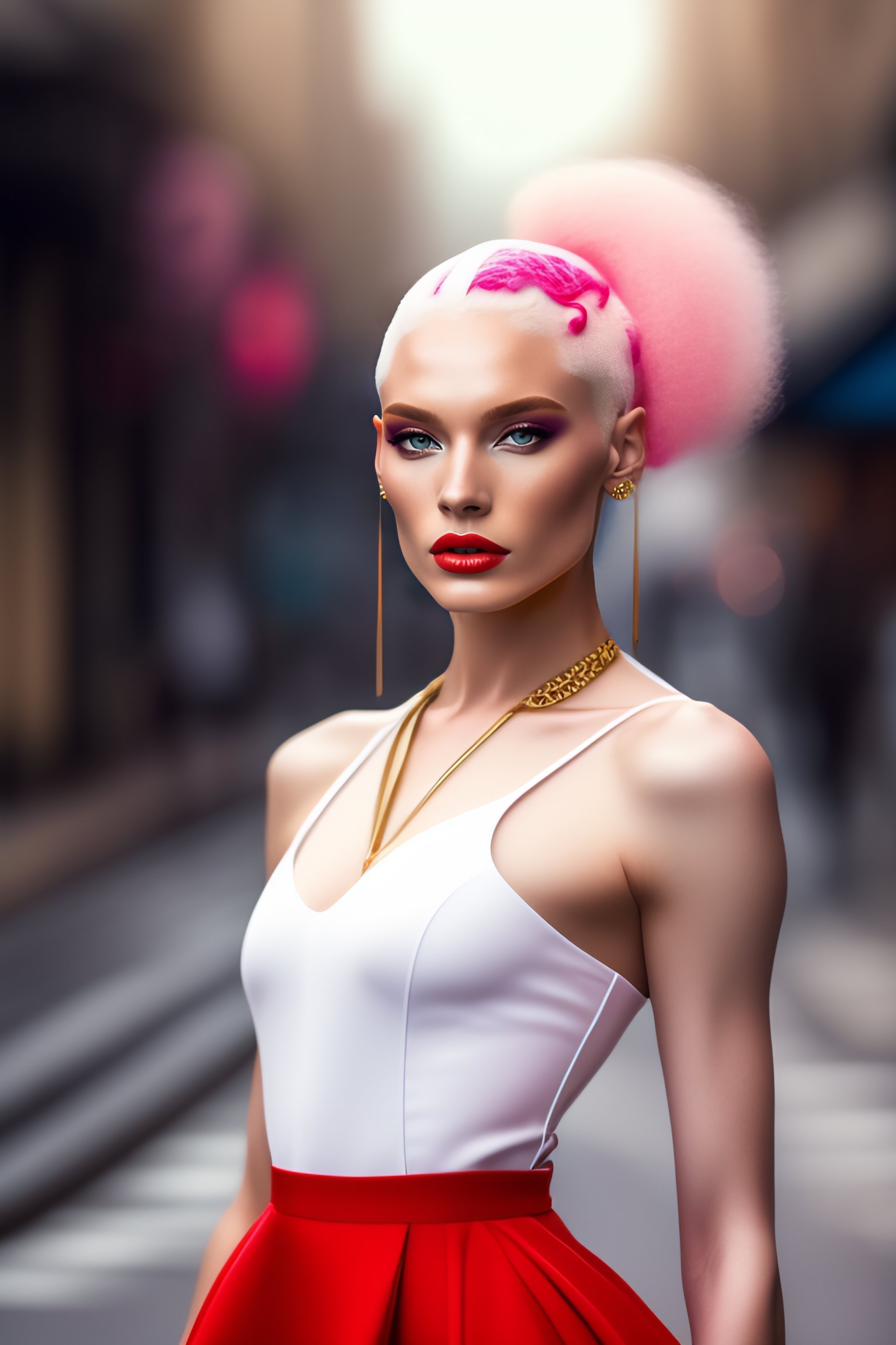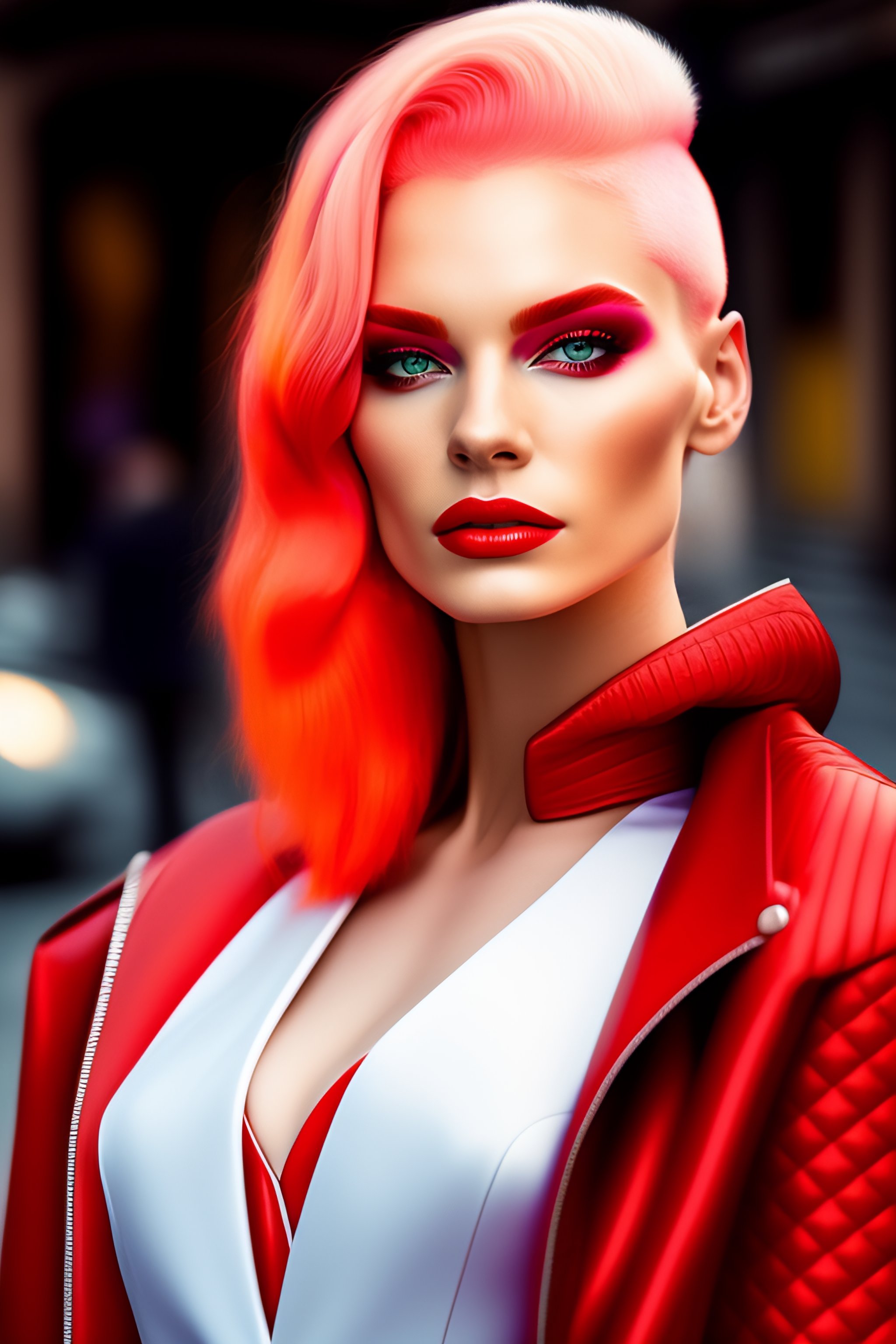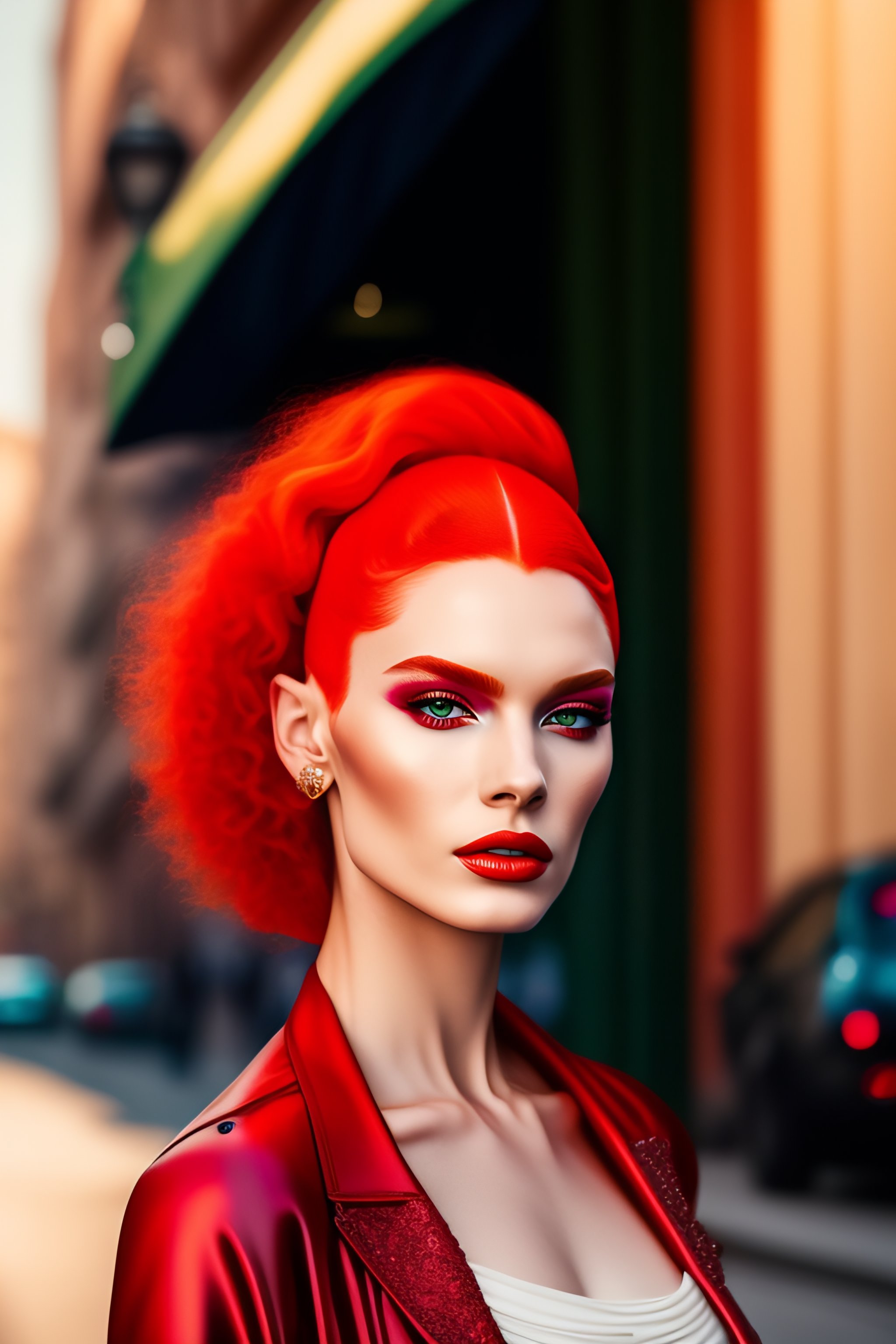 Portrait of haute couture beautiful albino fashion model with red hair, drawing by rick and morty, fashion poses, in front of gang street.