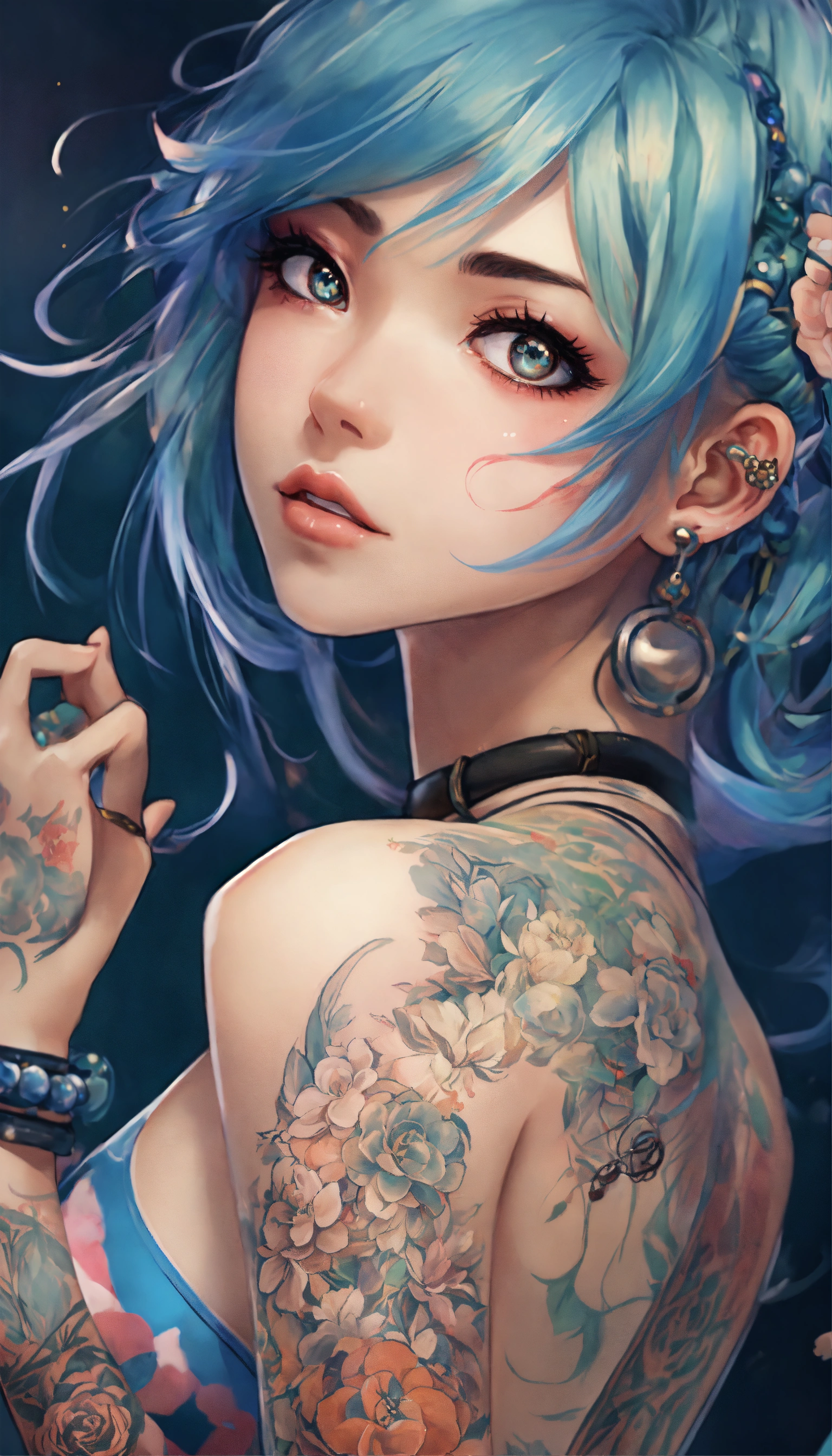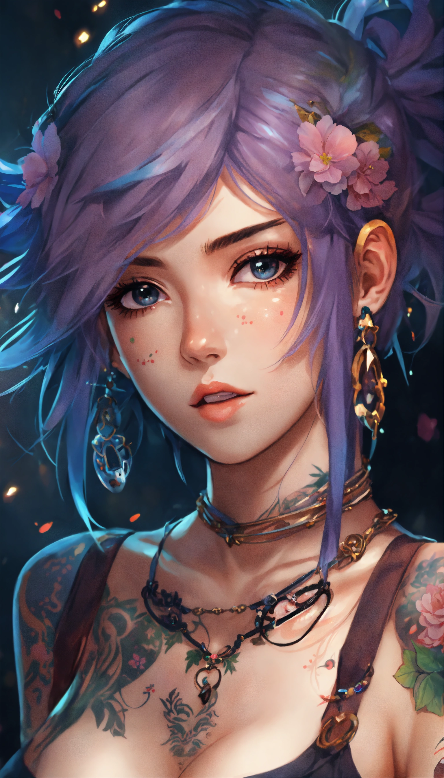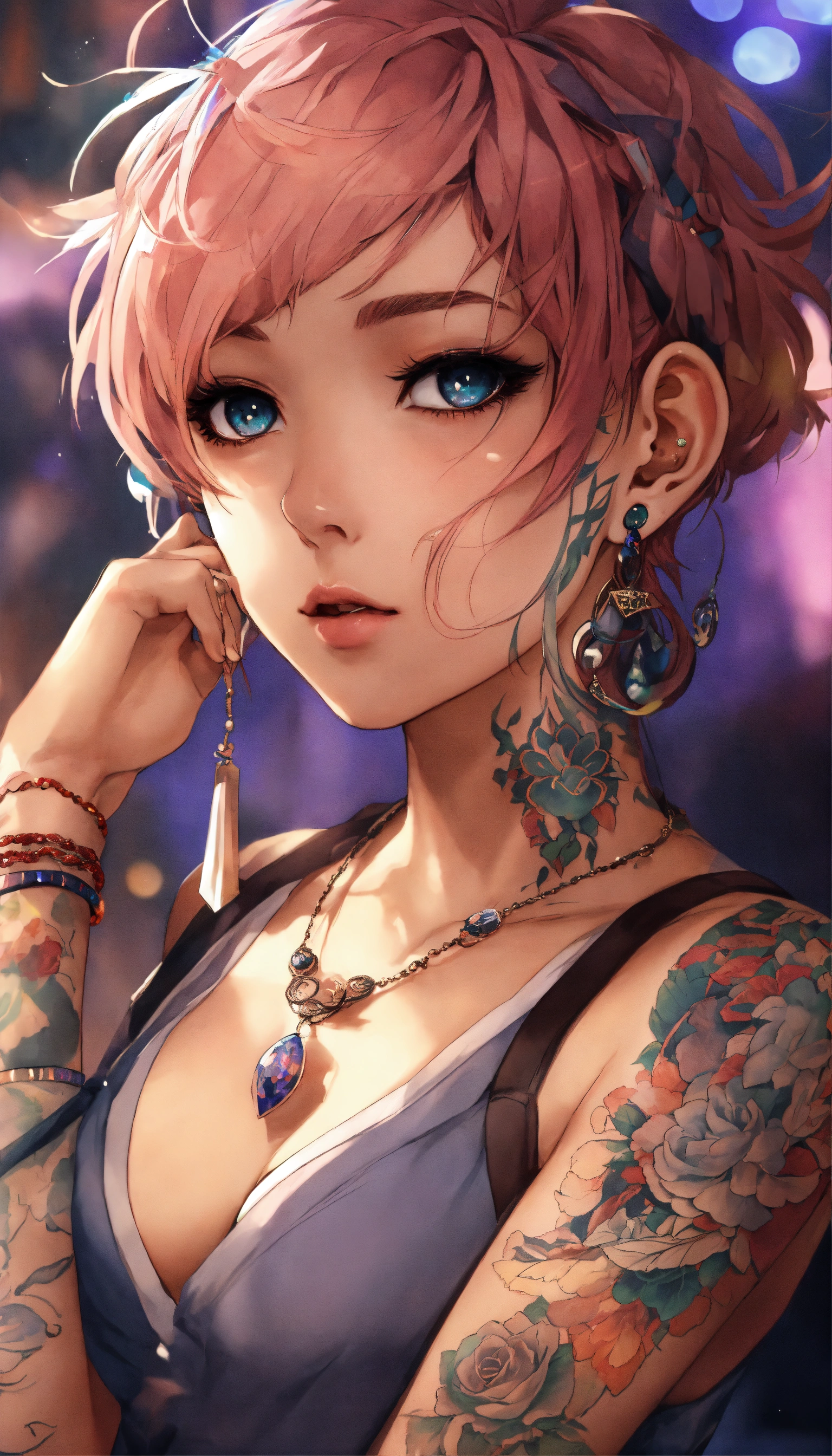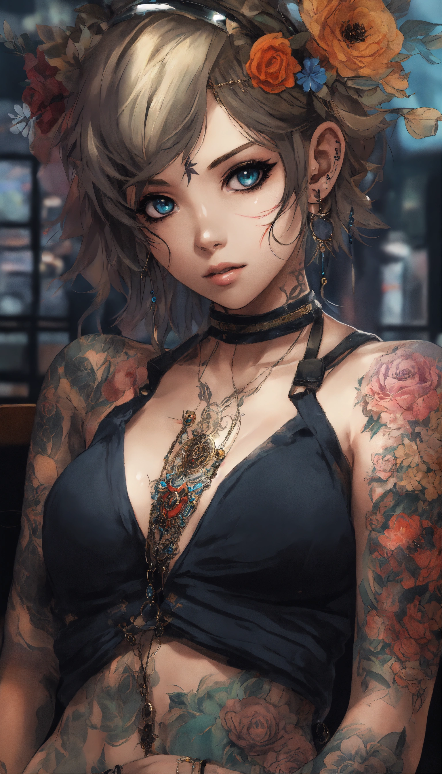 Girl with a beautiful figure, anime face, large slightly slanted eyes, tattoos all over her body, piercings, bracelets