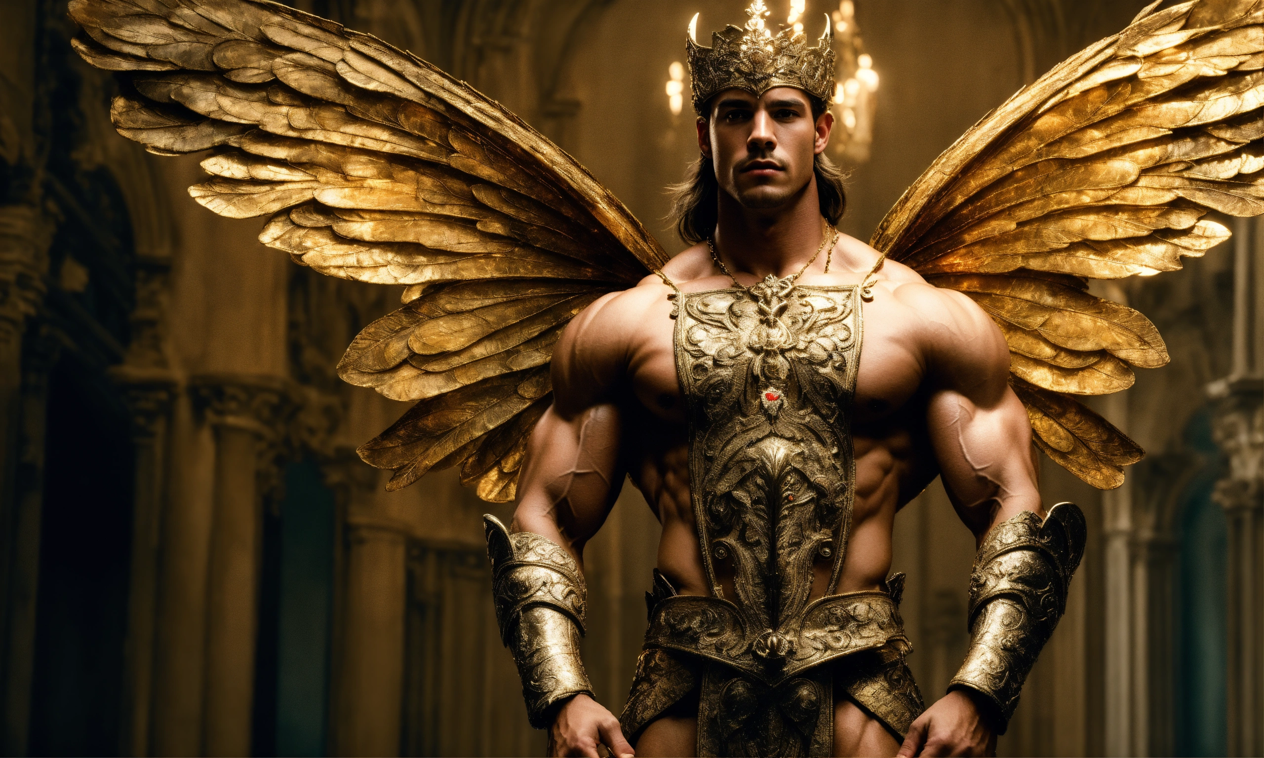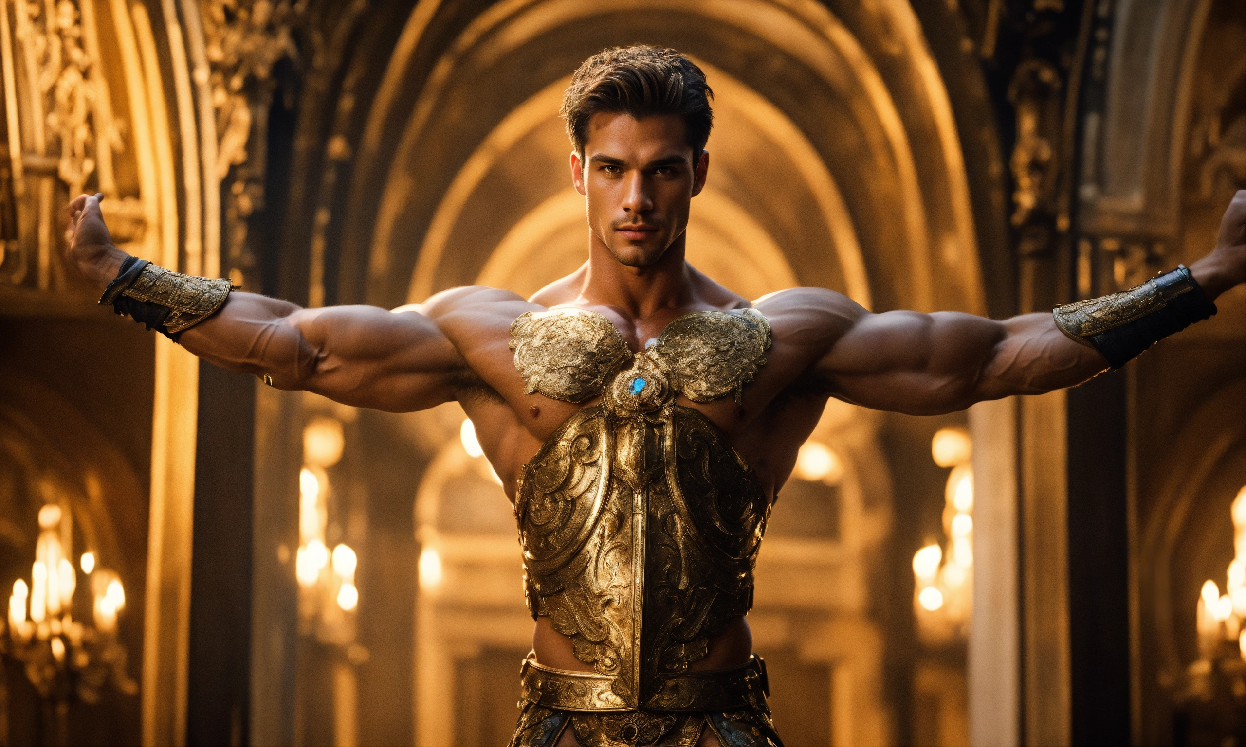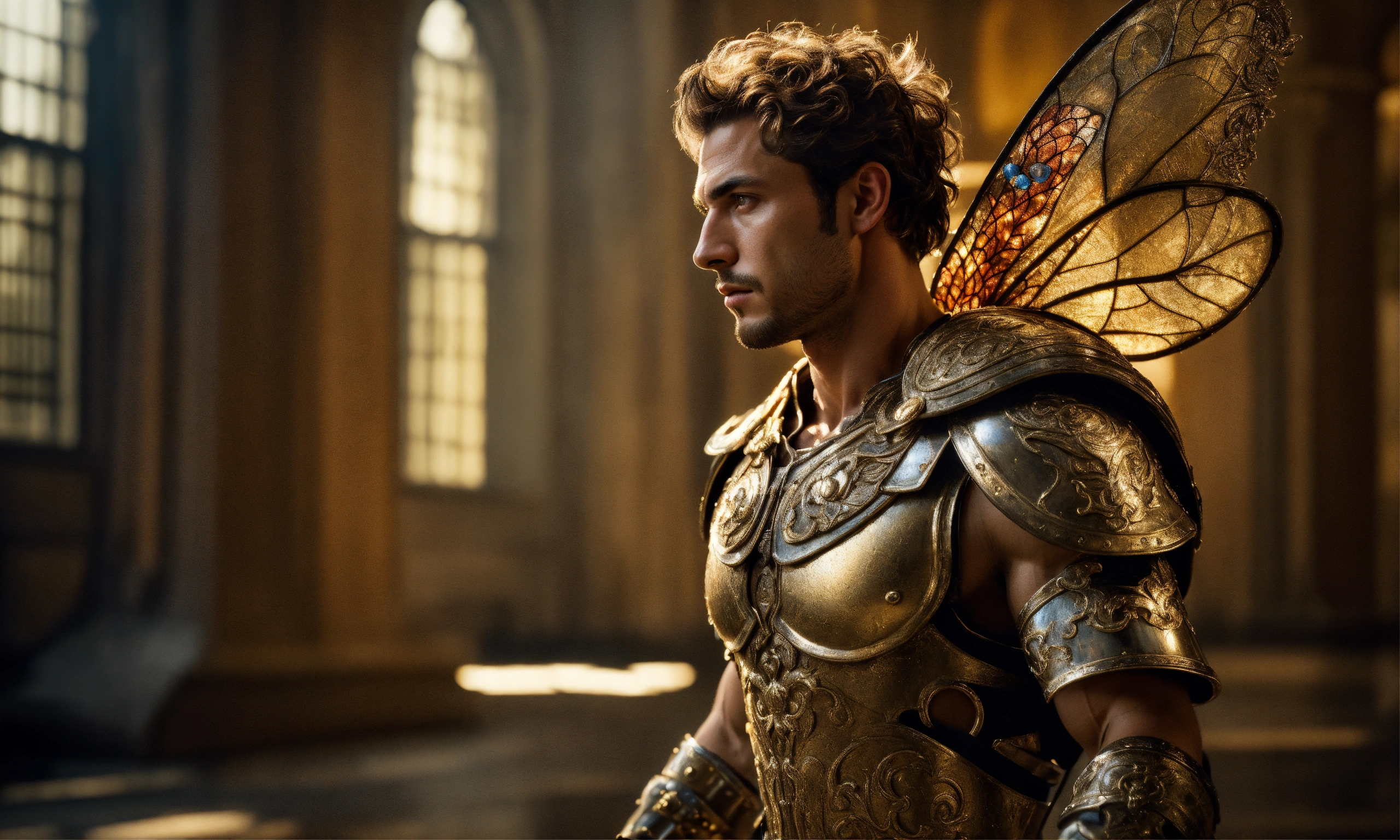 Portrait of a stunningly handsome male fairy in symmetrical beautiful armor light, mister olympia anatomy, broad muscle legs, big delts, ripped, intricate, elegant, depth of field, zeiss lens, detailed, symmetrical, centered, fashion photoshoot, by annie leibovitz and steve mccurry, david lazar, jimmy nelsson, breathtaking, 8 k resolution, extremely detailed, beautiful, establishing shot, artistic, hyperrealistic, beautiful face, octane render, full shot
