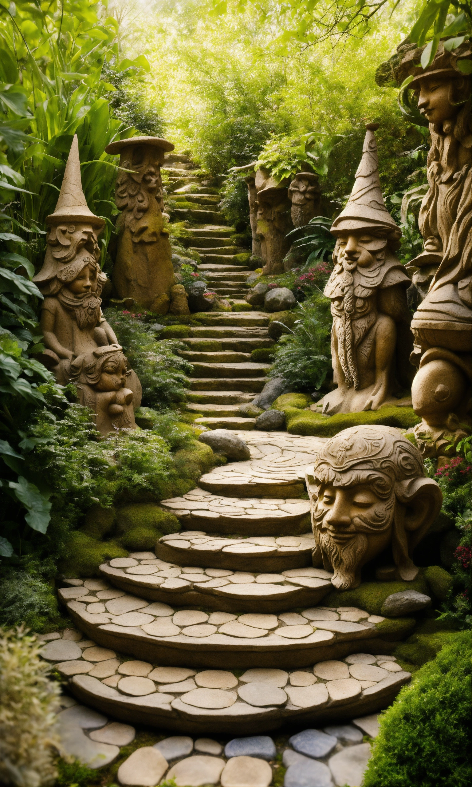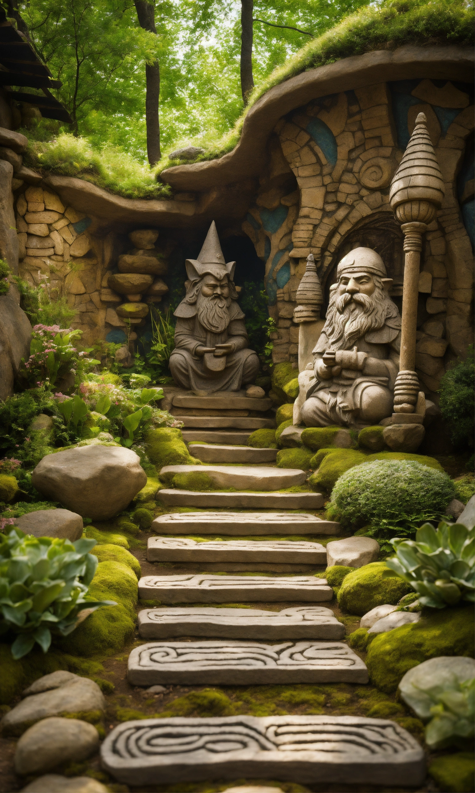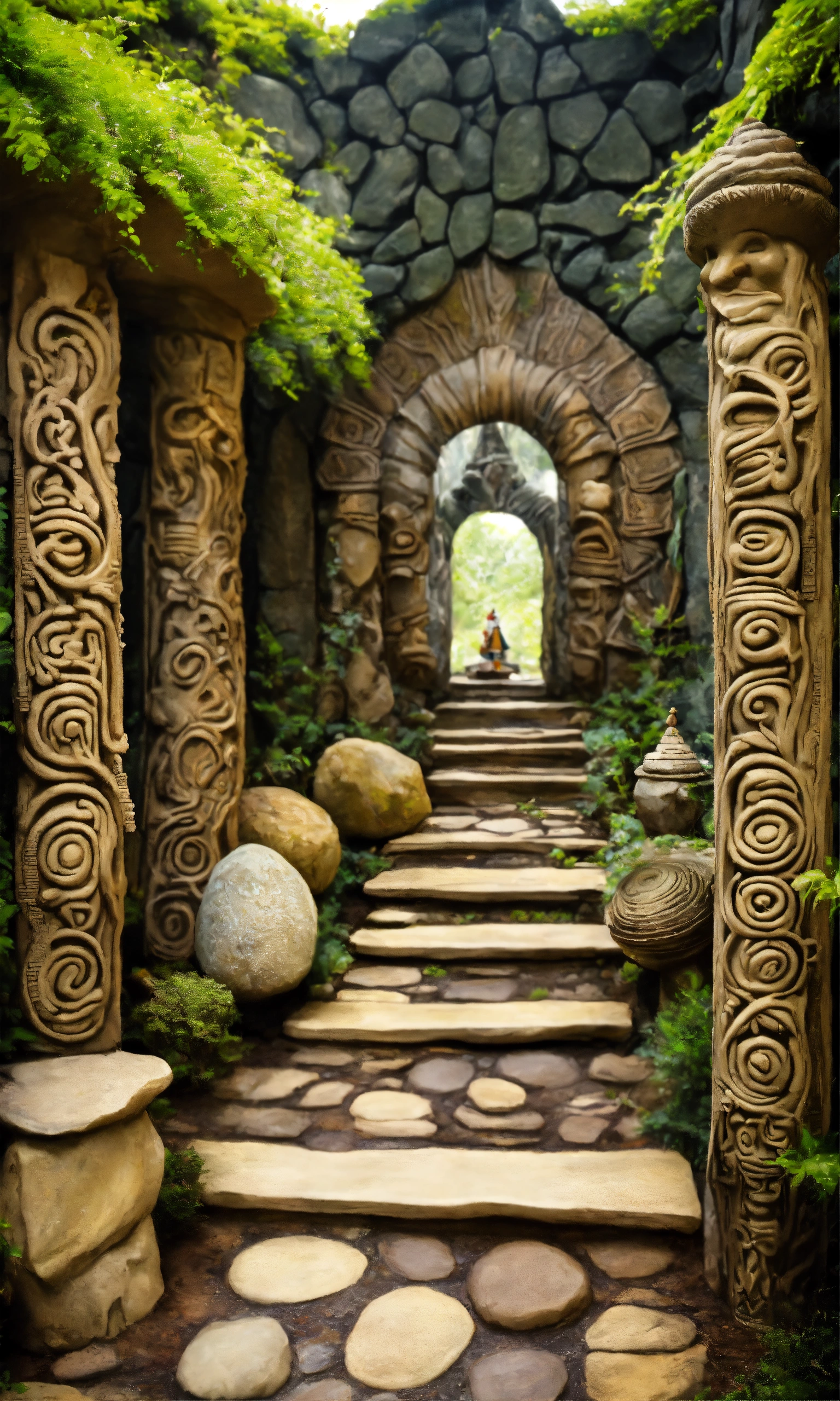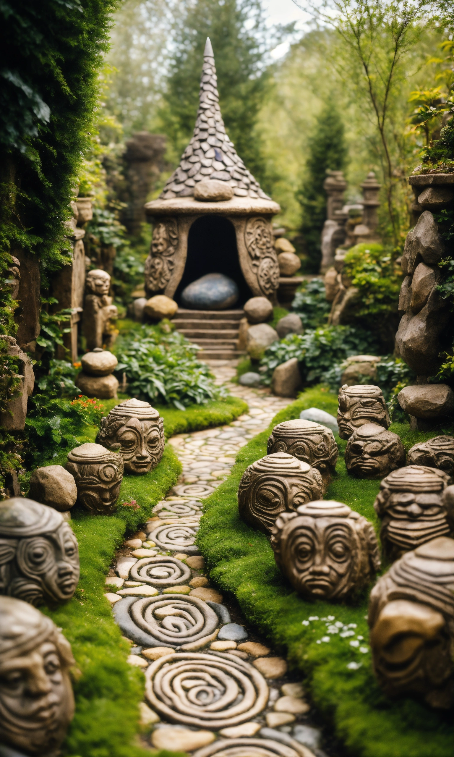 An ancient spiritual gnome inspired stone pathway rock garden.sculptured . style of alex grey/giger/brian froud. totem sculptures. patterned stone winding pathway, labyrinth.courtyard.meditative.