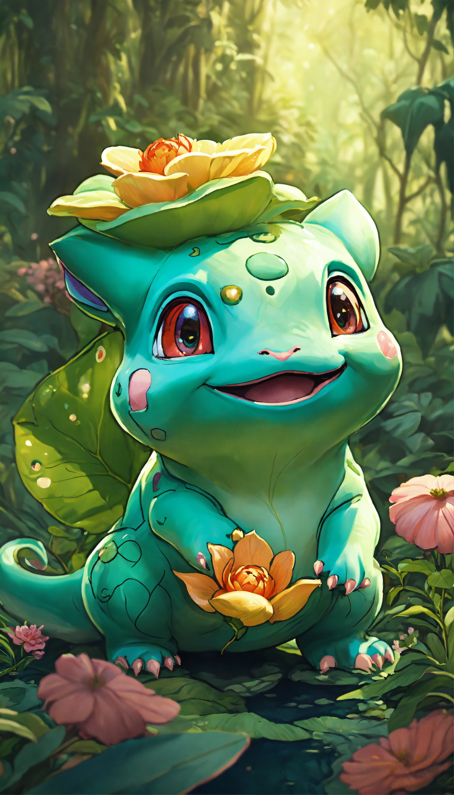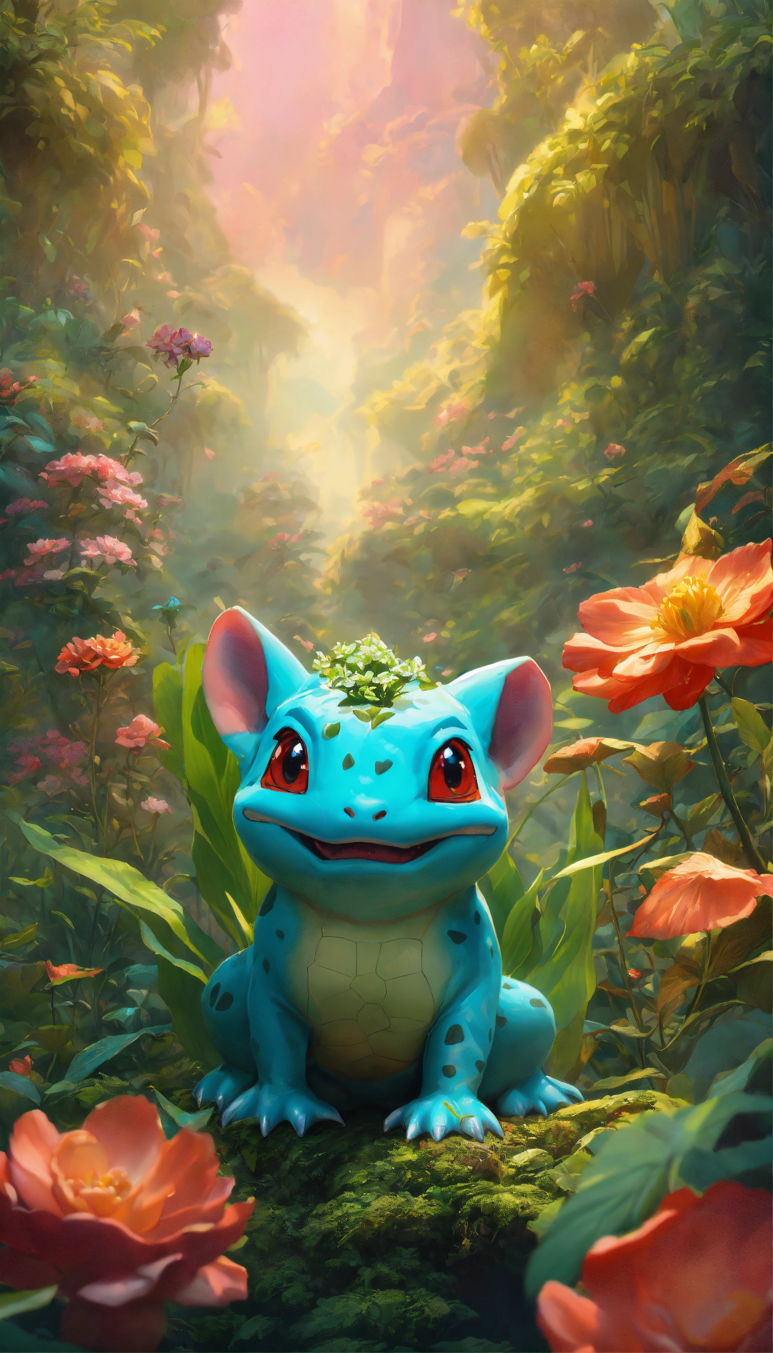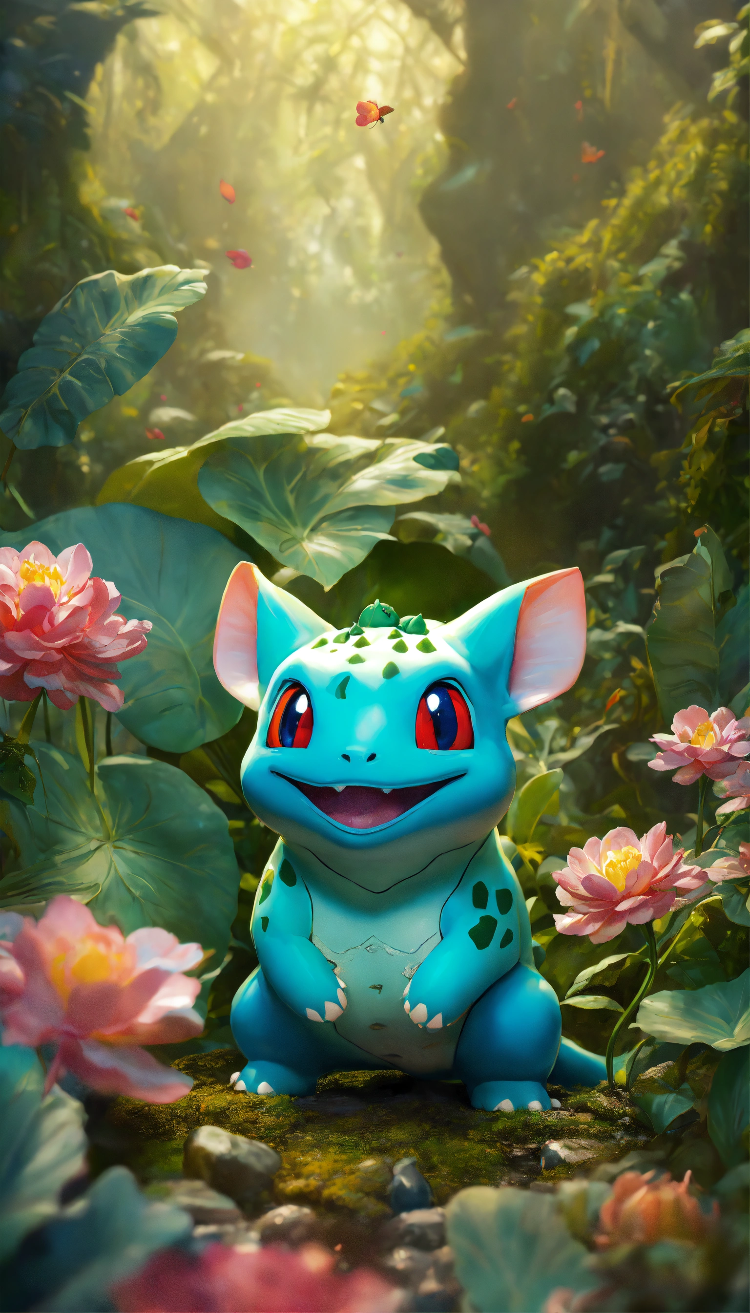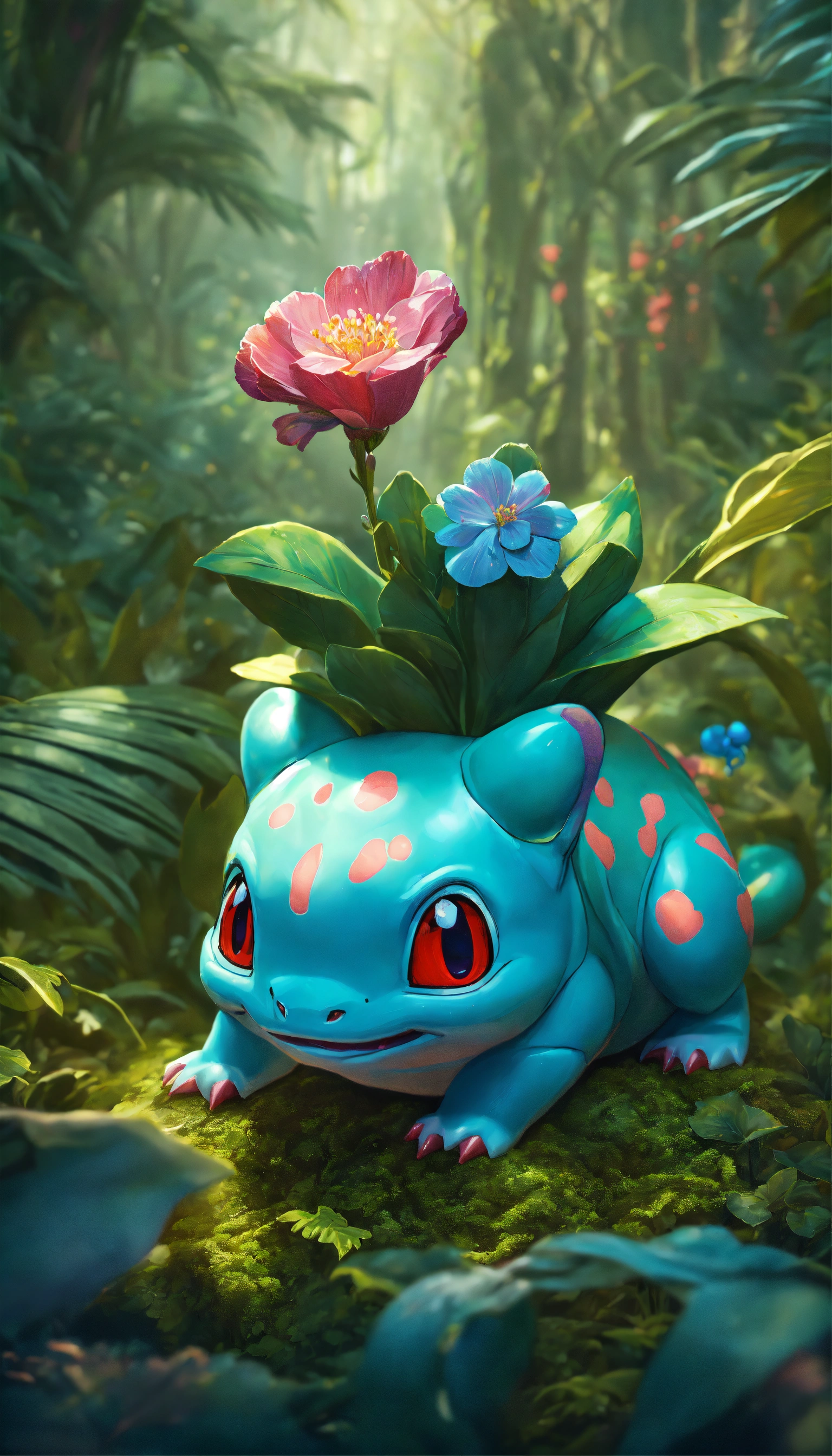 "extremely ultrarealistic photorealistic cute bulbasaur holding a flower in a vast jungle, by james jean and android jones jeff koons erin hanson joe fenton dan mumford professional photography, natural lighting, volumetric lighting maximalist photoillustration 8k resolution concept art intricately detailed, complex, elegant, expansive, fantastical"