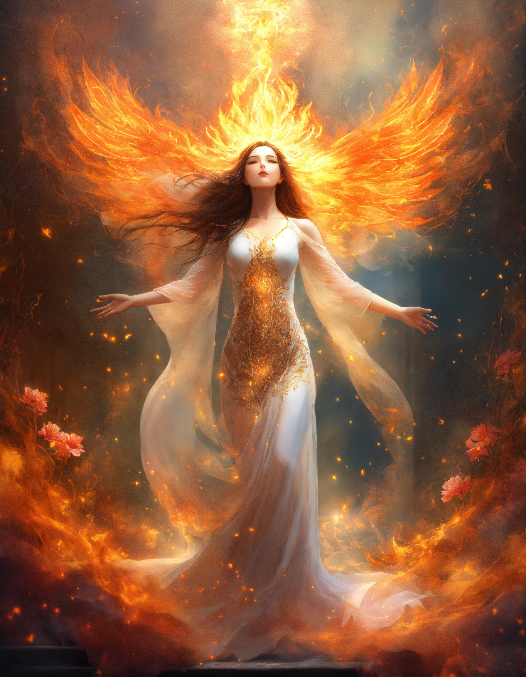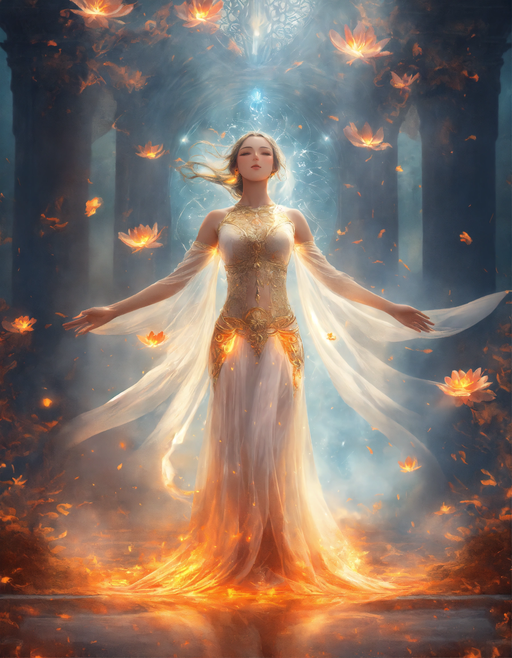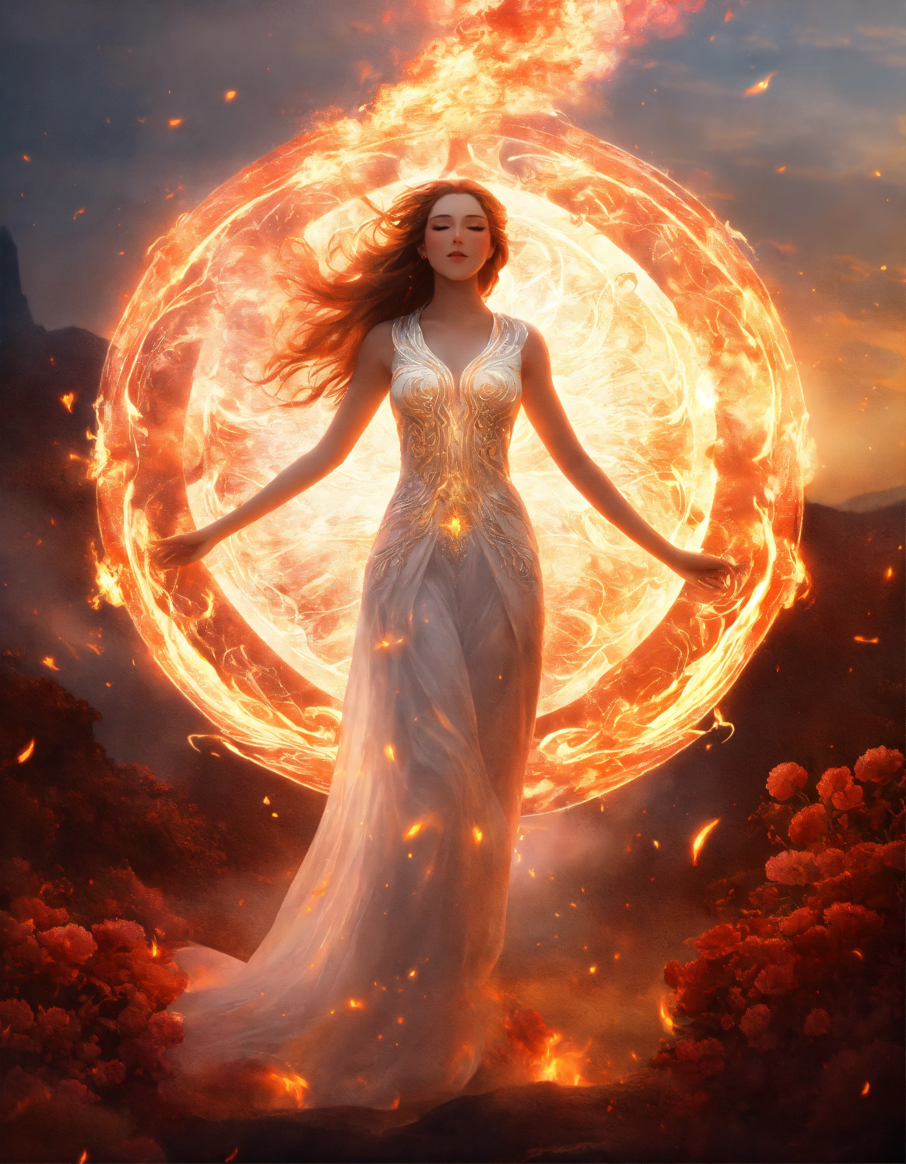 Fantasy, mesmerizing design, ascending spirit woman, arms of spirit being spread out, white transparent body in mist, transparent radiant light on her body, fire flame at the end of each arm, beautiful fire flowers around the perimeter, transition to another world in the back