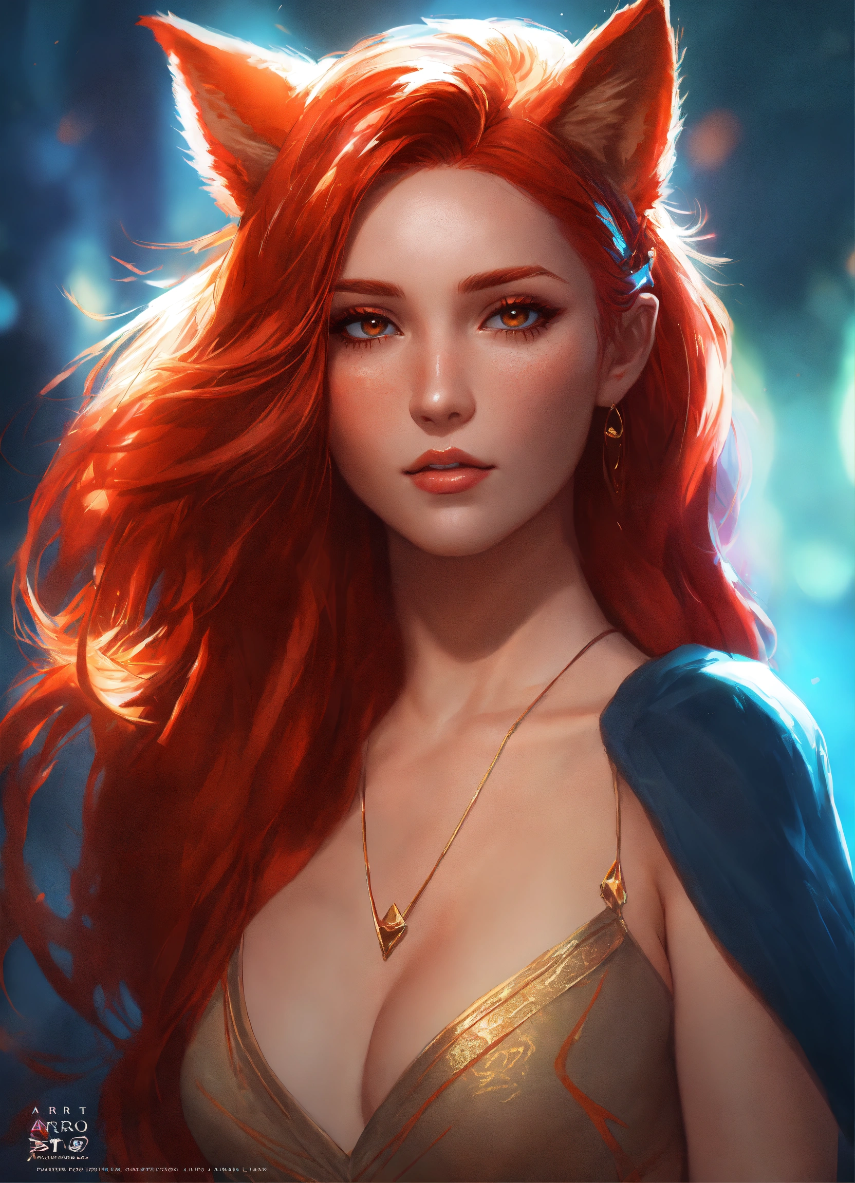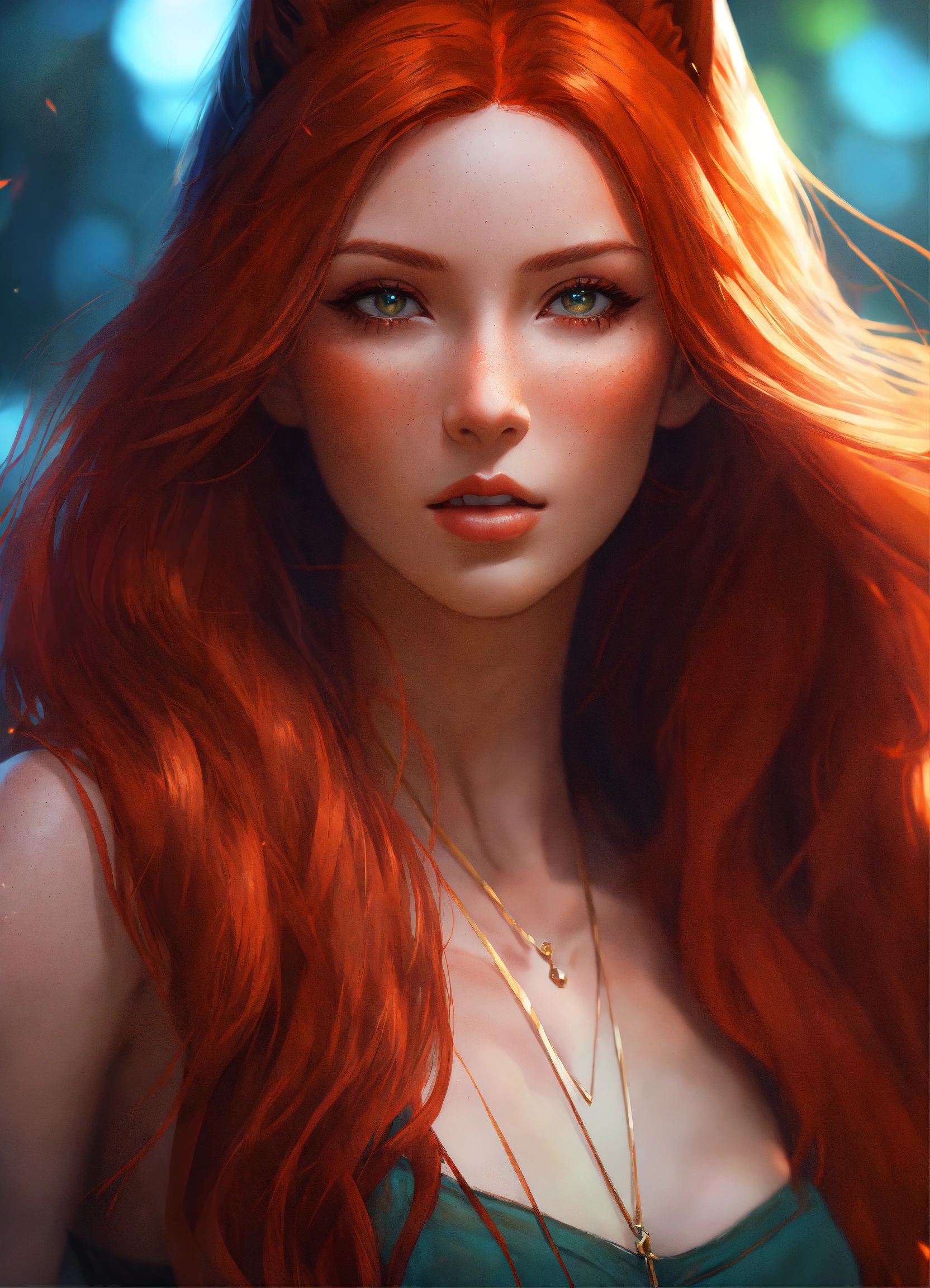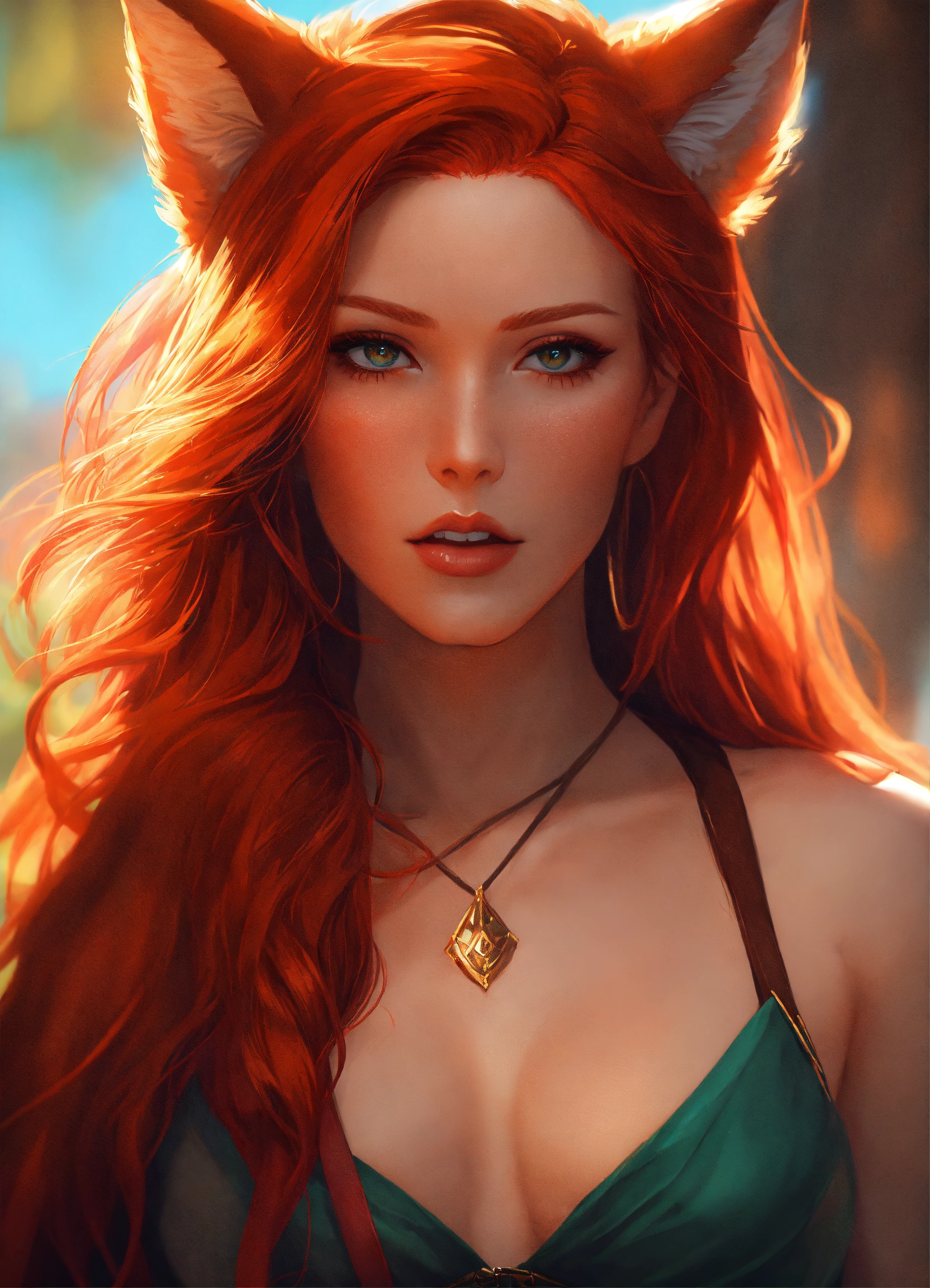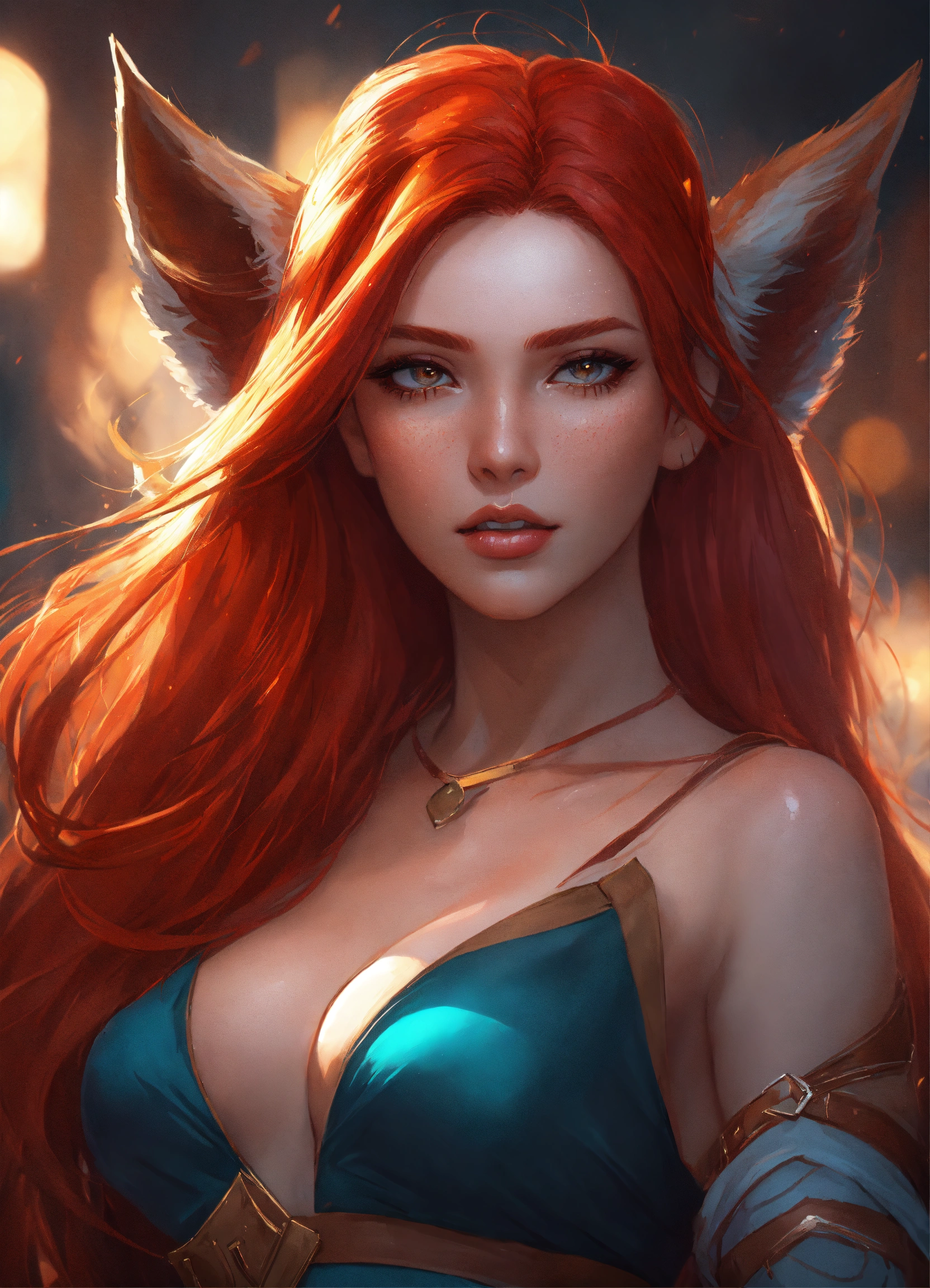 A strikingly alluring redhead woman, possessing fox ears that elegantly crown her head, complements her vibrant, fiery long red hair that conceals her human ears. wears a loincloth and brown crop top. rossdraws style, art by artgerm, trending on artstation, high quality, 8k, cinematic lighting, semi-realistic