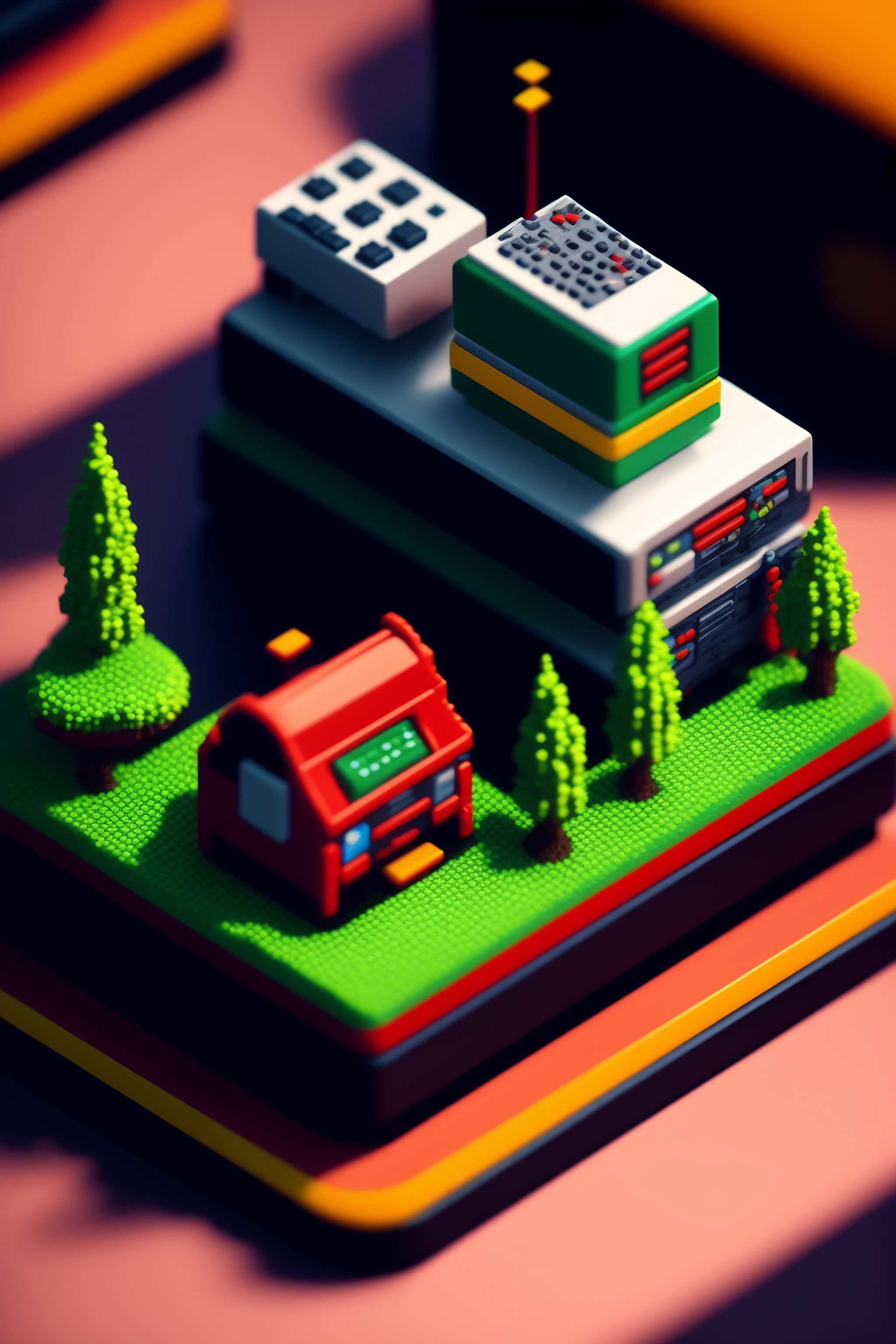 An stunning 3d pixel art city landscape made of retro consoles