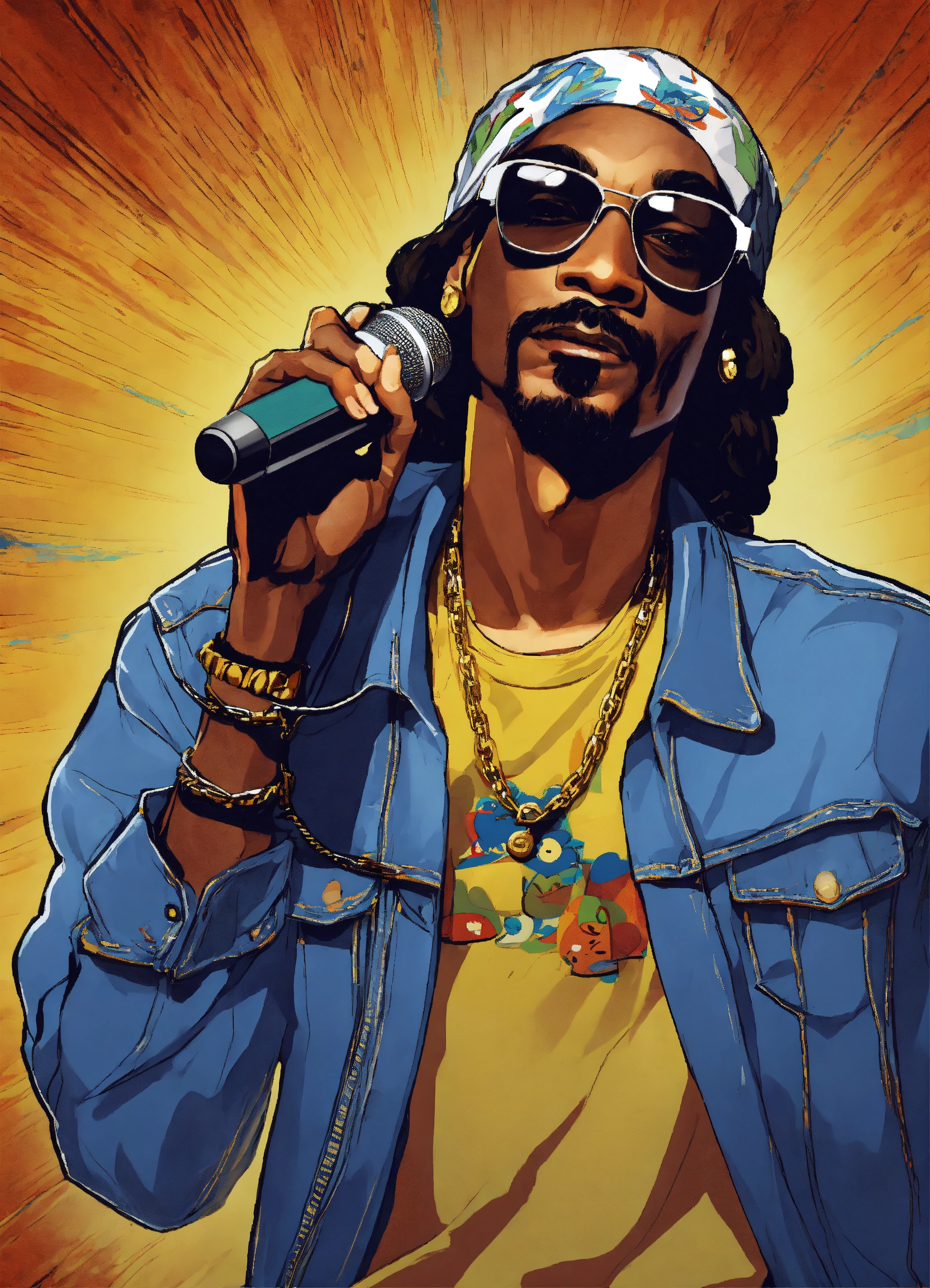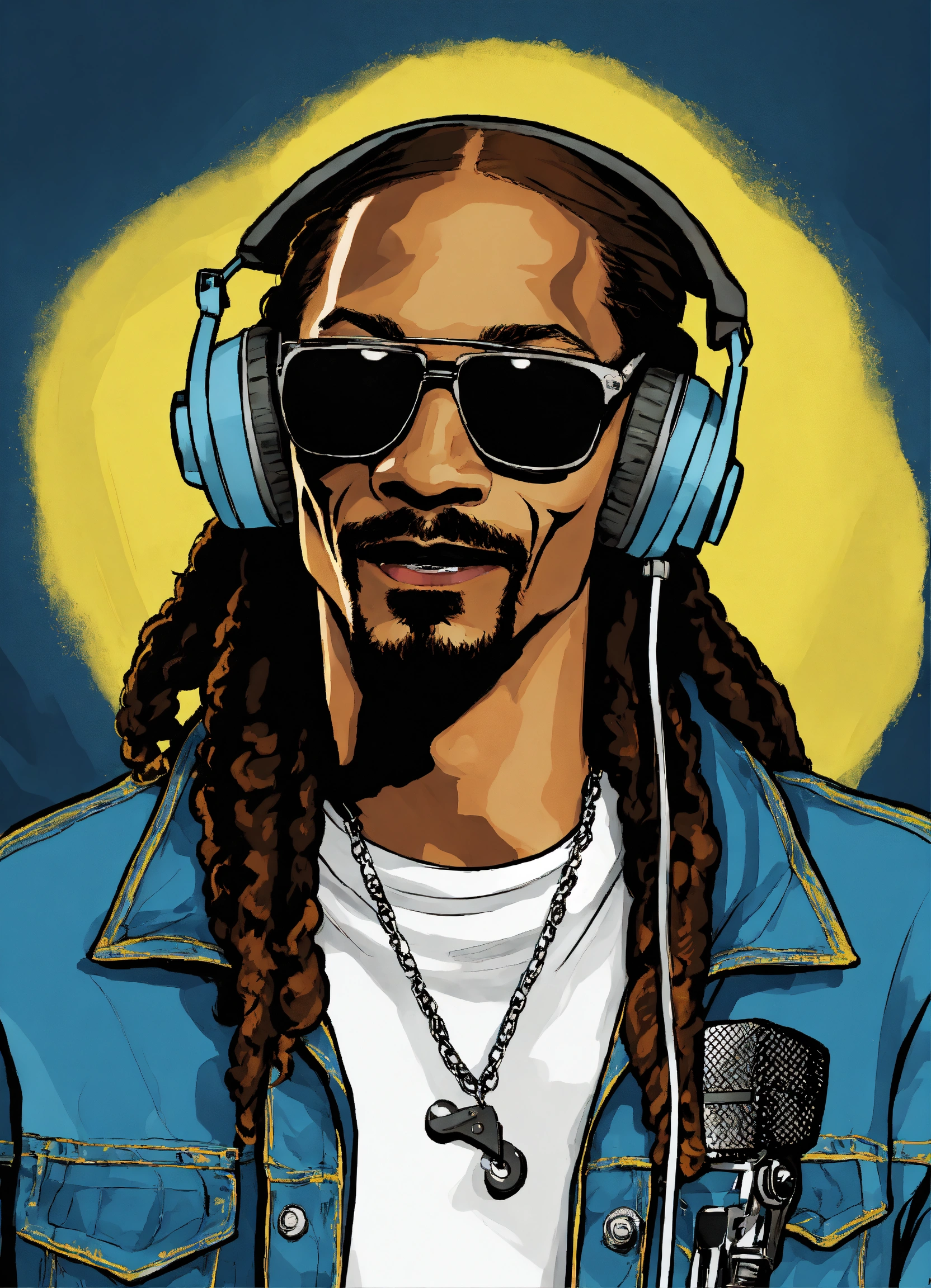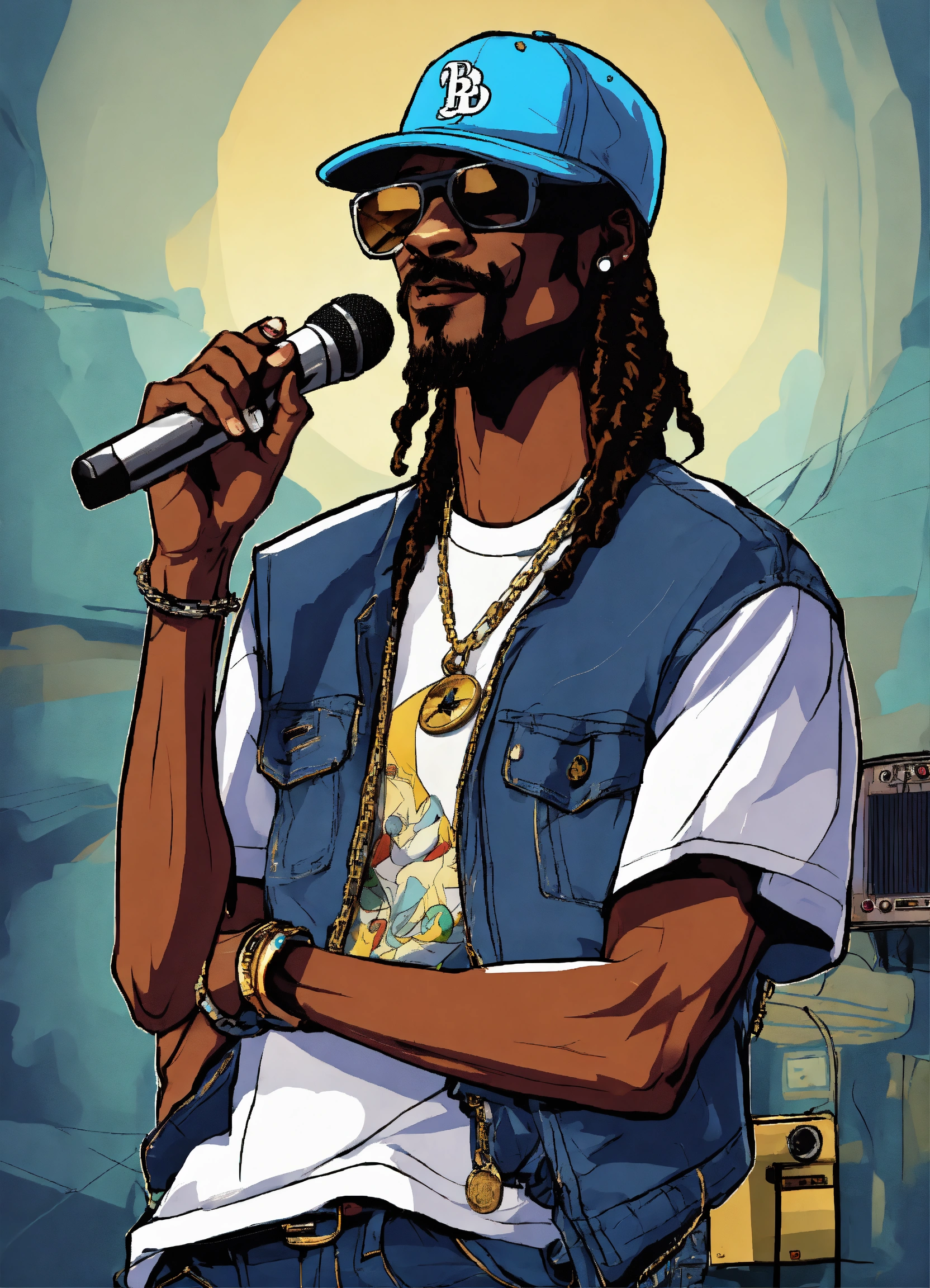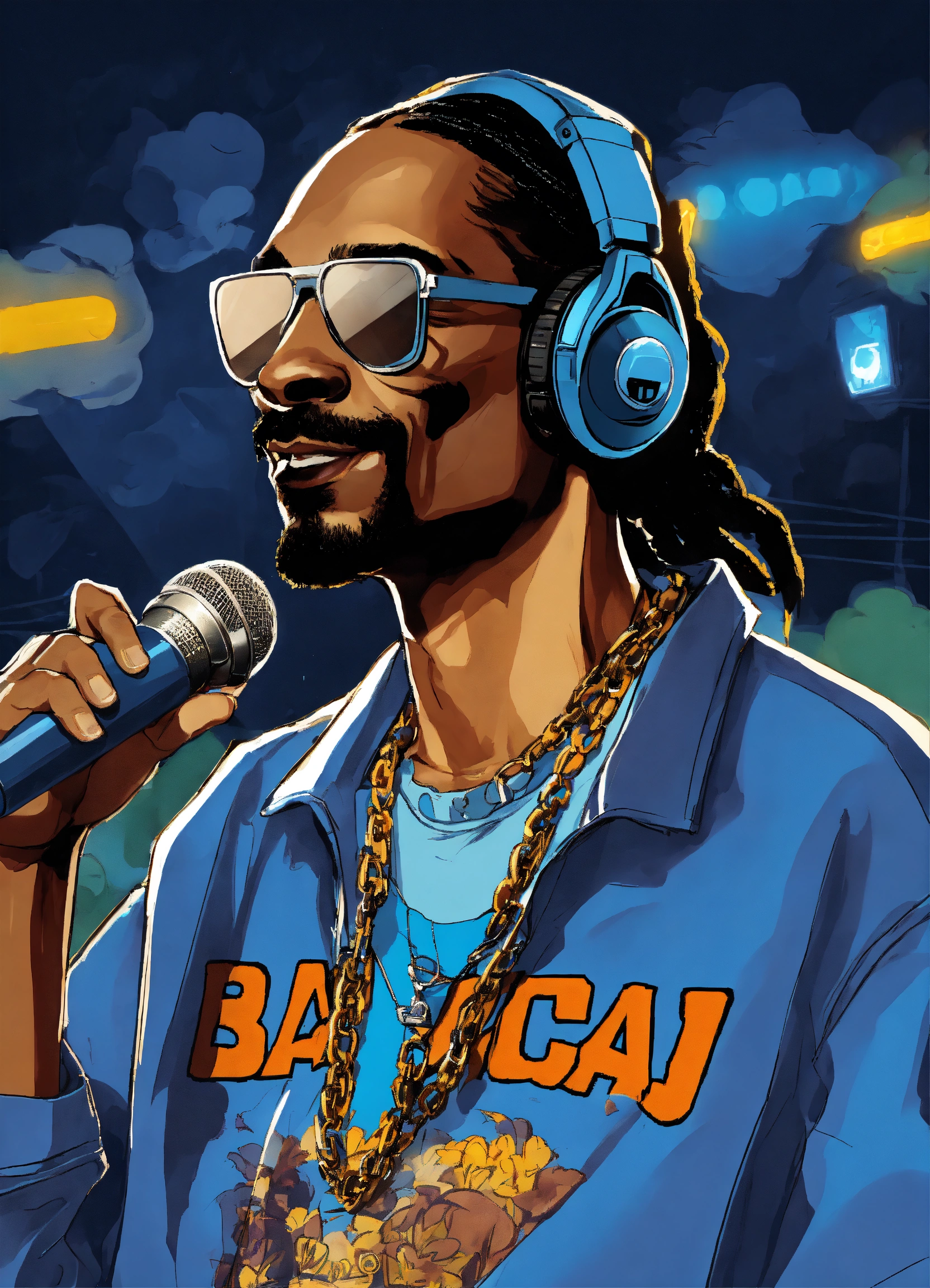 Handsome cartooned snoop dogg with a beatbox radio dressed in jeans and tshirt, singing, "i can't live without my radio" --v 5.0