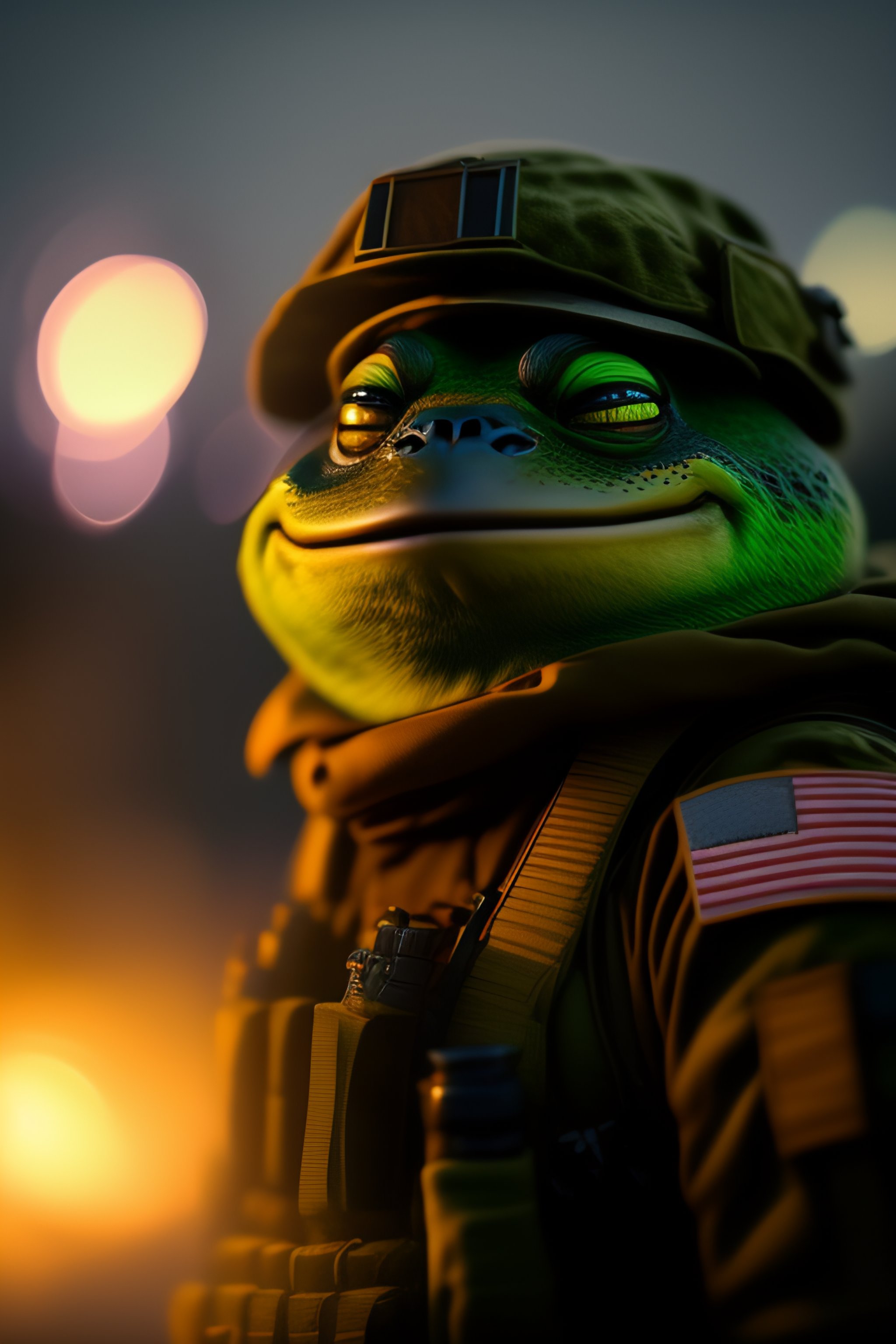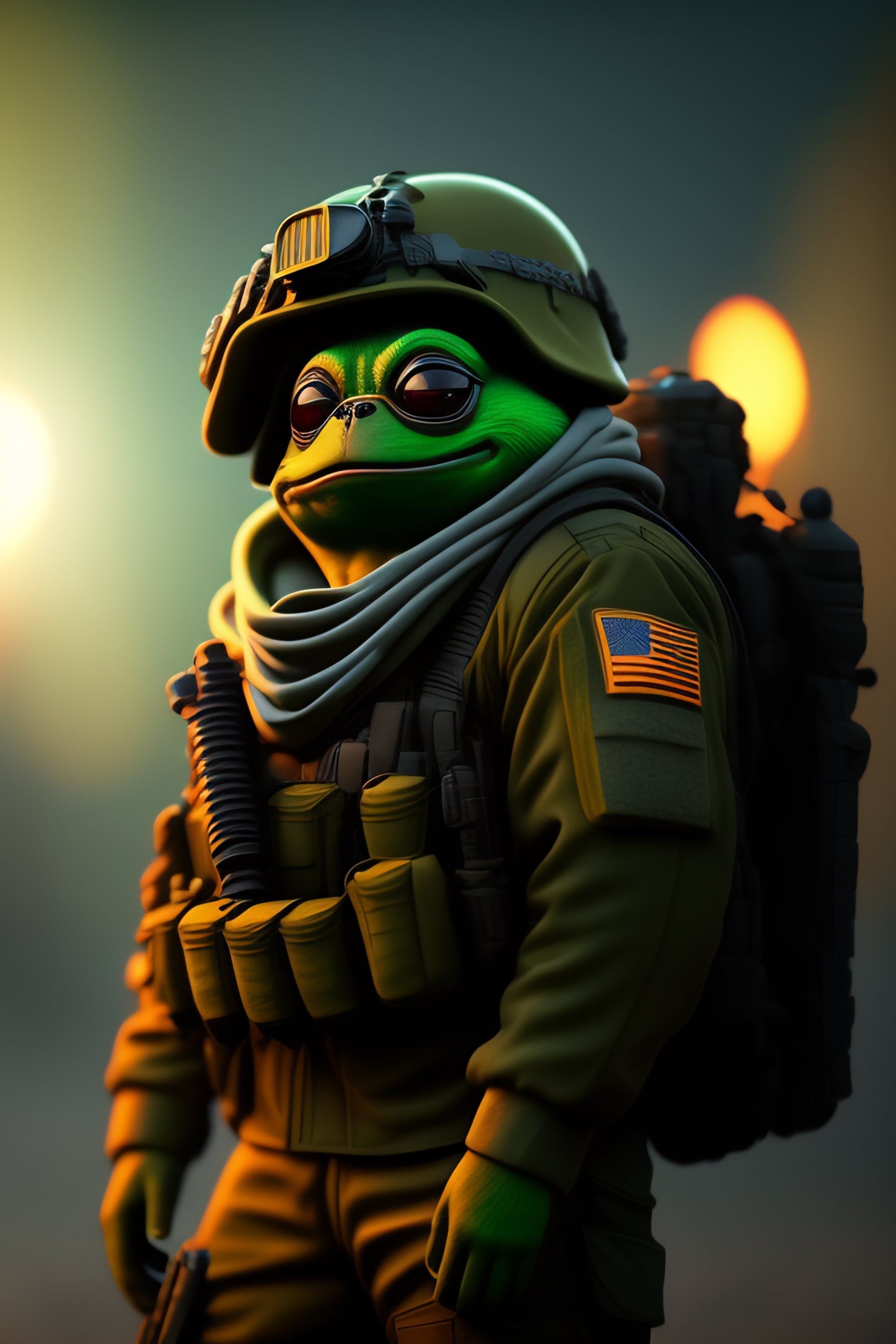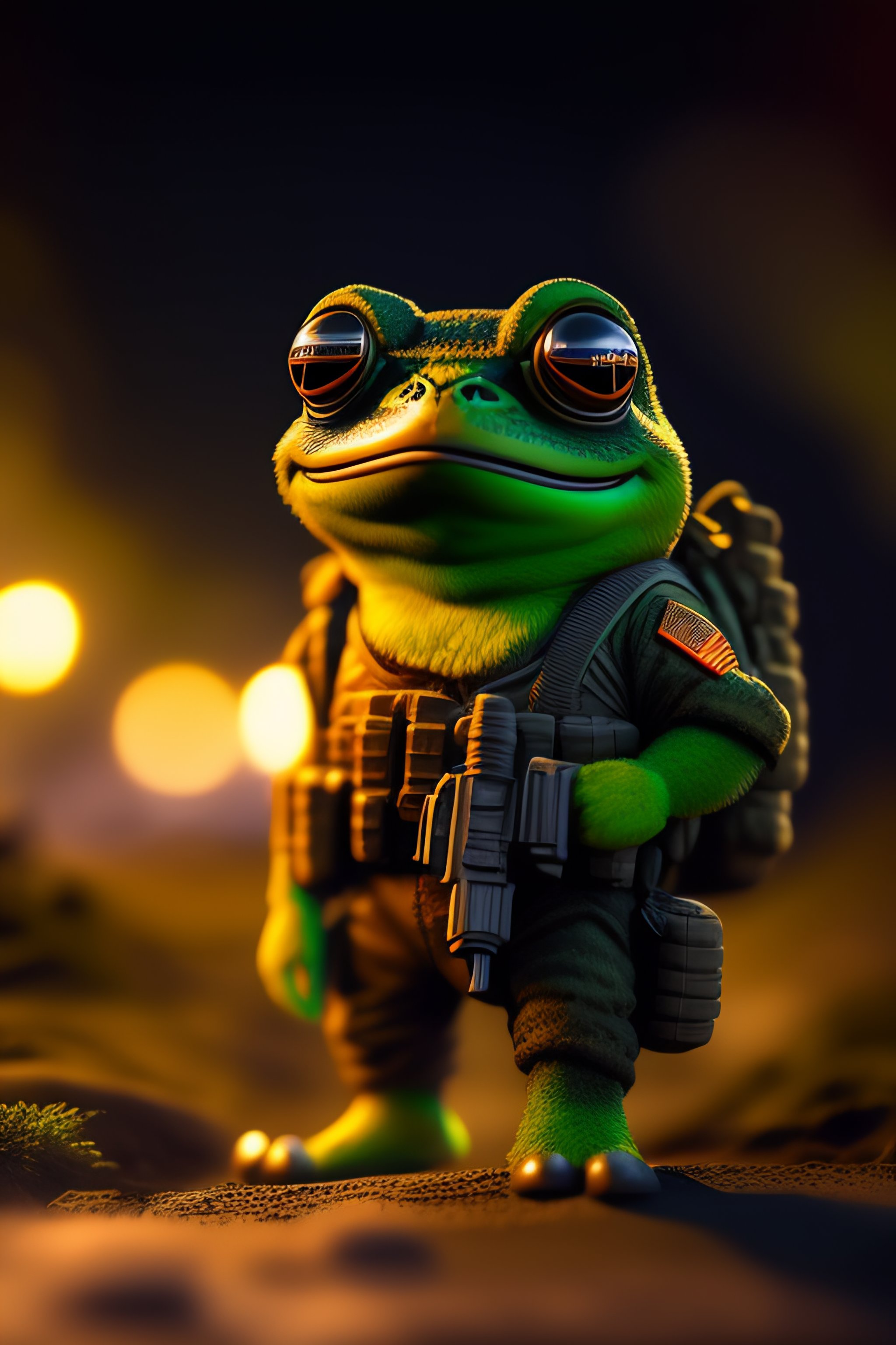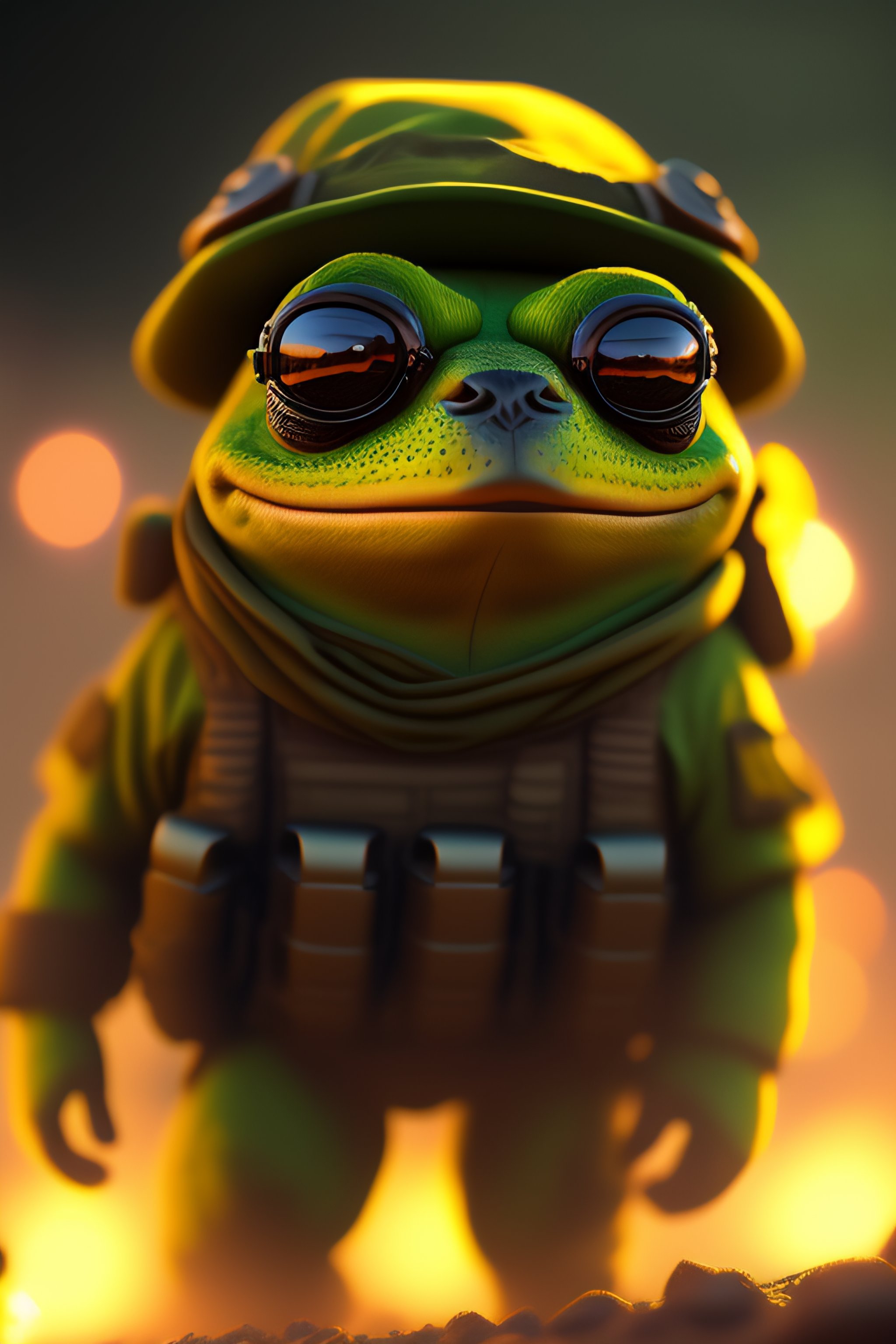 An exhausted pepe the frog at the frontlines in the army at night with his platoon fighting, key lighting, soft lights, foggy, 8 k render, detailed, cute cartoon style, warhammer 40k