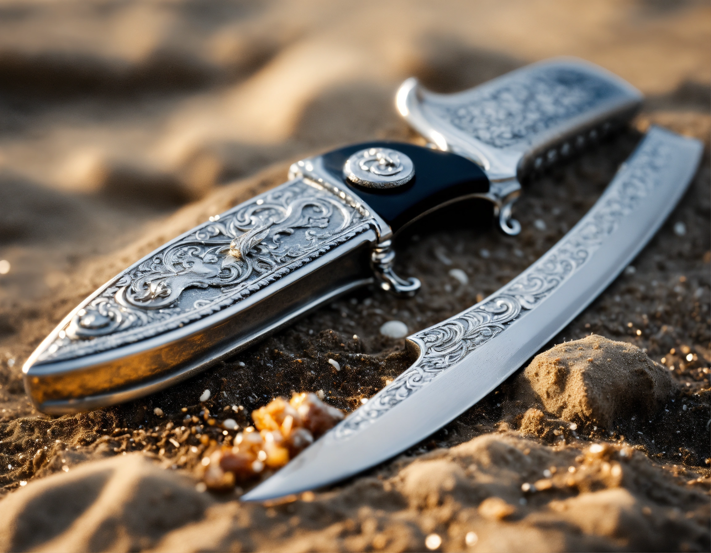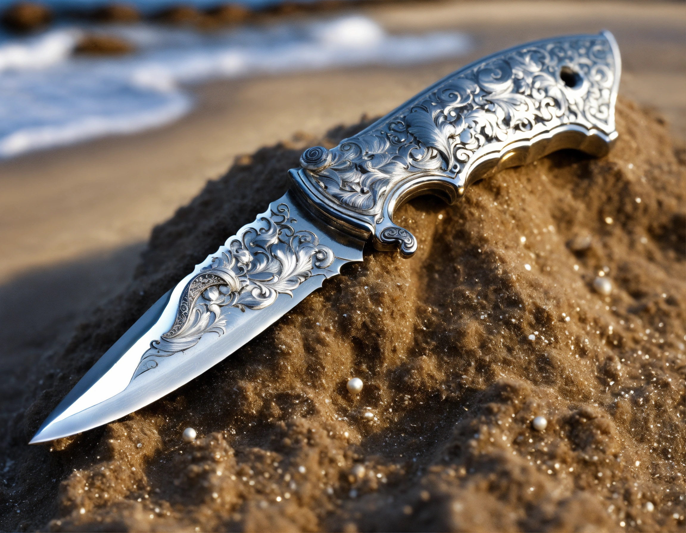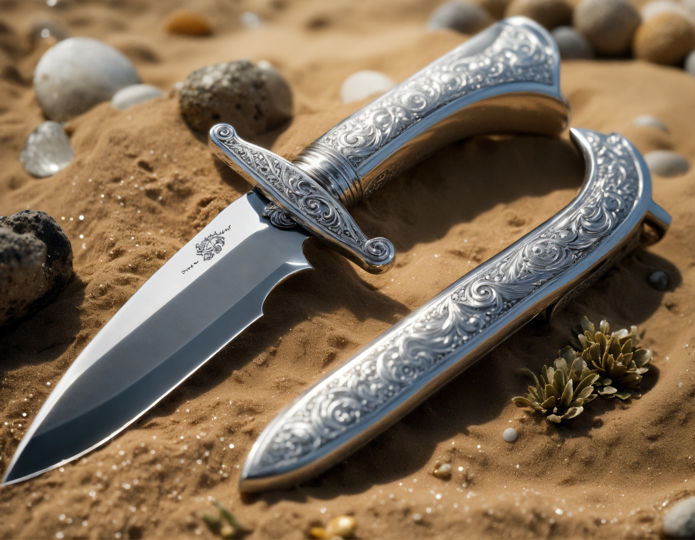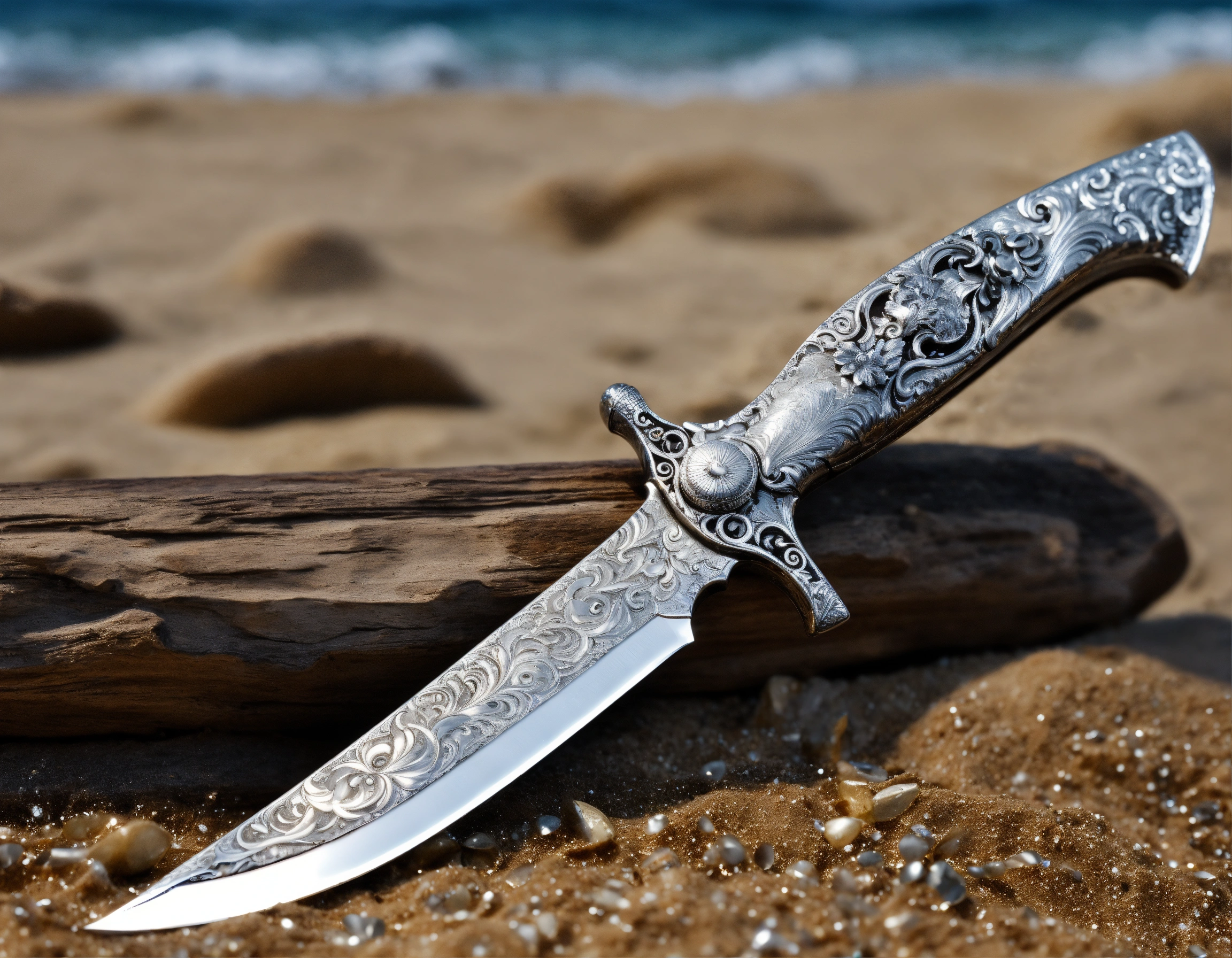 8k, picture of a delicate wavy divers hunting knife made of lunar-silver, highly ornamented, handle is wrapped with silver wire, very detailed, ultra realistic, lays on the beach in the sand, fantasy