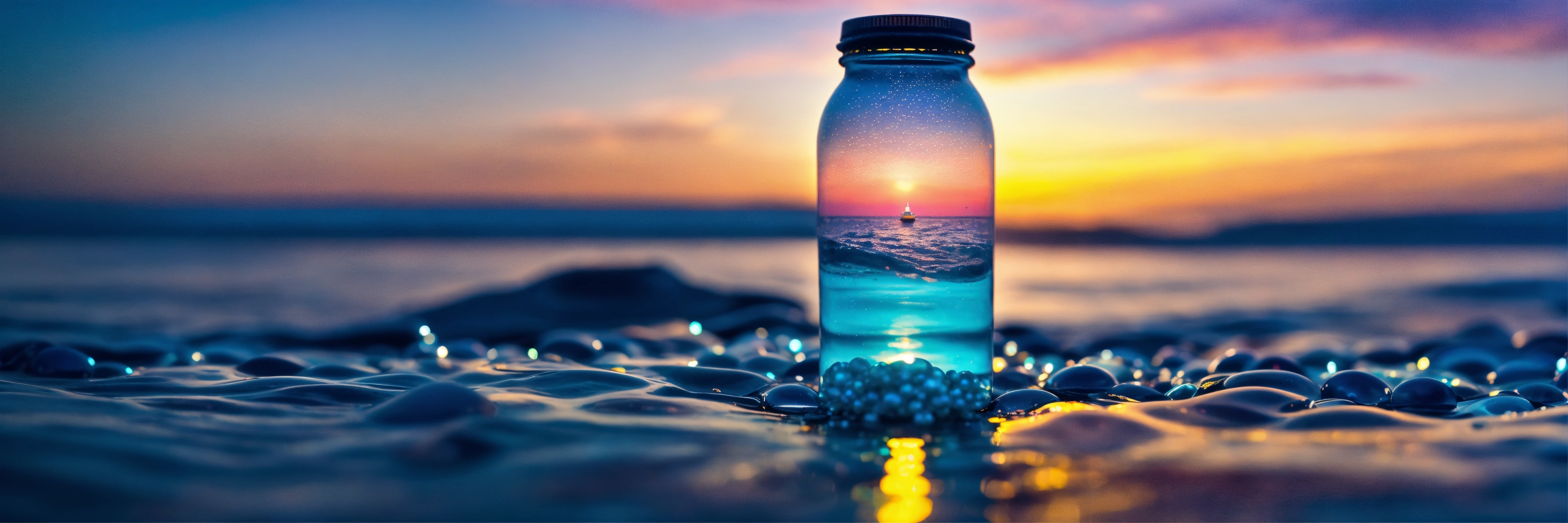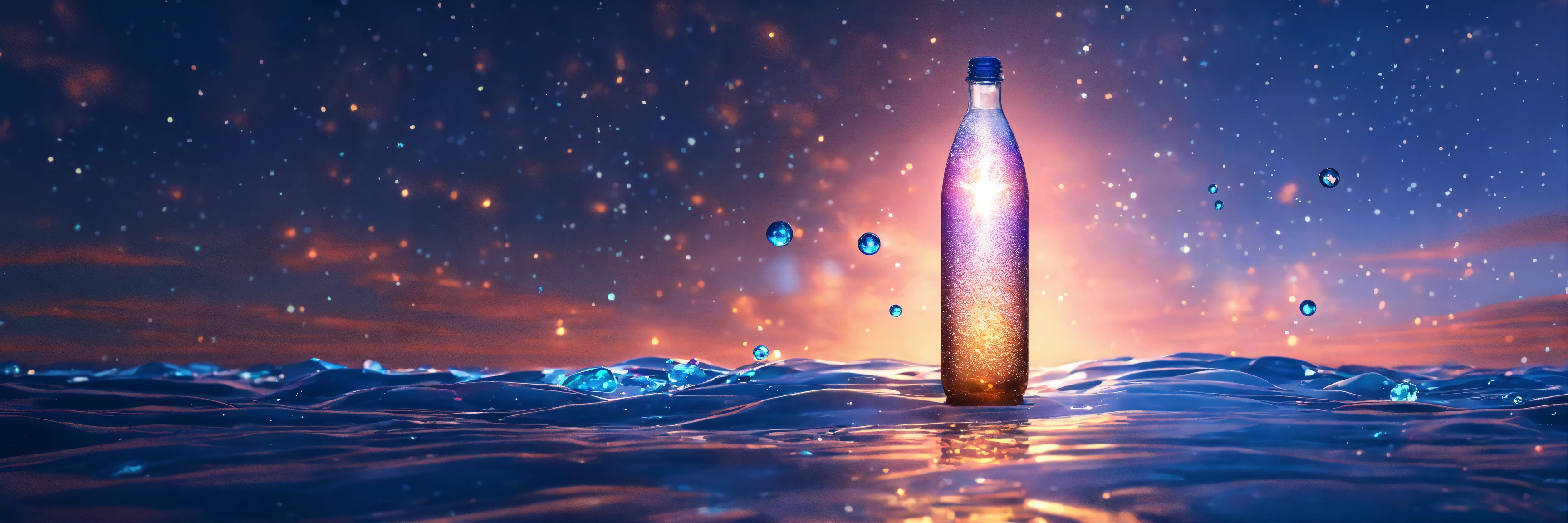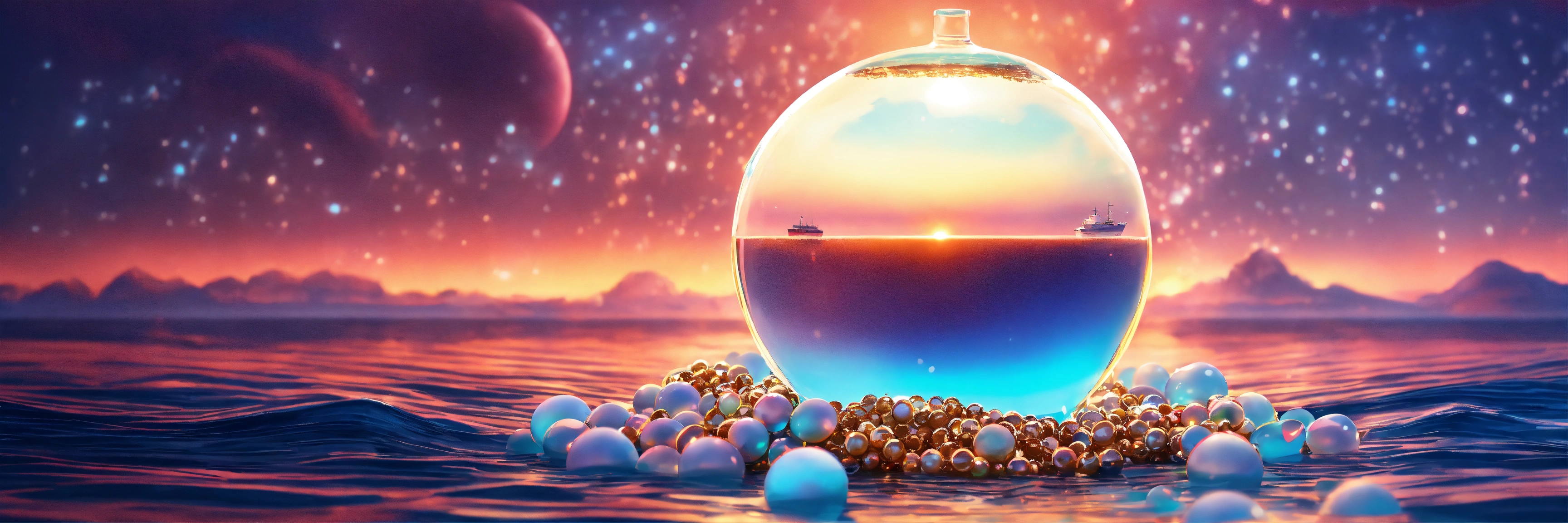 A bottle of water in the middle of an ocean, alien planet, shimmering pearls, water made of shimmering pearls, white, shimmering pearls with a futuristic ship inside the cup chains around the cup in 8k, high resolution, --, high definition, elemental, hyperealistic, snowing, sunset in the background, full scale, large, juxtaposition, intergalactic, text vision., neon colors, smooth, gentle