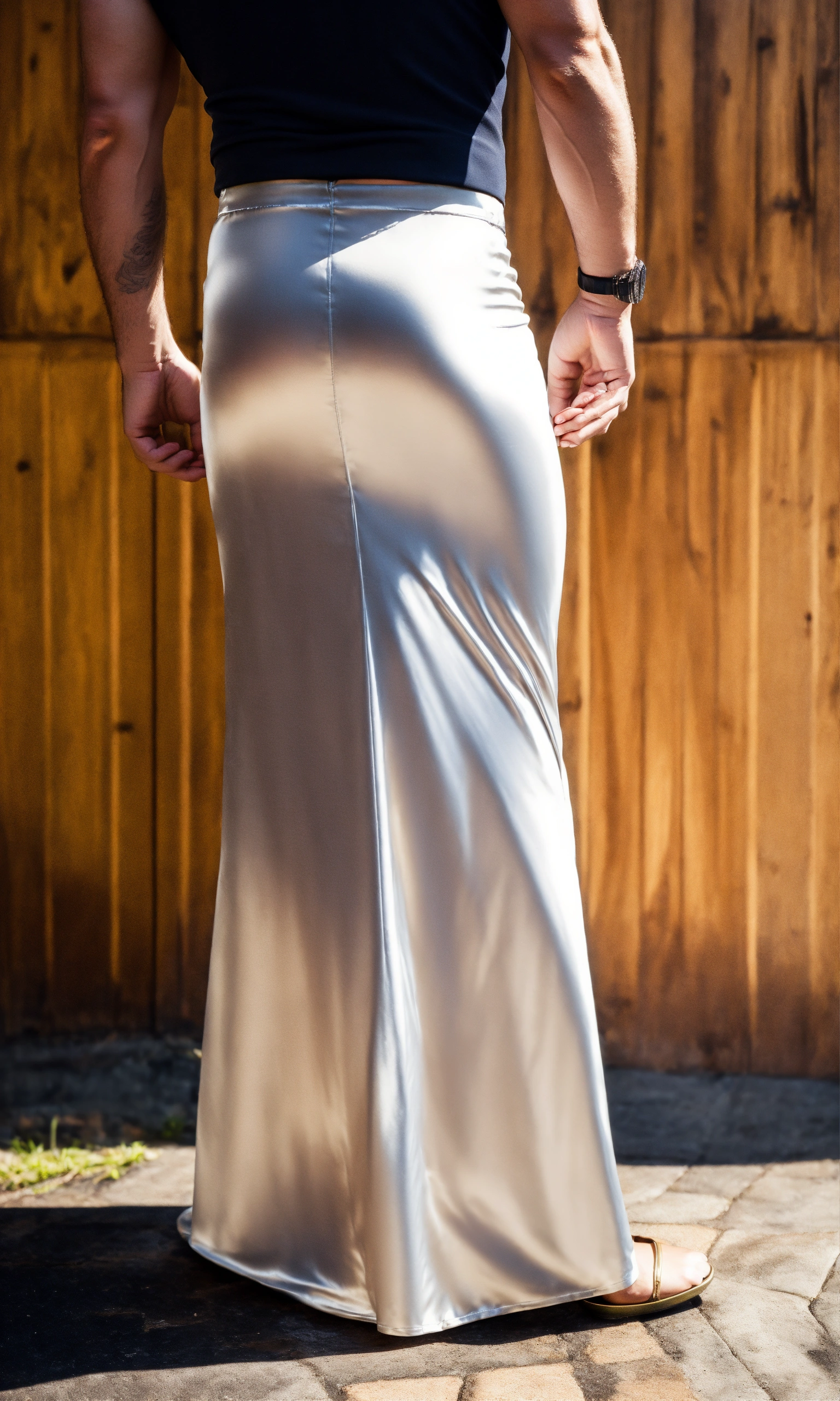 Close up of man wearing white satin shiny figure-hugging clingy pencil maxi skirt, pulled taut. close up. manly body part straining through fabric. toned bulking body. bu lge. ere ct. intimate. tumescent. extremely tight skirt. hard outline.