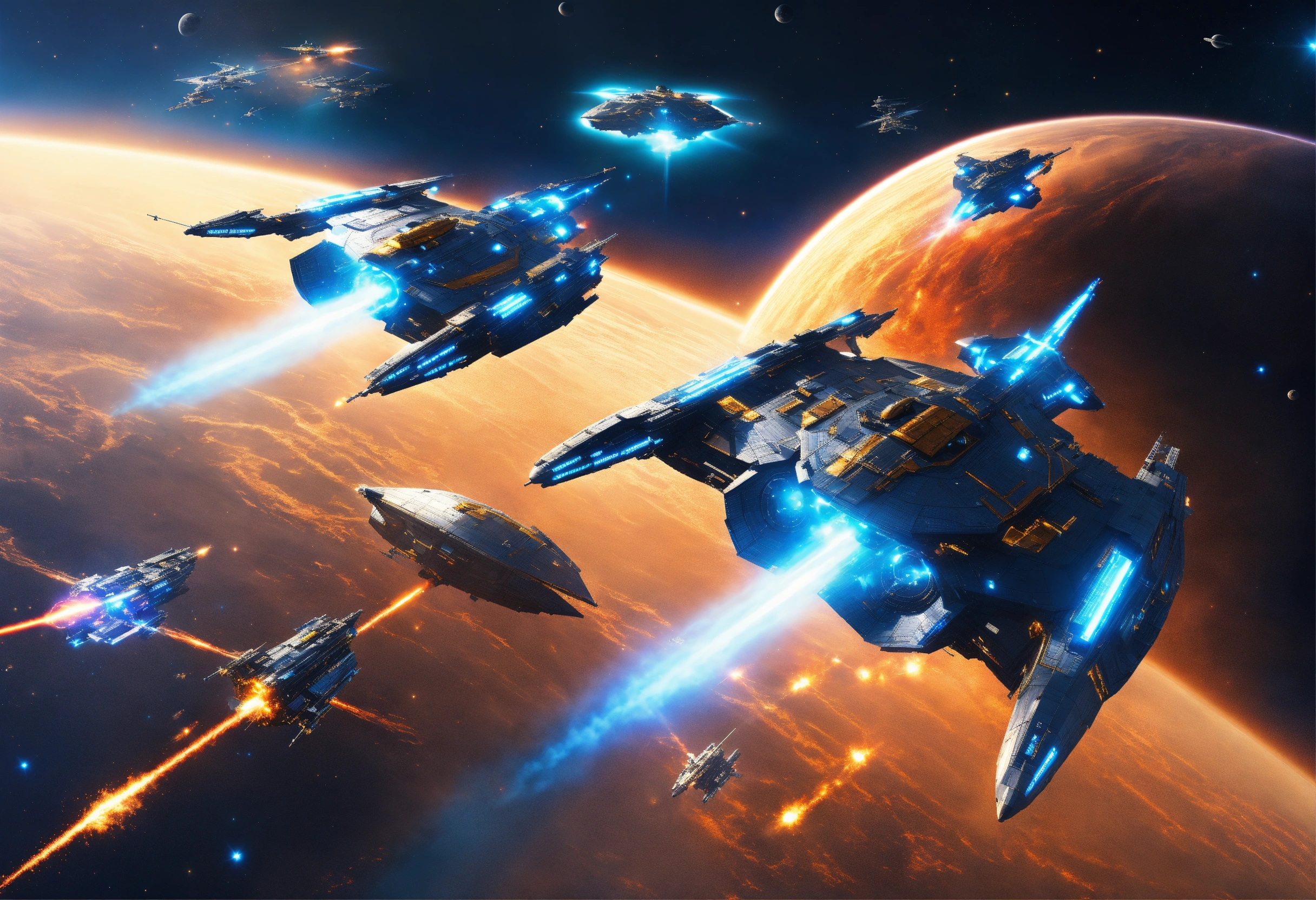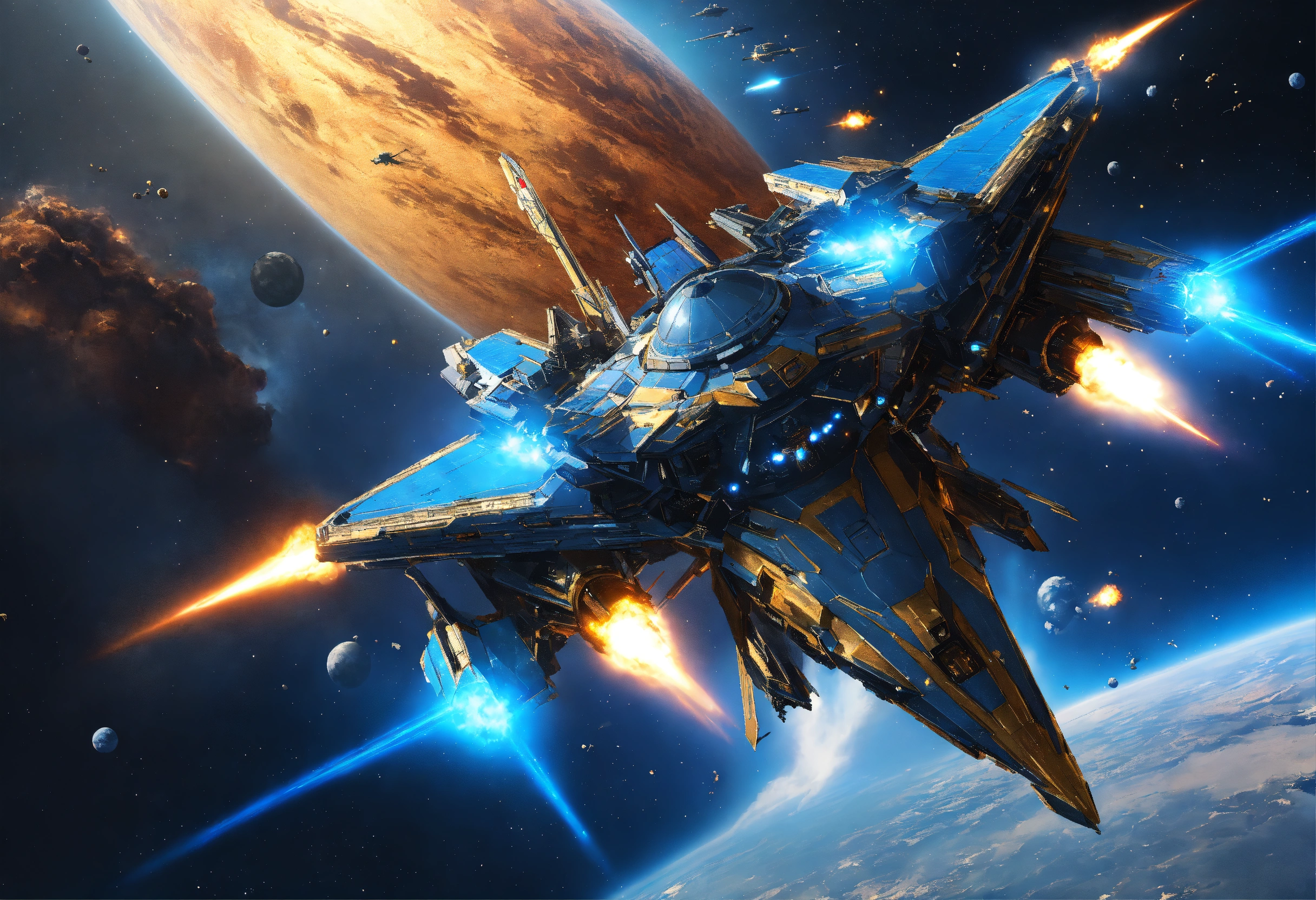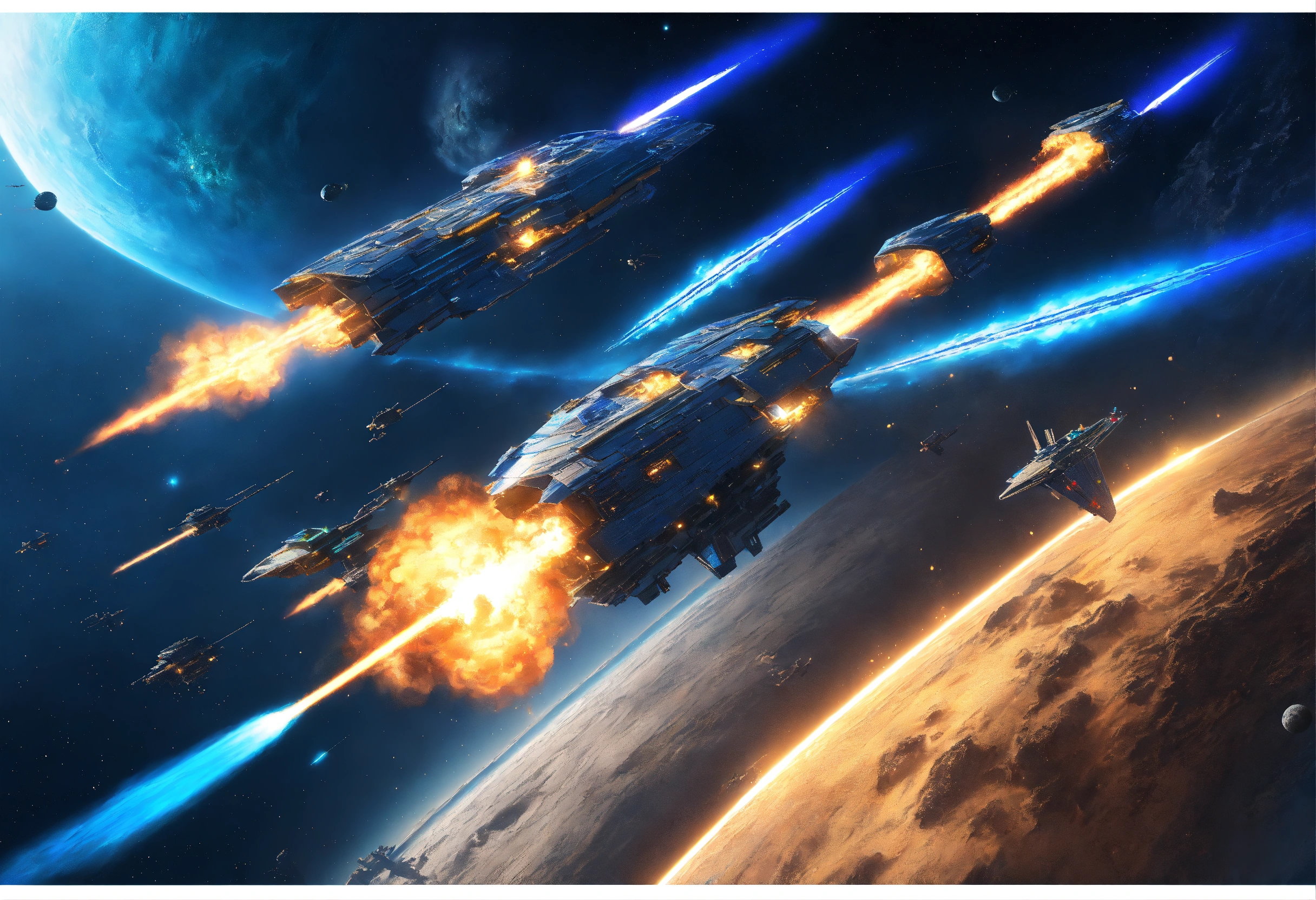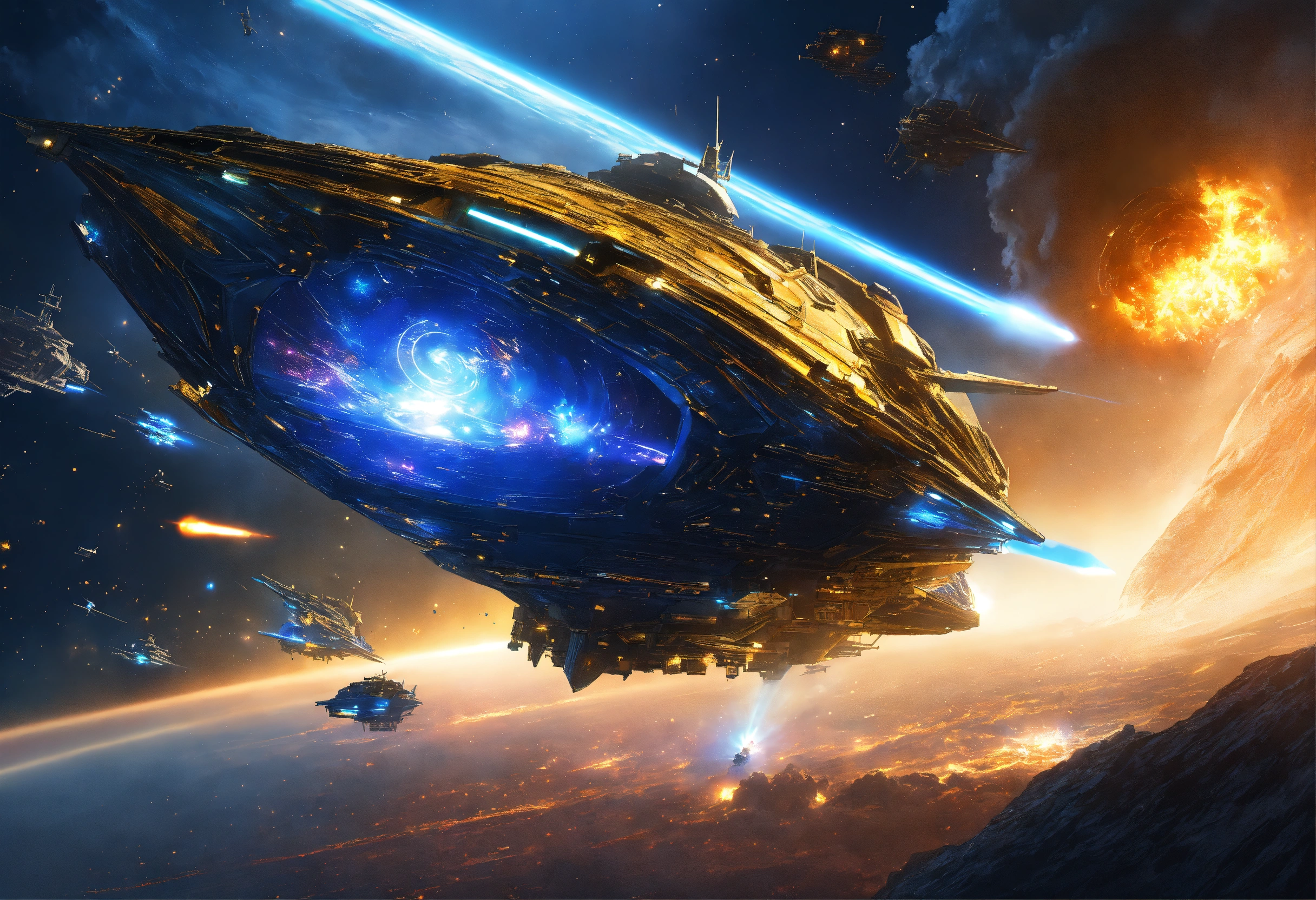 Epic gigantic blue golden and blue silber spaceships, fighting against black spaceships in space, there are big explosions and dameng ships, laser beams fiering throug space