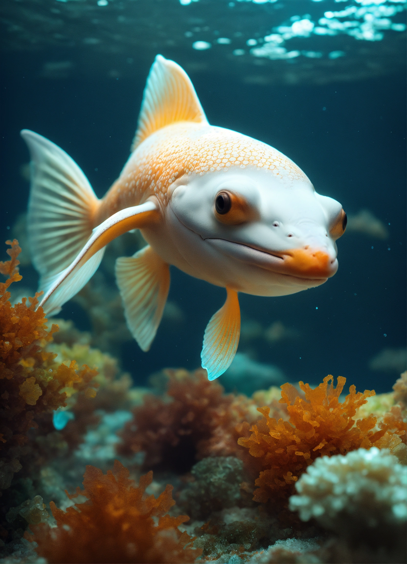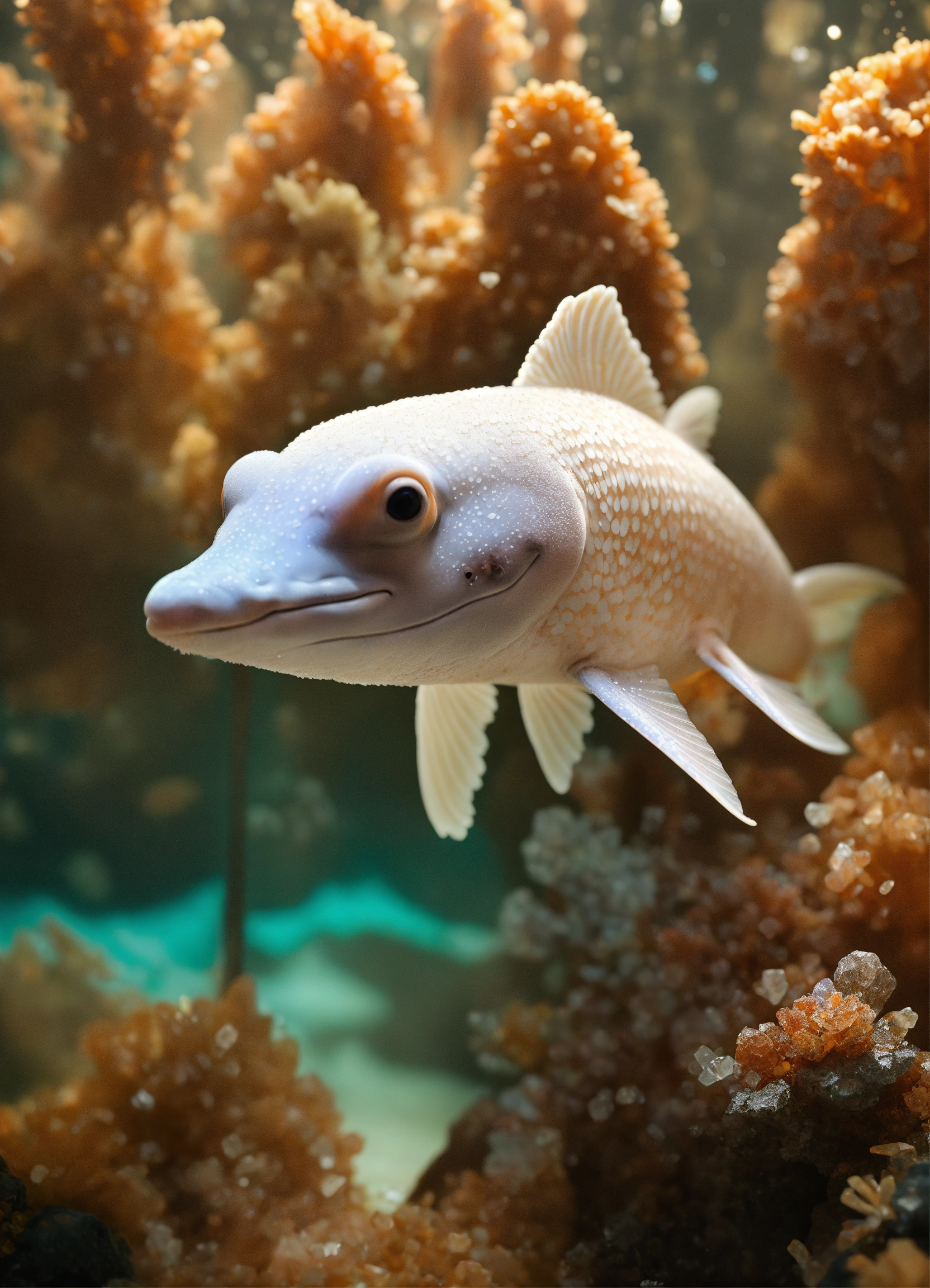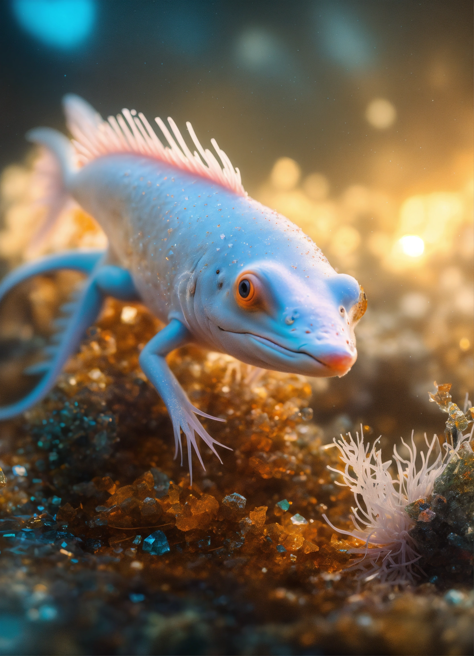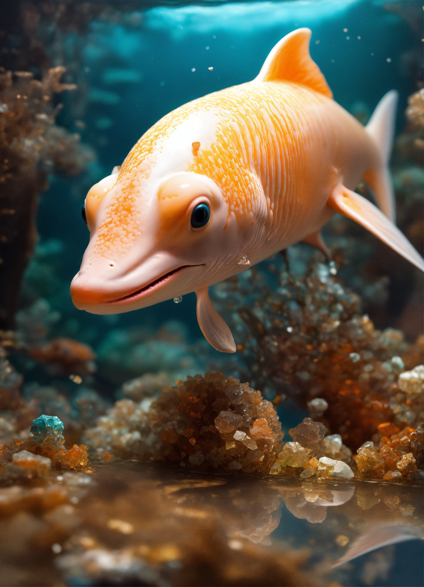 New hybrid species of axolotl and dolphin, a hybrid animal, the marine mammal is a 50% white albino axolotl 50% dolphin. it’s a combination of the two animals. hybridise a dolphin with a axolotl. in the style of photorealistic surrealism, made of crystals, serge marshennikov, surreal cyberpunk, detailed hunting scenes, sots art. in the style of hyperrealistic fantasy, dark white and light orange, multidimensional layers, liquid emulsion printing, made of crystals, detailed science fiction illustrations, dreamlike installations. in the style of futuristic digital art, light amber and azure, bio-art, detailed miniatures, crystalline and geological forms