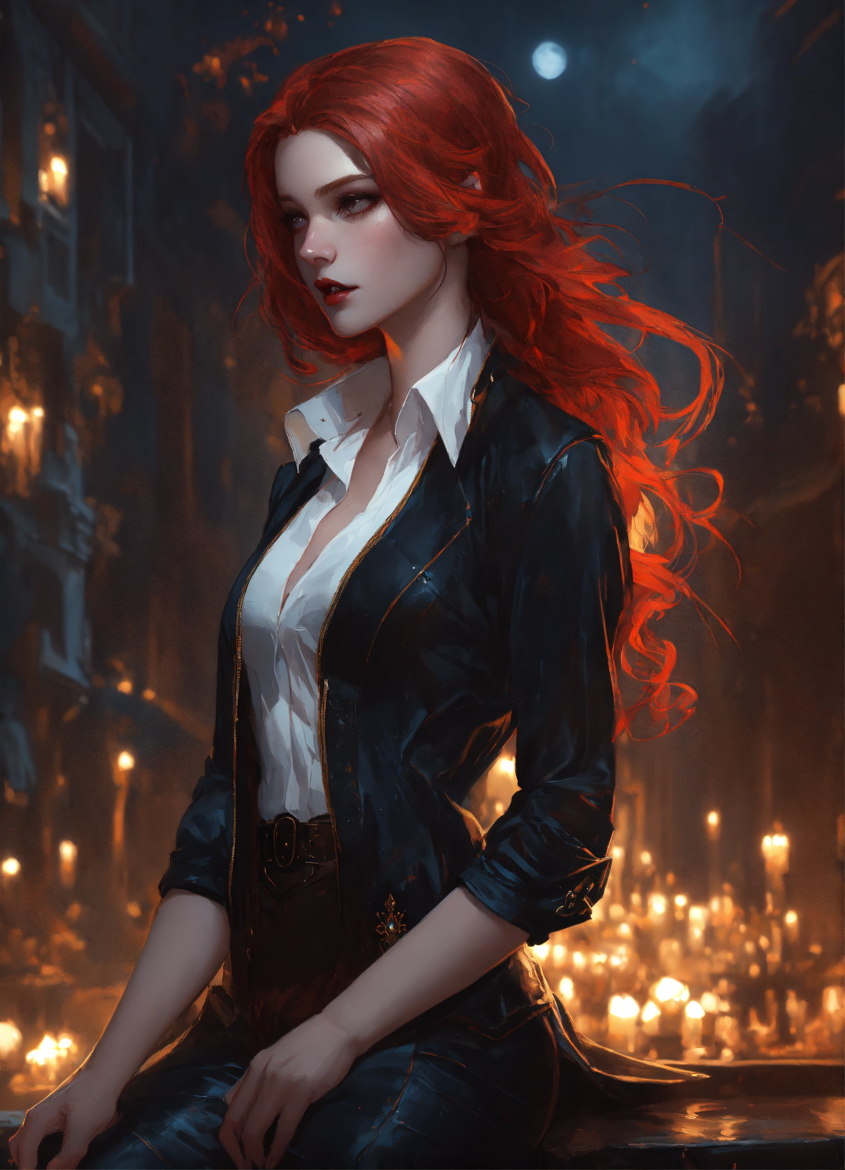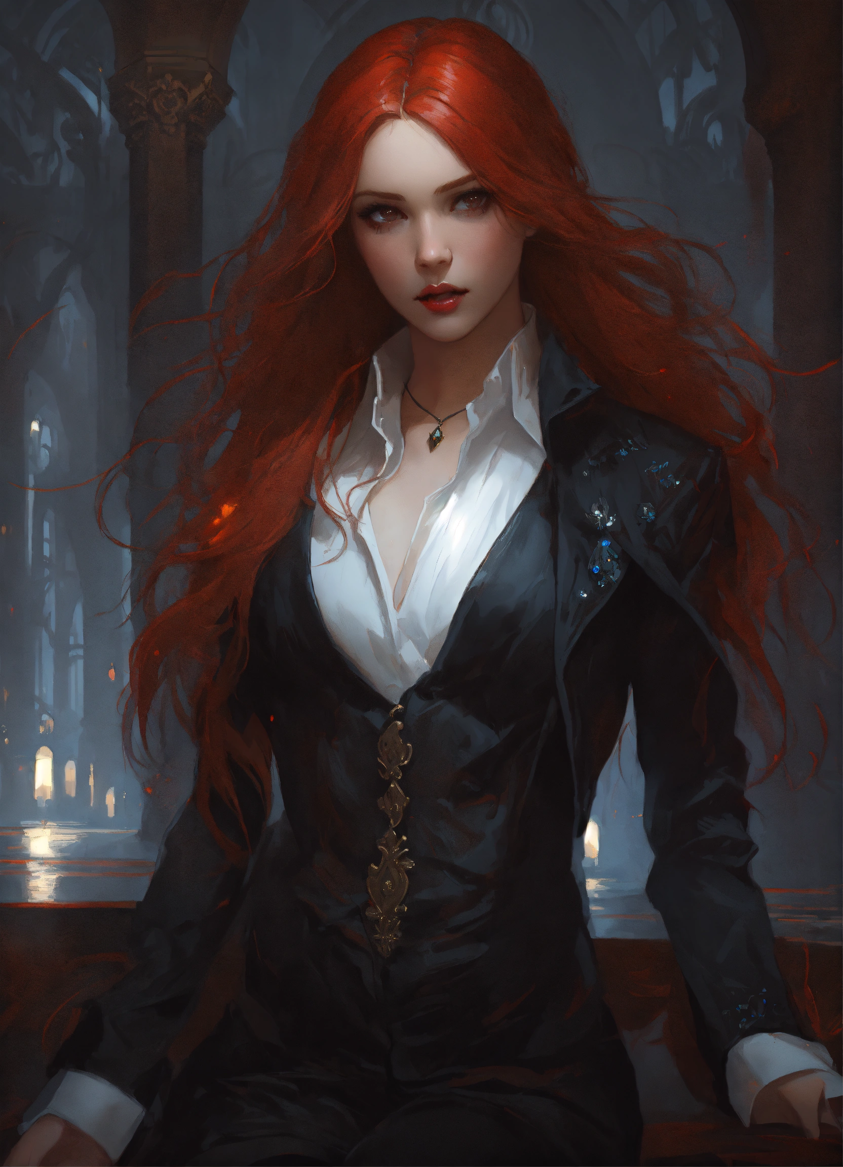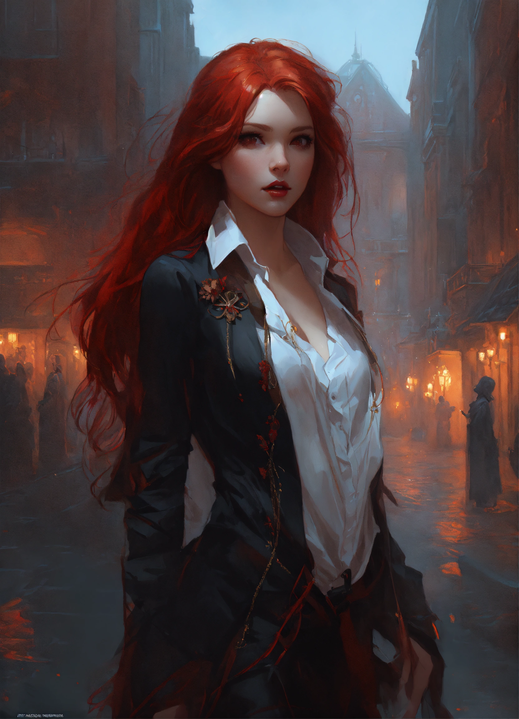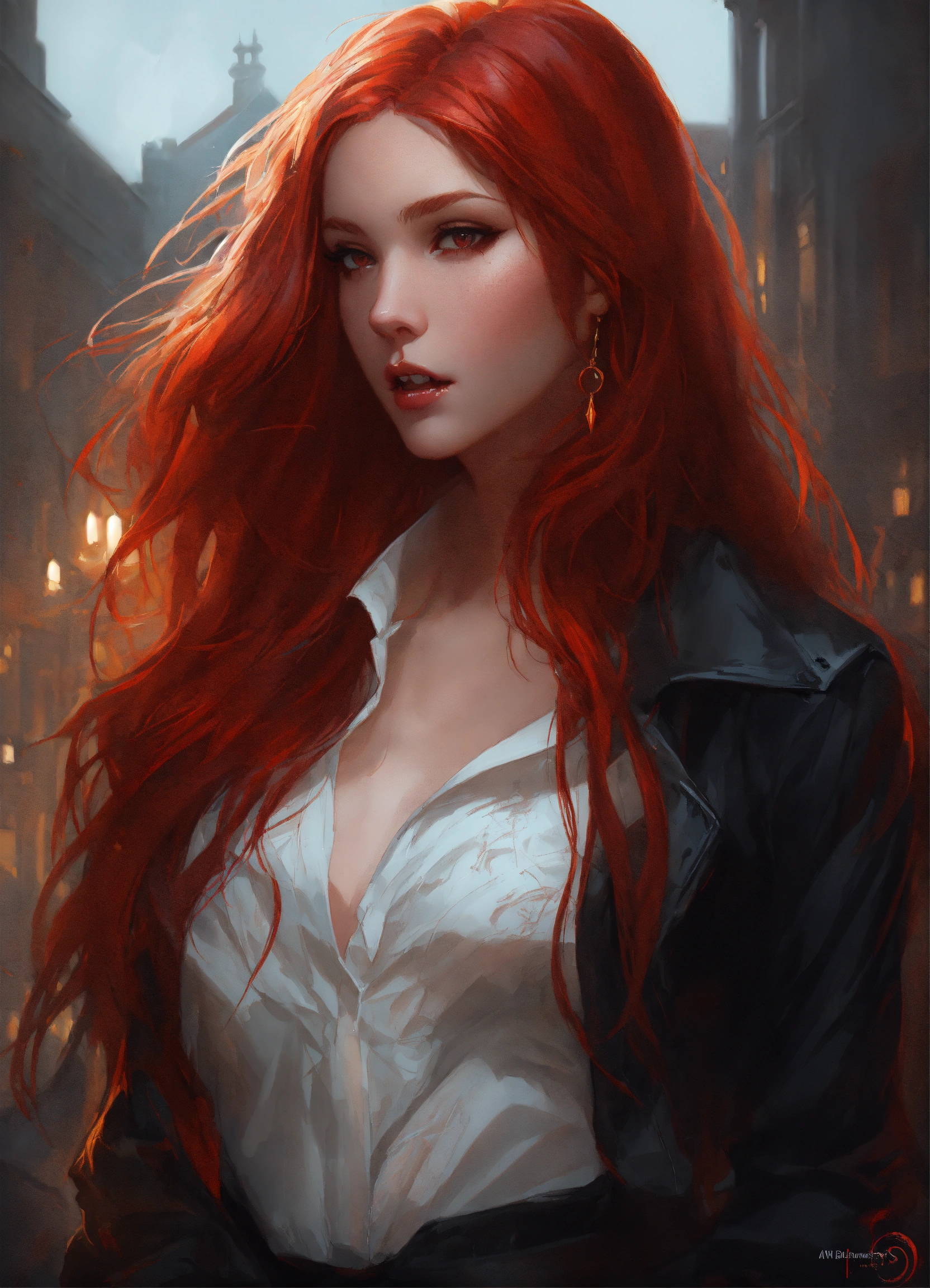 Beautiful, red hair, vampire, long hair, black jacket, white shirt, fantasy magic, dark pin-up style hair, dark light night, intricate, elegant, sharp focus, illustration, highly detailed, digital painting, concept art, matte, art by wlop and artgerm and greg rutkowski and alphonse mucha, masterpiece