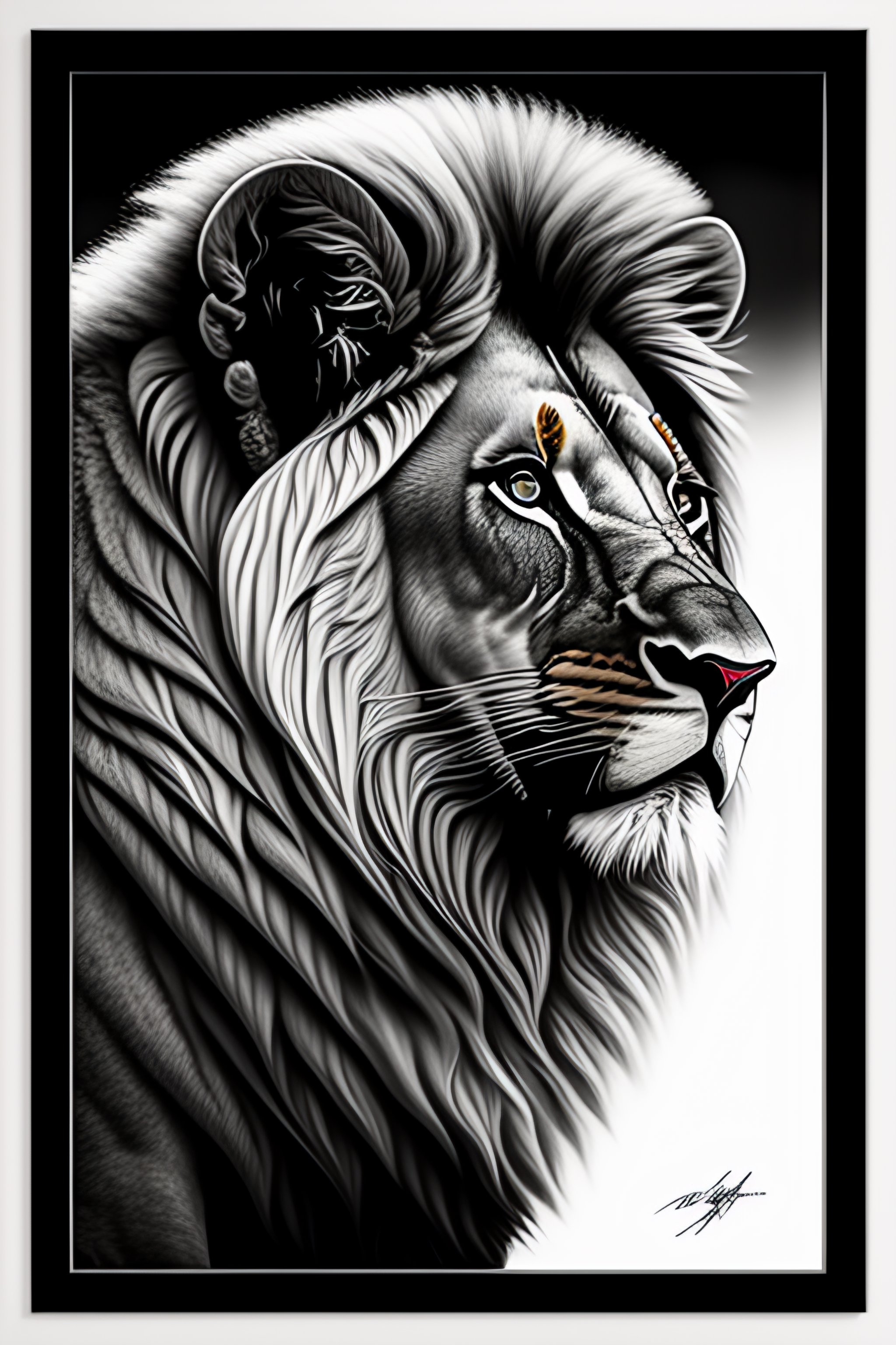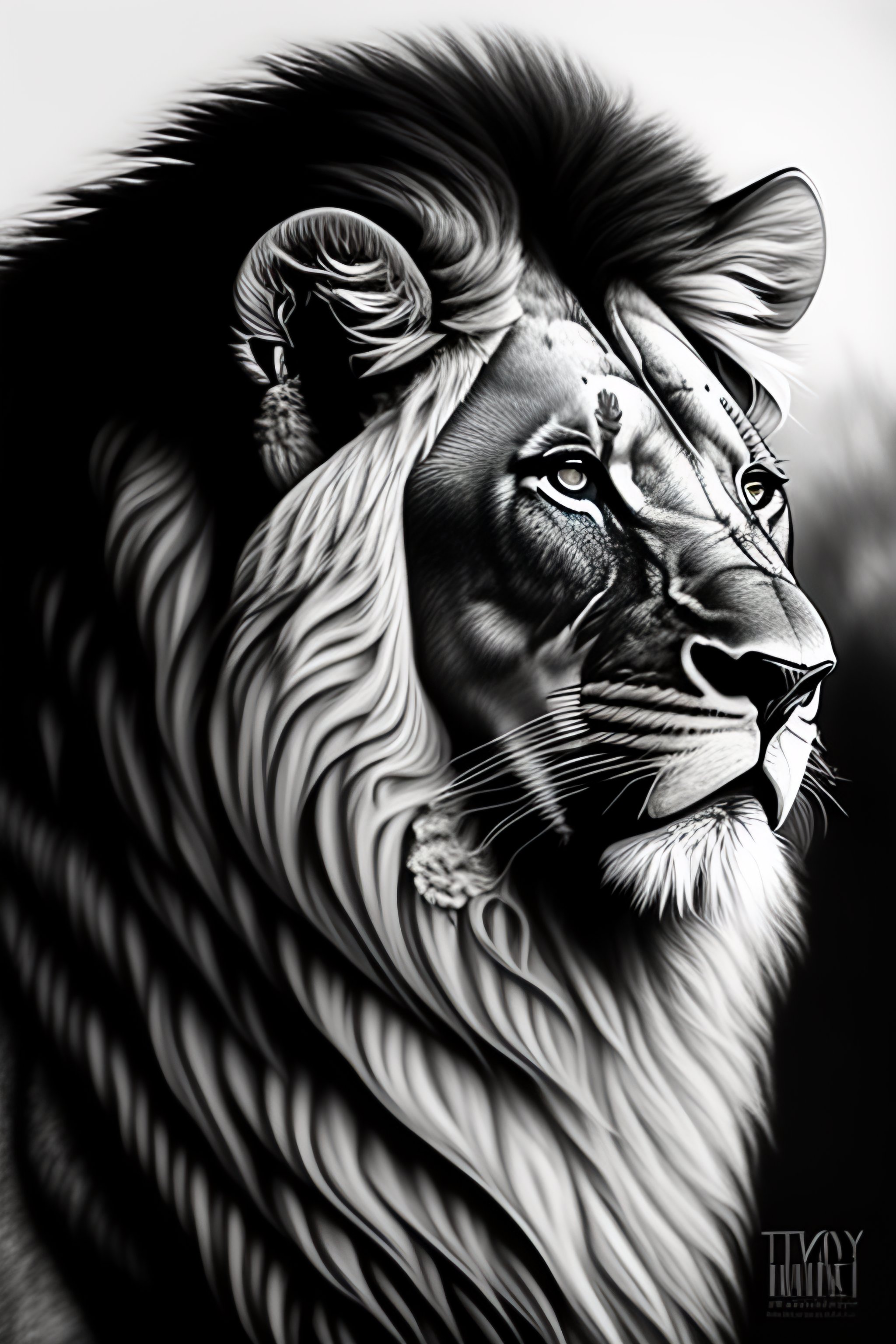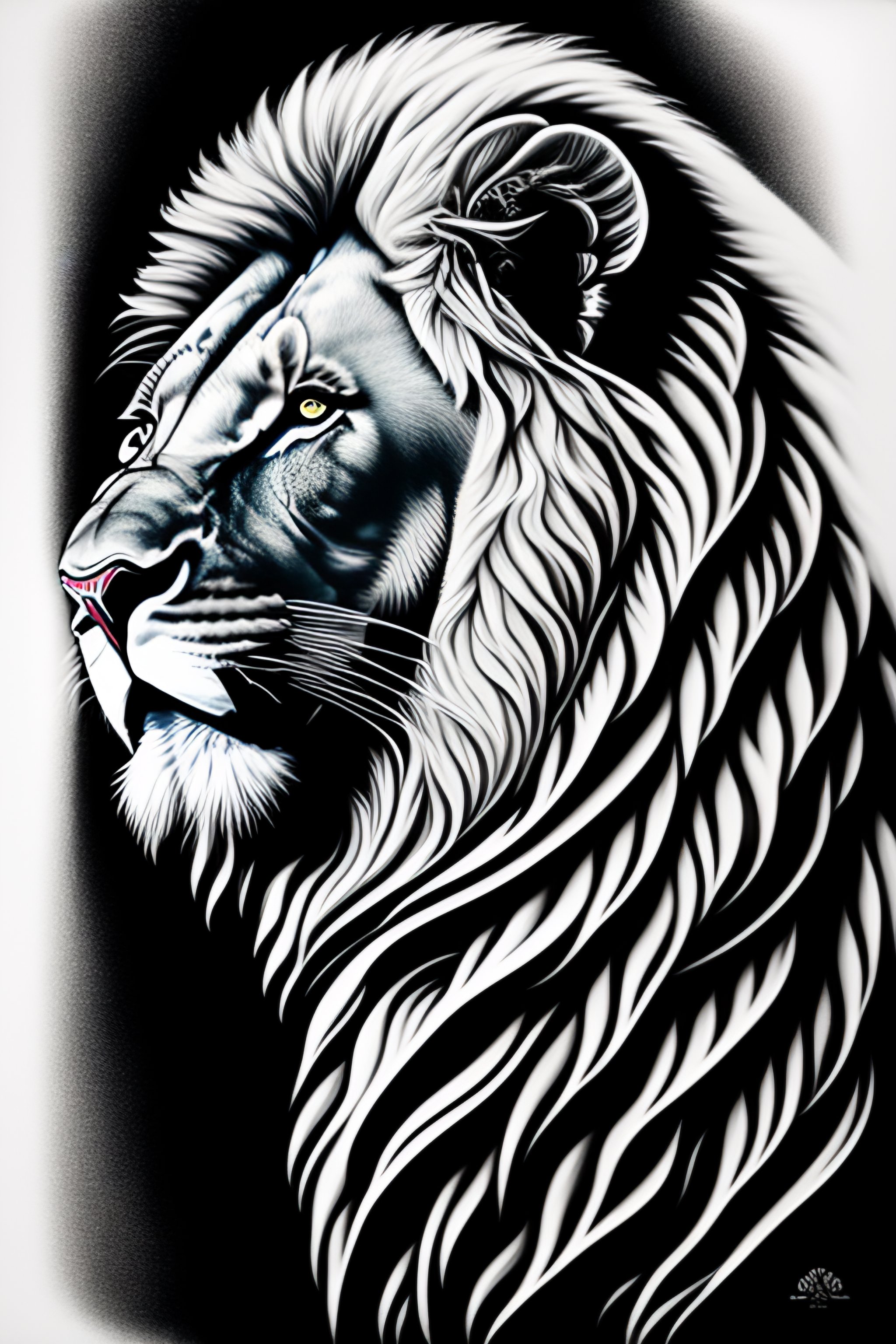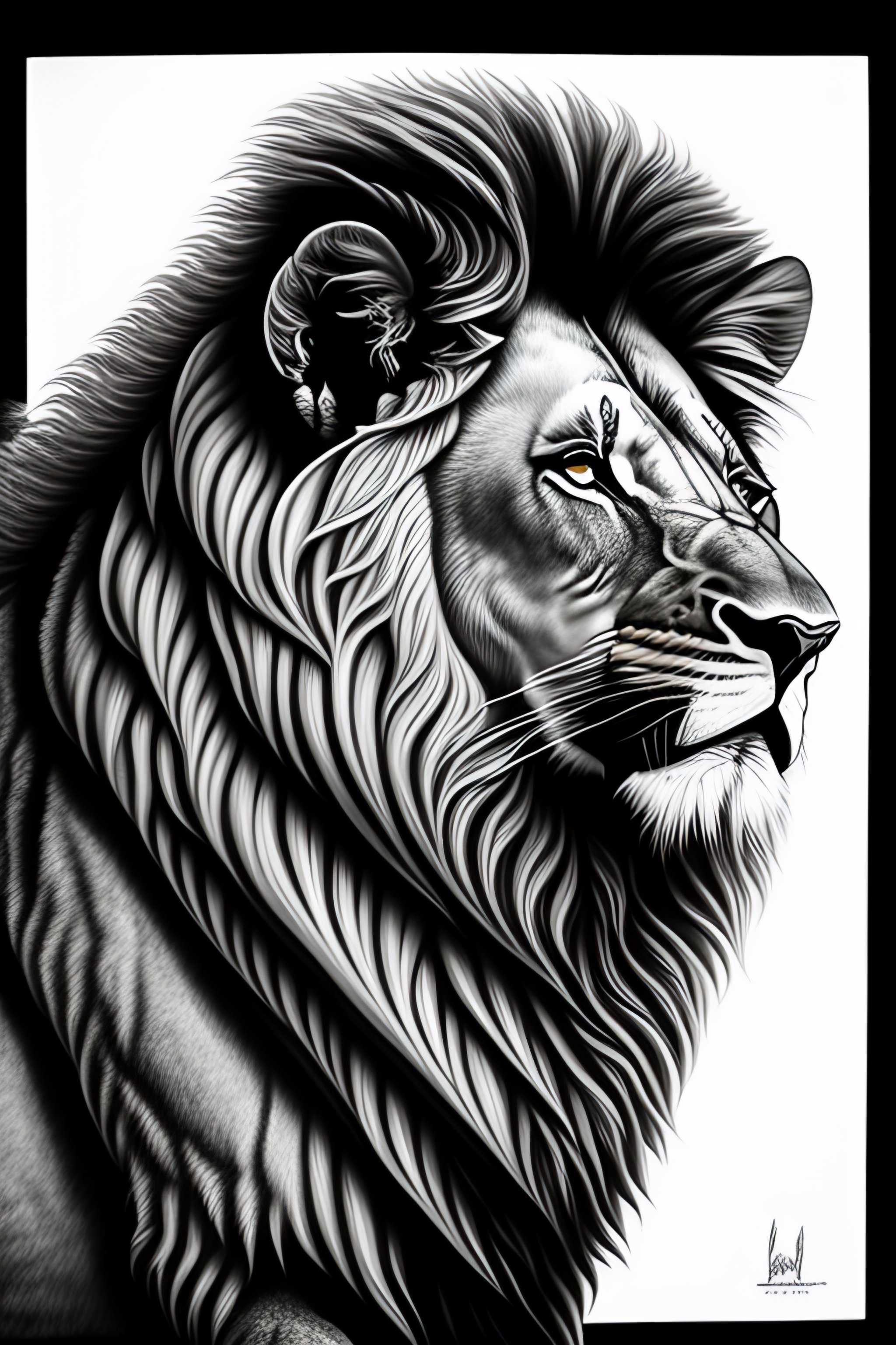 Symmetry, lion roaring, front view, black and white, white background. very detailed ink drawing, fine lineart