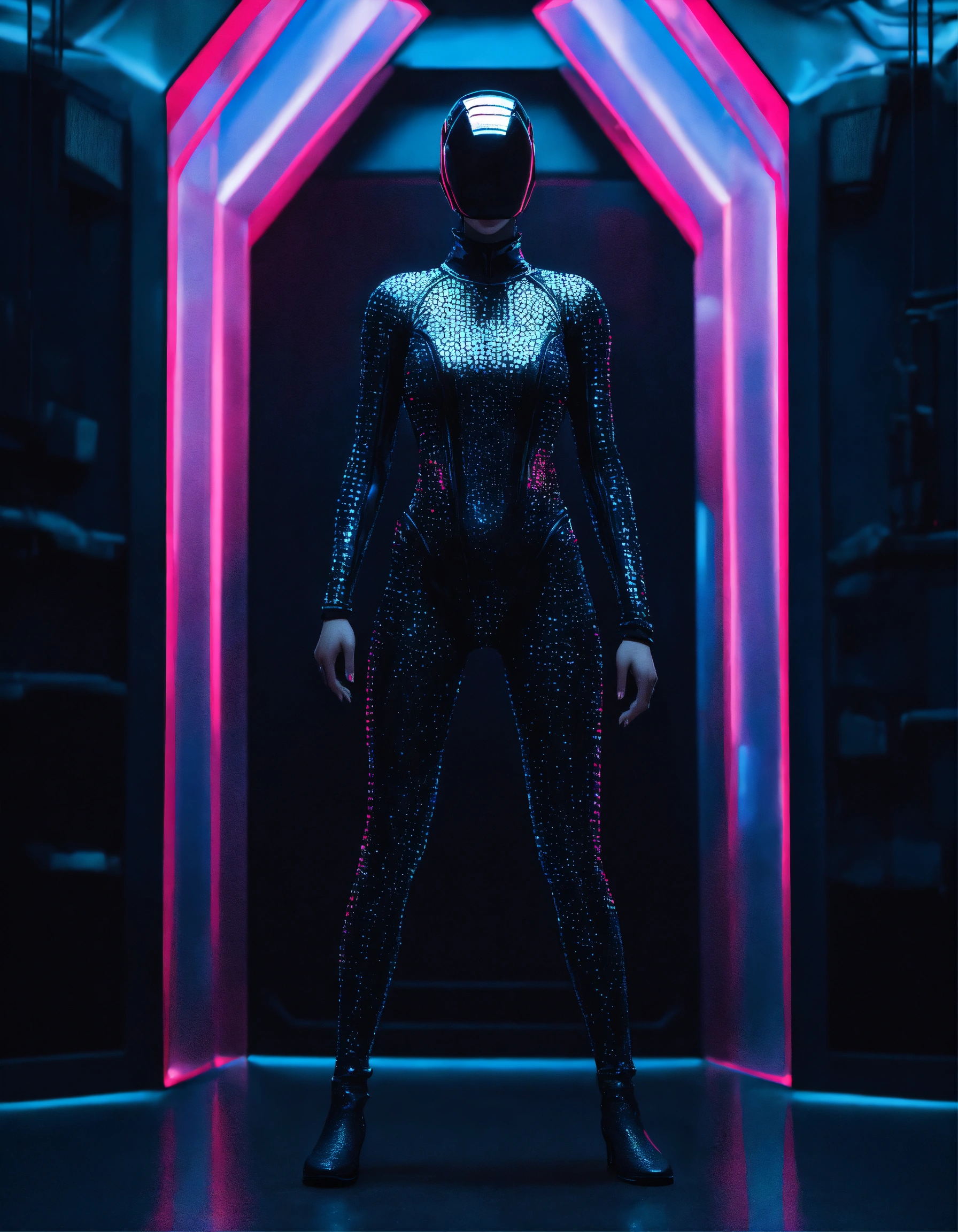 An ultrarealistic photograph of woman wearing a minimalist futuristic full body power suit, without lights, made of black mate metal and polymer, full crystal hull, for a fit woman, imposing, modern minimalism, elegant, dystopia, mysterious, godlike, scary, in a dark room, showing belly, showing thighs, 8k