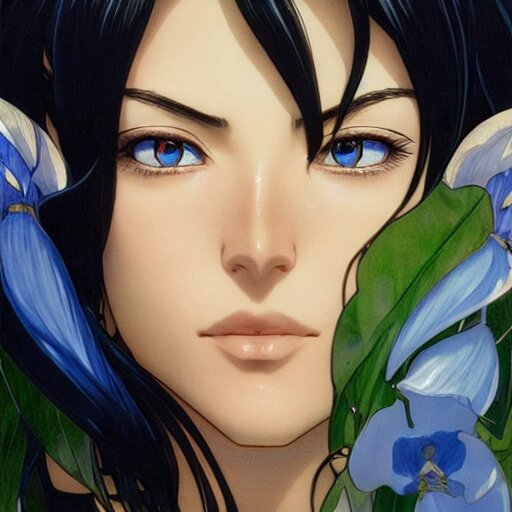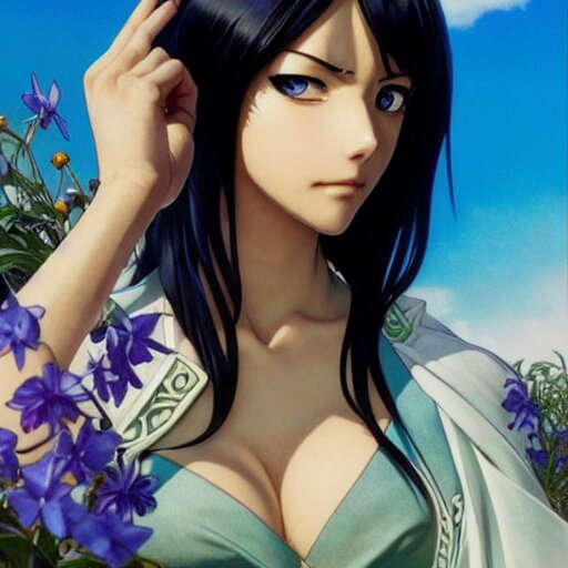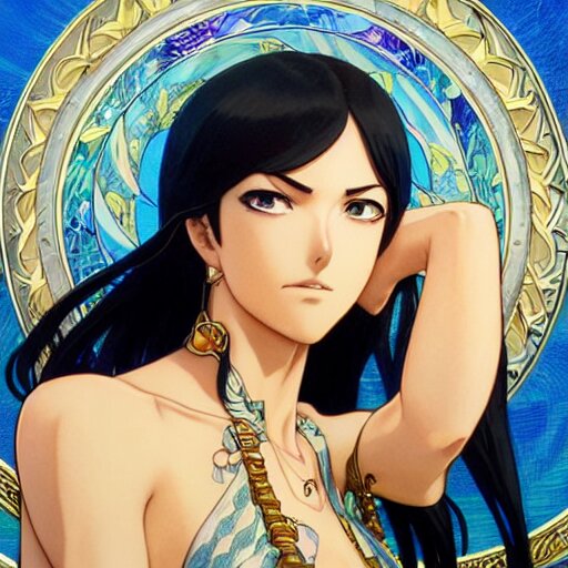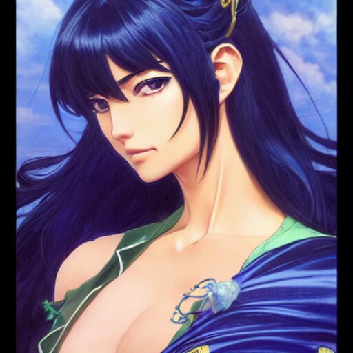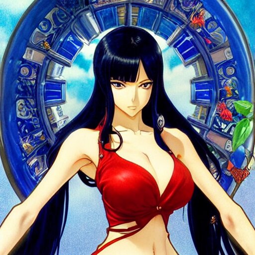 Highly detailed vfx portrait of nico robin by eiichiro oda!, makoto shinkai, alphonse mucha, sharp focus, art by artgerm and greg rutkowski!, harsh overhead sunlight, blue eyes!!, large aquiline nose!!, stanley kybric, kaoru mori, intricately detailed