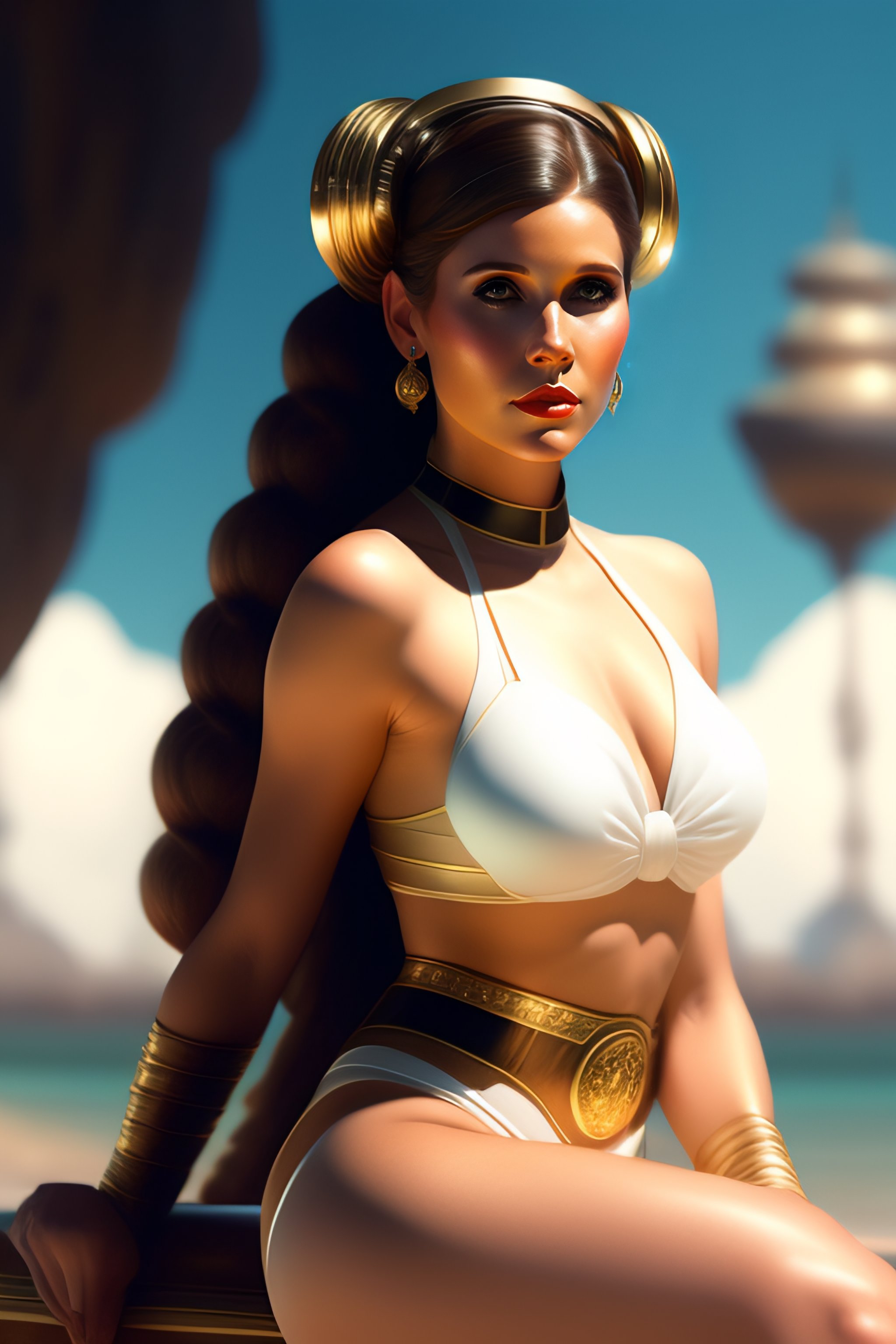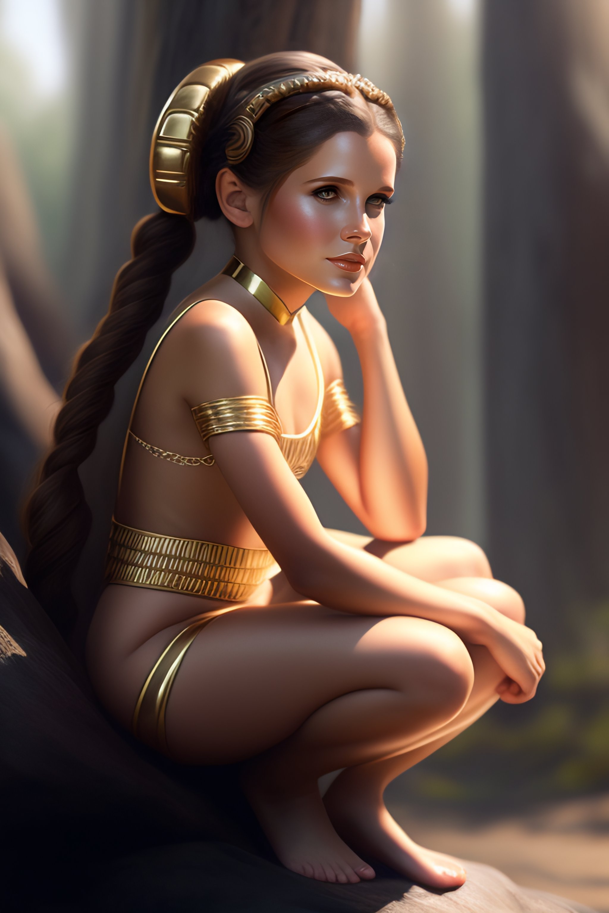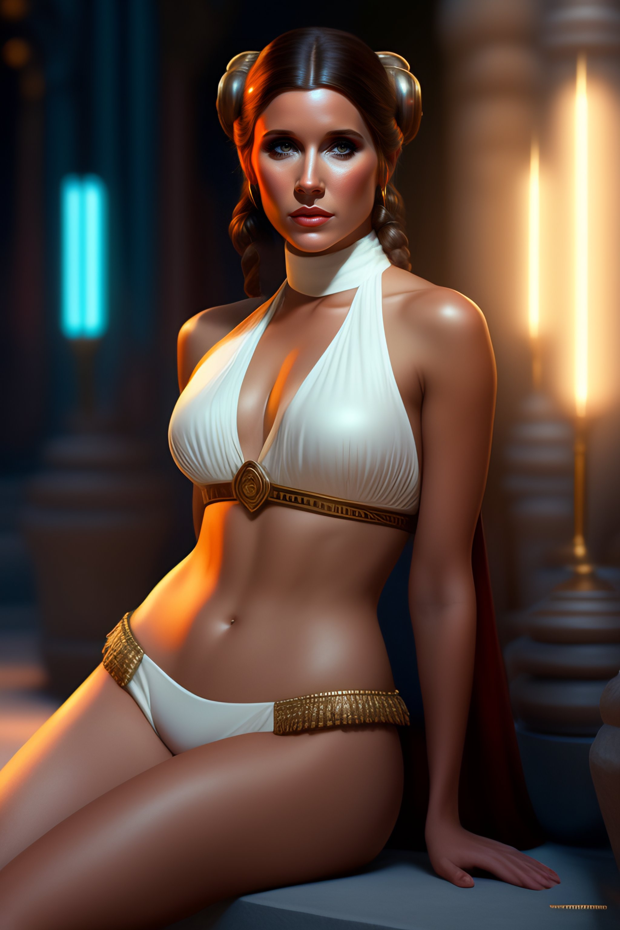 Mini bikini, sitting on a stick, full length, legs, feet, young carrie fisher as princess leia, anatomy, bathed in light, highly detailed, photorealistic, artstation, smooth, sharp focus, illustration, unreal engine 5, 8 k, art by artgerm and greg rutkowski and edgar maxence