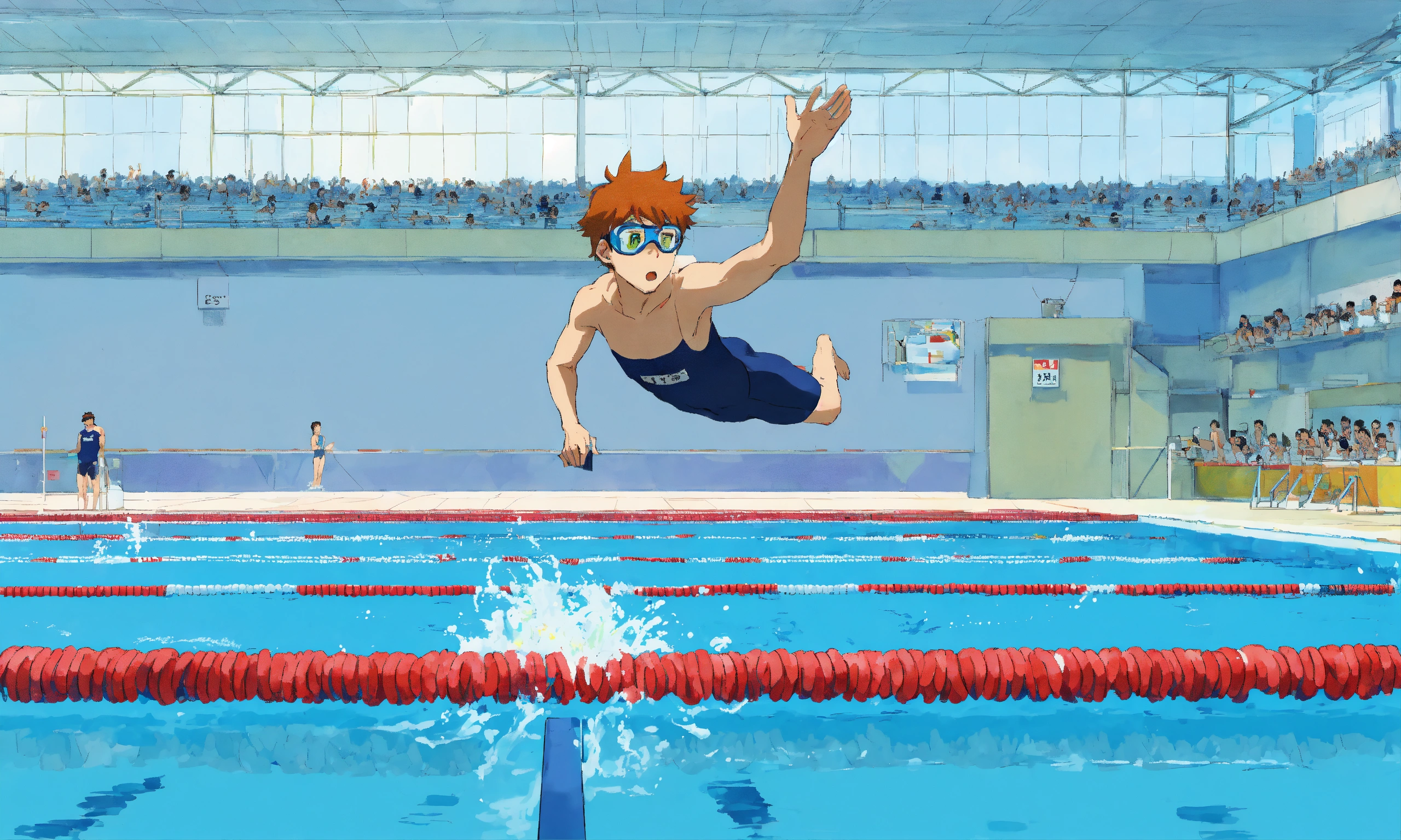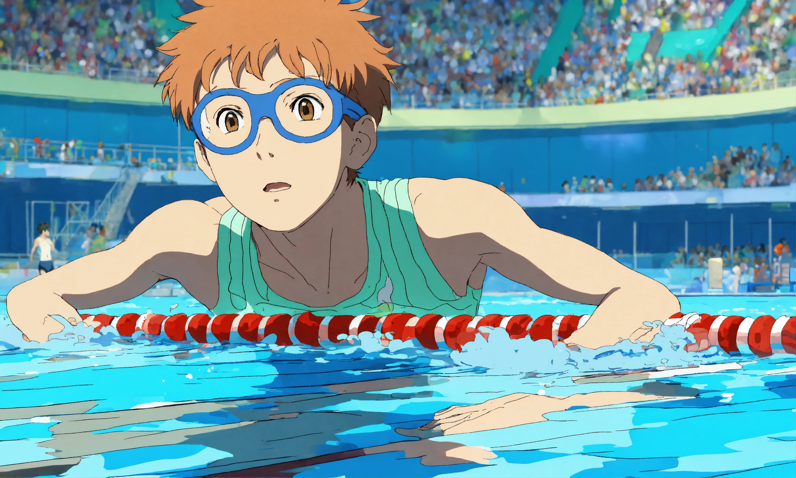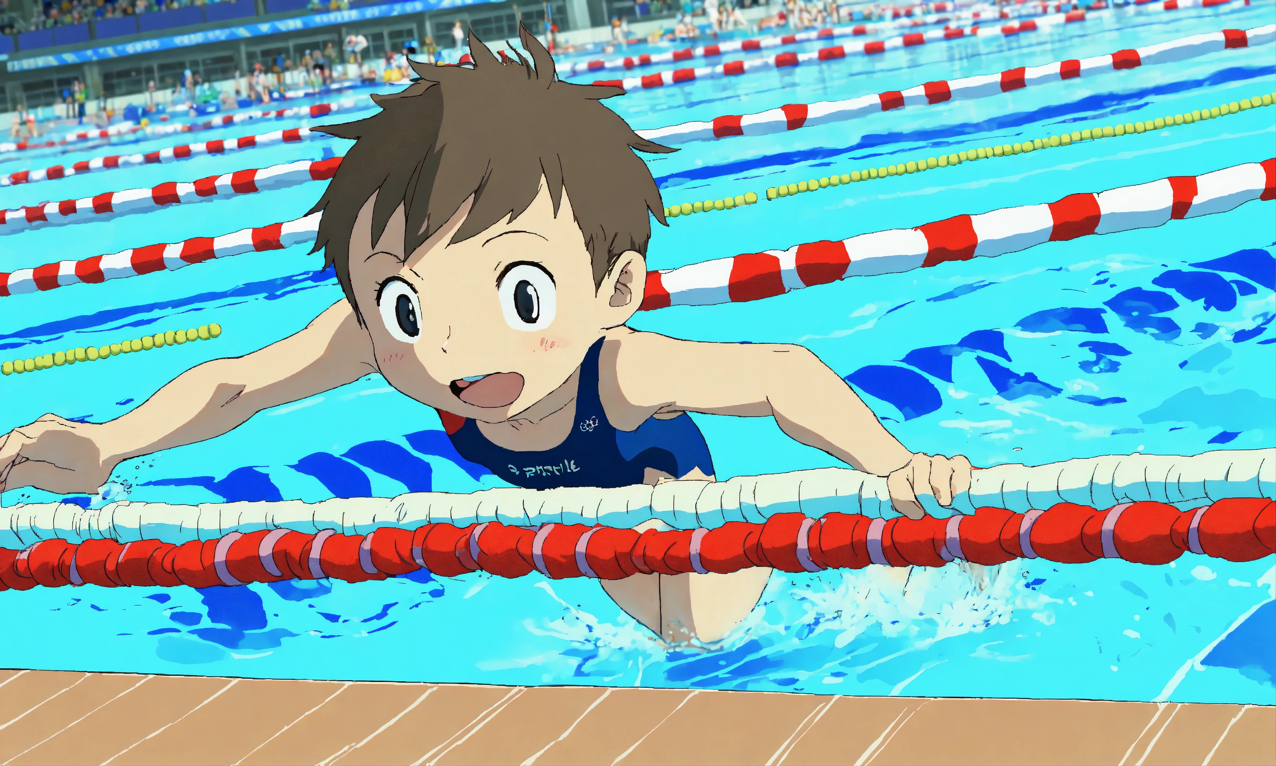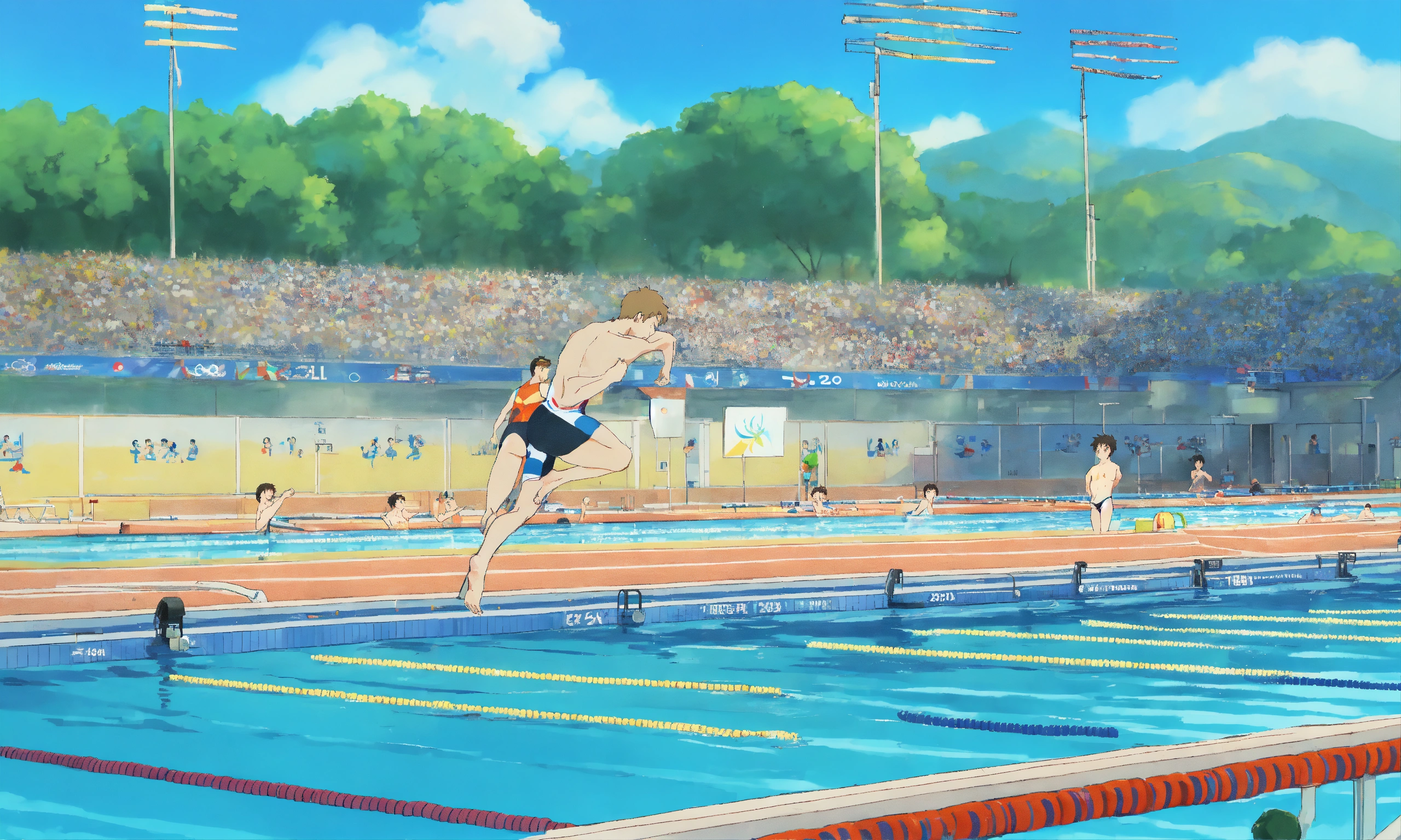 Michale phelps swimming in an olympic swimming competition; detailed, minimalistic, childish, anime, by hayao miyazaki, ghibli