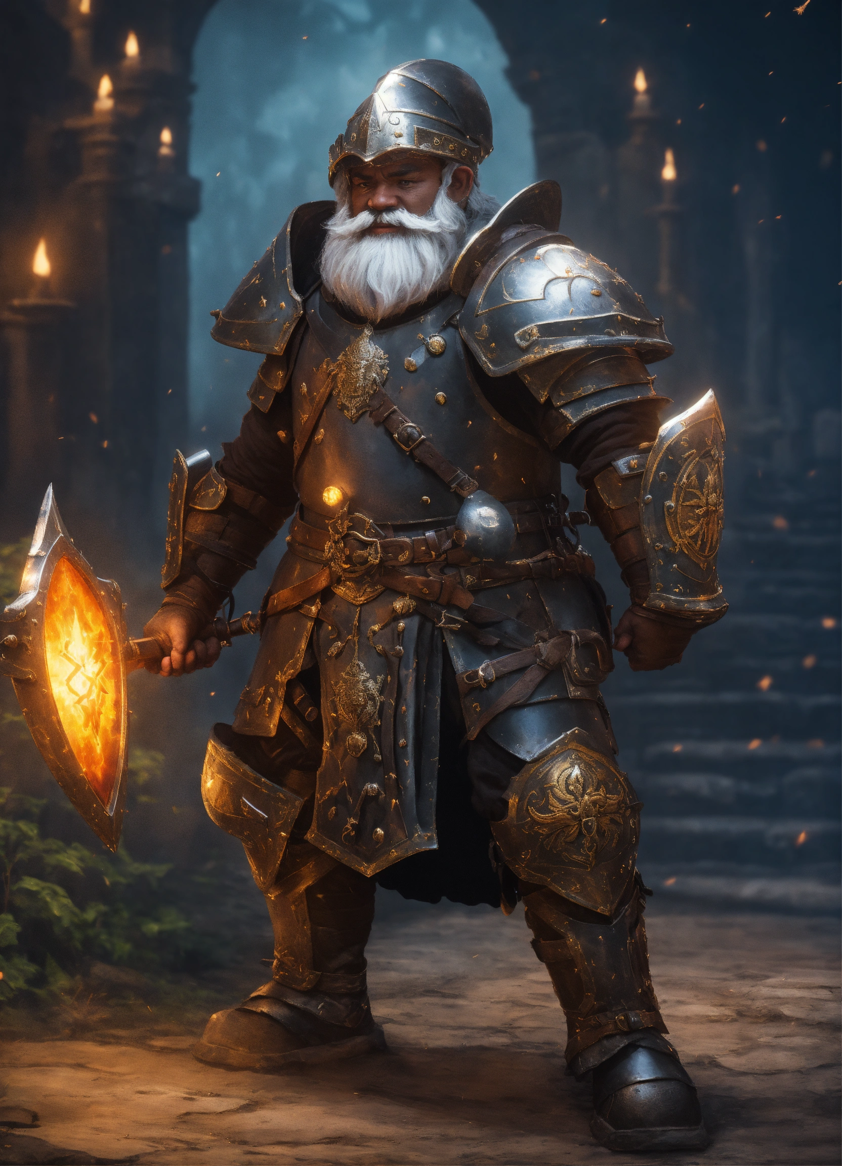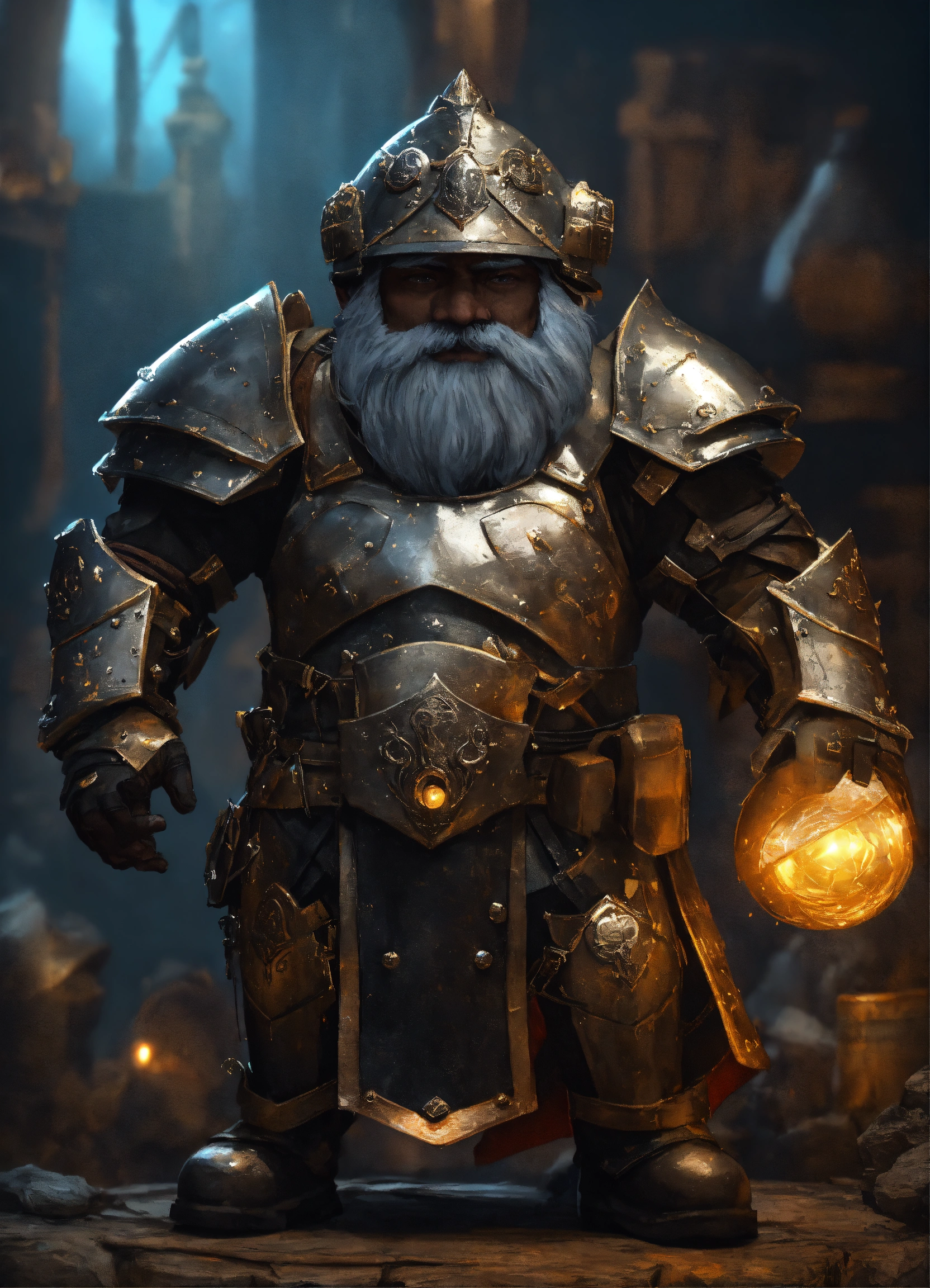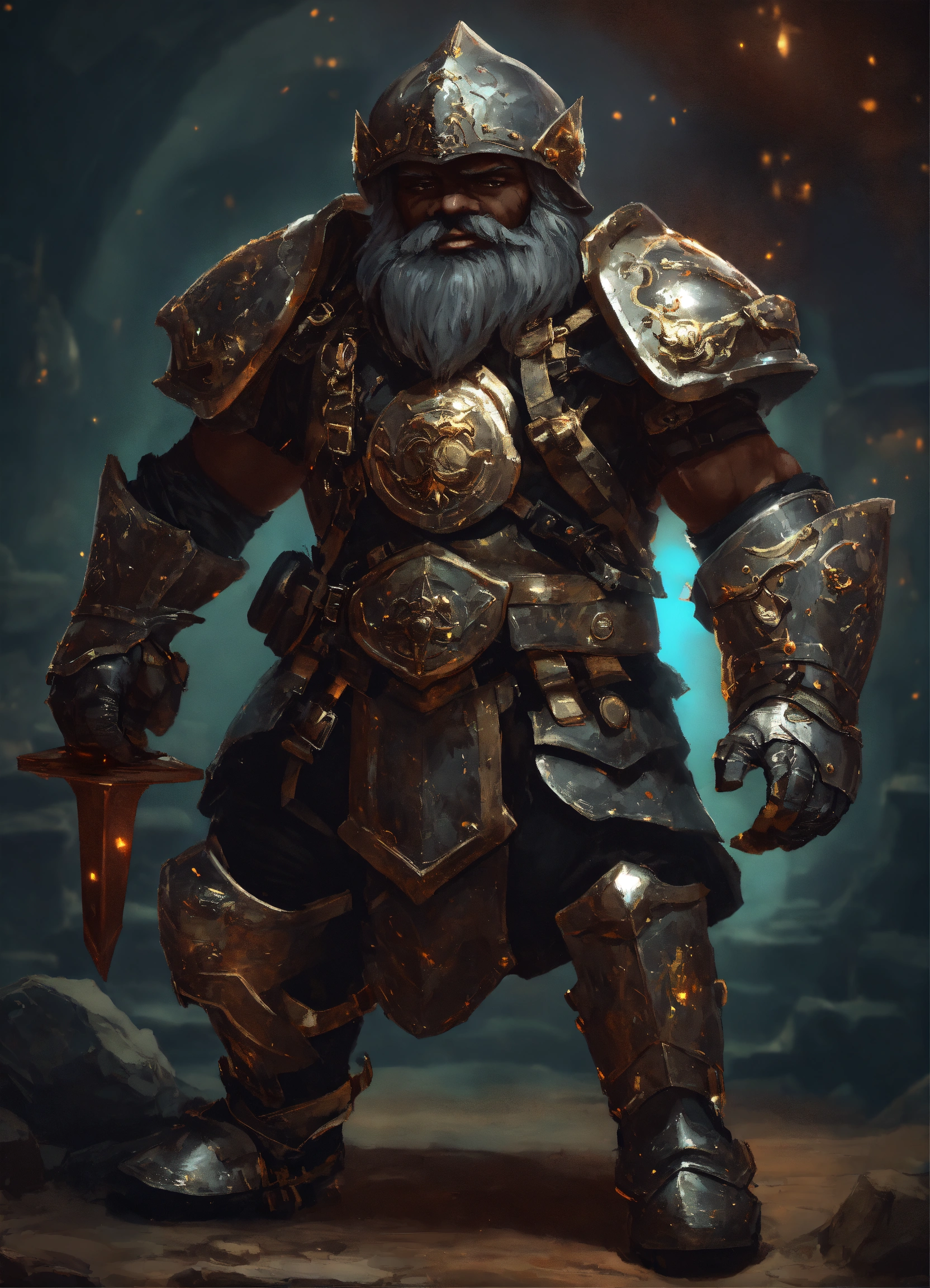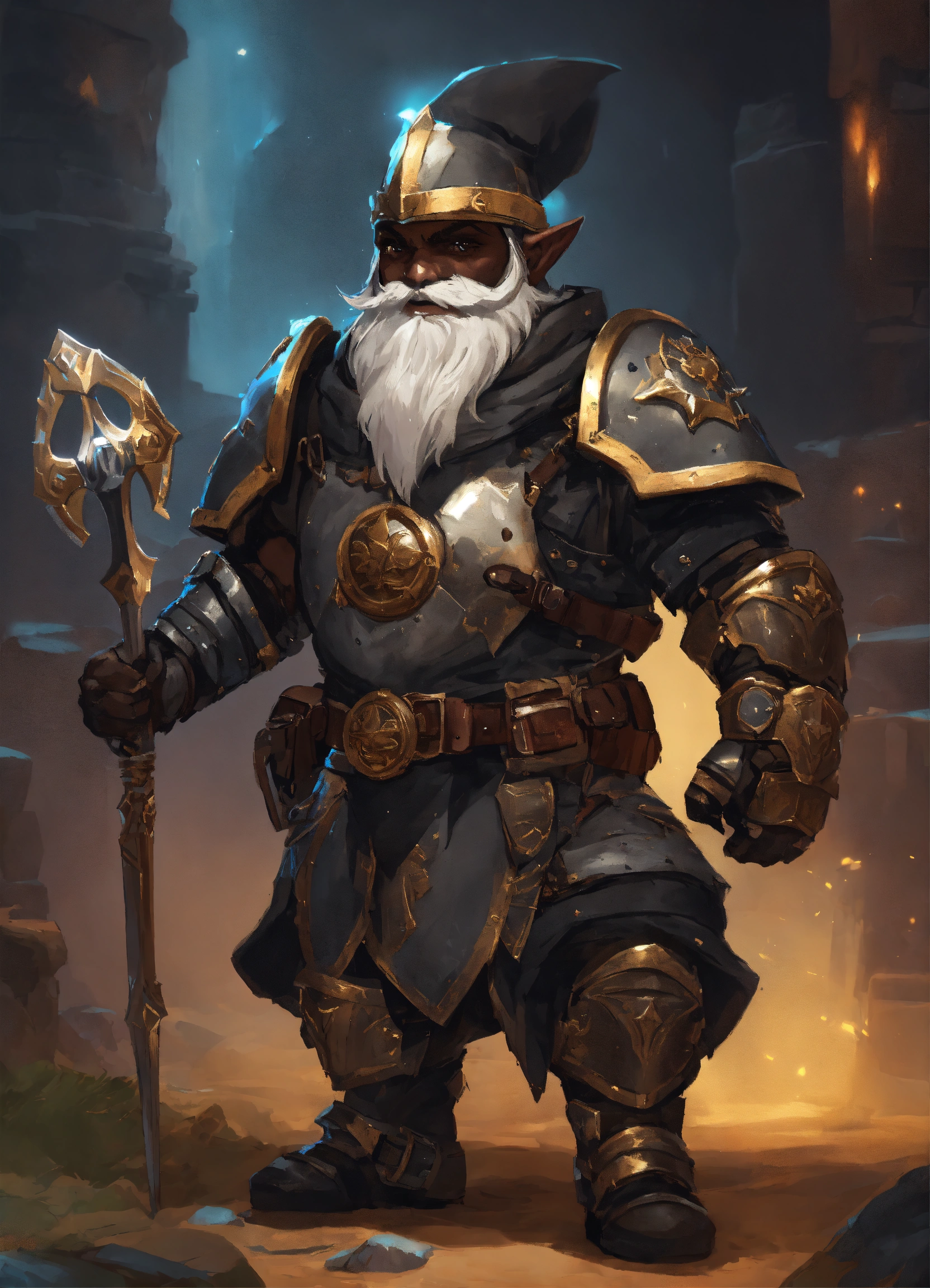 Armorer artificer rock gnome with black skin, on a heavy dark magical homemade armor, magic pulsing through the armor, wearing black medieval visor on a helmet, combat breastplate, heavy armor like a medieval exoskeleton, empty handed with electric gauntlets, boxer pose