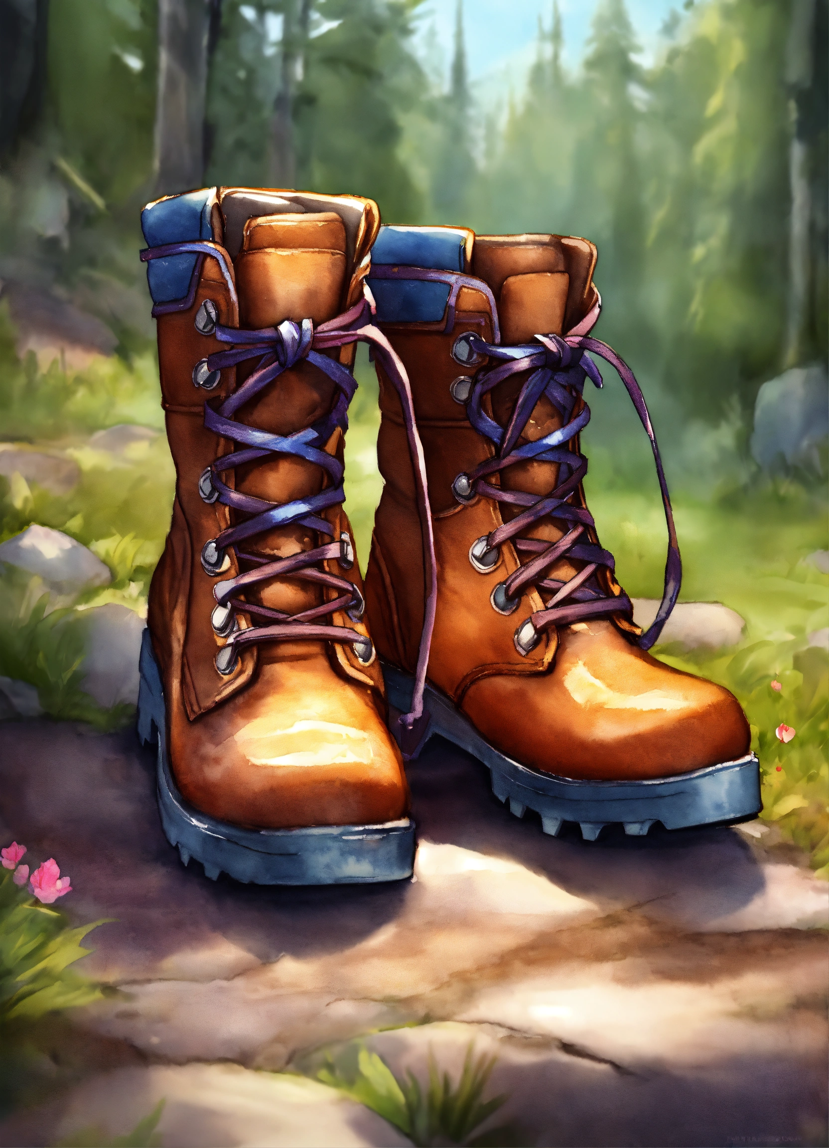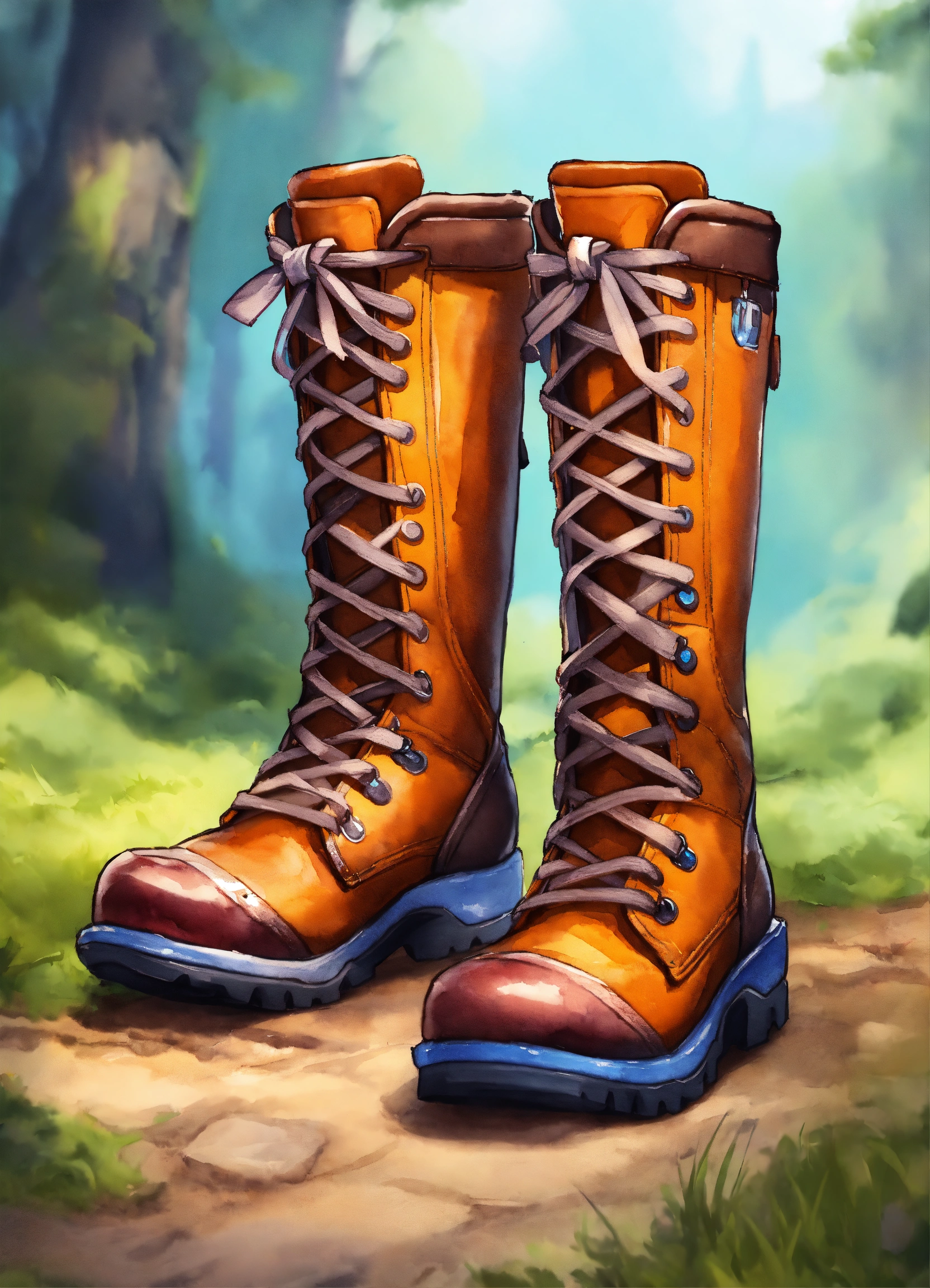 Sturdy hiking boots, item image, game icon, fantasy style, digital drawing, artstation, watercolor illustration