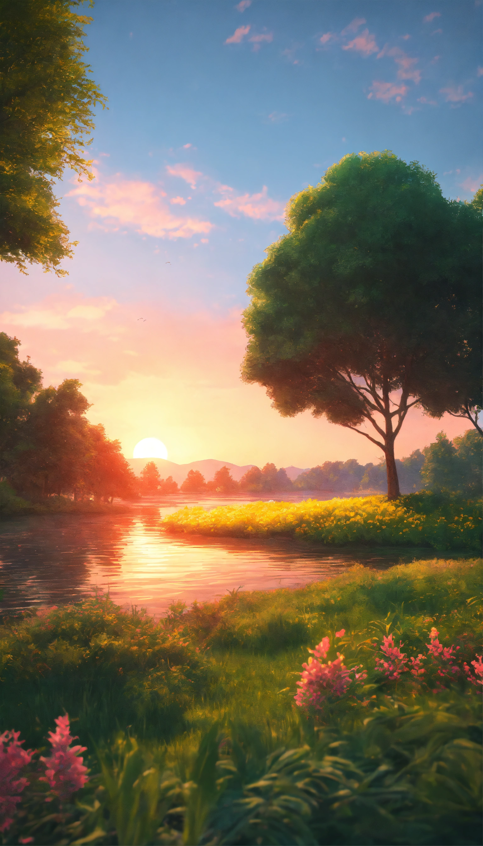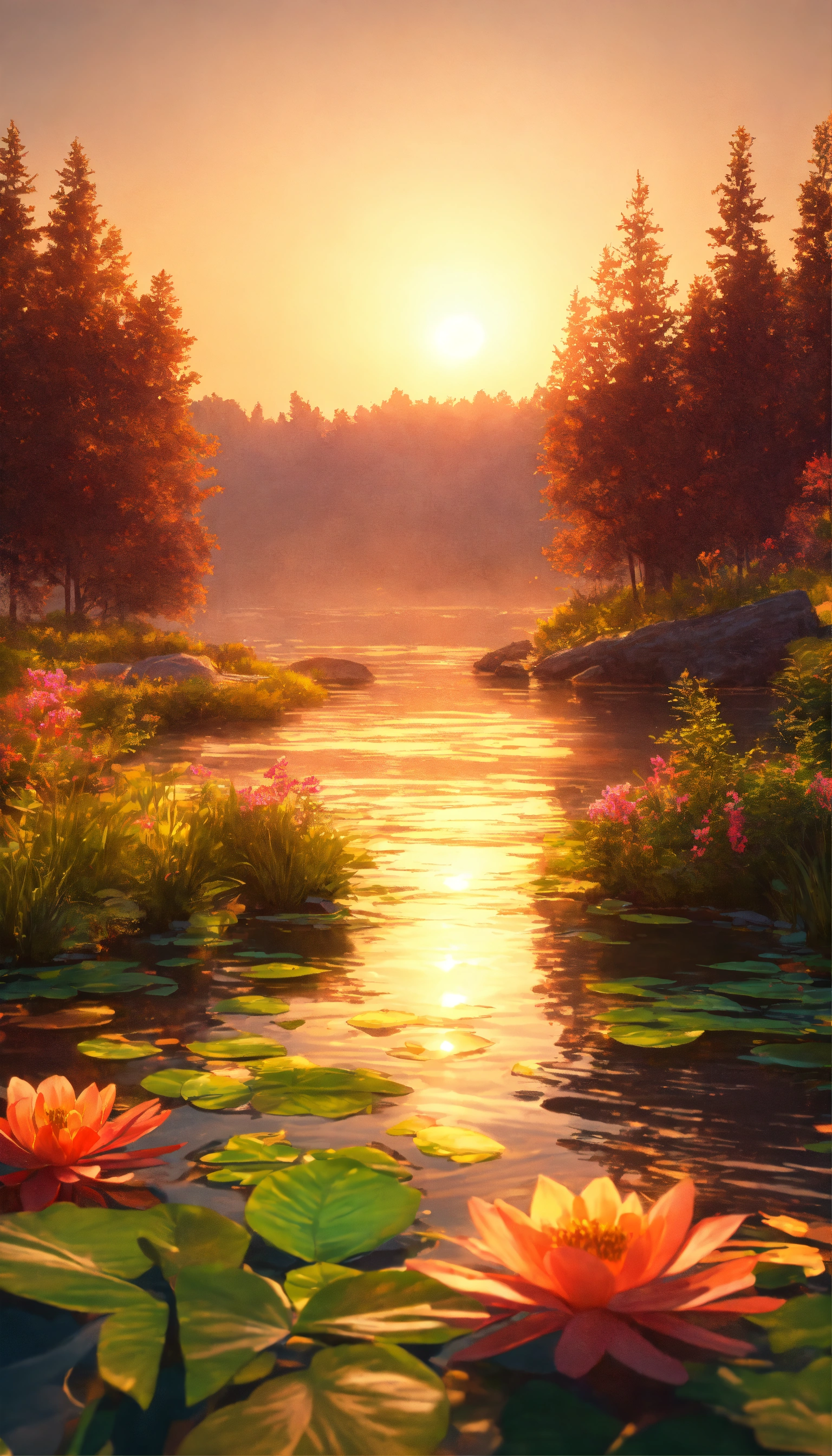 Illustrate a serene peaceful nature scene in summer. this scene inspires peace, awe, and tranquility. vivid beautiful colors. photorealistic 8k