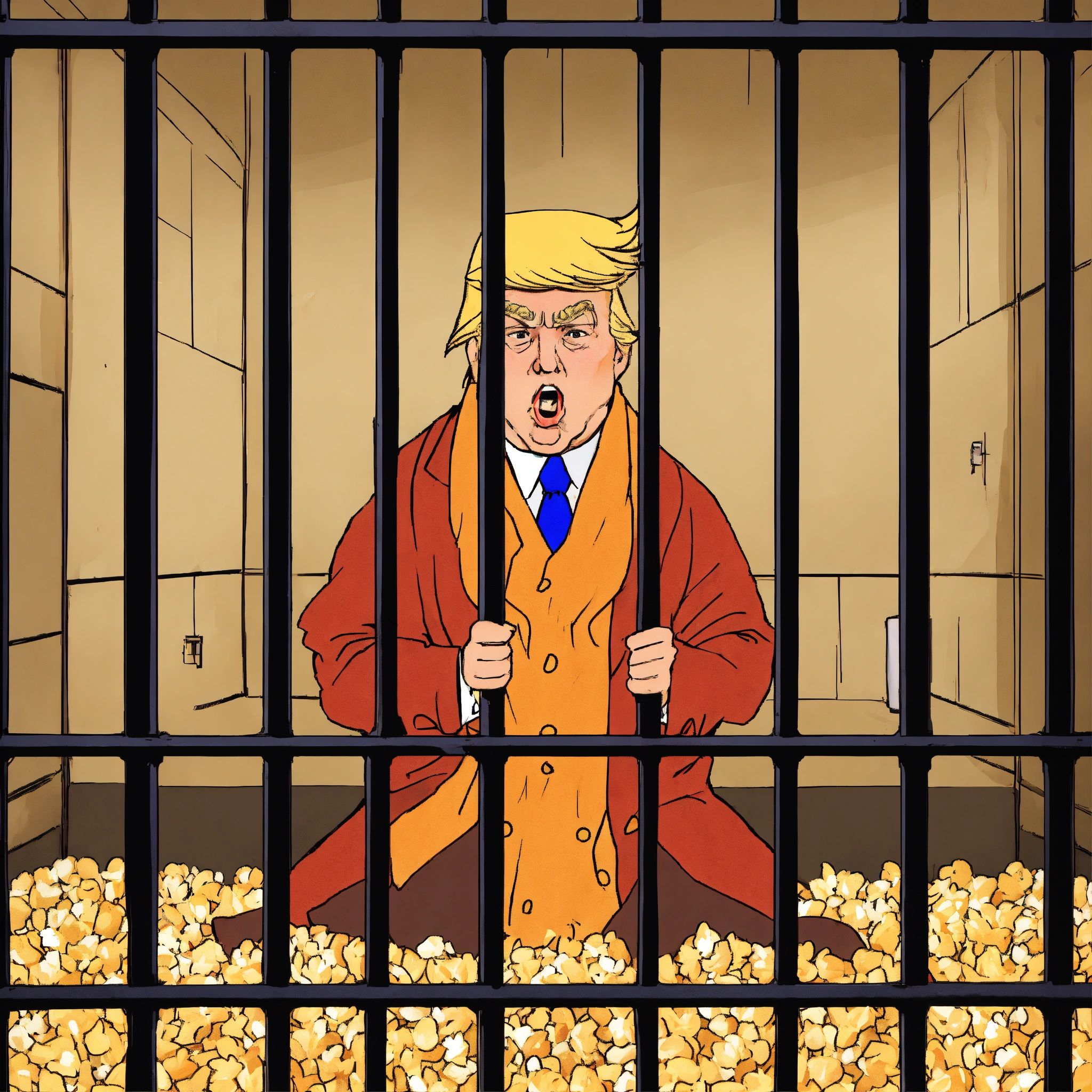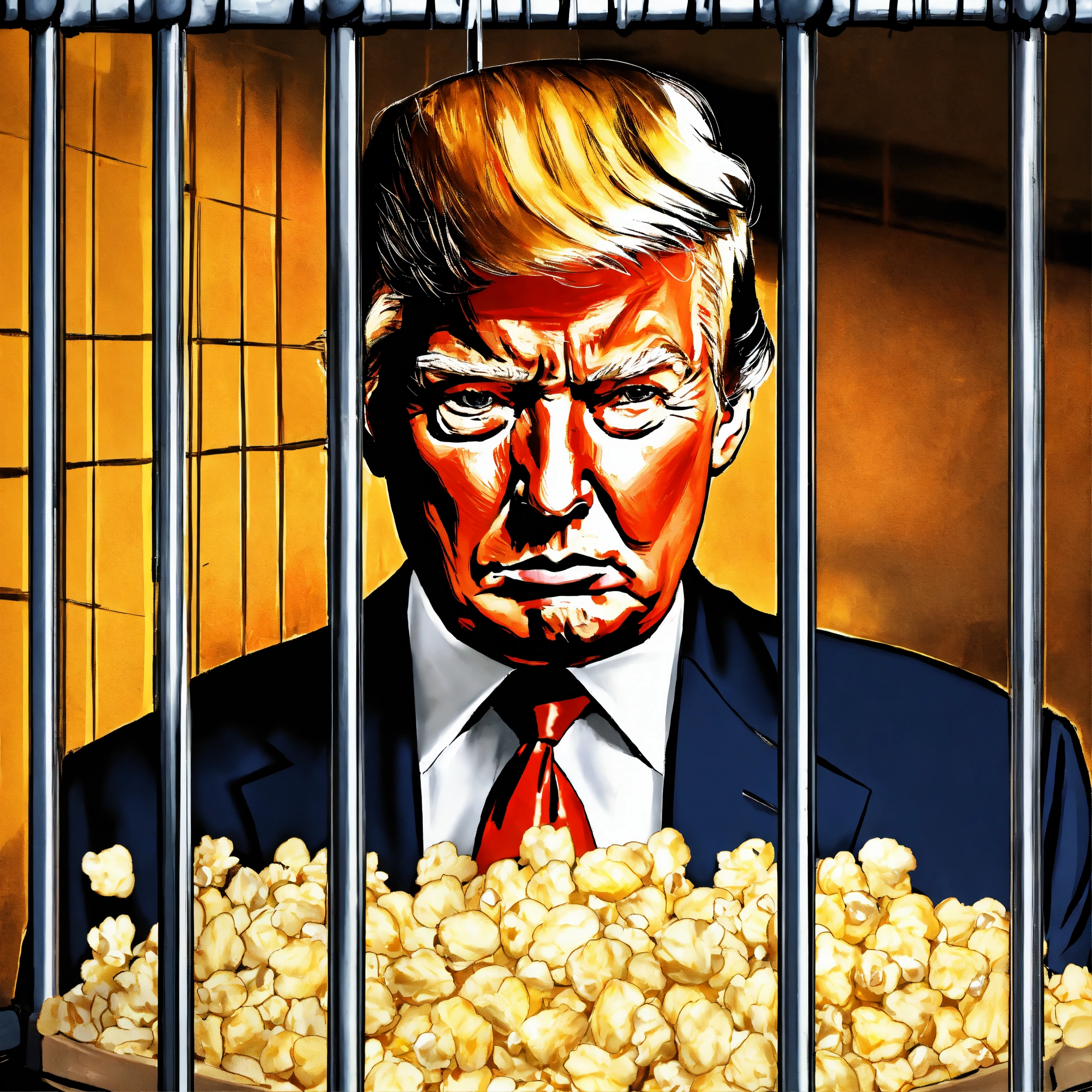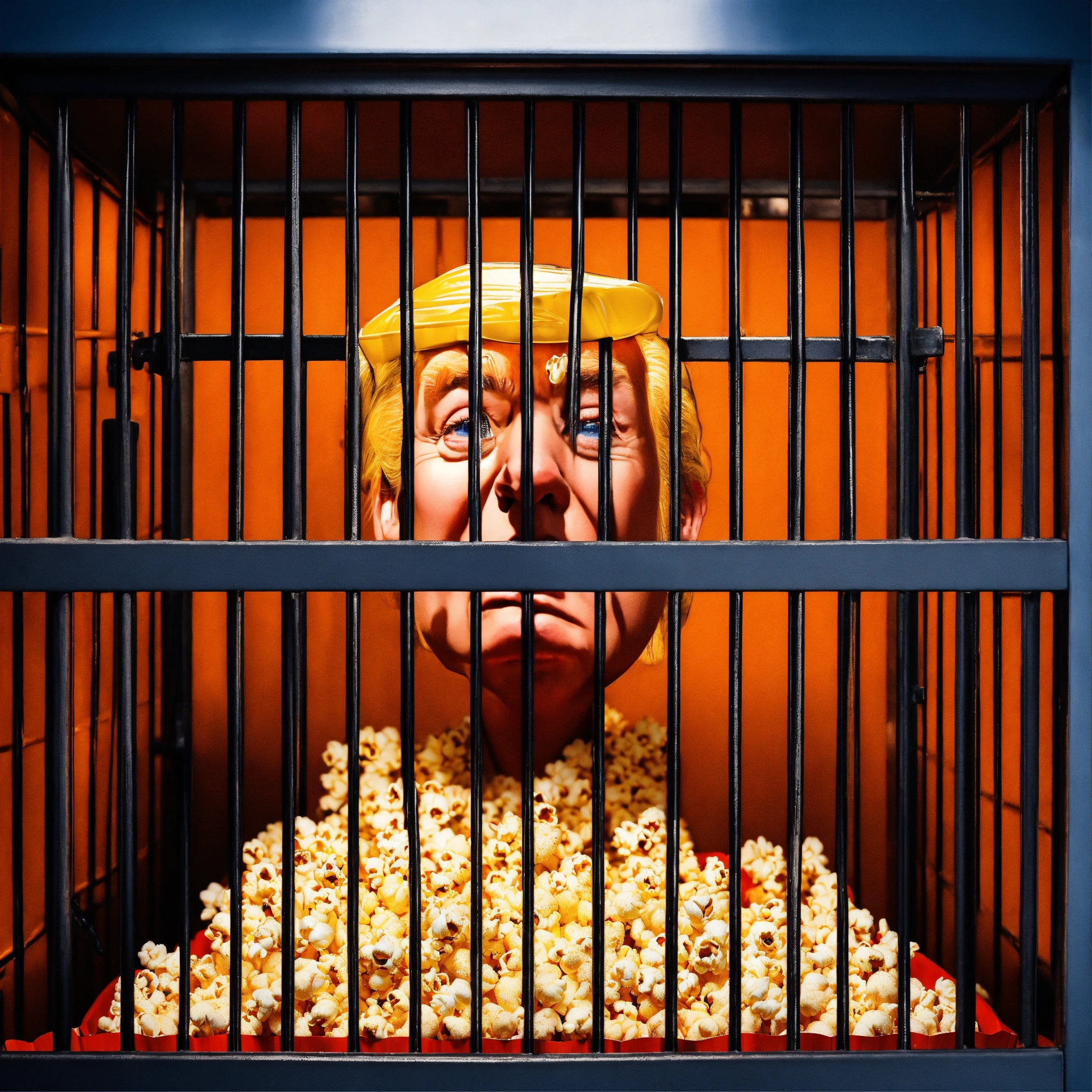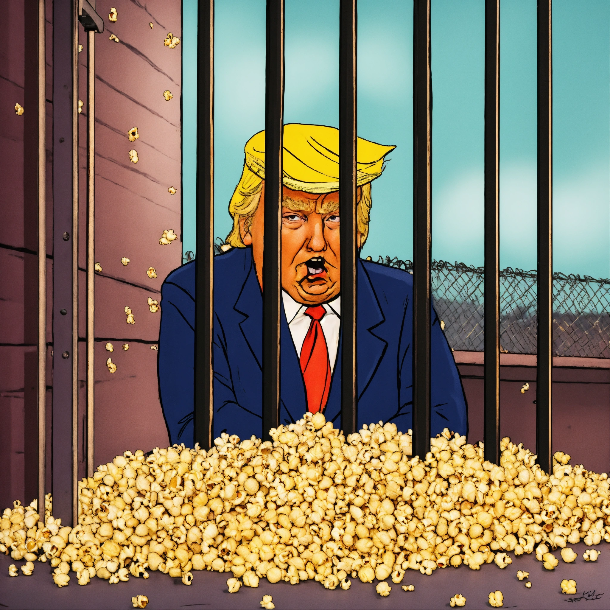 "sad donald trump behind bars" in jail cell "full of popcorn" "people outside jail cell mocking him"