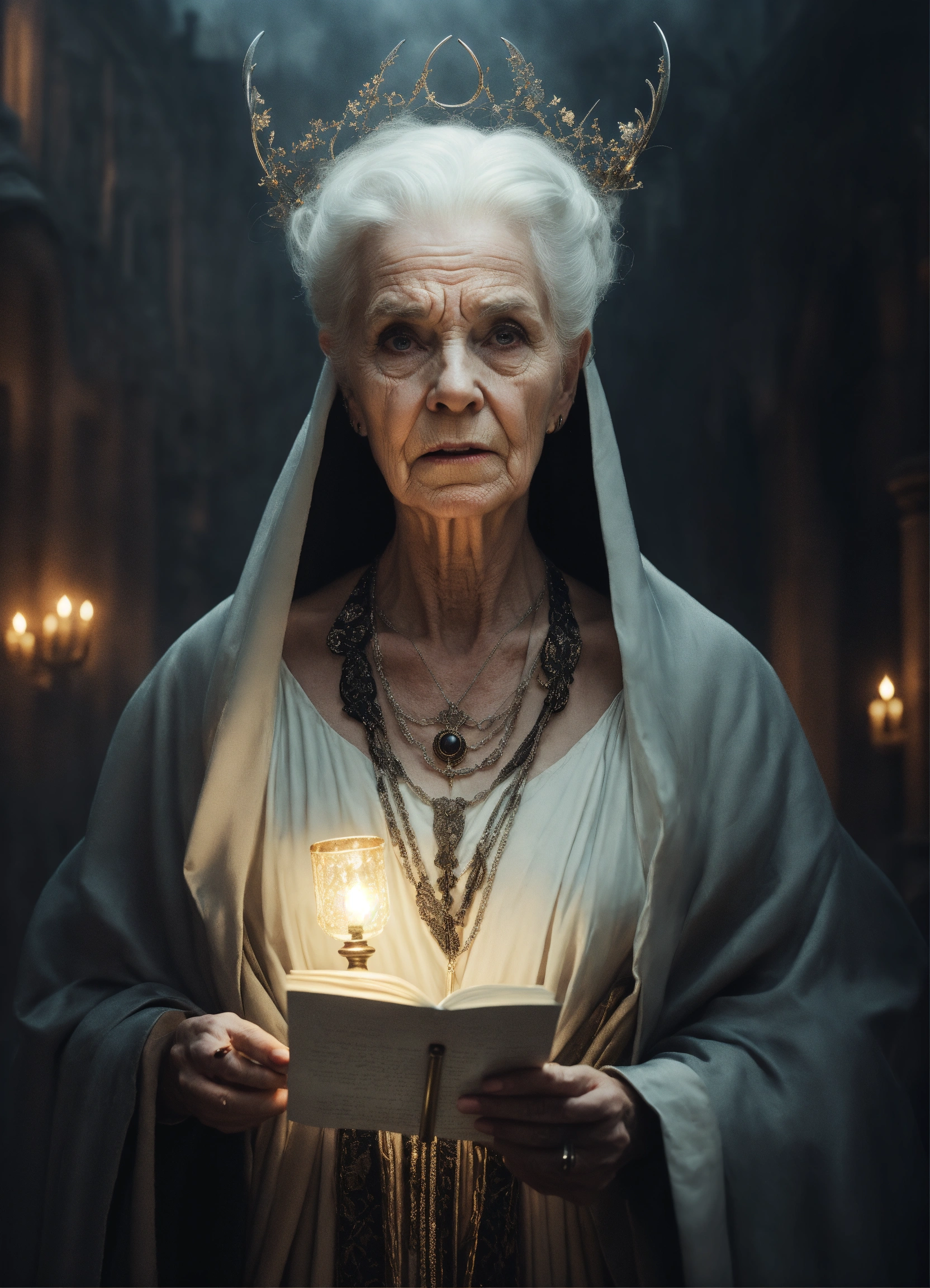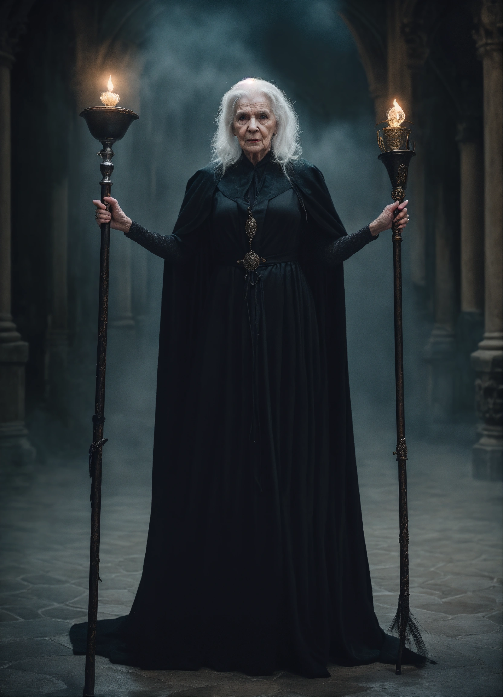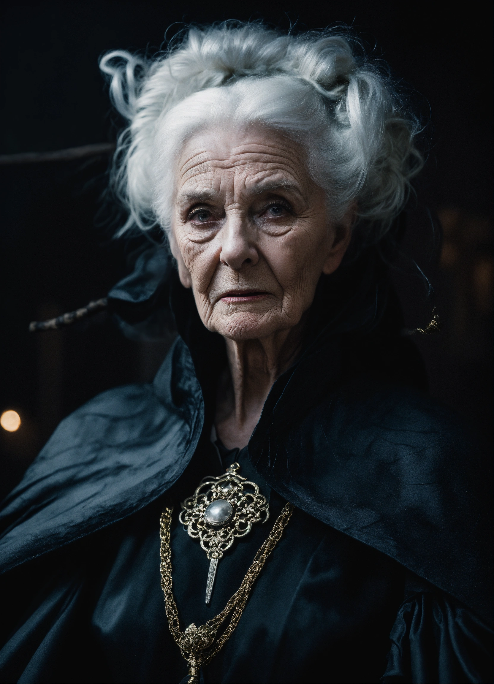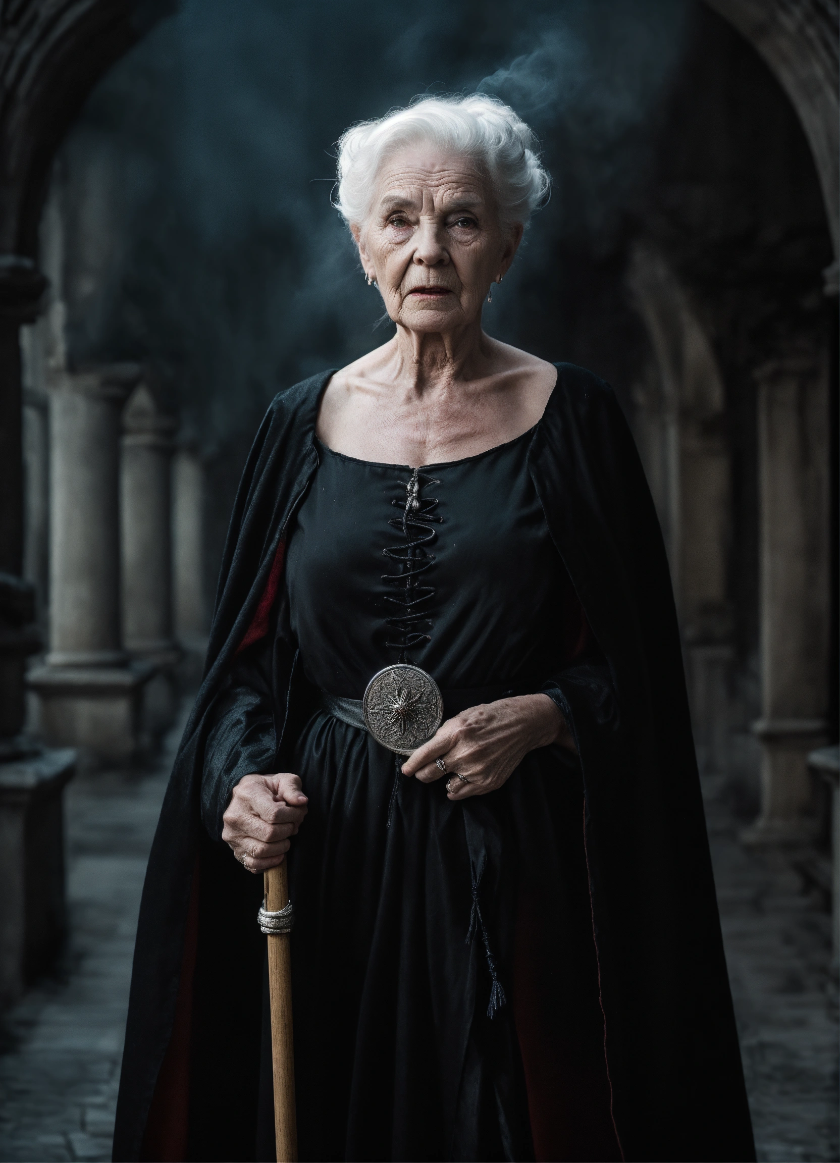 Fantasy-inspired portrait of a giant 8 foot, terrifyingly ugly 100 year old white female witch sneering directly into camera, flashing gleaming silver eyes, white hair pulled back in a bun, evil, powerful, veins visible in her paper-thin skin, heavily wrinkled face wearing black cinched black robes and billowing black cape, holding a cane, background is medieval palace at night, ethereal dreamy foggy, photoshoot by alessio albi