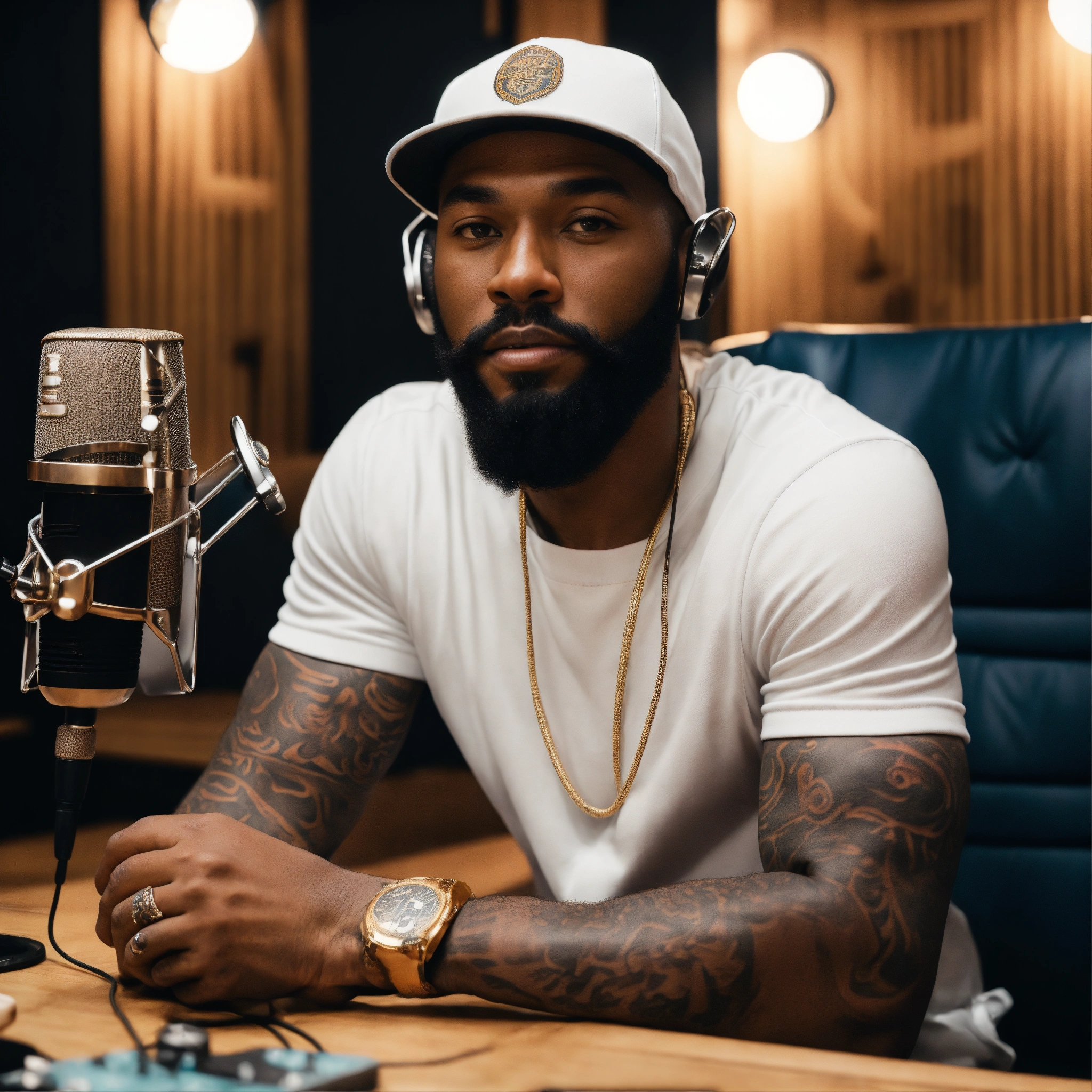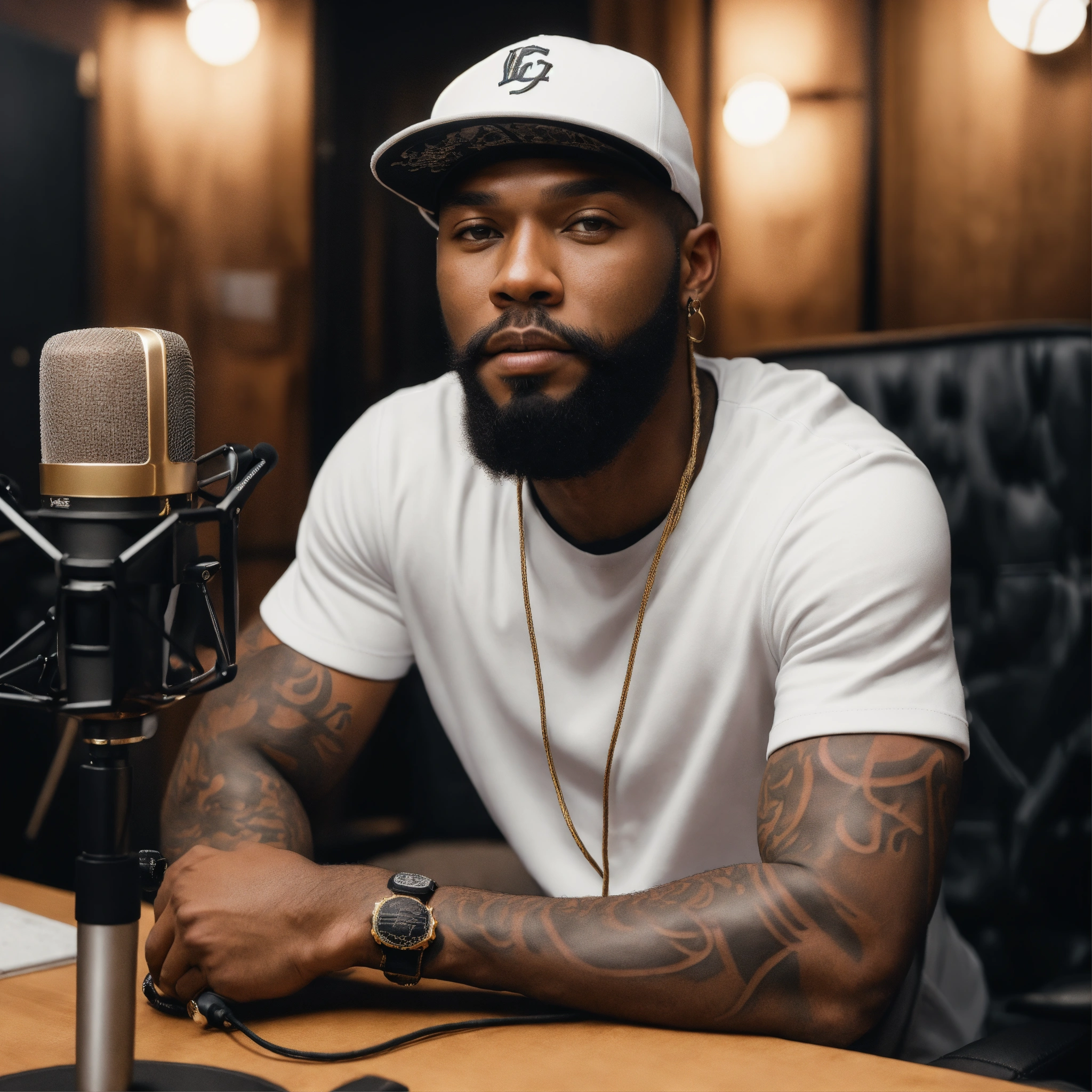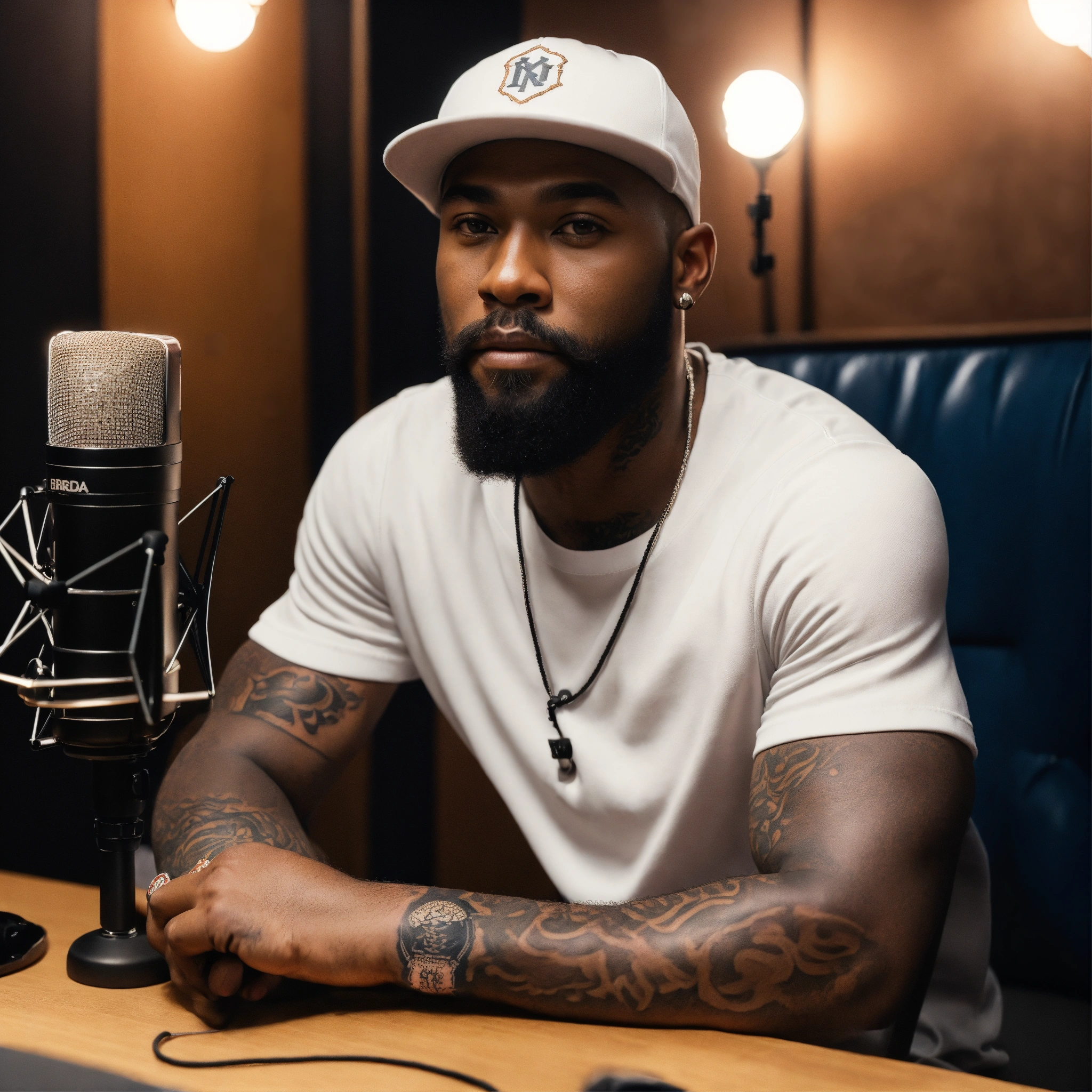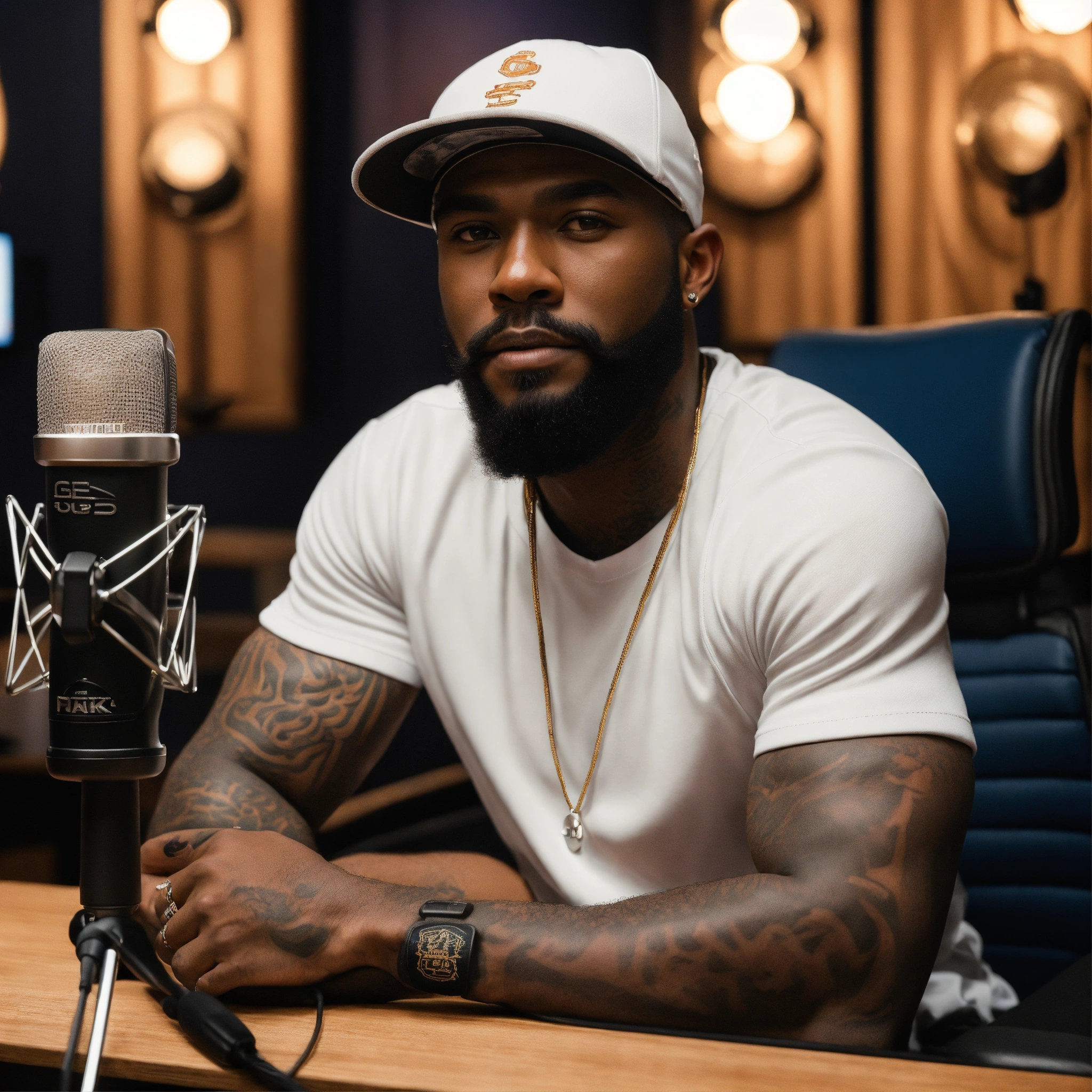 Portrait of a handsome black man with well broomed short beard, bald, white baseball cap, tattoo on both arms, sitting in a fancy podcast studio talking into 2 microphones, face profile, brown eyes looking into the camera, he's looking into the camera, very real, 8k rendering, extreme human detailed, real photo, looking straight at camera.